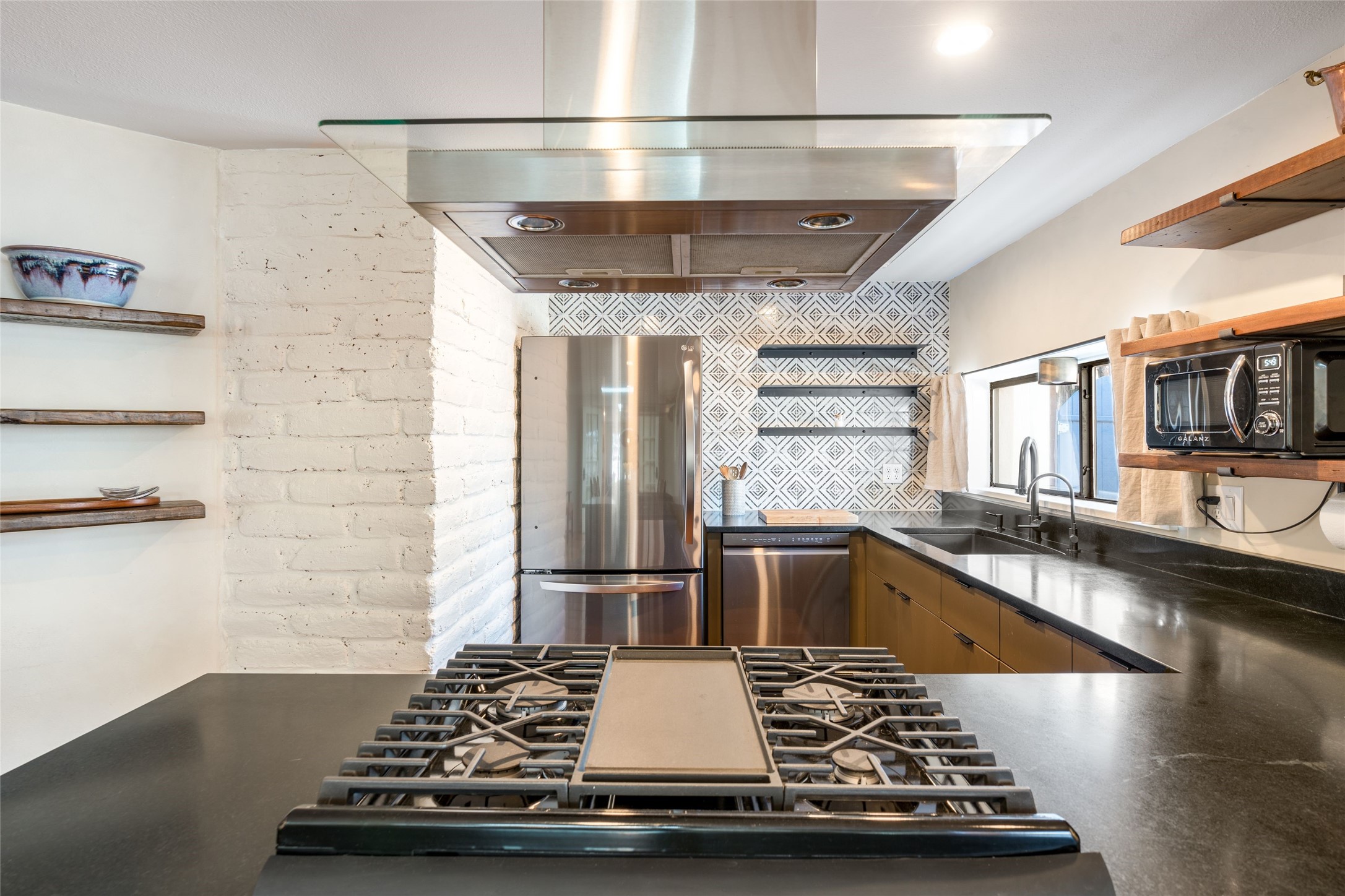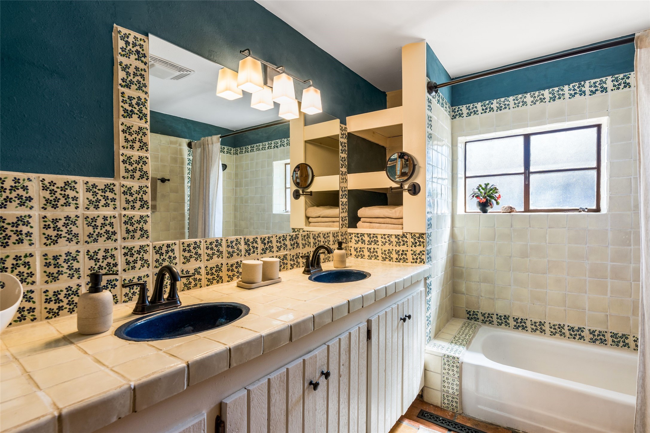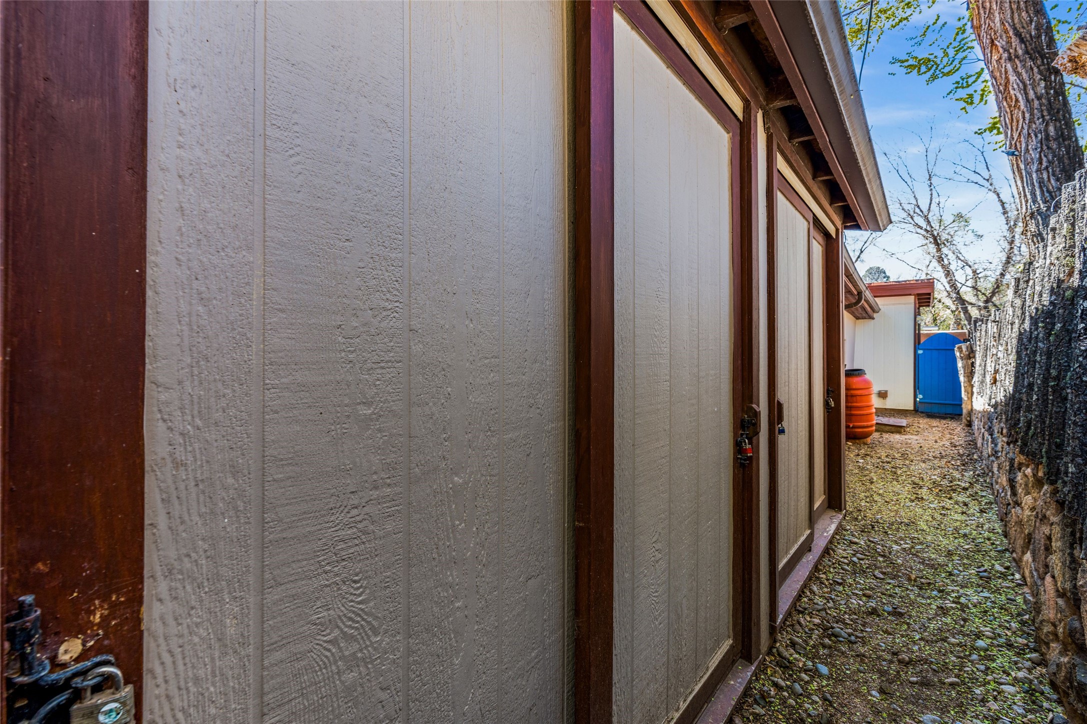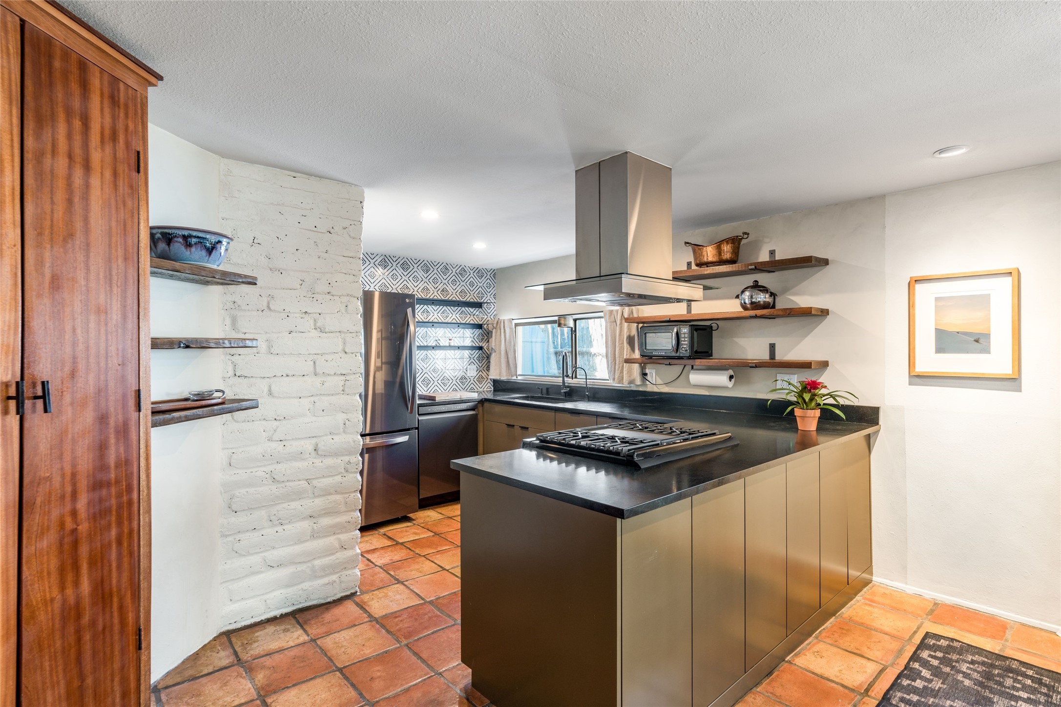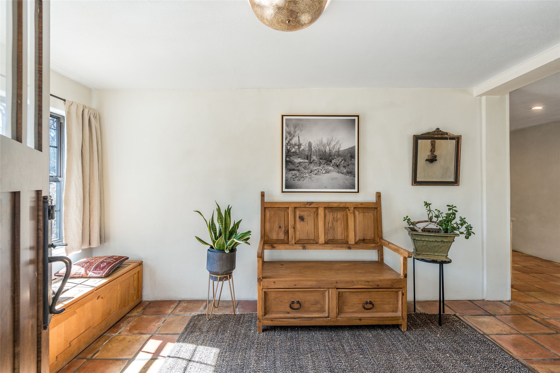 Located by the river, minutes from town in the heart of Tesuque, this pitched roof stand-alone mostly adobe home, parts of which date to the late 1800's, is beautifully renovated and ready for its new owner! Entering through the handmade front door is the spacious entry with an East facing window seat for morning reading in the sun and a unique Moroccan light fixture. The main living room/family room is separated by a big double-sided fireplace, good enough to mostly heat the house! The nice large dining room is open to the kitchen for easy entertaining and cooking in the super cool and newly redone kitchen. With black soapstone counters, beautiful tile, locally built cabinetry, mahogany built-in pantry, gas stove, reverse osmosis system and all new appliances, it is a cook's dream! The 3 bedrooms afford plenty of room for family or friends. The main guest room is a nice large size and shares the full bath with the 3rd bedroom which would make a great home office or den and has access to storage in the attic. The main bedroom at the back of the house, has a classic corner kiva fireplace and en suite bath, as well as direct access to outside and the studio for music, painting, writing or separate entry office. So many extras! Pre moratorium well with filtration system and 3-acre ft of water, two tank grey water septic system, good outside storage, newer boiler and washer dryer and pleasant outdoor garden area with pear and apple trees. All this with out-your-door hiking on the Ridge and Winsor trails or meandering along the Tesuque River under the big old majestic cottonwoods. This is a unique two home condo situation with no HOA dues. The two free standing homes split any driveway/septic/well costs 50/50 as needed. Separate furniture package is available if desired.