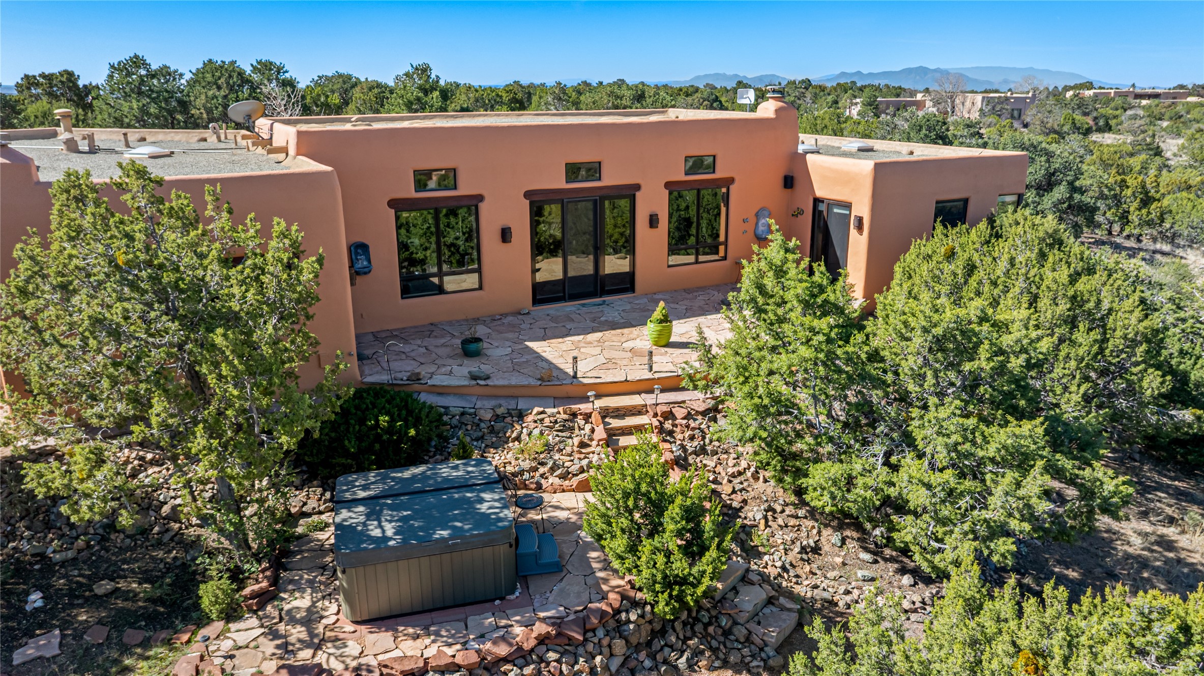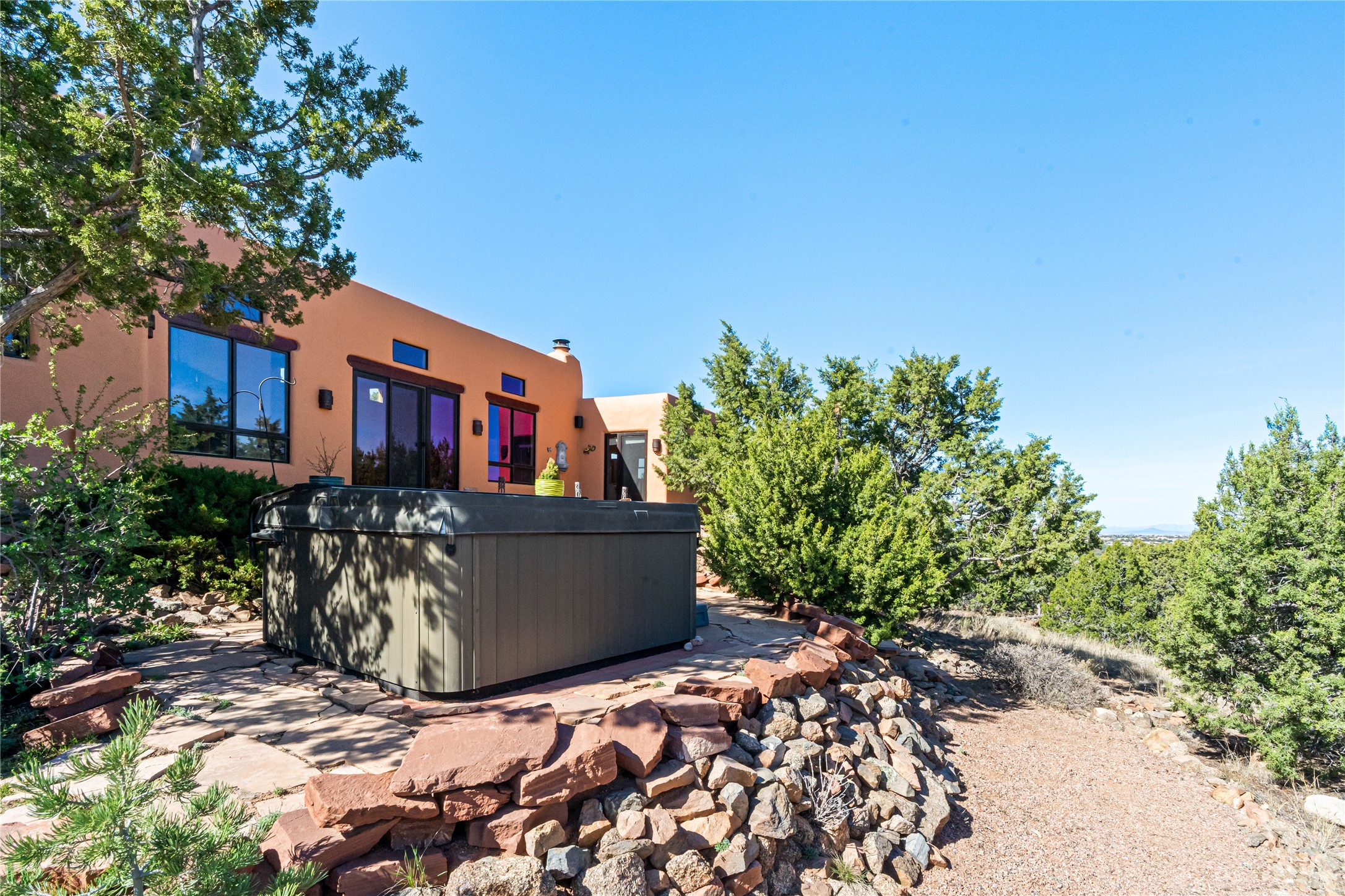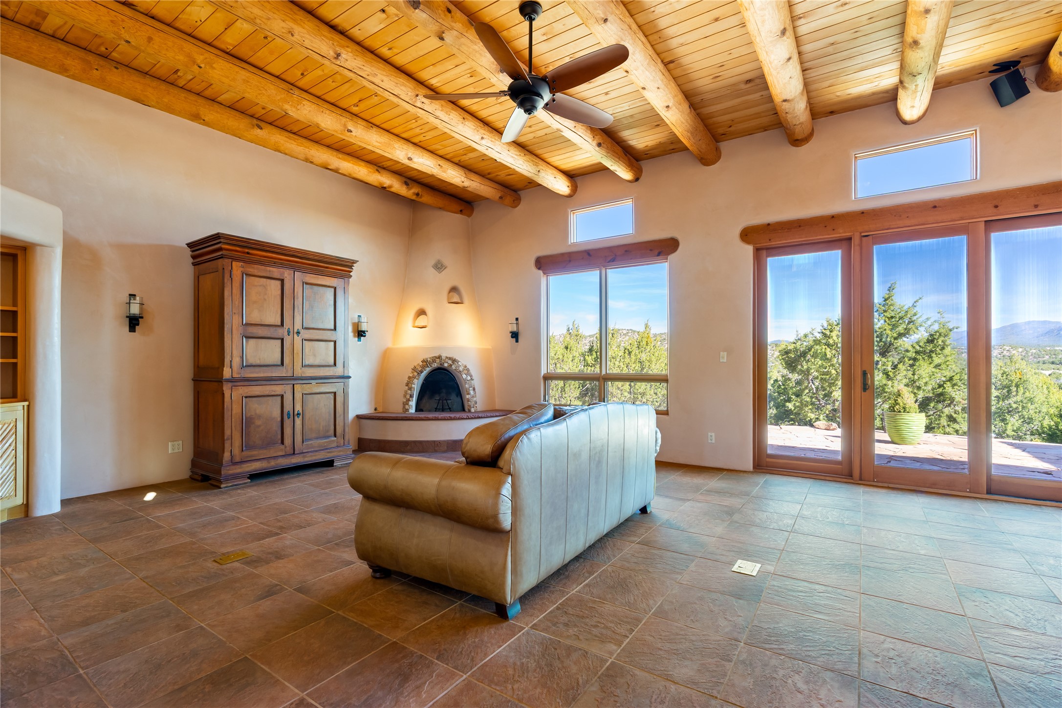 Set on a premier ridge-top lot in The Ridges, this 3.78+/- acre property offers exceptional privacy and sweeping views across nearly 2,000 acres of bordering open space and surrounding mountain ranges. The setting delivers a rare sense of space and quiet while still being conveniently located near the amenities of Eldorado and approximately 25 minutes to the Santa Fe Plaza. Built in 2002 and well-maintained, the 2,433+/- sq ft home features classic Santa Fe architecture with a functional single-level layout. The main living area showcases high ceilings with exposed vigas, a kiva fireplace, and large windows that capture the expansive views, while multiple skylights throughout the home bring in abundant natural light. Hand-carved posts and hard trowel plaster walls in the main living area and primary suite add warmth and craftsmanship throughout. The kitchen opens to the living and dining areas and features custom cabinetry, tile countertops, and a central island, creating an inviting space for everyday living and entertaining. The home offers three bedrooms and a well-balanced layout with one full bath, one 3/4 bath, and one 1/2 bath. The primary suite includes its own kiva fireplace, viga ceilings, and a comfortable, private retreat. Outdoor living is a standout feature, with multiple areas to take in the big skies, sunsets, and surrounding landscape. A new hot tub is included, providing the perfect place to unwind and enjoy the setting. A new roof was installed on September 22, 2025 and includes a 10-year transferable warranty, offering added peace of mind. The oversized finished garage provides flexibility for a workshop, studio, or additional storage. Horses are allowed on the property, with ample space to add facilities if desired. A rare opportunity to own a true ridge-top property with privacy, character, and convenience in one of the area's most desirable settings.