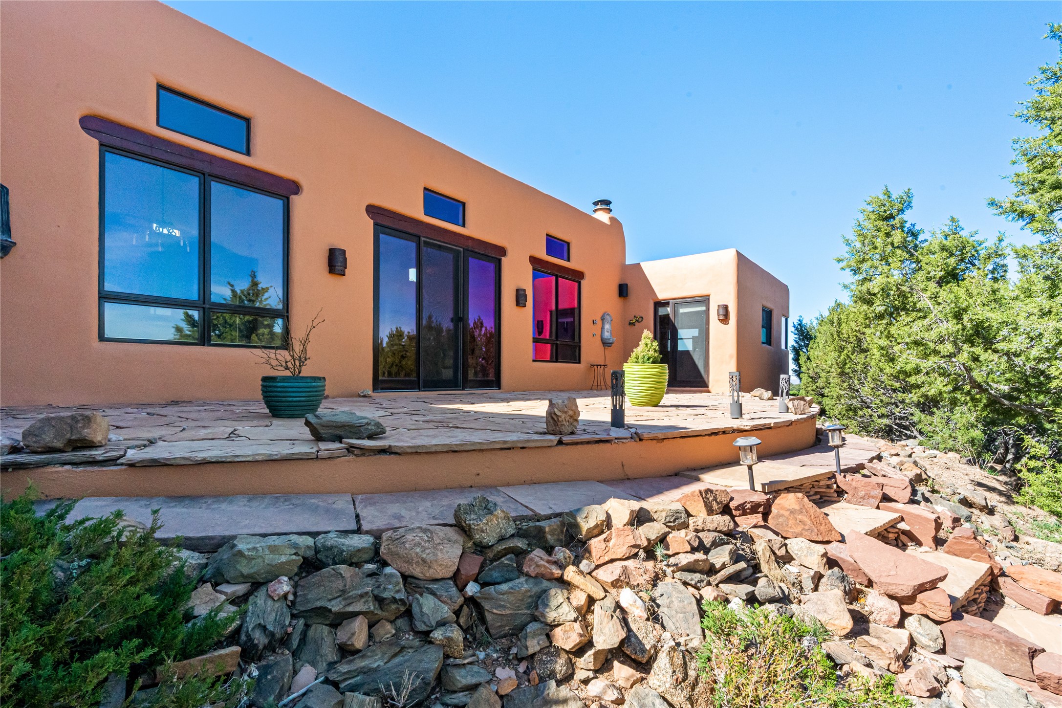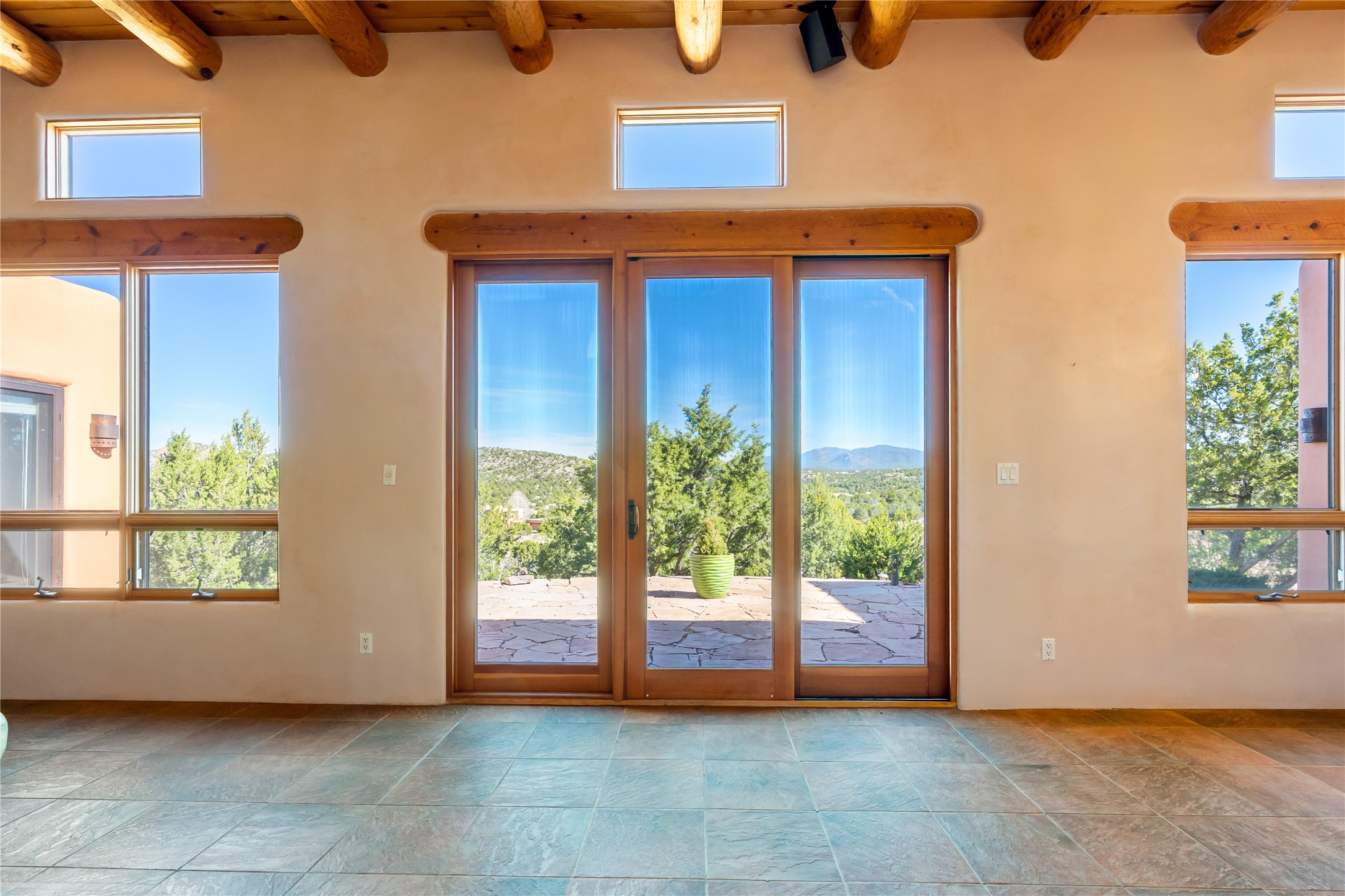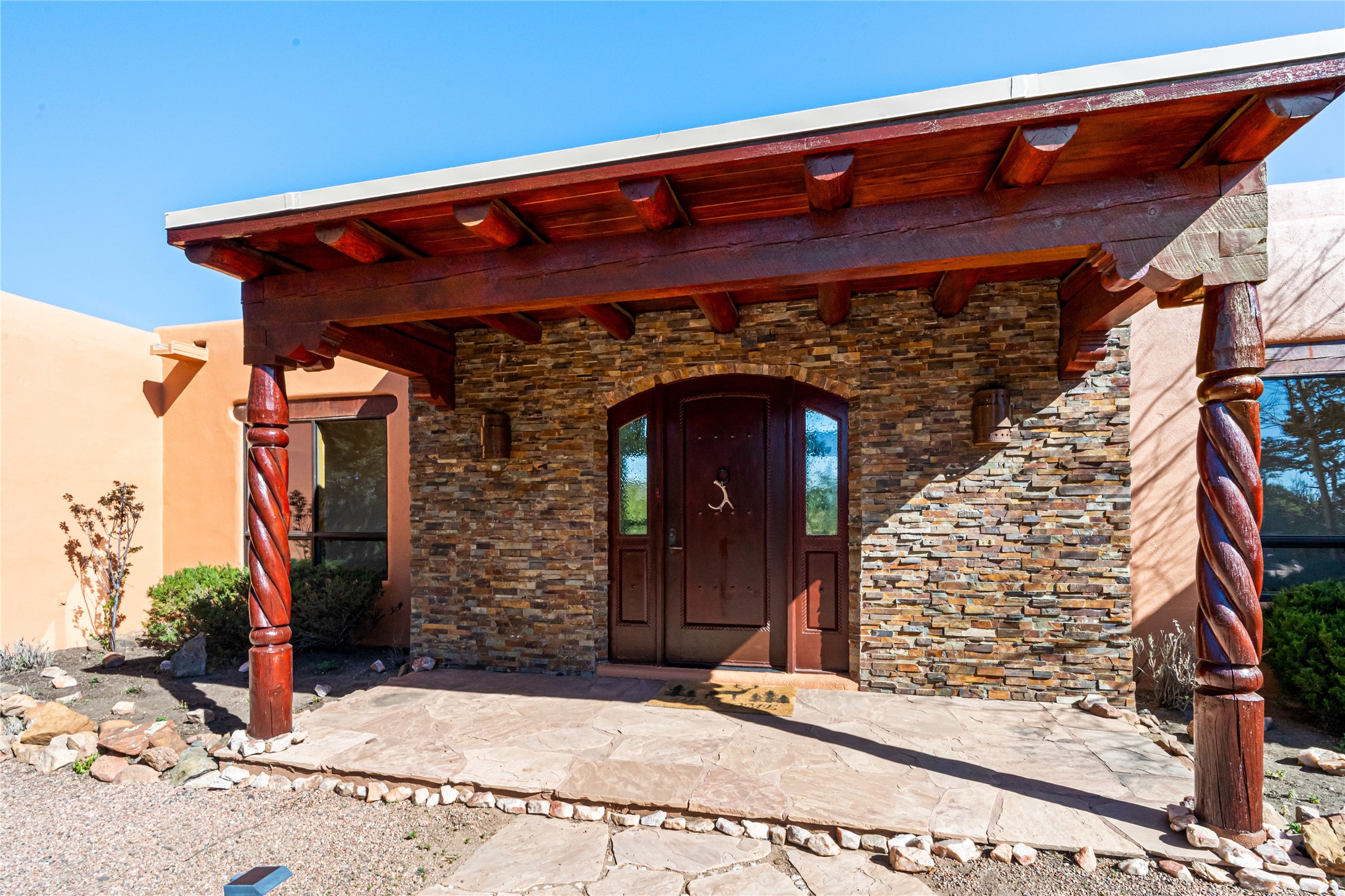 Set on a premier ridge-top lot in The Ridges, this 3.78+/- acre property offers exceptional privacy and sweeping views across nearly 2,000 acres of bordering open space and surrounding mountain ranges. The setting delivers a rare sense of space and quiet while still being conveniently located near the amenities of Eldorado and approximately 25 minutes to the Santa Fe Plaza. Built in 2002 and well-maintained, the 2,433+/- sq ft home features classic Santa Fe architecture with a functional single-level layout. The main living area showcases high ceilings with exposed vigas, a kiva fireplace, and large windows that capture the expansive views, while multiple skylights throughout the home bring in abundant natural light. Hand-carved posts and hard trowel plaster walls in the main living area and primary suite add warmth and craftsmanship throughout. The kitchen opens to the living and dining areas and features custom cabinetry, tile countertops, and a central island, creating an inviting space for everyday living and entertaining. The home offers three bedrooms and a well-balanced layout with one full bath, one 3/4 bath, and one 1/2 bath. The primary suite includes its own kiva fireplace, viga ceilings, and a comfortable, private retreat. Outdoor living is a standout feature, with multiple areas to take in the big skies, sunsets, and surrounding landscape. A new hot tub is included, providing the perfect place to unwind and enjoy the setting. A new roof was installed on September 22, 2025 and includes a 10-year transferable warranty, offering added peace of mind. The oversized finished garage provides flexibility for a workshop, studio, or additional storage. Horses are allowed on the property, with ample space to add facilities if desired. A rare opportunity to own a true ridge-top property with privacy, character, and convenience in one of the area's most desirable settings.