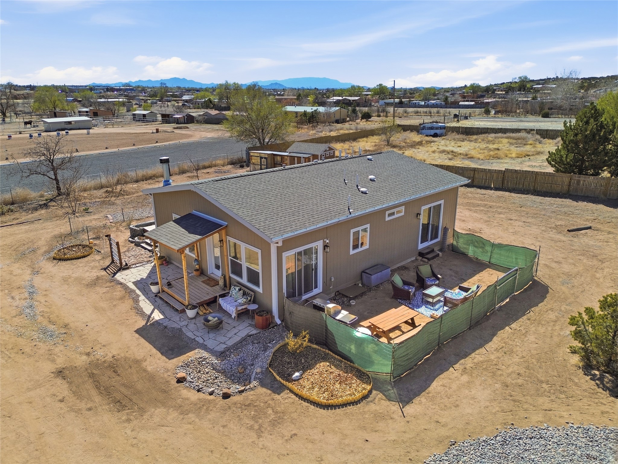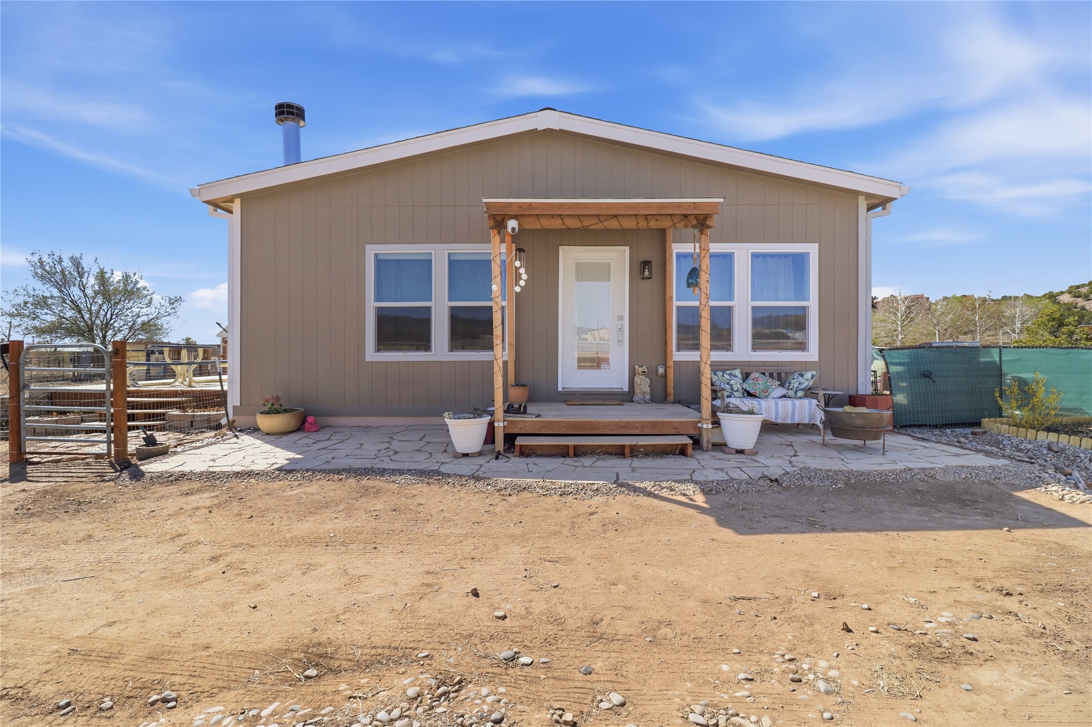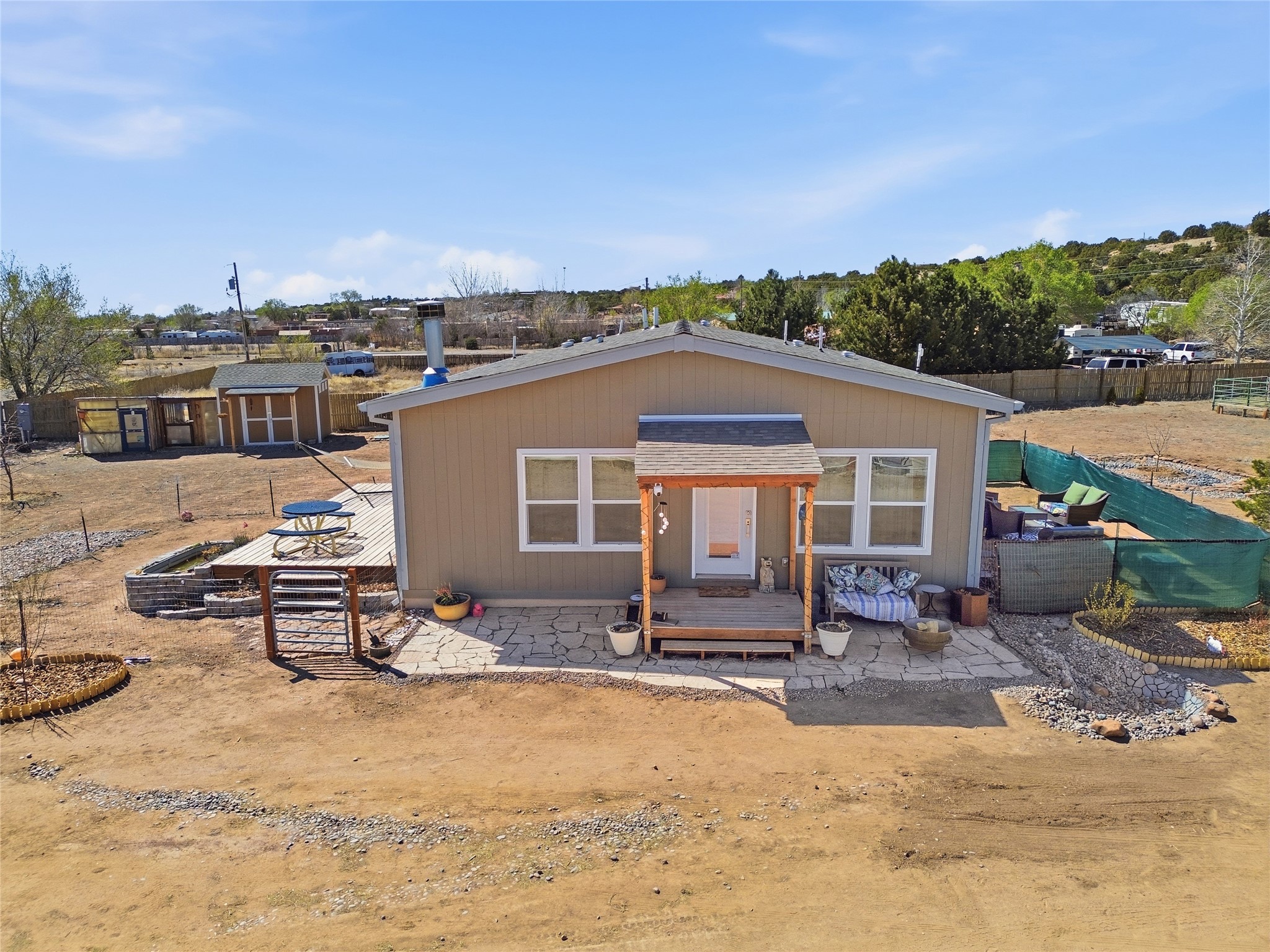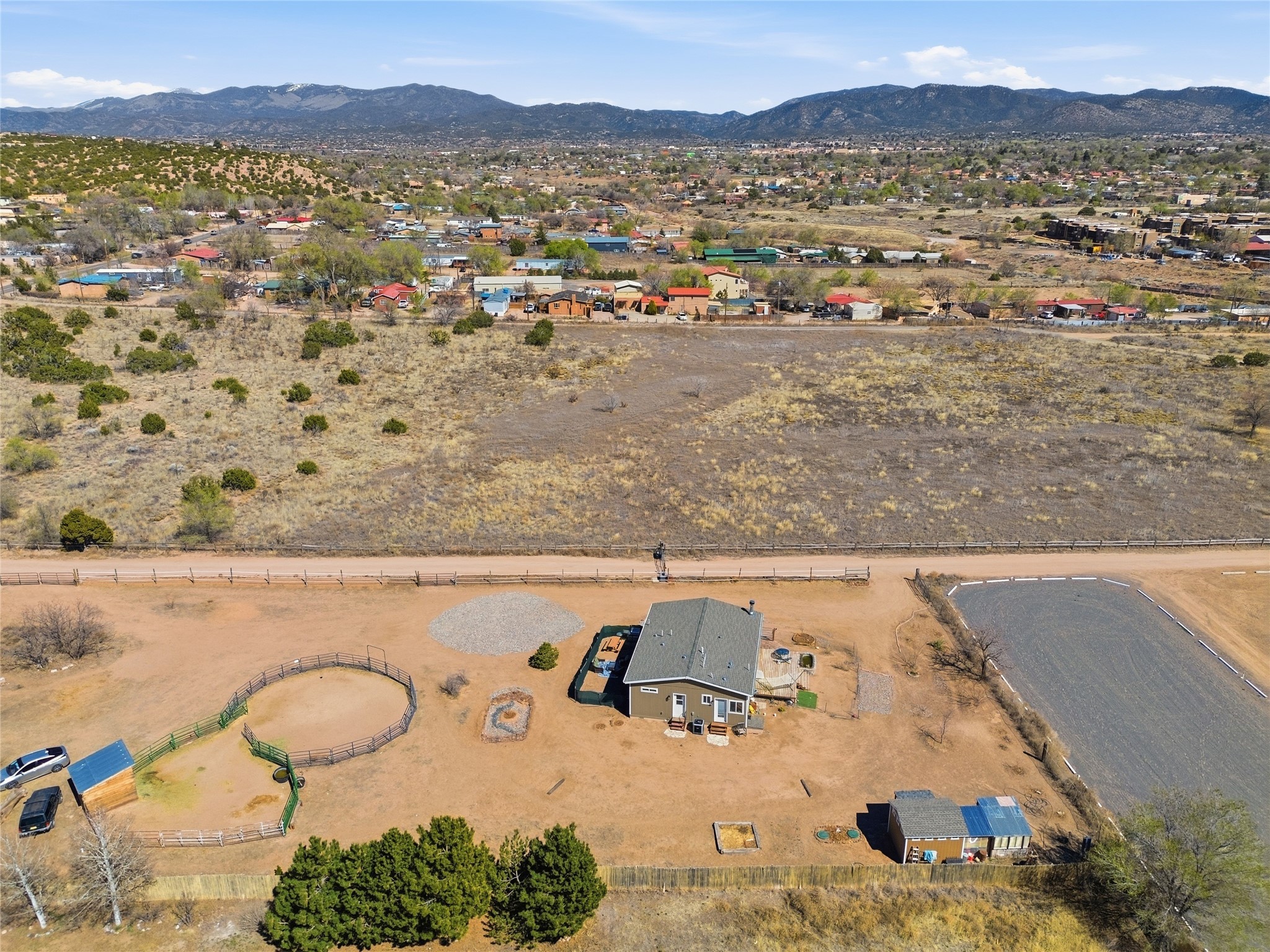 Rare opportunity to own a truly unique in-town horse property offering space, flexibility, and a touch of country living--just minutes from the Santa Fe Plaza.Set on 1.38 acres within city limits, this inviting 2-bedroom, 2-bath modular home offers a lifestyle that feels worlds away. Light pours through the home, highlighting 9-foot ceilings, a thoughtful floor plan, and clean, modern finishes with durable vinyl flooring throughout. The kitchen's tall cabinetry adds both elegance and functionality, while energy-efficient systems--including refrigerated air, and a high-efficiency water heater--ensure comfort year-round. A wood-burning fireplace brings warmth and a cozy Santa Fe touch.Step outside and discover a property that truly sets itself apart. Fully fenced and thoughtfully equipped, this horse-friendly property includes a 10x12 shed, horse panels (which convey), a chicken coop, 2 run-in sheds, and an RV power pedestal with nearby hydrant. A charming fish pond and inviting outdoor spaces create a peaceful setting to relax or entertain.Enjoy direct access to nature with pedestrian, equestrian, and utility easements leading to the nearby river trail--perfect for riding, walking, or simply enjoying the outdoors.Additional highlights include: Washer, dryer, and all appliances conveying (including microwave) Energy-efficient systems throughout Exterior-access deep crawlspace for added storage Shared well No HOAThis is a rare chance to own acreage, accommodate horses, and enjoy privacy--all while being close to the heart of Santa Fe. A truly special property with endless potential.