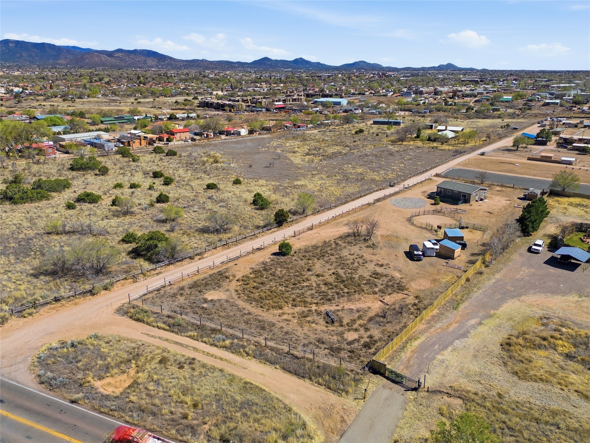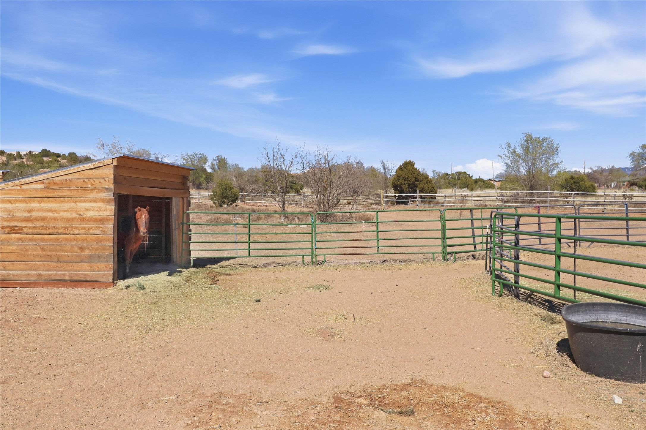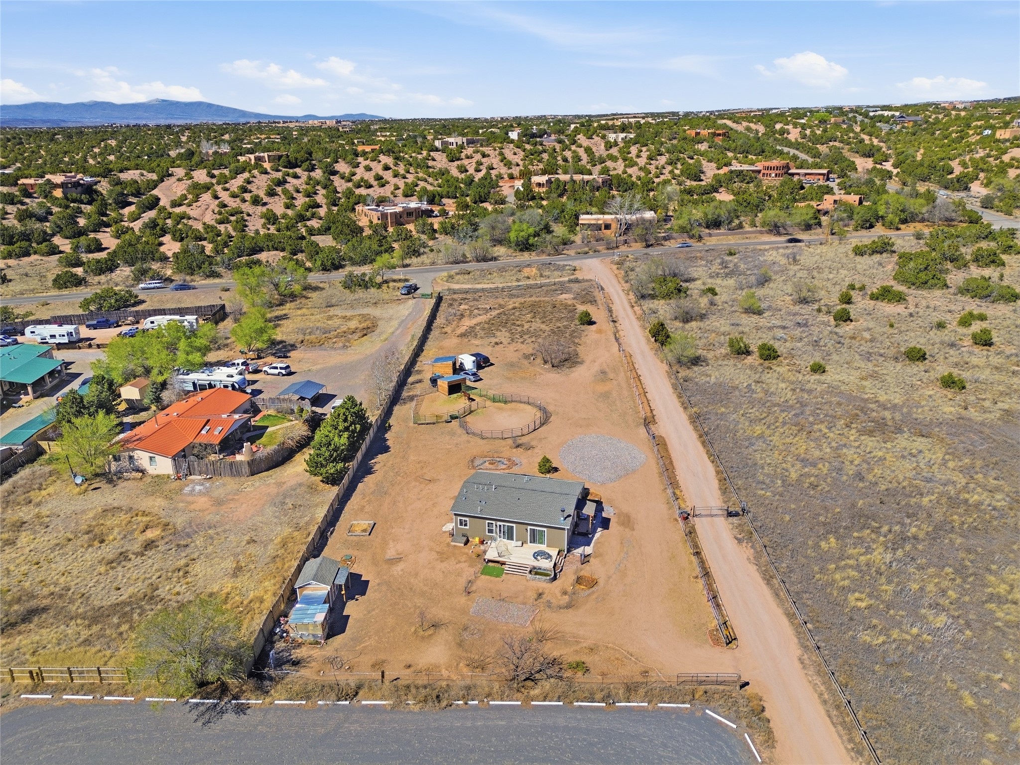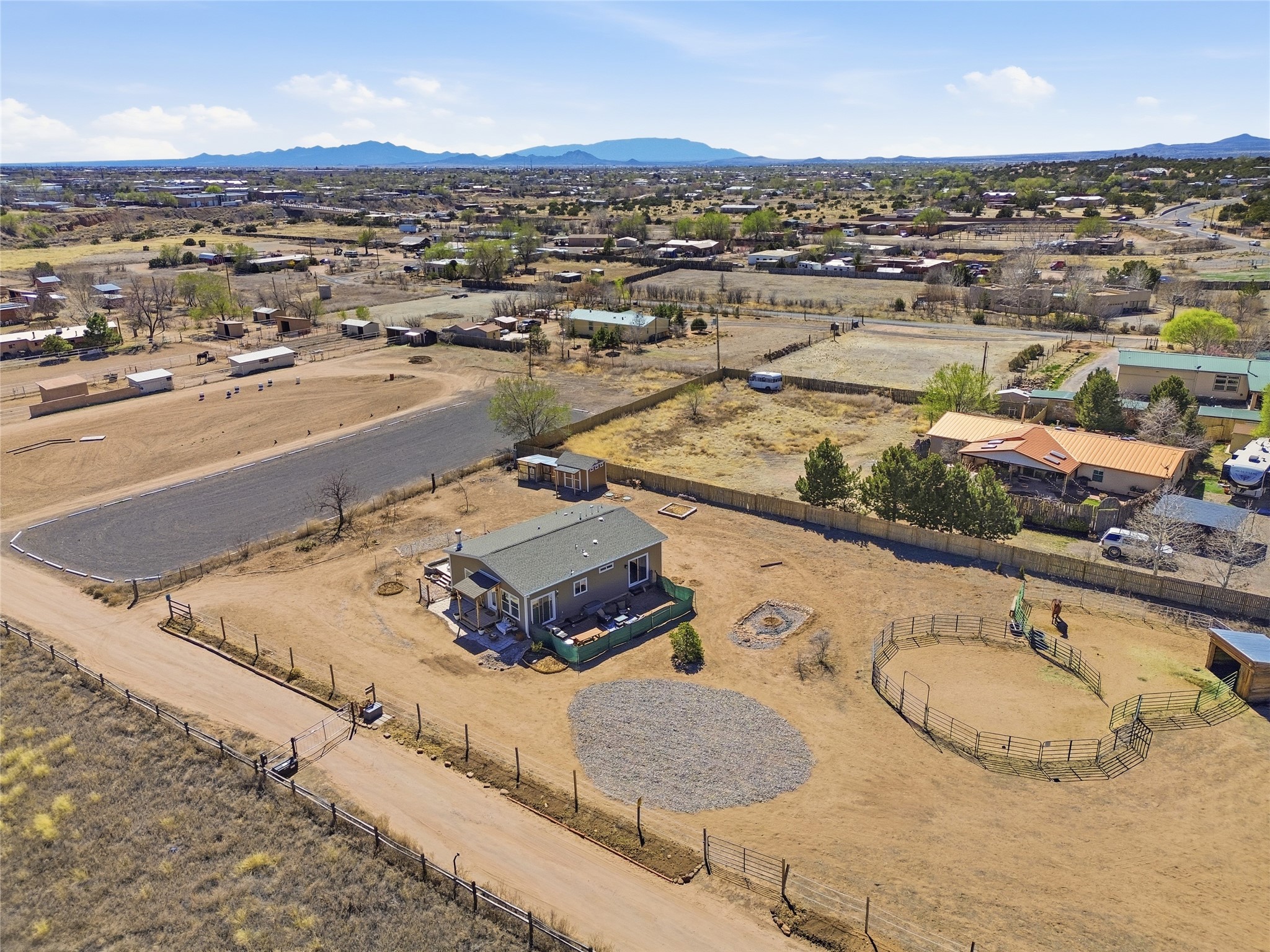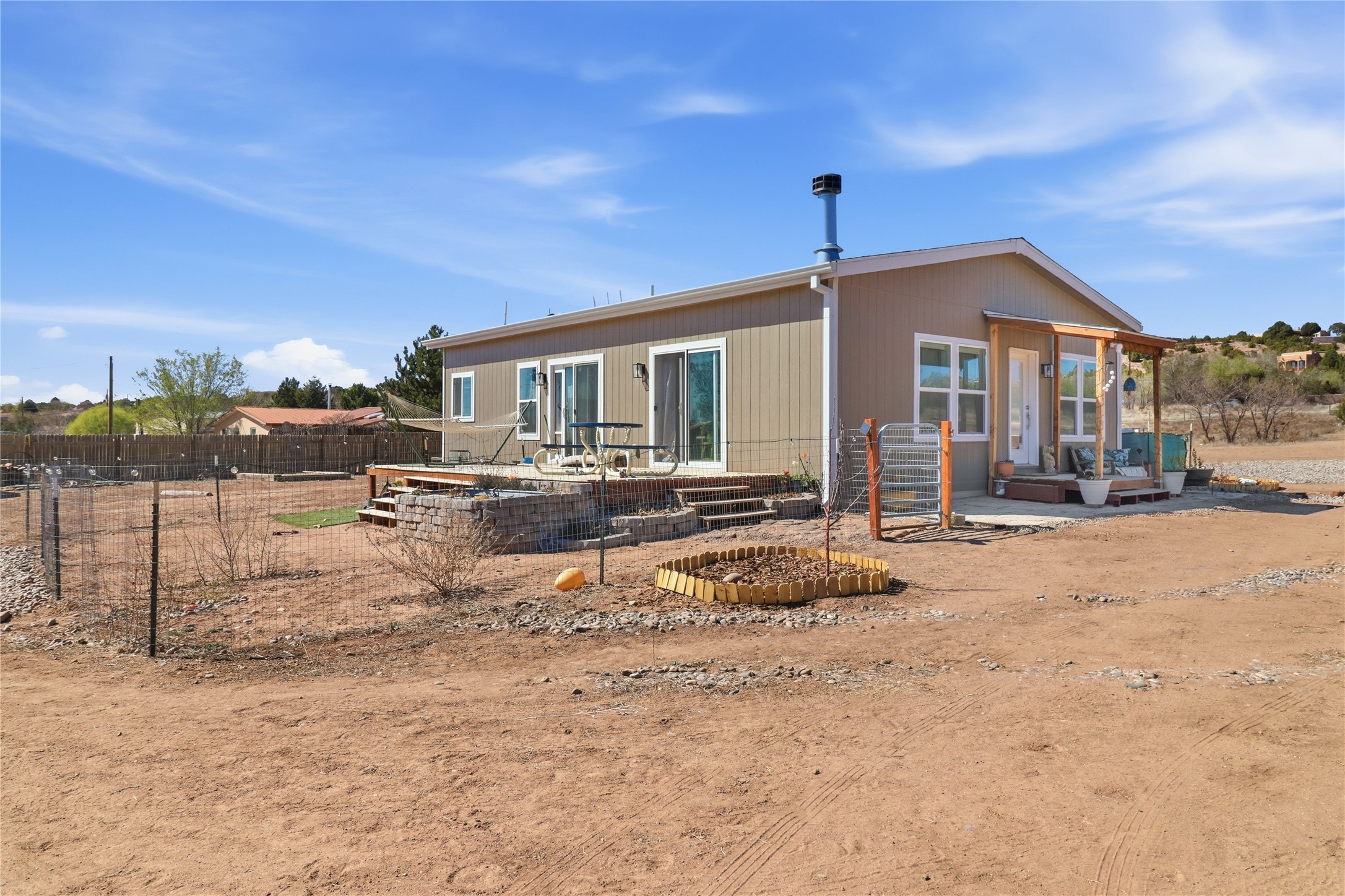 Rare opportunity to own a truly unique in-town horse property offering space, flexibility, and a touch of country living--just minutes from the Santa Fe Plaza.Set on 1.38 acres within city limits, this inviting 2-bedroom, 2-bath modular home offers a lifestyle that feels worlds away. Light pours through the home, highlighting 9-foot ceilings, a thoughtful floor plan, and clean, modern finishes with durable vinyl flooring throughout. The kitchen's tall cabinetry adds both elegance and functionality, while energy-efficient systems--including refrigerated air, and a high-efficiency water heater--ensure comfort year-round. A wood-burning fireplace brings warmth and a cozy Santa Fe touch.Step outside and discover a property that truly sets itself apart. Fully fenced and thoughtfully equipped, this horse-friendly property includes a 10x12 shed, horse panels (which convey), a chicken coop, 2 run-in sheds, and an RV power pedestal with nearby hydrant. A charming fish pond and inviting outdoor spaces create a peaceful setting to relax or entertain.Enjoy direct access to nature with pedestrian, equestrian, and utility easements leading to the nearby river trail--perfect for riding, walking, or simply enjoying the outdoors.Additional highlights include: Washer, dryer, and all appliances conveying (including microwave) Energy-efficient systems throughout Exterior-access deep crawlspace for added storage Shared well No HOAThis is a rare chance to own acreage, accommodate horses, and enjoy privacy--all while being close to the heart of Santa Fe. A truly special property with endless potential.