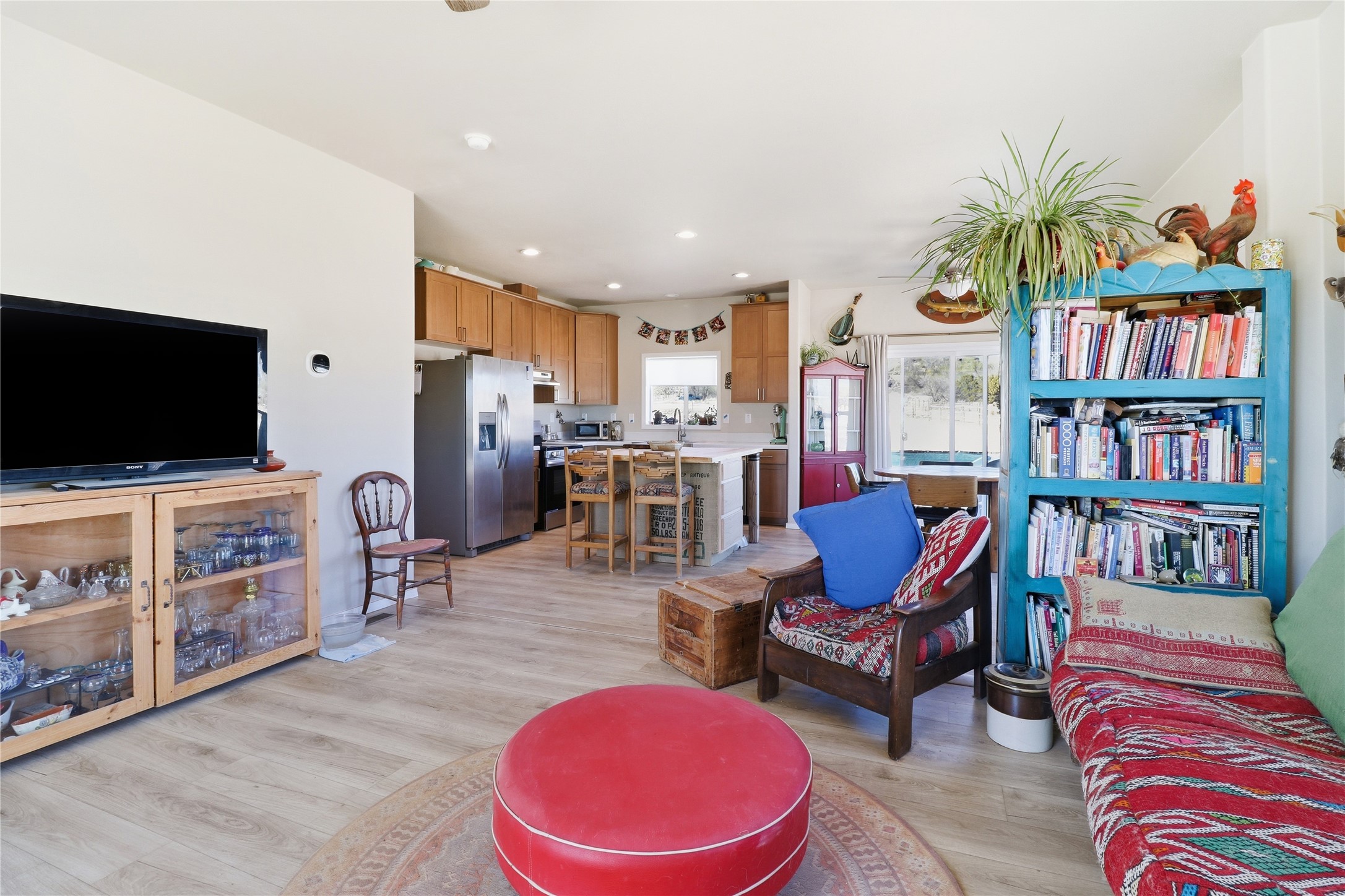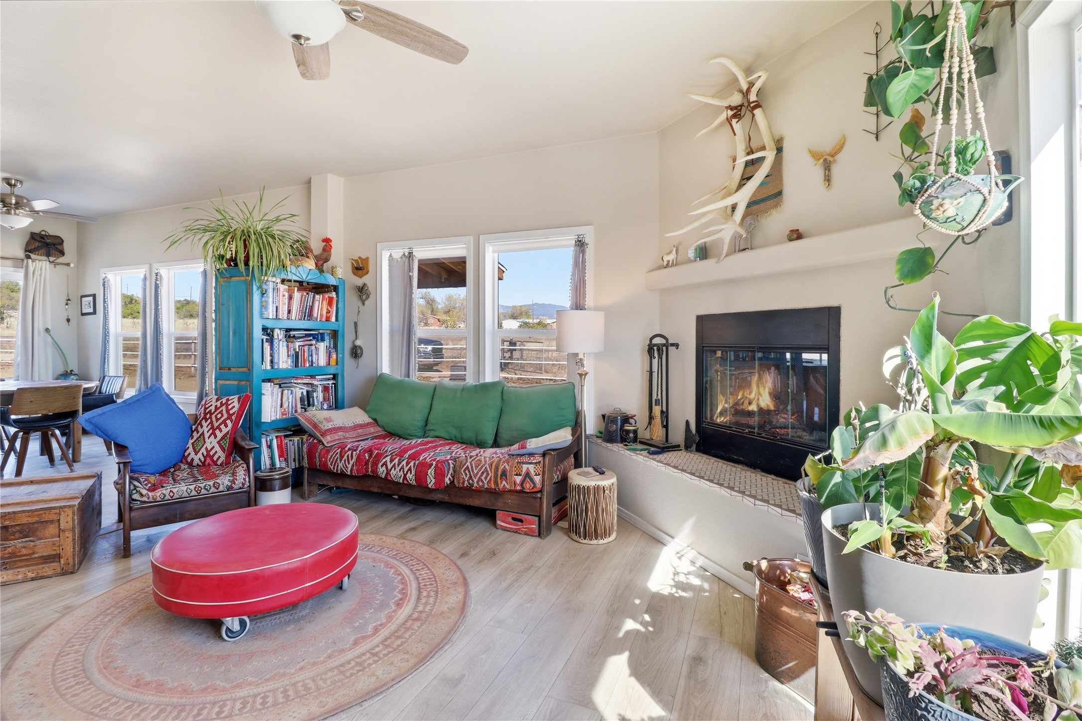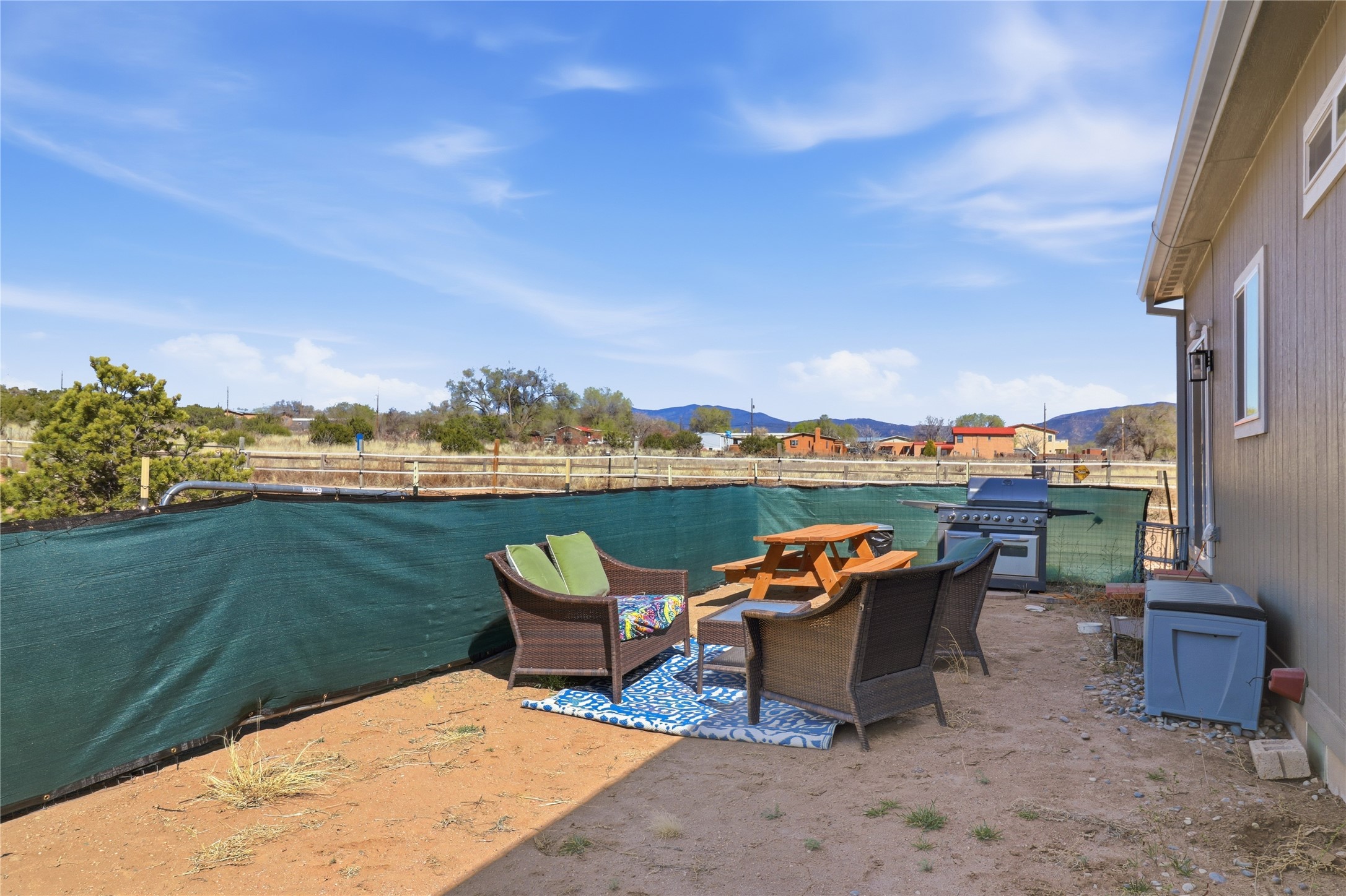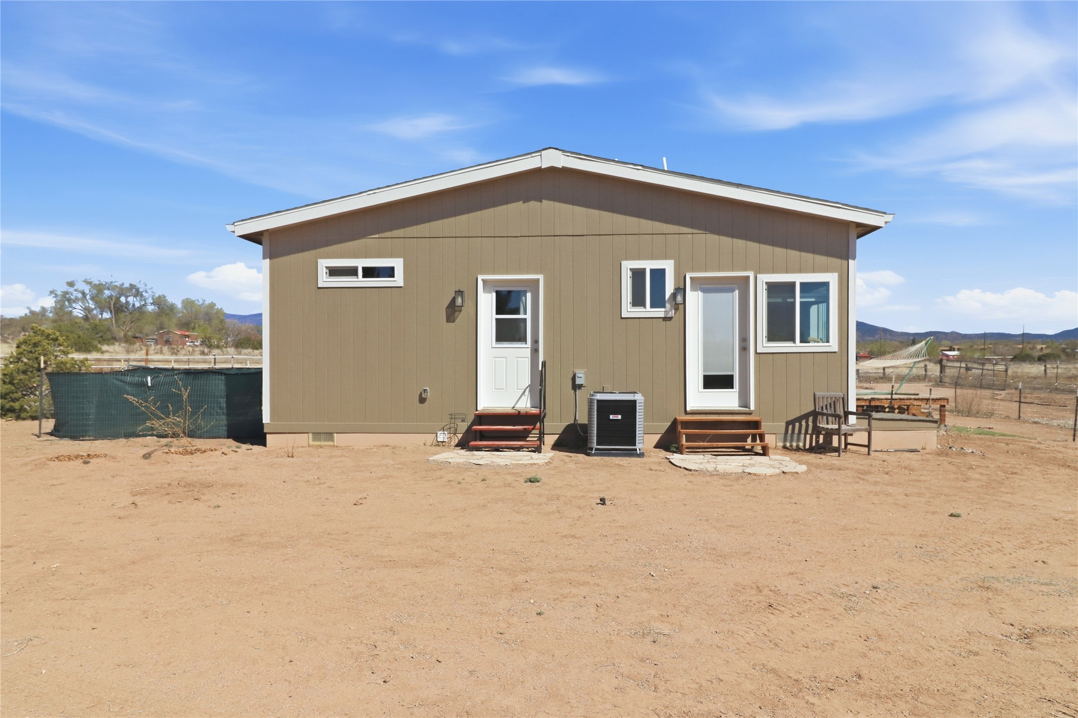 Rare opportunity to own a truly unique in-town horse property offering space, flexibility, and a touch of country living--just minutes from the Santa Fe Plaza.Set on 1.38 acres within city limits, this inviting 2-bedroom, 2-bath modular home offers a lifestyle that feels worlds away. Light pours through the home, highlighting 9-foot ceilings, a thoughtful floor plan, and clean, modern finishes with durable vinyl flooring throughout. The kitchen's tall cabinetry adds both elegance and functionality, while energy-efficient systems--including refrigerated air, and a high-efficiency water heater--ensure comfort year-round. A wood-burning fireplace brings warmth and a cozy Santa Fe touch.Step outside and discover a property that truly sets itself apart. Fully fenced and thoughtfully equipped, this horse-friendly property includes a 10x12 shed, horse panels (which convey), a chicken coop, 2 run-in sheds, and an RV power pedestal with nearby hydrant. A charming fish pond and inviting outdoor spaces create a peaceful setting to relax or entertain.Enjoy direct access to nature with pedestrian, equestrian, and utility easements leading to the nearby river trail--perfect for riding, walking, or simply enjoying the outdoors.Additional highlights include: Washer, dryer, and all appliances conveying (including microwave) Energy-efficient systems throughout Exterior-access deep crawlspace for added storage Shared well No HOAThis is a rare chance to own acreage, accommodate horses, and enjoy privacy--all while being close to the heart of Santa Fe. A truly special property with endless potential.