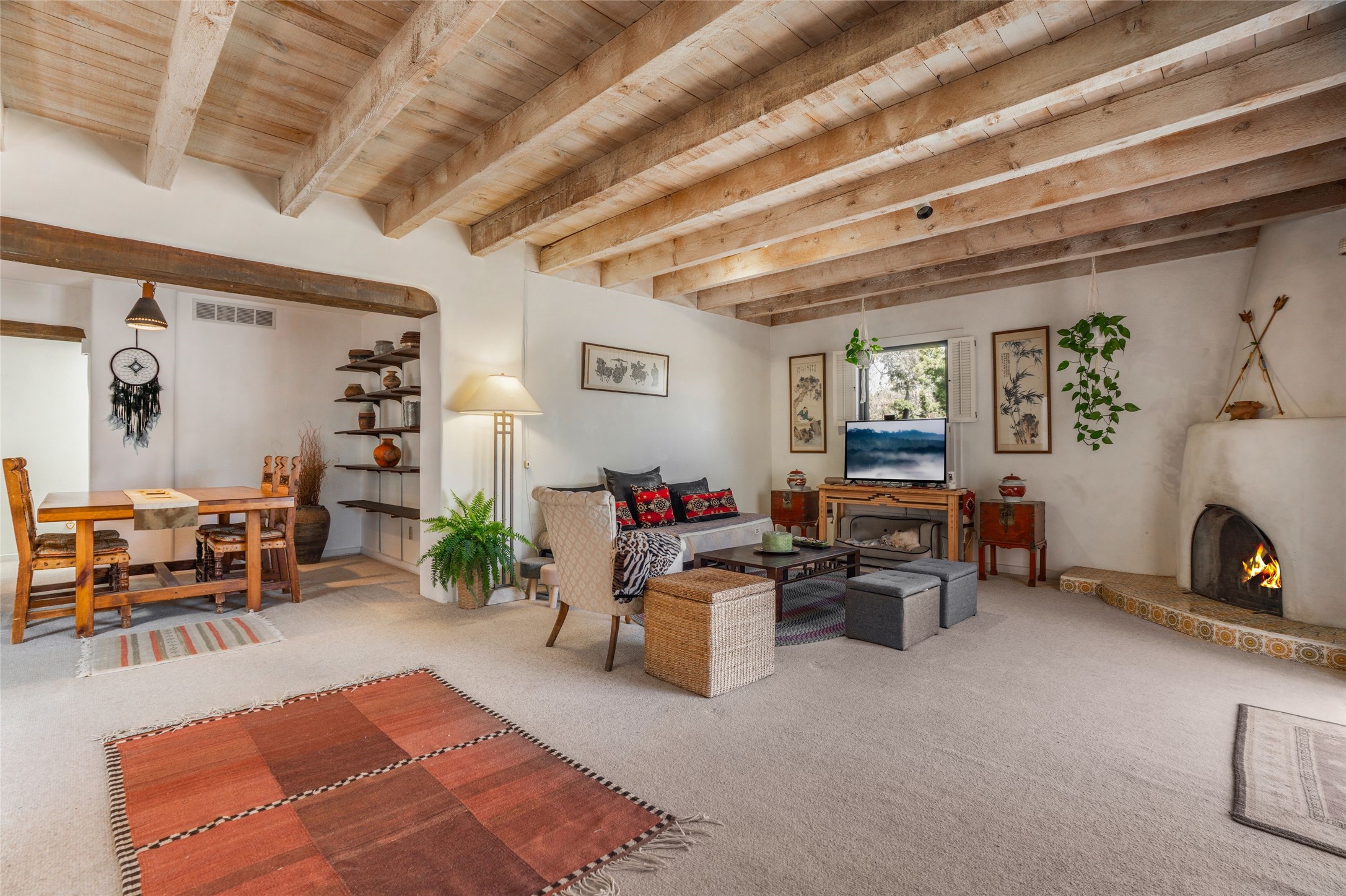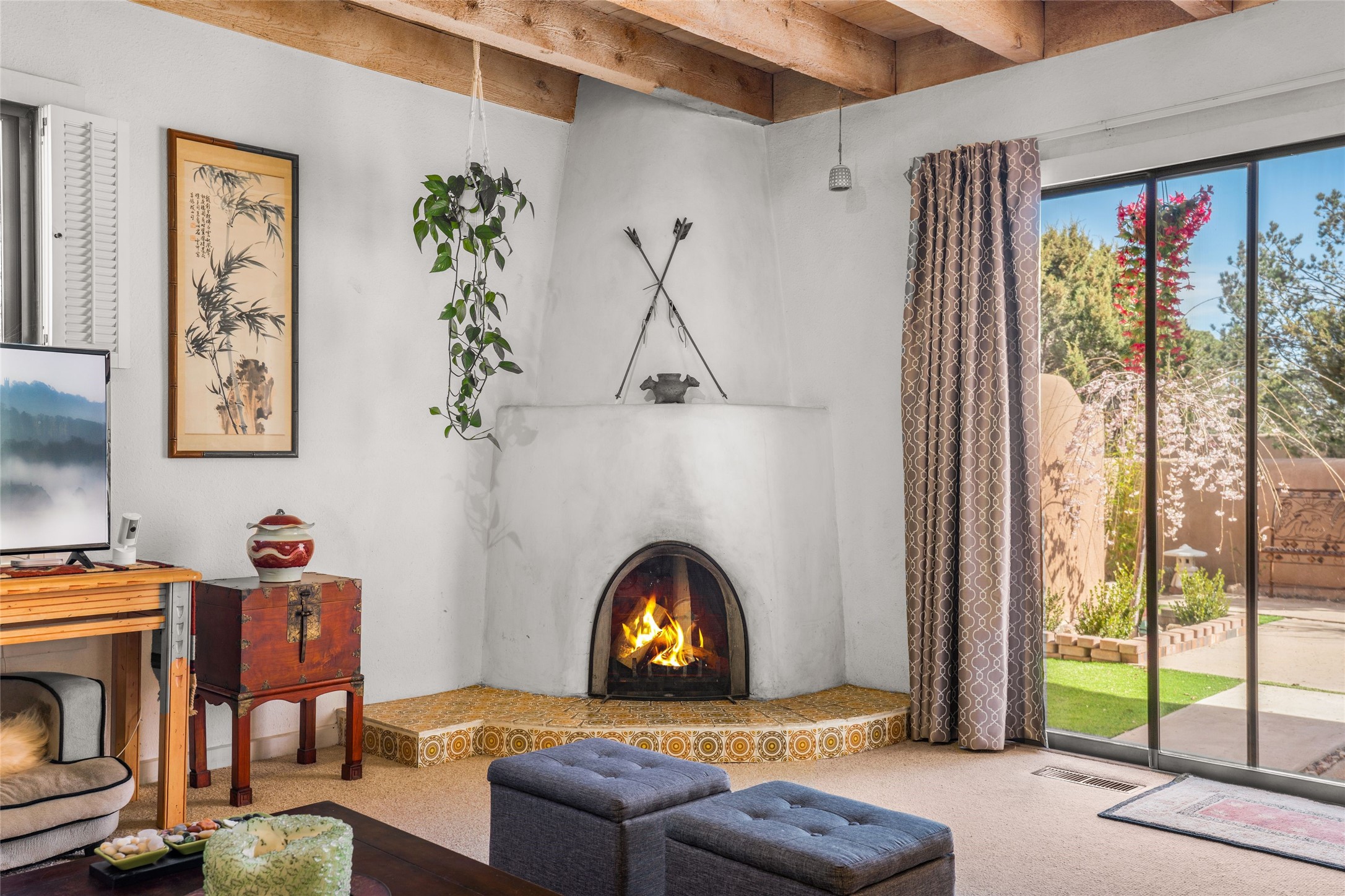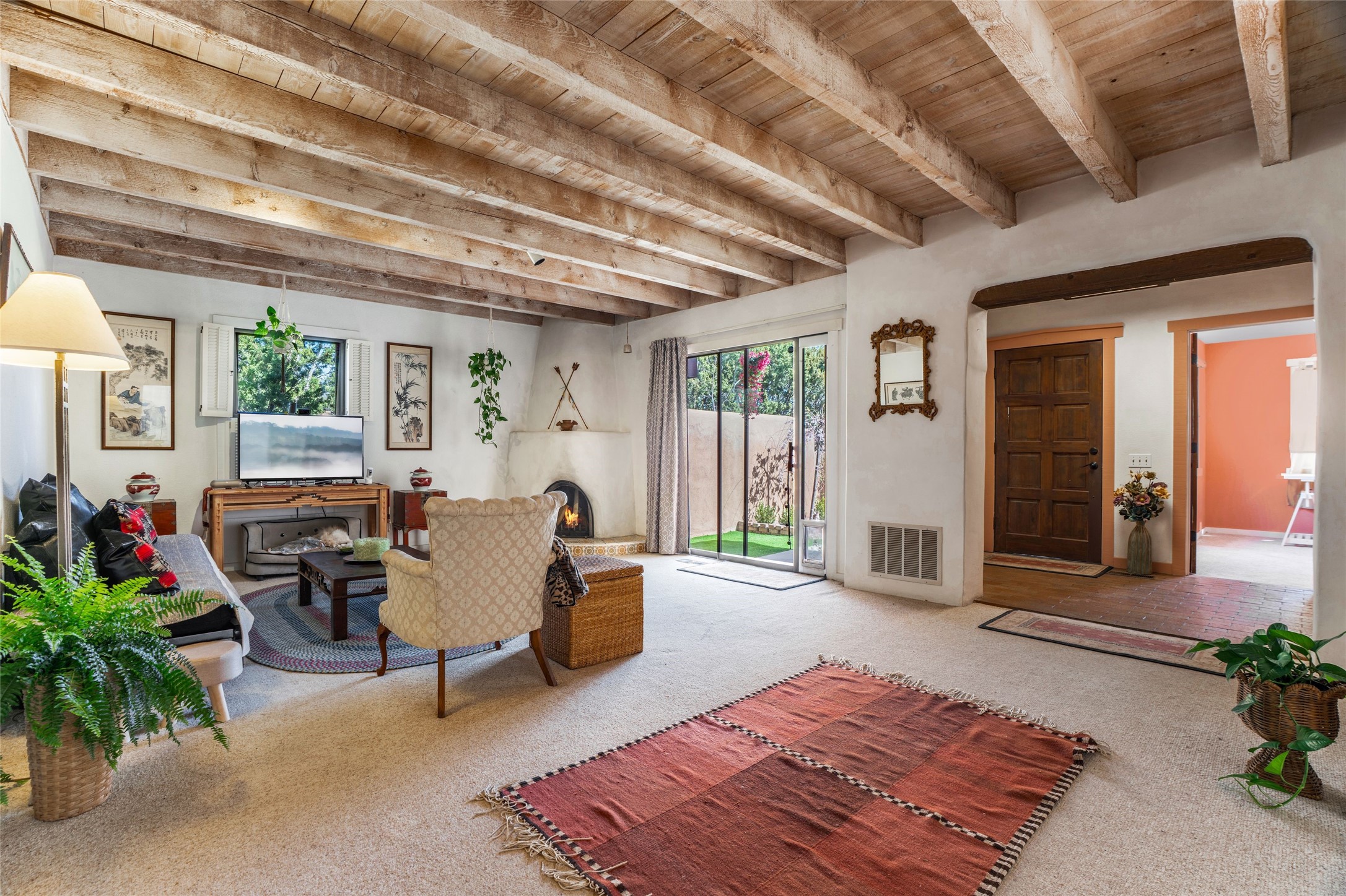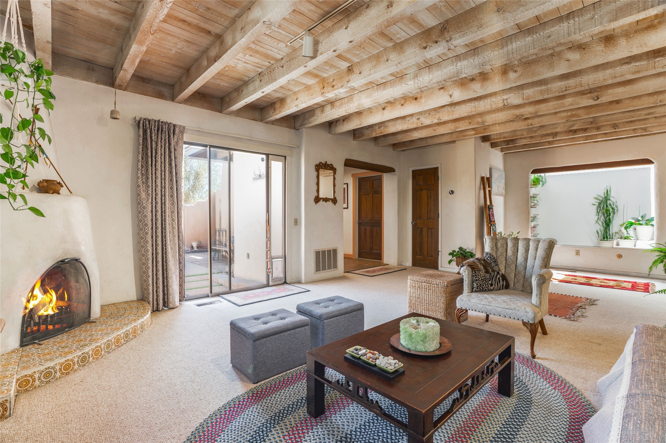 Desirable Northside single-level corner-unit condo with timeless Pueblo character, abundant natural light, and spacious living areas. Enter through a charming walled courtyard, where a blooming cherry blossom tree adds seasonal beauty to the approach. Inside, a dramatic skylit atrium forms the heart of the home, beautifully framed by a large architectural opening from the living room that creates a signature focal point. Exposed beams throughout, banco seating, sculptural stepped Pueblo-style forms, and a kiva wood-burning fireplace bring warmth and authentic Santa Fe character. The southeast-facing orientation welcomes the first light of sunrise onto the living room floor, while moonlight through the atrium adds a rare sense of calm and beauty at night. The thoughtfully separated bedroom layout offers comfort and flexibility, and the attached one-car garage provides additional storage. This property has been lovingly maintained and is priced accordingly for expected renovations. Ideally situated on Santa Fe's coveted Northside, the home enjoys a setting that offers both tranquility and convenient access to the Plaza, the Santa Fe Opera, and Ski Santa Fe, along with the quiet pleasure of frequent deer sightings that add to the natural beauty of the neighborhood.