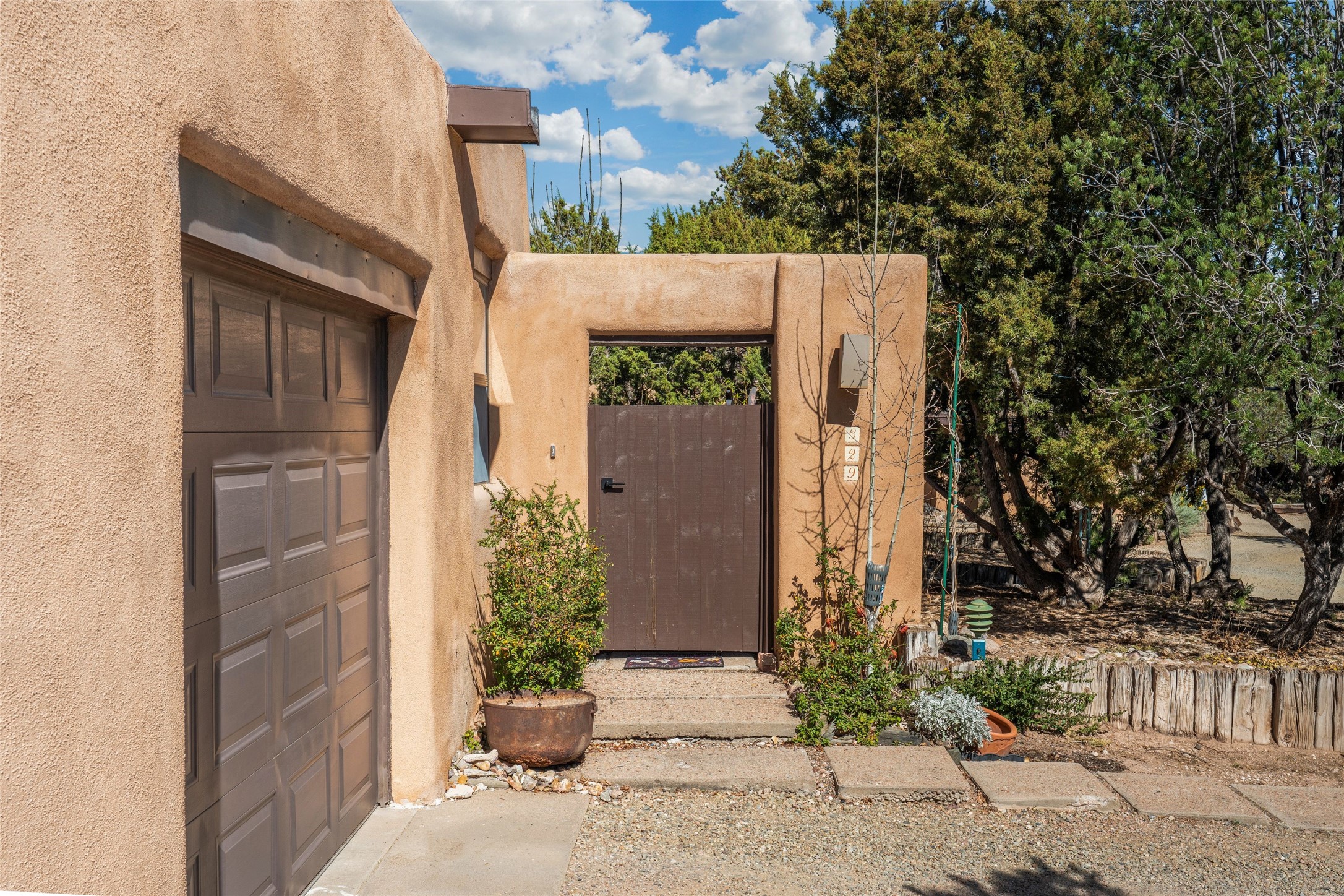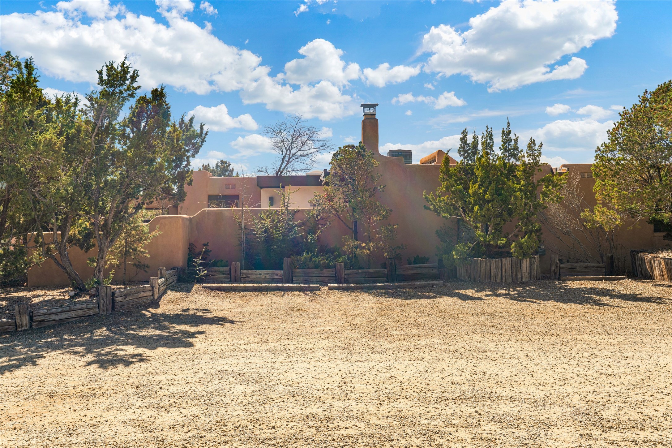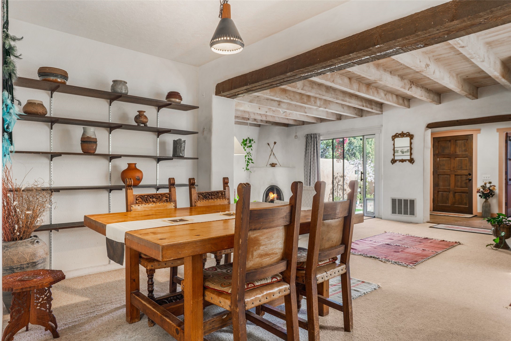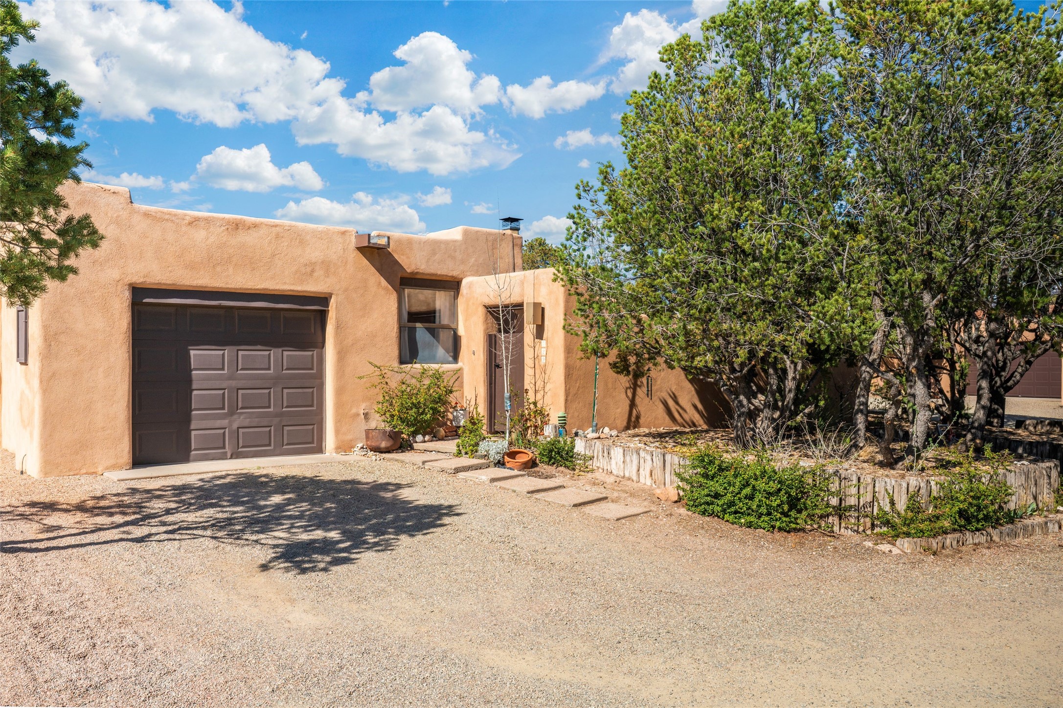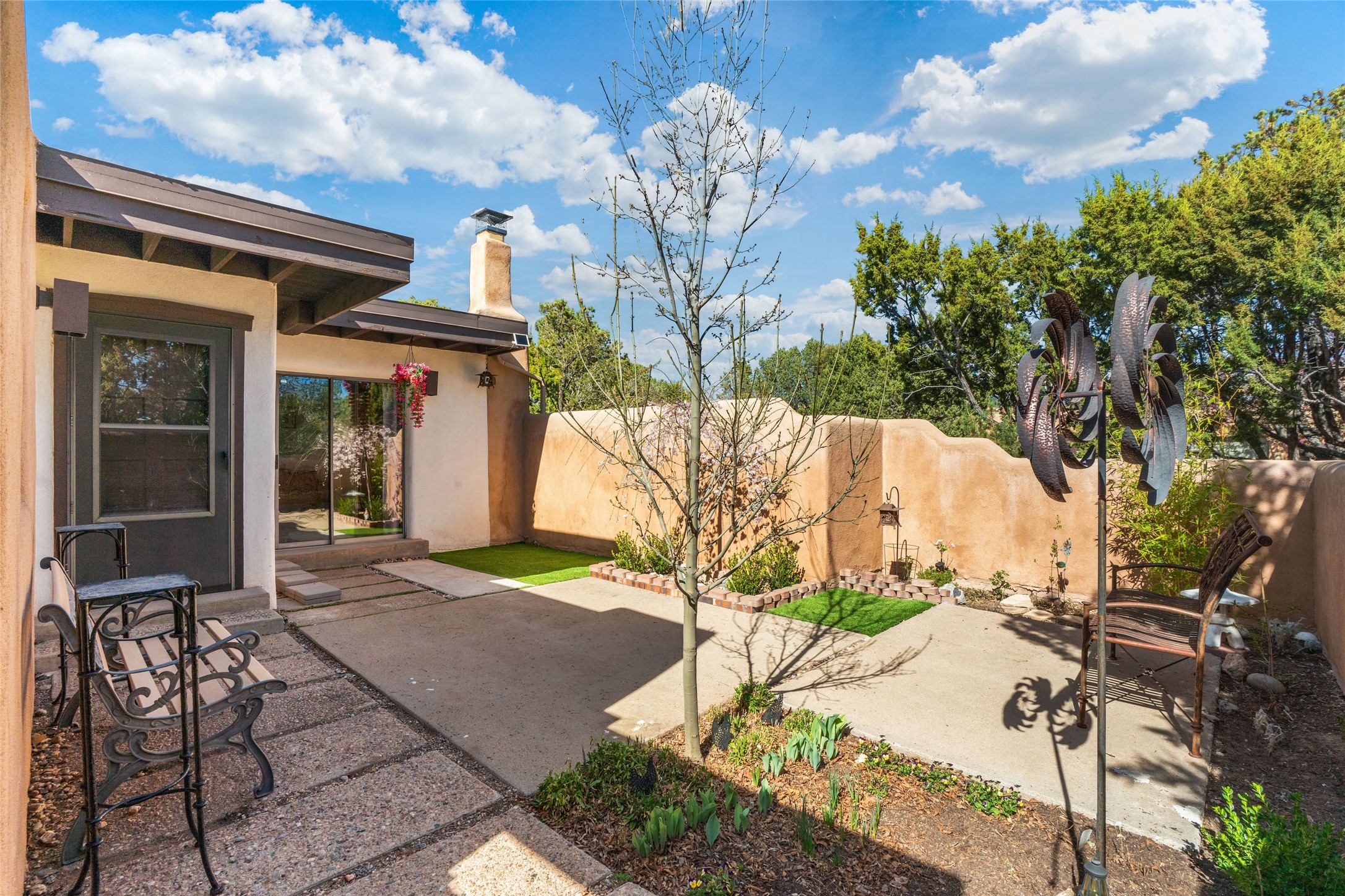 Desirable Northside single-level corner-unit condo with timeless Pueblo character, abundant natural light, and spacious living areas. Enter through a charming walled courtyard, where a blooming cherry blossom tree adds seasonal beauty to the approach. Inside, a dramatic skylit atrium forms the heart of the home, beautifully framed by a large architectural opening from the living room that creates a signature focal point. Exposed beams throughout, banco seating, sculptural stepped Pueblo-style forms, and a kiva wood-burning fireplace bring warmth and authentic Santa Fe character. The southeast-facing orientation welcomes the first light of sunrise onto the living room floor, while moonlight through the atrium adds a rare sense of calm and beauty at night. The thoughtfully separated bedroom layout offers comfort and flexibility, and the attached one-car garage provides additional storage. This property has been lovingly maintained and is priced accordingly for expected renovations. Ideally situated on Santa Fe's coveted Northside, the home enjoys a setting that offers both tranquility and convenient access to the Plaza, the Santa Fe Opera, and Ski Santa Fe, along with the quiet pleasure of frequent deer sightings that add to the natural beauty of the neighborhood.