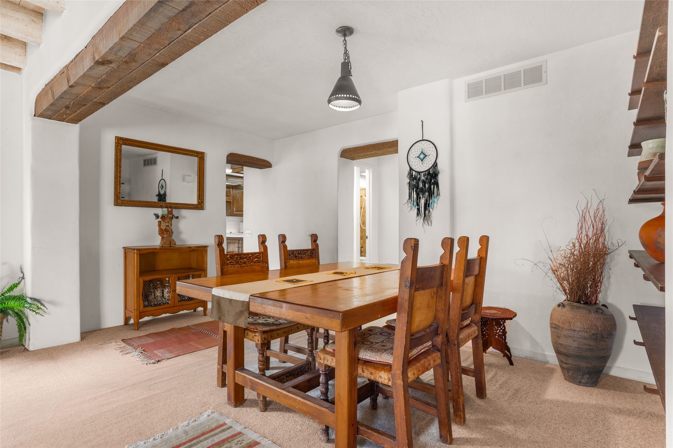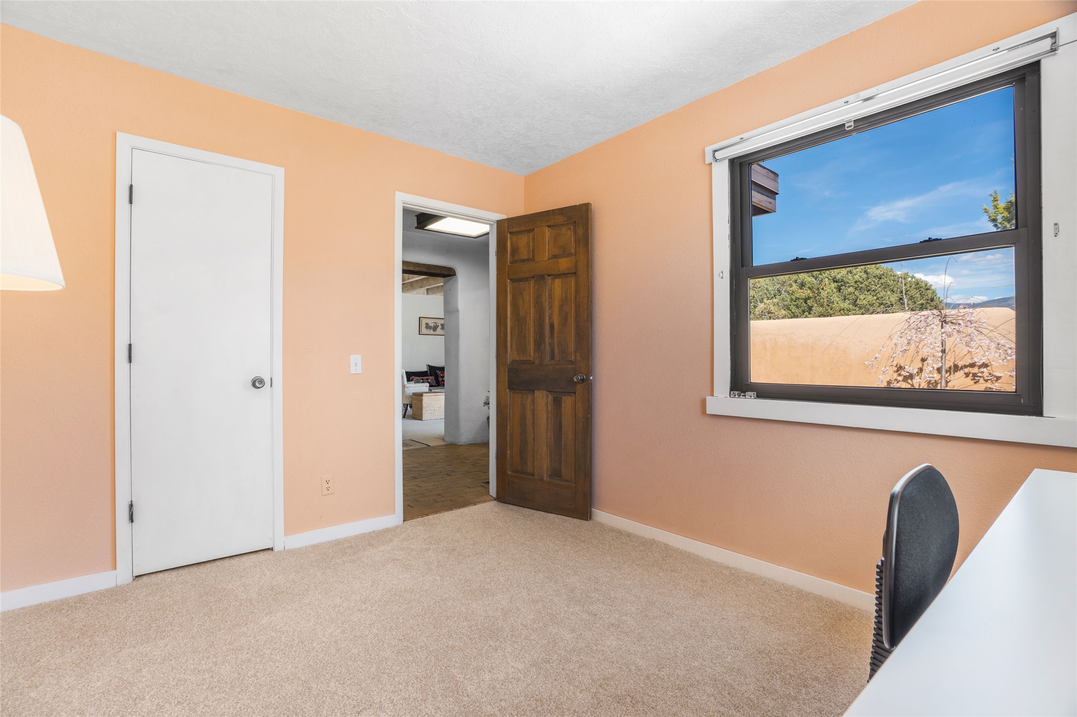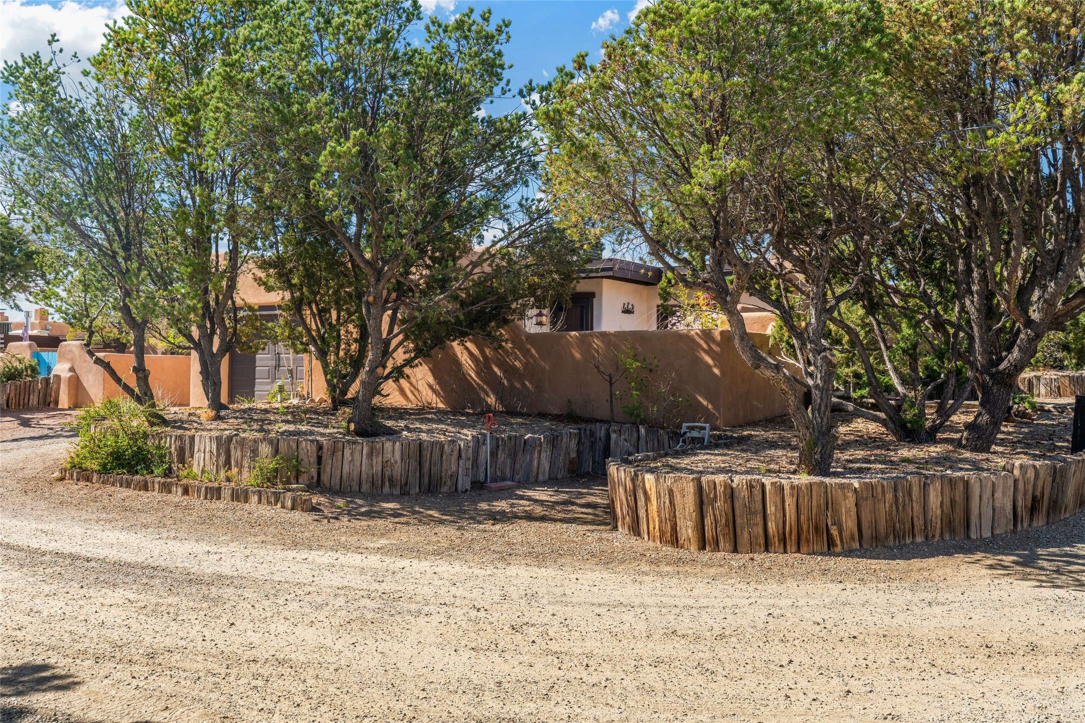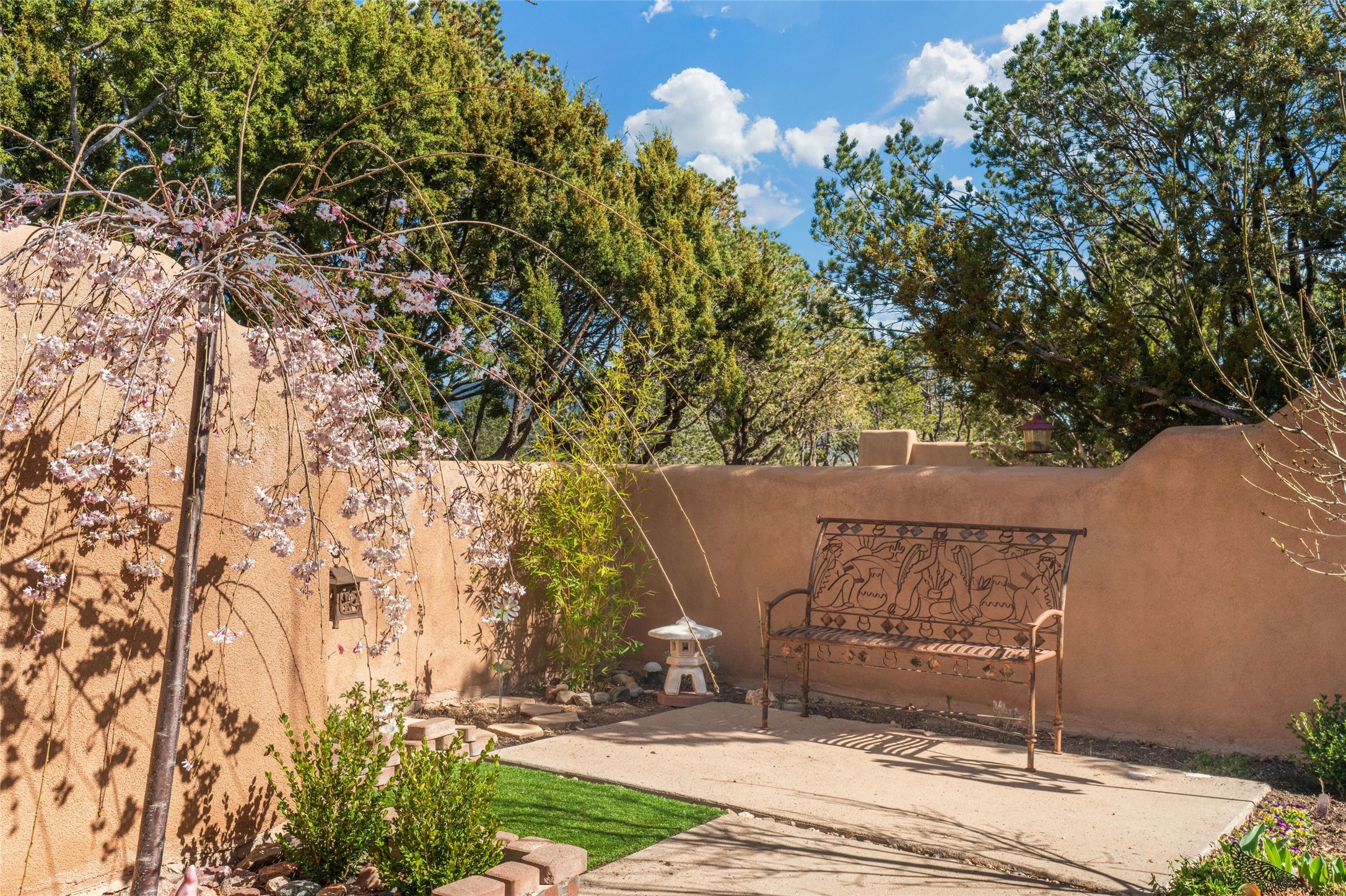 Desirable Northside single-level corner-unit condo with timeless Pueblo character, abundant natural light, and spacious living areas. Enter through a charming walled courtyard, where a blooming cherry blossom tree adds seasonal beauty to the approach. Inside, a dramatic skylit atrium forms the heart of the home, beautifully framed by a large architectural opening from the living room that creates a signature focal point. Exposed beams throughout, banco seating, sculptural stepped Pueblo-style forms, and a kiva wood-burning fireplace bring warmth and authentic Santa Fe character. The southeast-facing orientation welcomes the first light of sunrise onto the living room floor, while moonlight through the atrium adds a rare sense of calm and beauty at night. The thoughtfully separated bedroom layout offers comfort and flexibility, and the attached one-car garage provides additional storage. This property has been lovingly maintained and is priced accordingly for expected renovations. Ideally situated on Santa Fe's coveted Northside, the home enjoys a setting that offers both tranquility and convenient access to the Plaza, the Santa Fe Opera, and Ski Santa Fe, along with the quiet pleasure of frequent deer sightings that add to the natural beauty of the neighborhood.