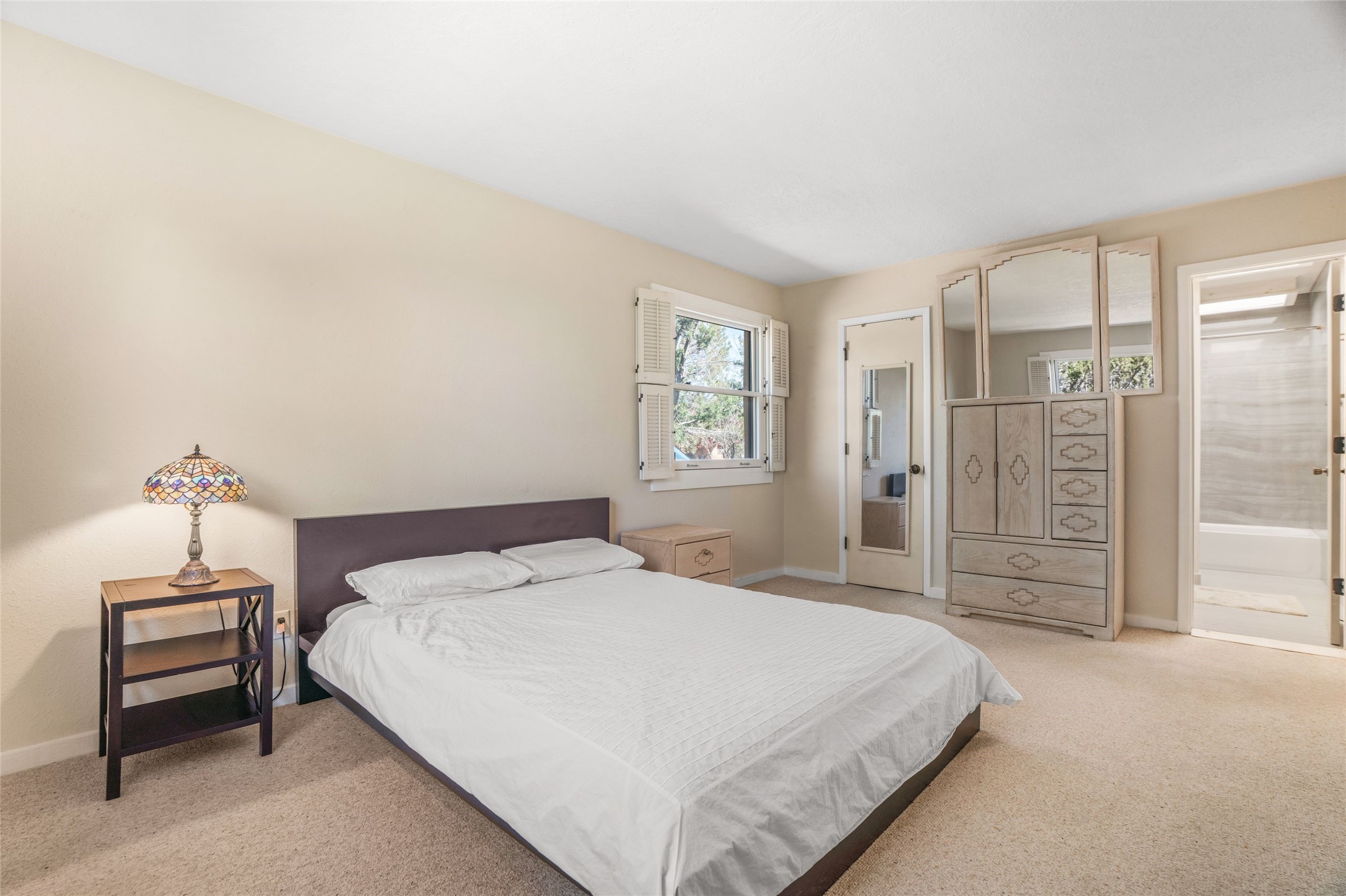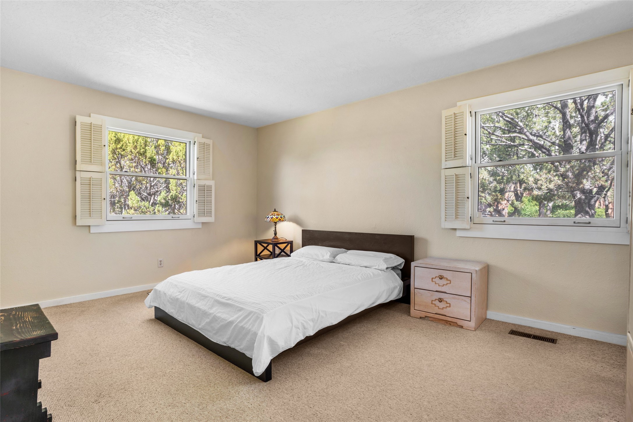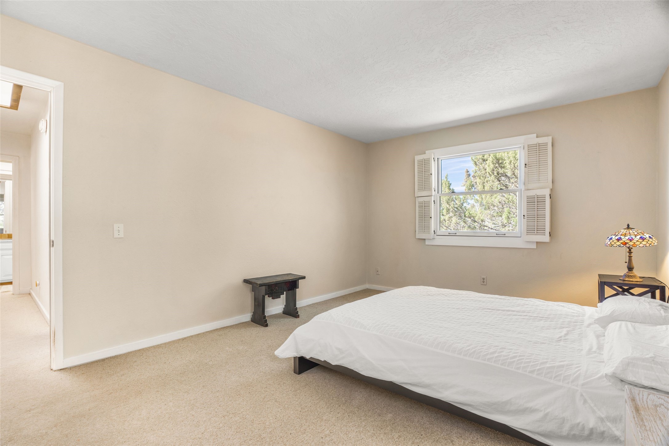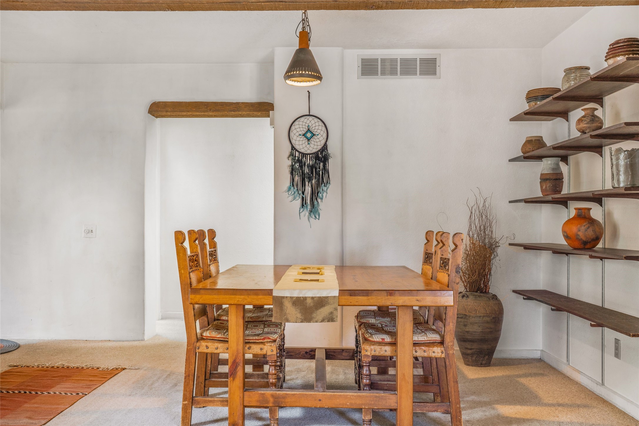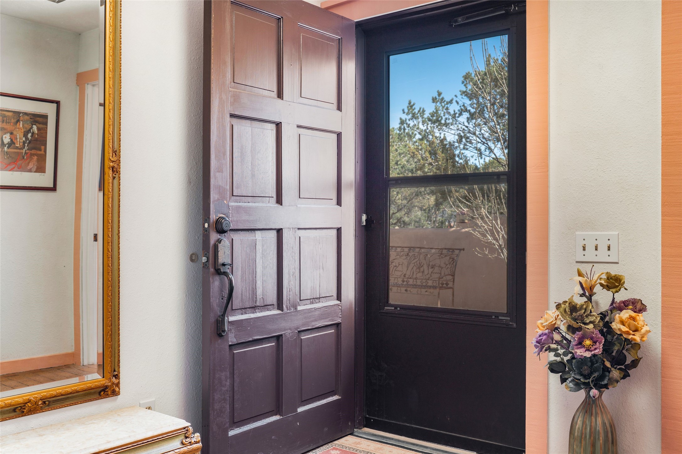 Desirable Northside single-level corner-unit condo with timeless Pueblo character, abundant natural light, and spacious living areas. Enter through a charming walled courtyard, where a blooming cherry blossom tree adds seasonal beauty to the approach. Inside, a dramatic skylit atrium forms the heart of the home, beautifully framed by a large architectural opening from the living room that creates a signature focal point. Exposed beams throughout, banco seating, sculptural stepped Pueblo-style forms, and a kiva wood-burning fireplace bring warmth and authentic Santa Fe character. The southeast-facing orientation welcomes the first light of sunrise onto the living room floor, while moonlight through the atrium adds a rare sense of calm and beauty at night. The thoughtfully separated bedroom layout offers comfort and flexibility, and the attached one-car garage provides additional storage. This property has been lovingly maintained and is priced accordingly for expected renovations. Ideally situated on Santa Fe's coveted Northside, the home enjoys a setting that offers both tranquility and convenient access to the Plaza, the Santa Fe Opera, and Ski Santa Fe, along with the quiet pleasure of frequent deer sightings that add to the natural beauty of the neighborhood.