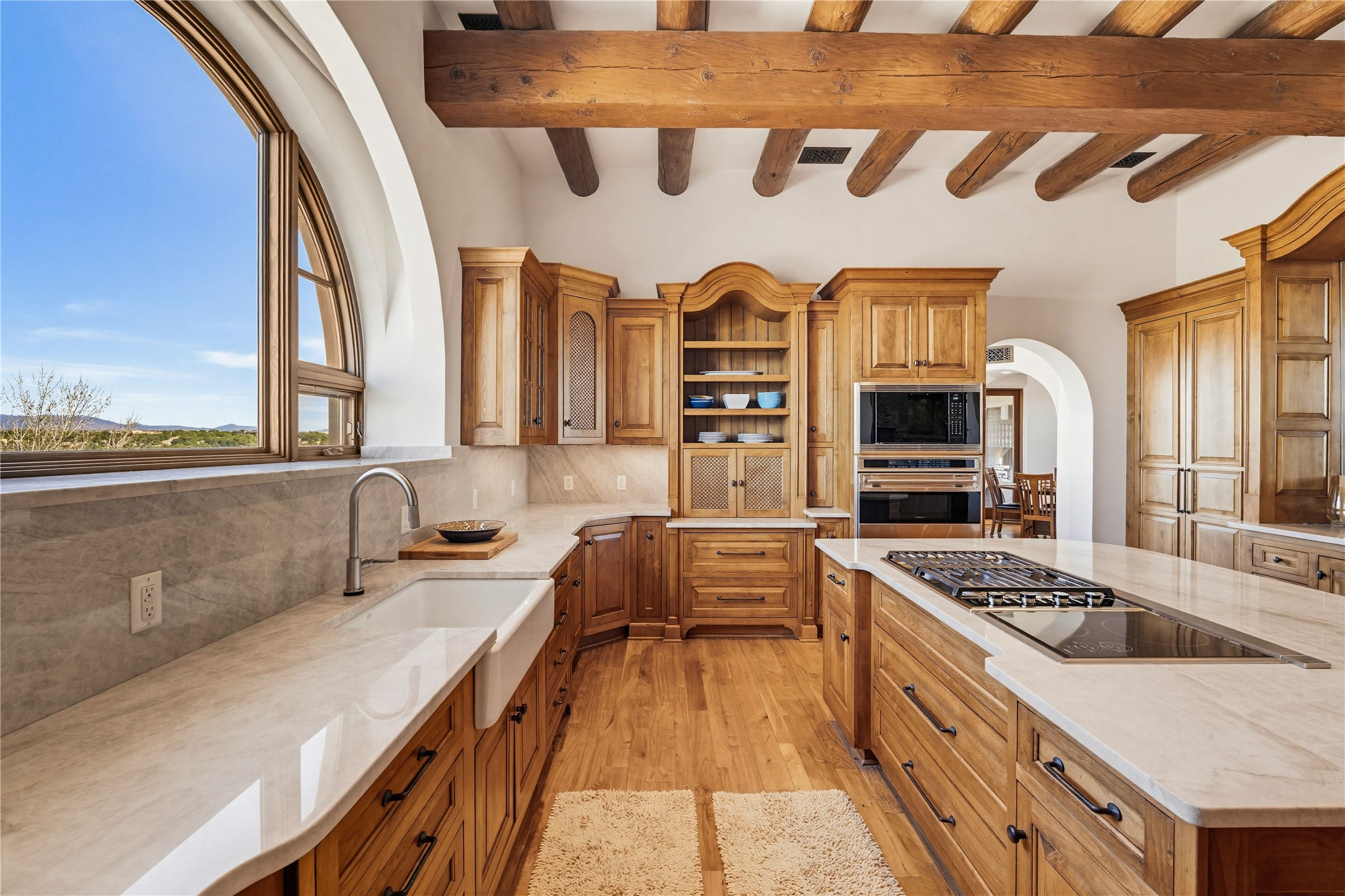 This prestigious Las Campanas estate is the epitome of luxury and sophistication, offering an unparalleled living experience on 6.09 acres of breathtaking landscapes. With panoramic views of the stunning Jemez Mountain range and the nearby golf course, this Tuscan-inspired home is a harmonious blend of architectural beauty and natural splendor. Enter through a grand foyer featuring a domed cupola, reminiscent of Italy's Pantheon, setting the tone for the elegance that awaits. The soaring great room, enhanced with a stately stone fireplace and rich walnut floors, seamlessly transitions to covered portals, enabling a perfect indoor-outdoor living experience that is ideal for both entertaining and everyday living. The gourmet chef's kitchen is a culinary artist's dream, complete with a spacious center island. Wine enthusiasts will appreciate the impressive 3,400-bottle wine cellar, with space for tastings or special meals. The luxurious primary suite features exquisite Taj Mahal quartzite counters and showers The attentive design includes a versatile guest bedroom that can serve as an optional library or office, along with a separate 2-bedroom guest wing and an attached guest suite equipped with its own kitchenette. 5-car garage and a motor court with additional covered parking. Membership to the Club at Las Campanas with 2 Jack Nicklaus golf courses, a state-of-the-art athletic facility with tennis and pickleball plus a world class equestrian center is available upon approval. This listing includes a separately deeded 2.64-acre contiguous parcel 910007911 (physical address 12 Hacienda Rincon).