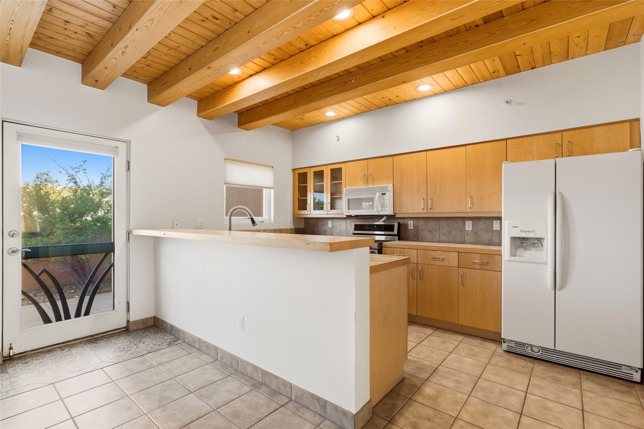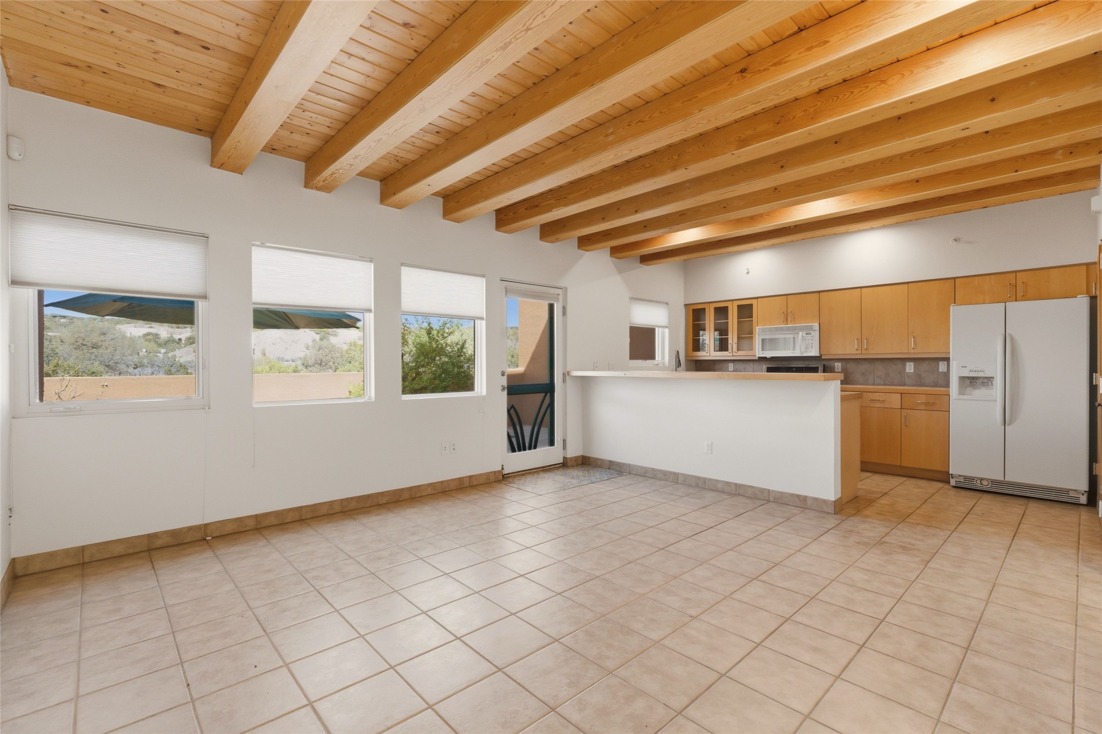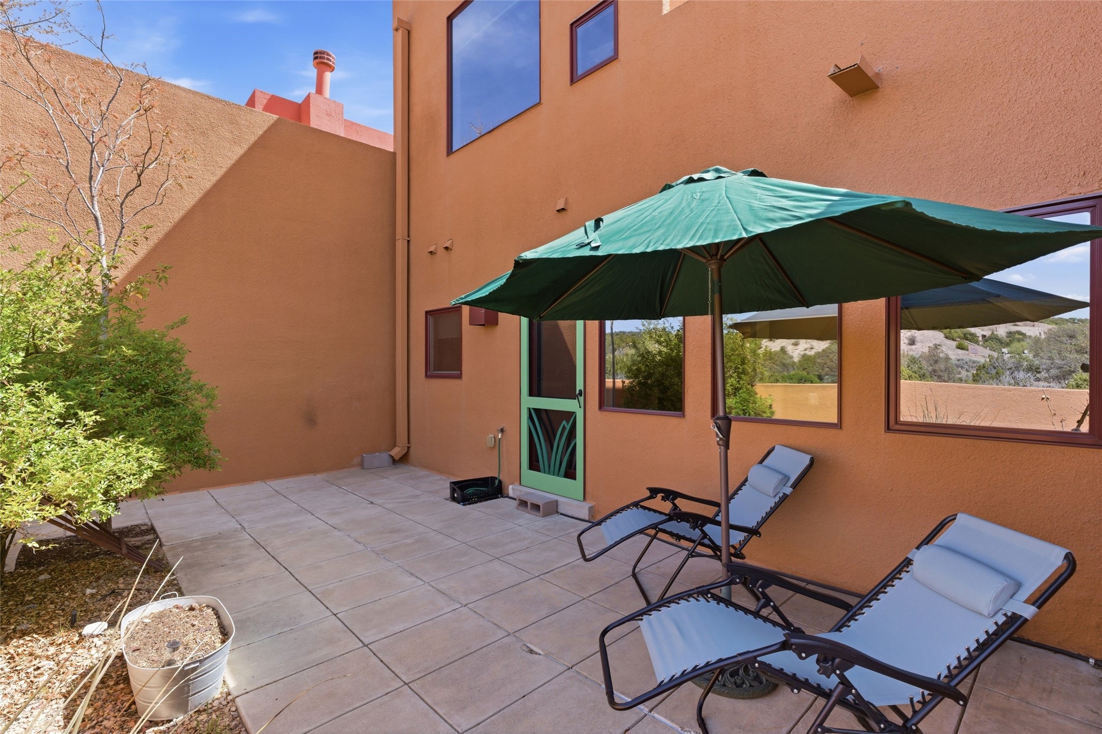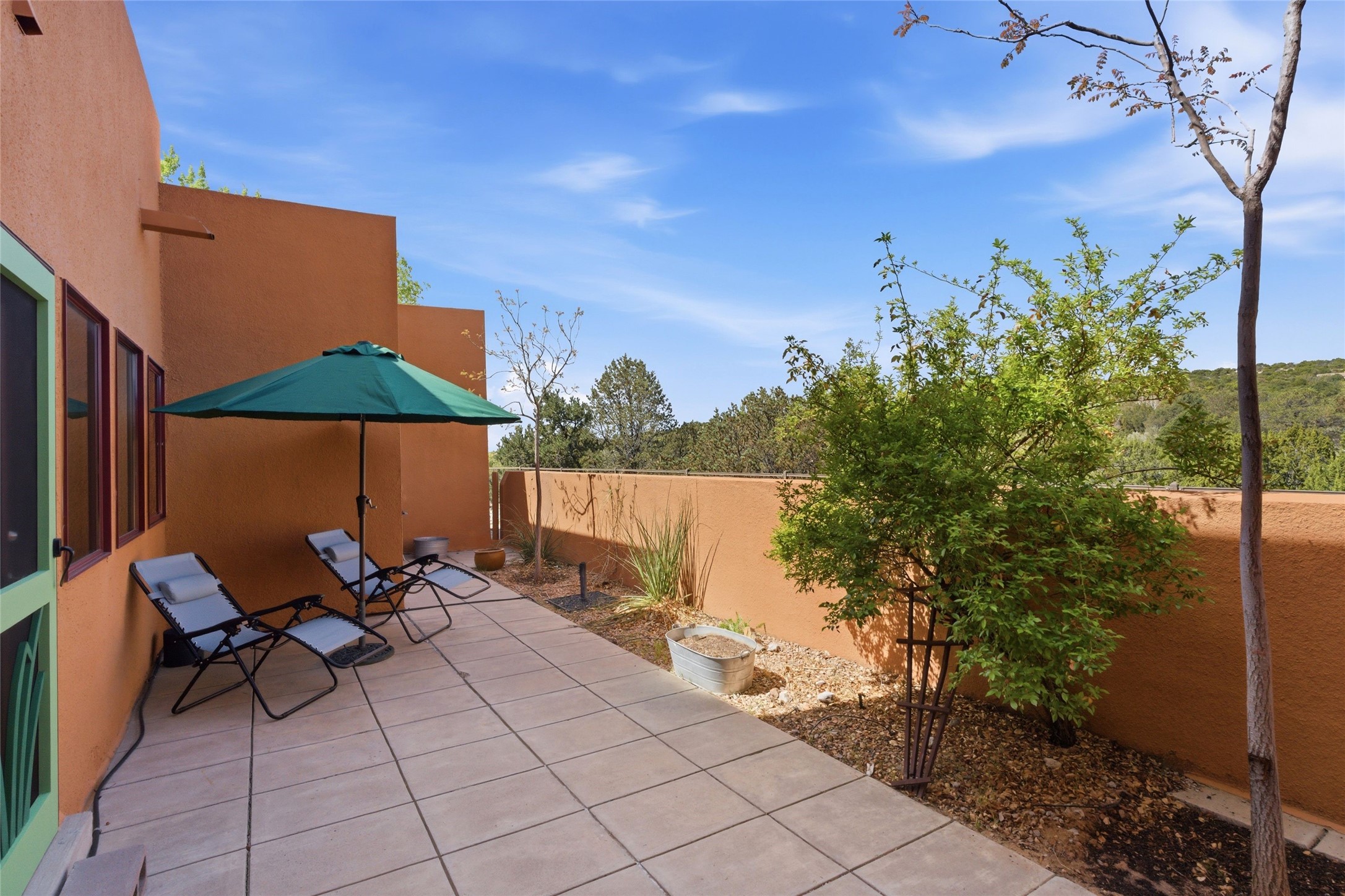 Ricardo Legoretta designed modern comfort in the desirable Northside community of Zocalo. This is atwo bedroom, two and half bath, two story condominium less than ten minutes to downtown Santa Fe, shopping, museums and galleries. Built in 2005, the unit offers two generous master suites; one upstairs with a private balcony, the other downstairs, offering direct access out to the landscaped patio. Downstairs offers open living / entertaining spaces with a two sided fireplace separating the kitchen, living area and dining area. High ceilings over the dining room offer ample skylights tile floors and wood ceilings over the living room are just some of the architectural finishes expected in a Santa Fe home. The open space allows for flexible usage and placement of furniture - depending on your lifestyle! Recent upgrades include a new oven / stove, a raised granite bathroom countertop in the upstairs suite, a utility sink in the garage, and two 14' Golden Rain trees in the back patio. Regarded as one of the most popular floor plans, this "Barranca" unit offers west facing views over the arroyo and into the tree-studded hillside. The finished twocar garage offers direct entry into the home. Community amenities in Zocalo include two fitness facilities, a clubhouse, pool and spa.