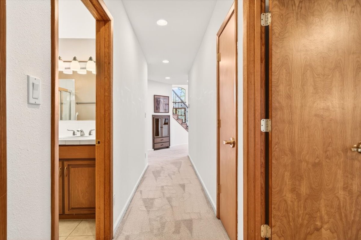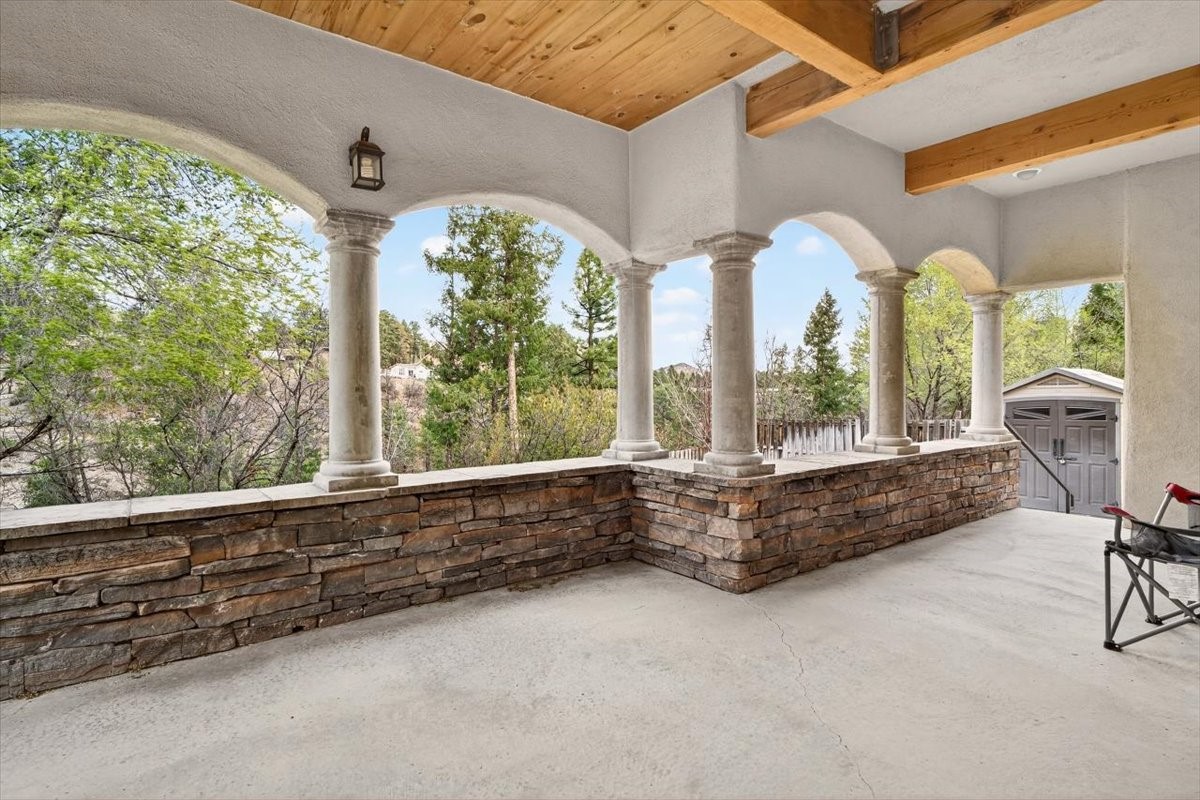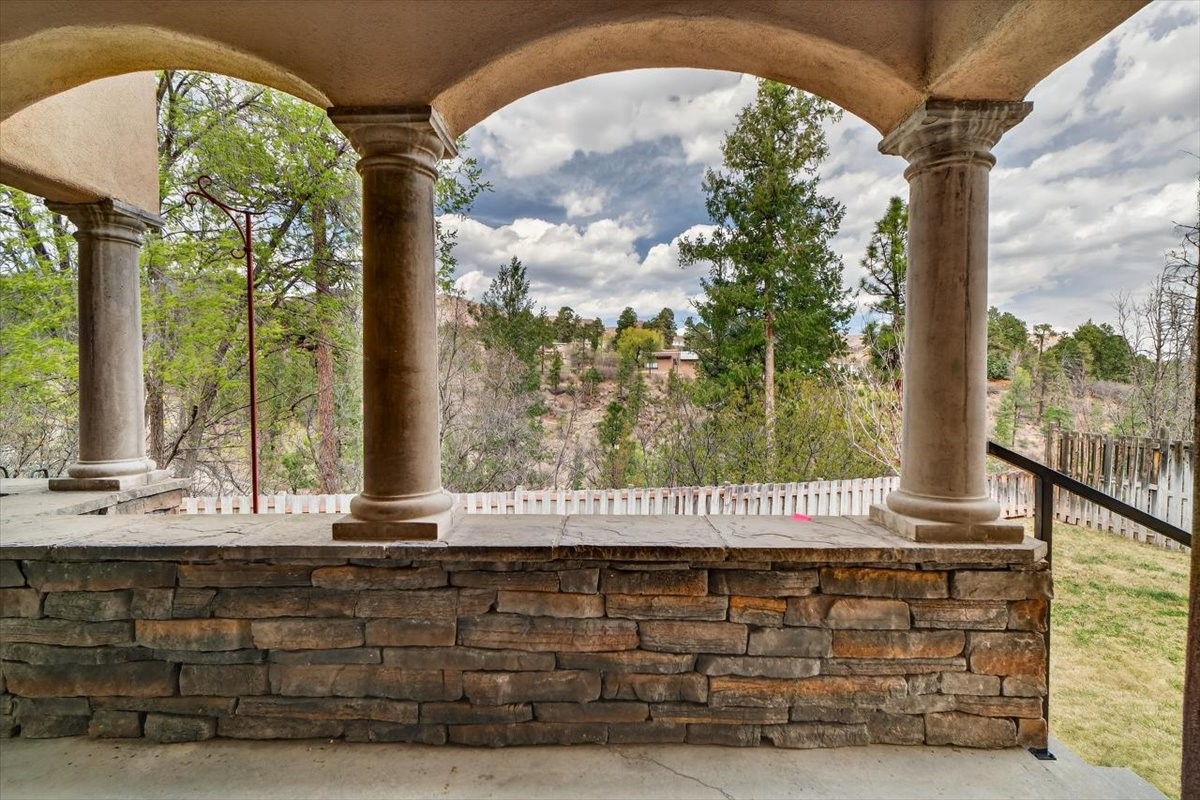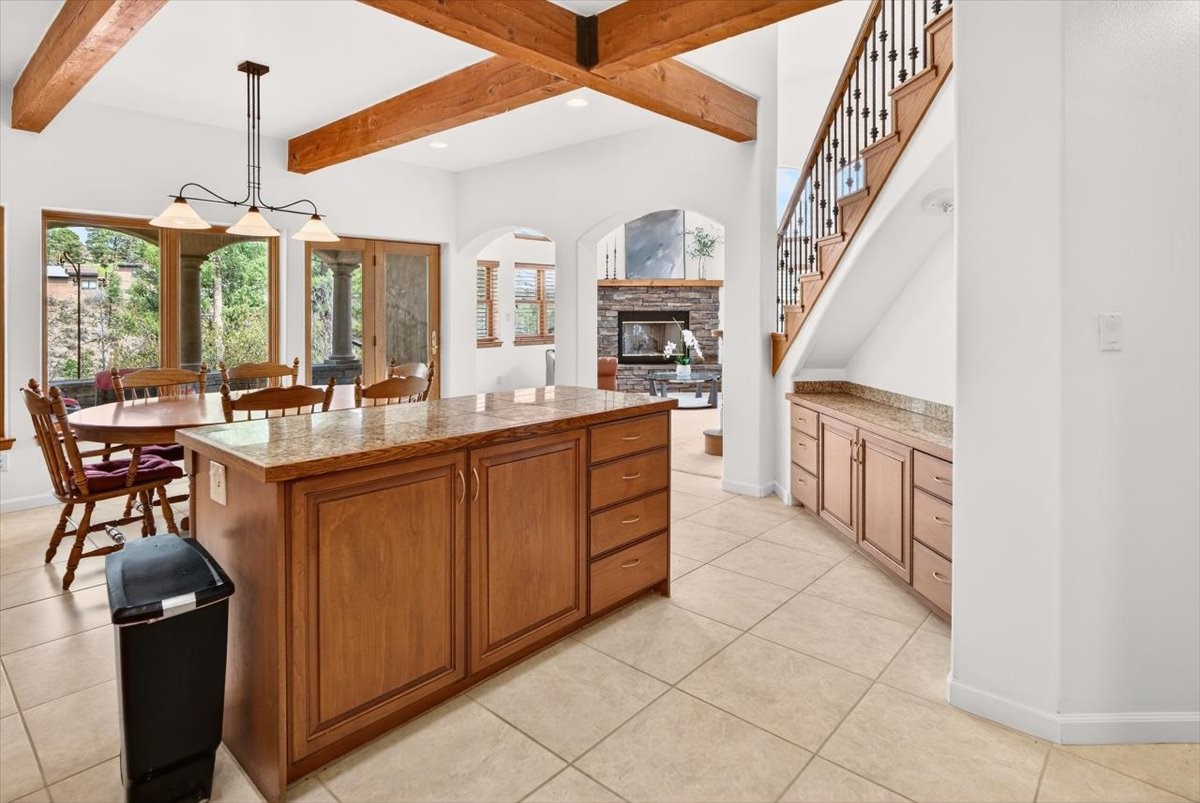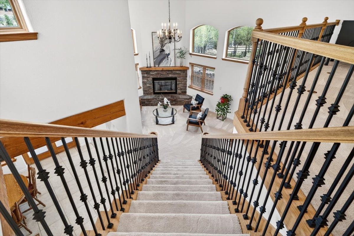 Crafted with enhanced safety standards and durability at the forefront, this 2004-built residence features exceptional construction, including 2x10 wall framing with R-32 insulation and a 1.5-inch fire-rated stucco exterior. The 2011 metal roof, designed to resemble classic clay tile, is fully fireproof and includes a transferable warranty, while double-pane skylights enhance both efficiency and natural light. A grand foyer welcomes you inside, where a striking stone fireplace and iron staircase anchor the living spaces and set a refined tone. Arched windows accentuate the home's distinctive character and fill the space with natural light. The upper level features two bedrooms, including a well-appointed primary suite with a spa-like bath, generous walk-in closet, and private sitting area. A den overlooks the living room below, adding dimension and openness to the design. The lower level serves as the heart of the home. Arched architectural details lead into the dining area and kitchen, where custom alder wood cabinetry, granite tile countertops, and a 2025 appliance suite create a functional and stylish workspace. An island with a pullout workstation offers added versatility. This level also includes two additional bedrooms and direct access to the backyard. Just off the kitchen, the patio is thoughtfully designed for year-round enjoyment, complete with integrated Bose speakers and a balance of shelter and openness ideal for entertaining. A 550-square-foot bonus room--originally designed as a dance studio--offers flexible use as a home theater, game room, or creative space. Additional features include in-floor radiant heating throughout both levels, central air conditioning, and solid-core ADA compliant doors. The oversized garage accommodates larger vehicles. Located near hiking trails, public transportation, and the local high school, this property combines thoughtful design, quality construction, and everyday livability. Schedule a private showing today.