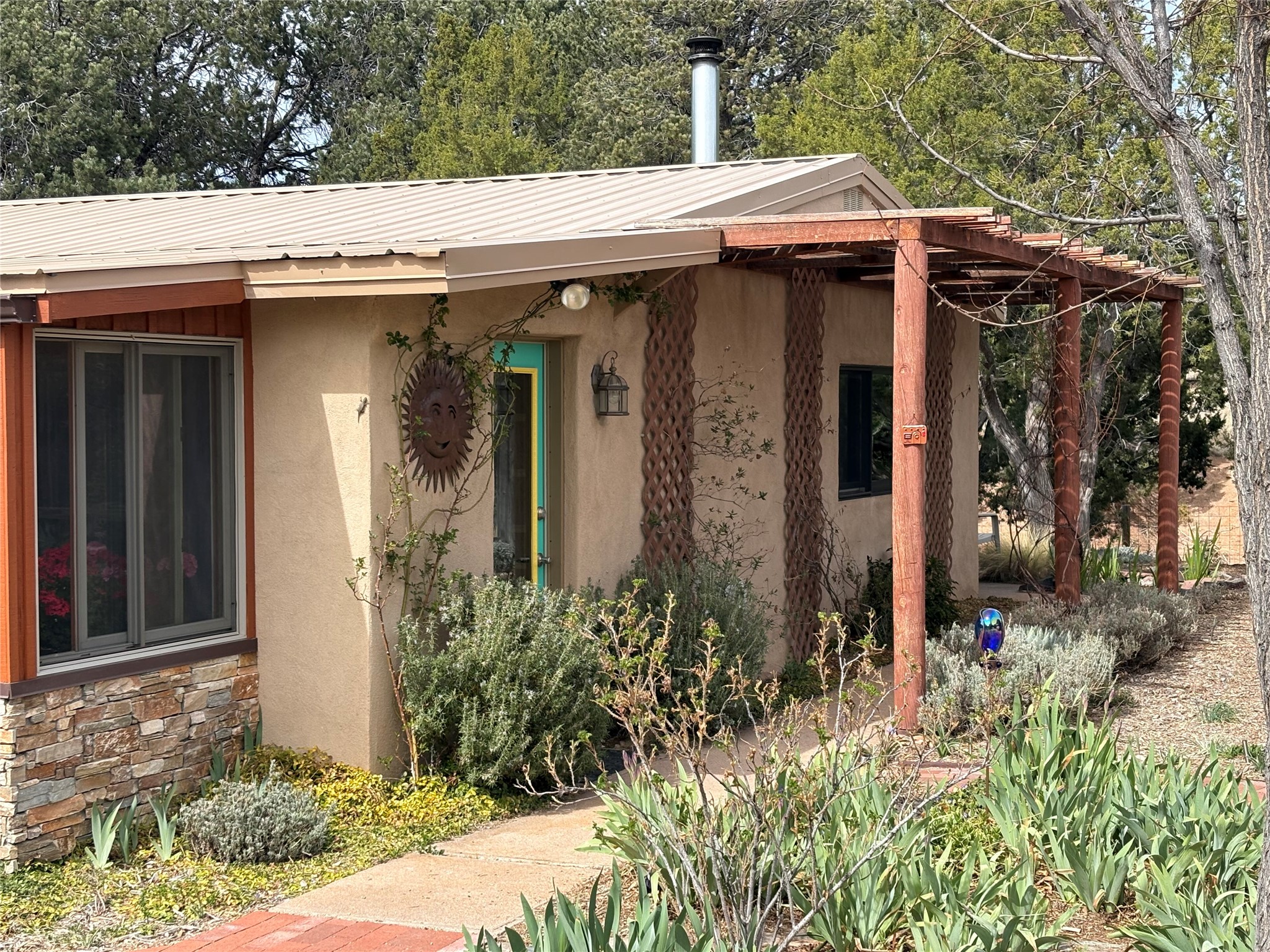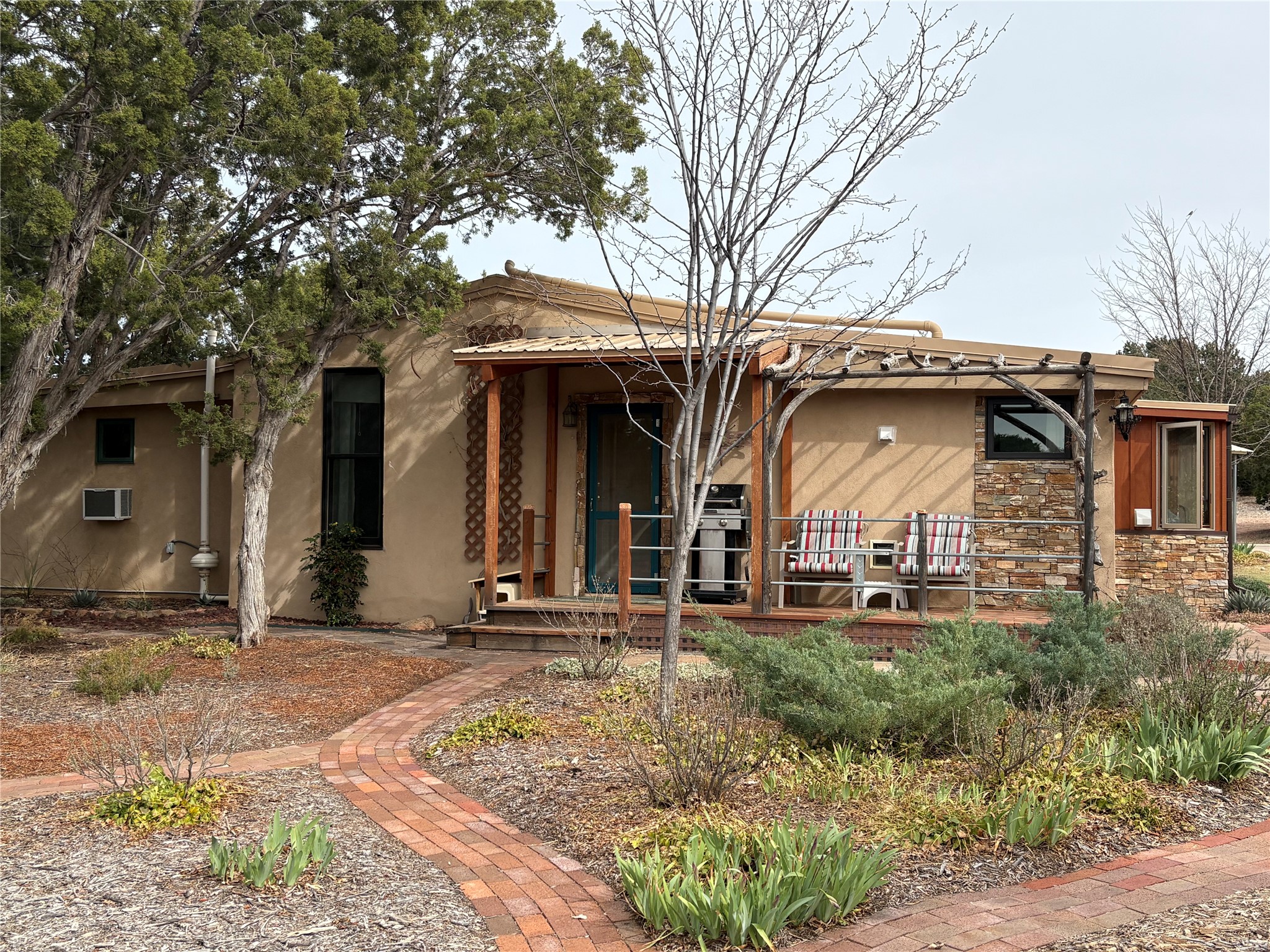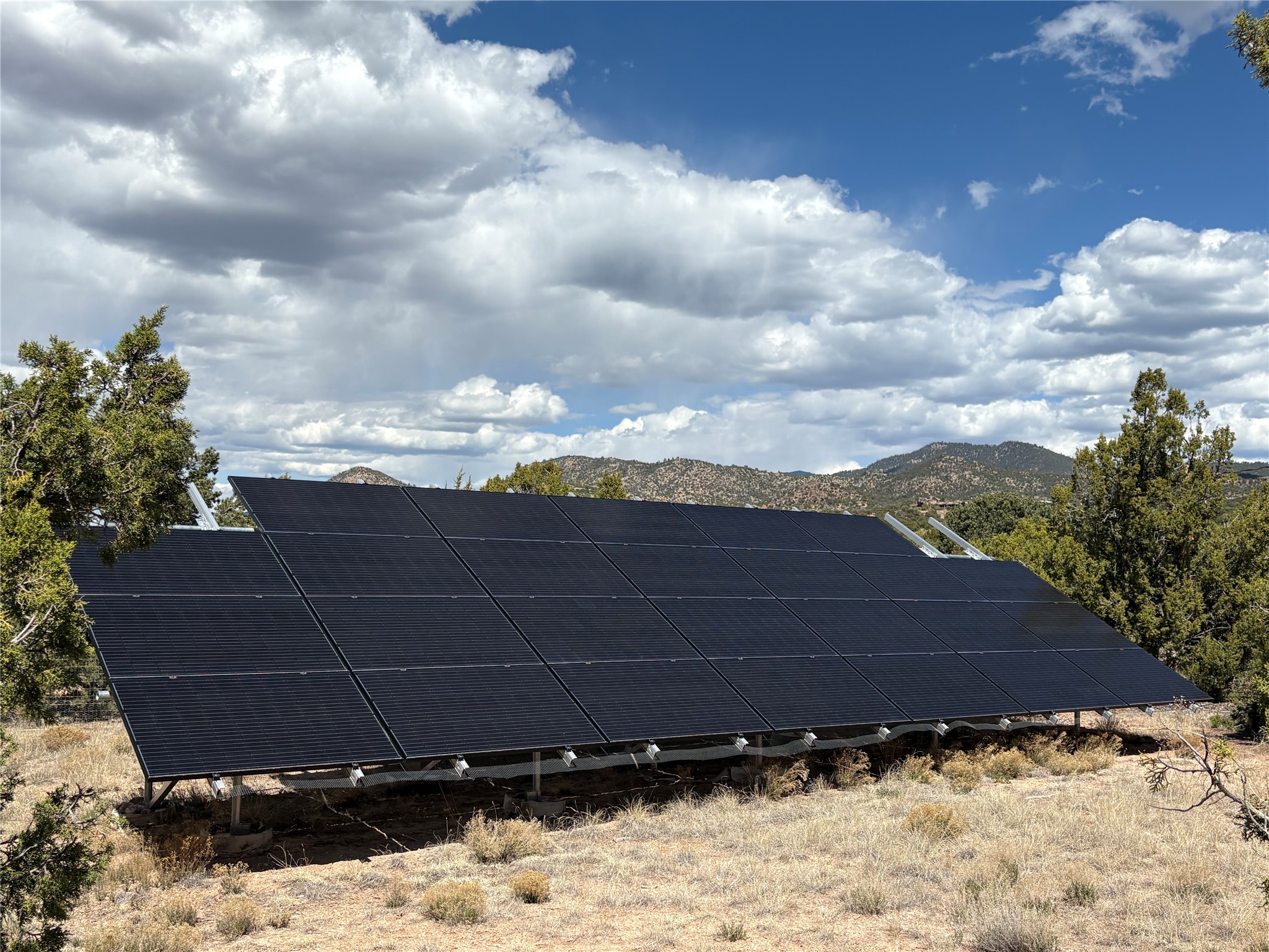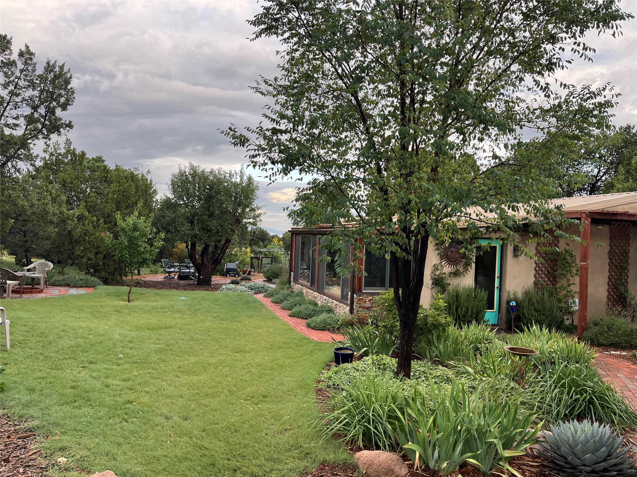Welcome to '' The Ravens Nest '', this special oasis is nestled among old growth pinon and juniper trees. This 2 bedroom 1 bath home sits on 3+ acres with water-wise landscaping and fertile developed garden beds on a drip system. The attached greenhouse is great for getting plants started and provides passive solar gain to the main house. This property is a very private and peaceful haven yet it's only 12 minutes to the plaza, 6 minutes to the hospital, 3 minutes to I-25 and supermarkets. There is over 1700 square feet of heated space including the main house, the studios and the guest cabin. This property allows for self-sufficient living, featuring a large solar array that powers the house and out buildings, a high producing private well [25 gpm] and over 3000 sq. ft. of gardens under cultivation for organic vegetables, berries, fruit trees and grape arbors all on a well developed drip irrigation system. In addition to the solar powered electric heating system there is a cozy wood stove to support you during the colder winter months. There is a completely new pitched propanel roof and updated windows and doors installed in 2016, a complete kitchen remodel just 5 years ago, a new septic system installed in 2016, new water heater in 2017 and a new washer in 2026. Did I mention the Chicken coop with the hens, a great hot tub and a root cellar all convey. Needless to mention that the guest cabin with basic bath and the studios are all rentable buildings which could provide supplemental income. The property is bordered by an arroyo which separates it from over 50 acres of private land and a ten minute walk brings you to hiking and biking trails at the Arroyo Hondo Open Space Preserve. This is a rare find for country living so close to town ... Please schedule a visit asap, this property won't last long on the market.