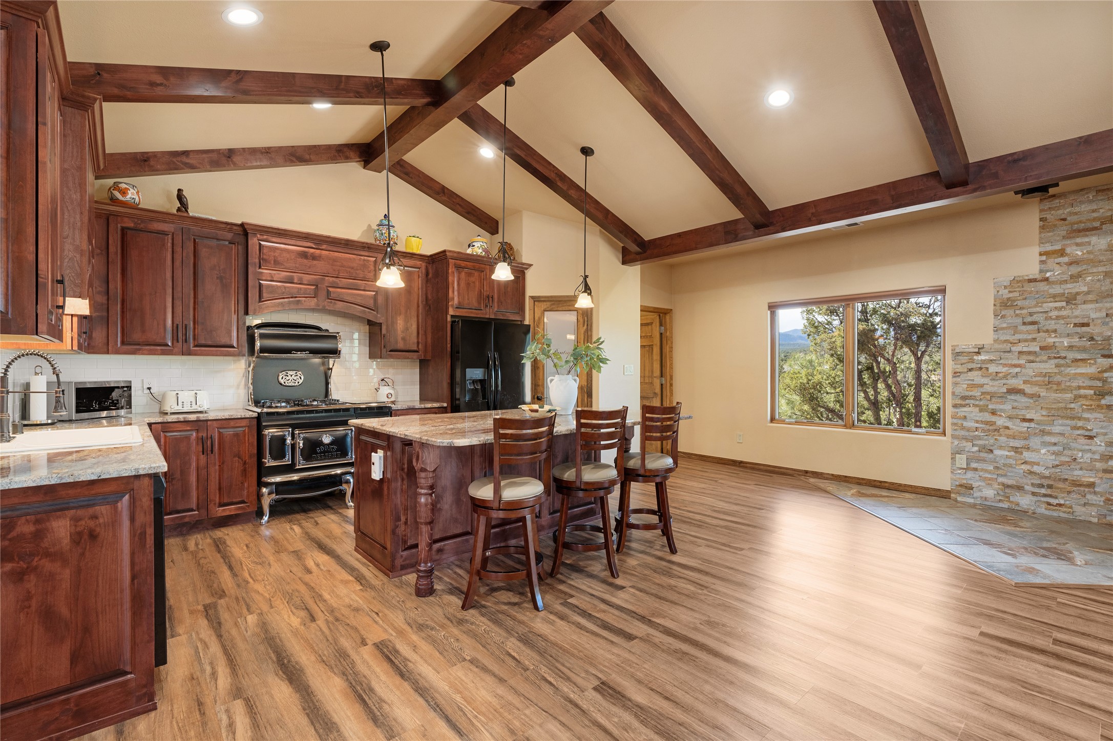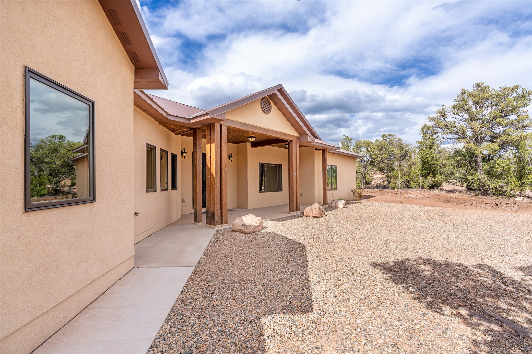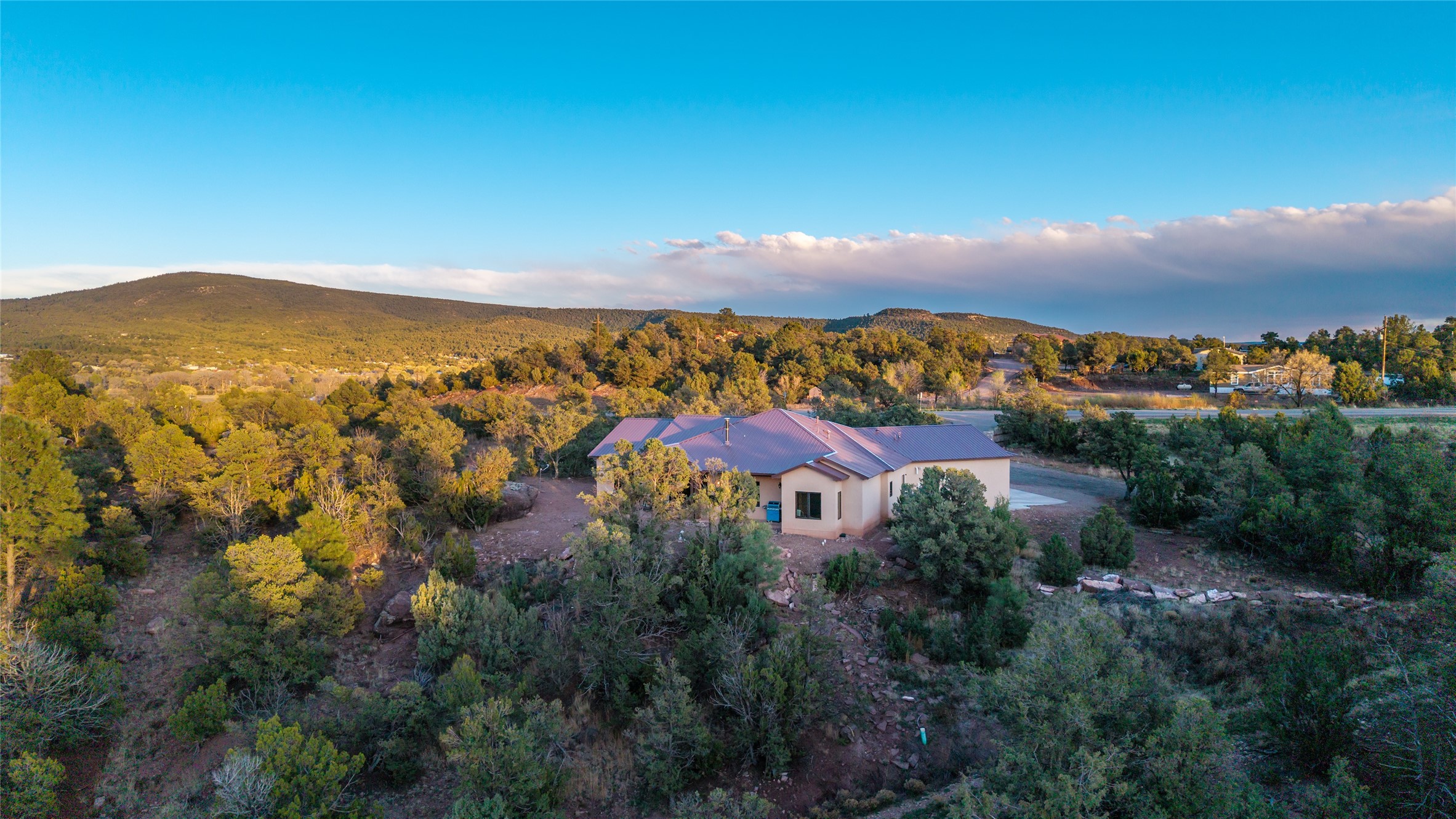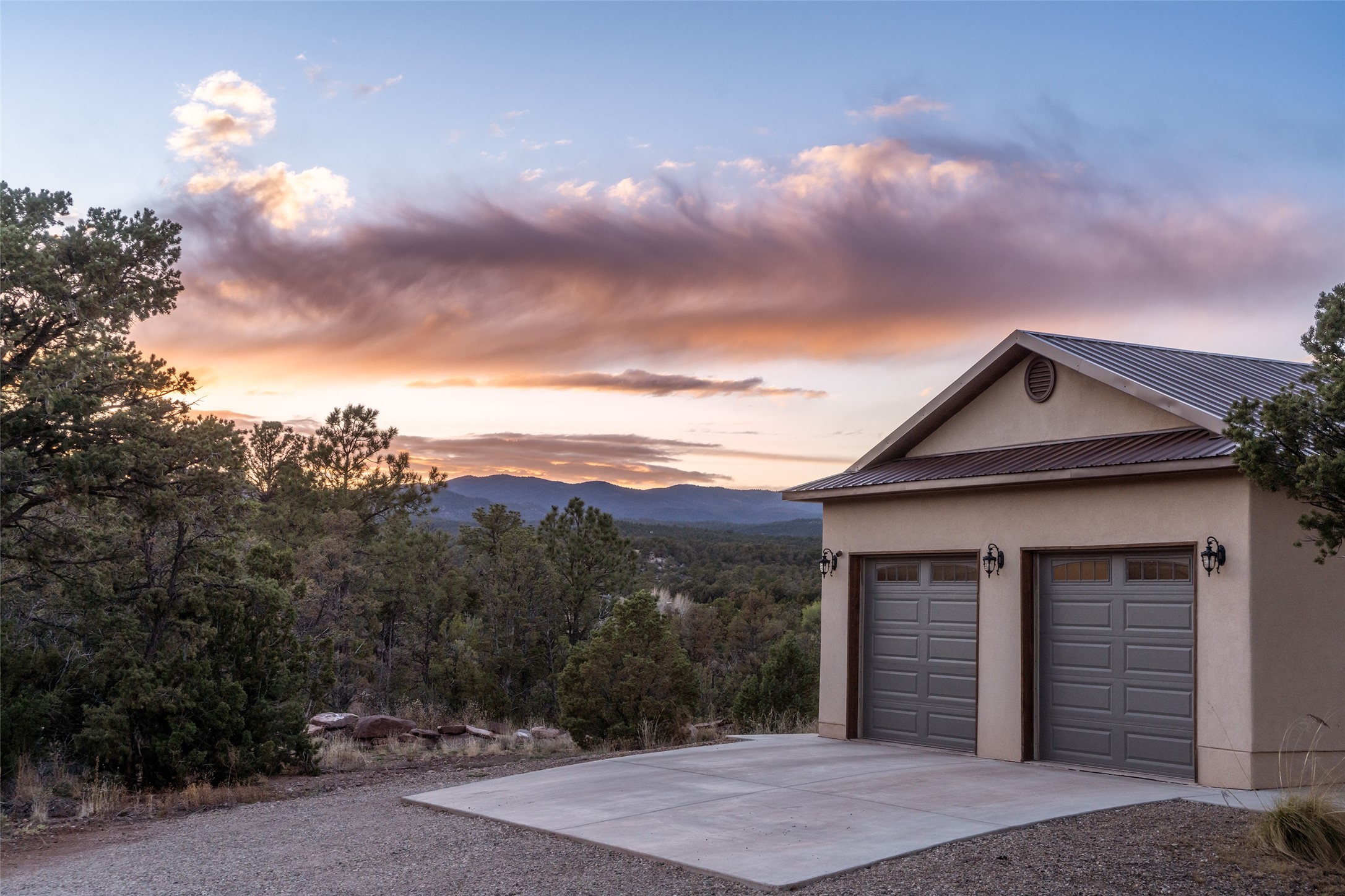 Built in 2021, this beautiful Pecos retreat is the perfect blend of modern comfort and cabin-like living with easy access to the amenities of Santa Fe and the Pecos Wilderness for outdoor enthusiasts. Located directly off of a county-maintained road, this is ideal for year-round living. Designed for both everyday living and entertaining, the open-concept kitchen features soft-close cabinetry, a large pantry and an Elmira Stove Works retro-inspired gas and electric range with convection oven. The spacious living room showcases vaulted ceilings with wood beams and opens to a covered rear portal perfect for taking in the surrounding scenery and enjoying the clear, starry night skies. The split floor plan provides excellent privacy. The generous primary suite includes a luxurious ensuite bath with dual vanities, granite counters, a custom tiled shower, two walk-in closets with built-ins, and separate commode areas. On the opposite side of the home, two well-sized guest bedrooms, one with dual walk-in closets, share a Jack-and-Jill bath with double sinks and granite finishes.Additional highlights include a spacious office with French doors, a finished 2-car garage with overhead storage and direct entry into a large laundry room, Pella windows and doors, forced air heating with central refrigerated A/C, a pitched pro-panel roof, tankless hot water heater, and a whole-house water softener. Serviced by Village of Pecos water and sewer, Mora-San Miguel Electric, and propane gas, this thoughtfully designed property offers comfort, functionality, and stunning views in a peaceful setting.