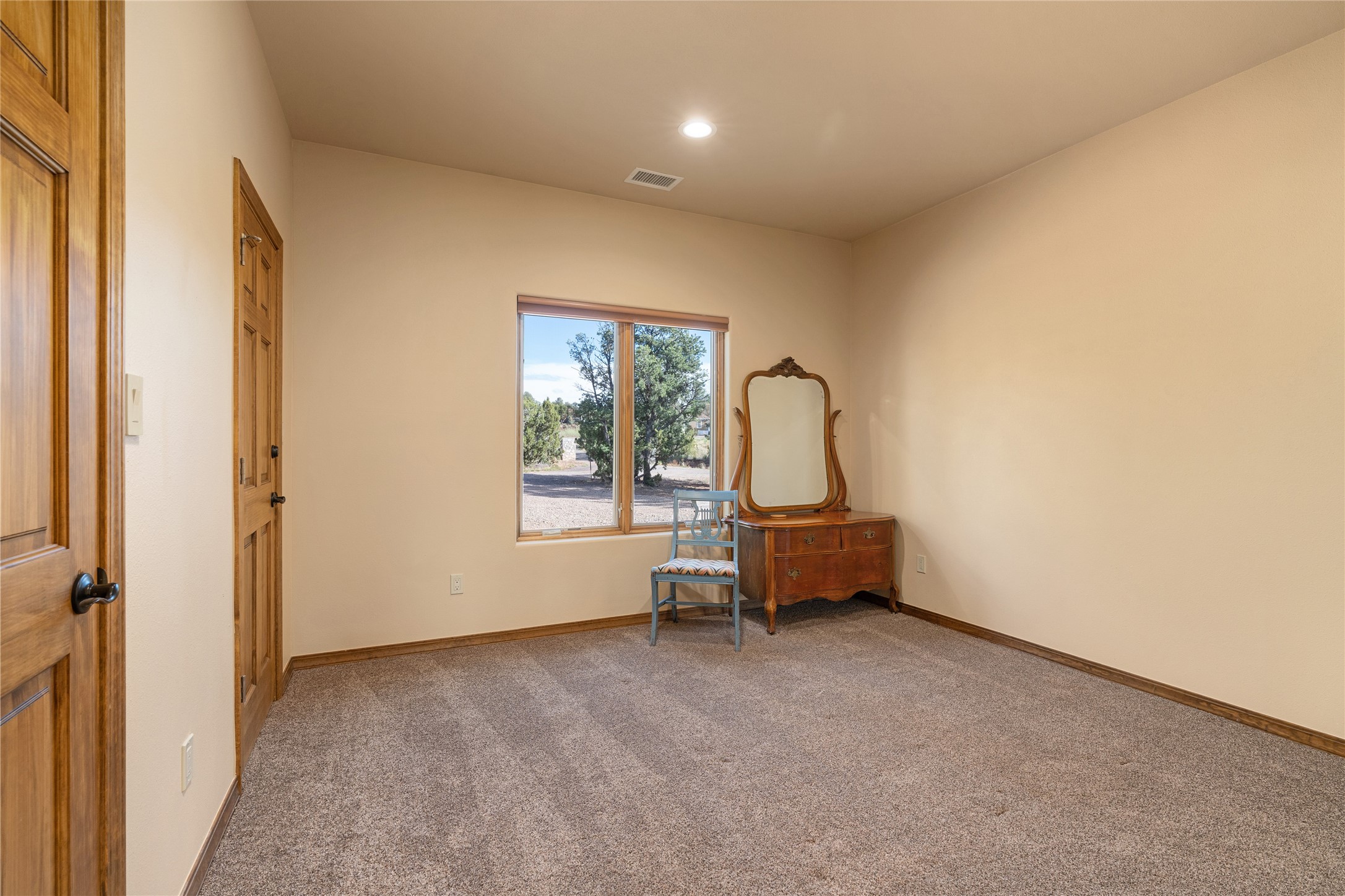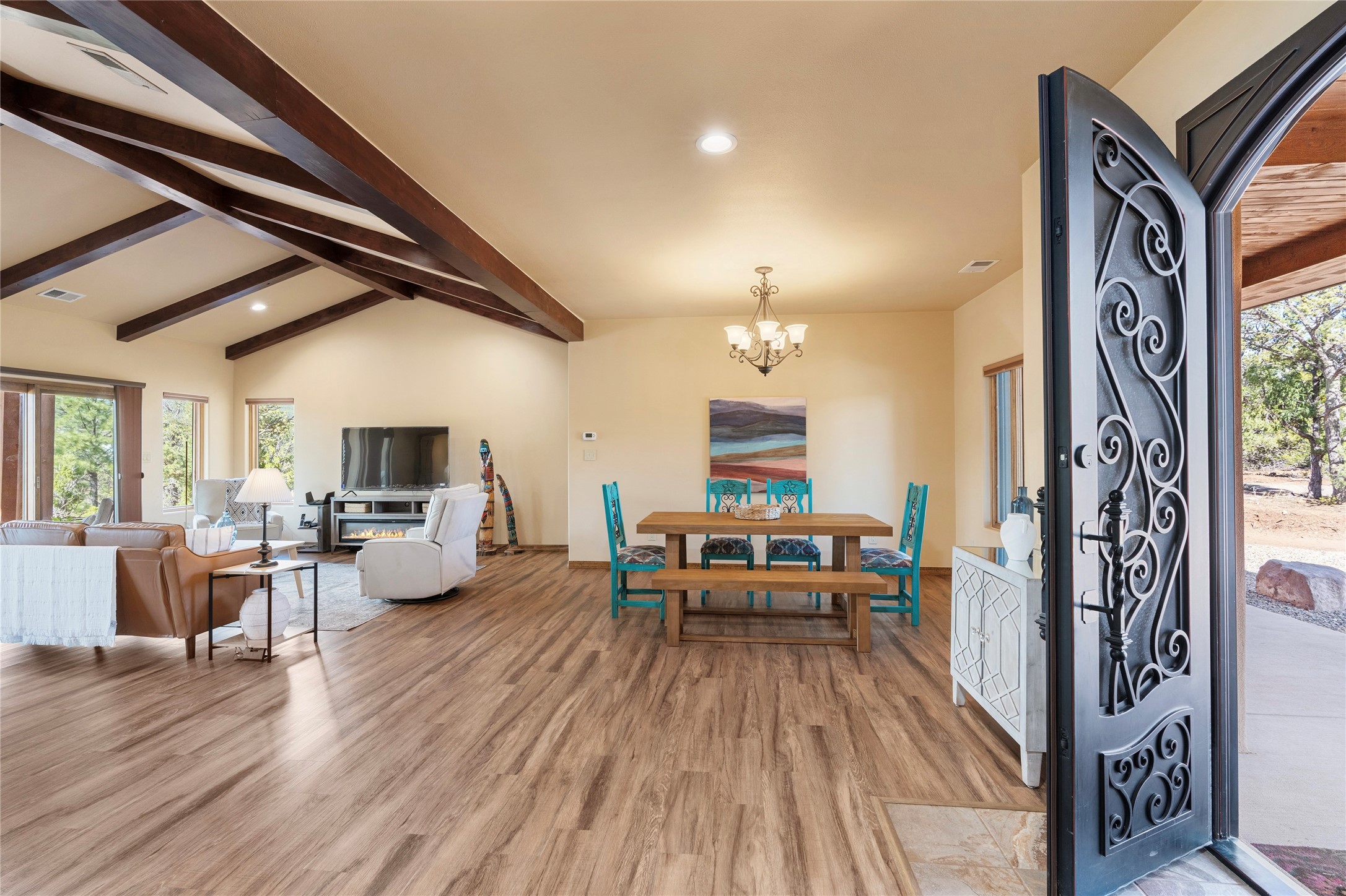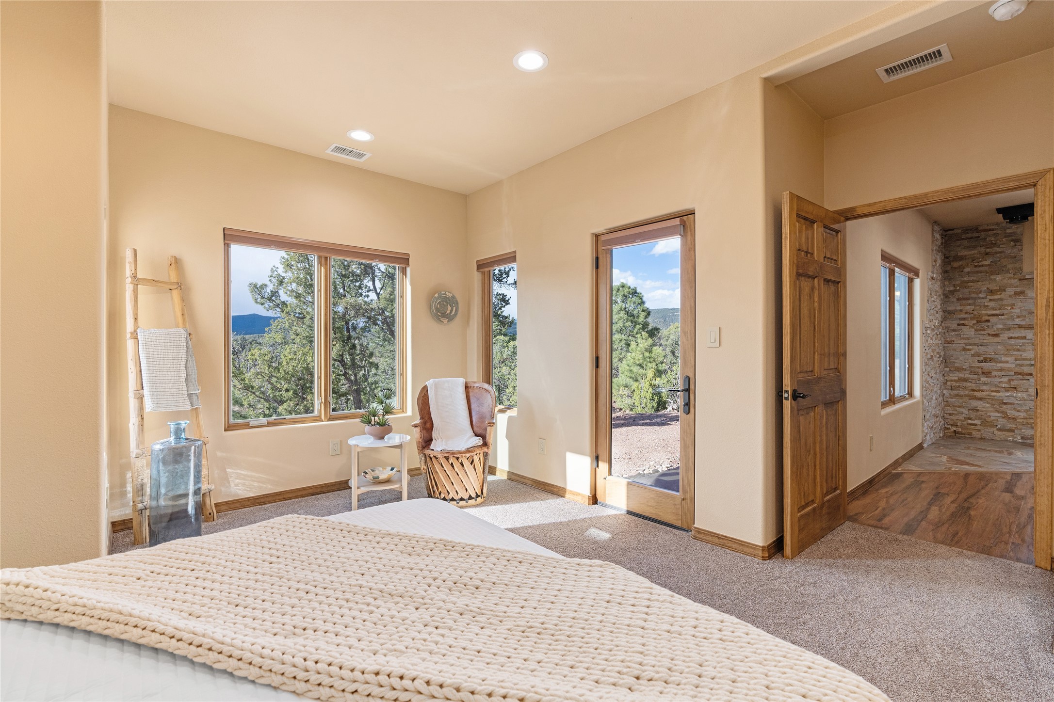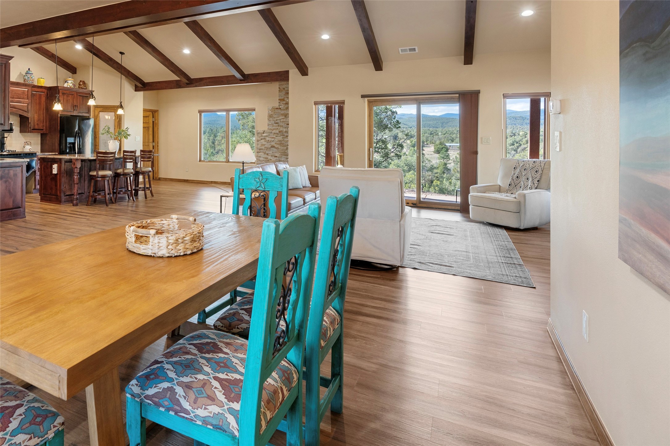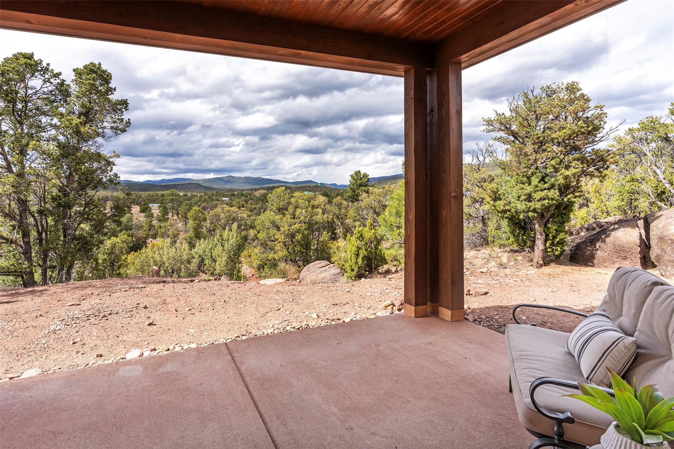 Built in 2021, this beautiful Pecos retreat is the perfect blend of modern comfort and cabin-like living with easy access to the amenities of Santa Fe and the Pecos Wilderness for outdoor enthusiasts. Located directly off of a county-maintained road, this is ideal for year-round living. Designed for both everyday living and entertaining, the open-concept kitchen features soft-close cabinetry, a large pantry and an Elmira Stove Works retro-inspired gas and electric range with convection oven. The spacious living room showcases vaulted ceilings with wood beams and opens to a covered rear portal perfect for taking in the surrounding scenery and enjoying the clear, starry night skies. The split floor plan provides excellent privacy. The generous primary suite includes a luxurious ensuite bath with dual vanities, granite counters, a custom tiled shower, two walk-in closets with built-ins, and separate commode areas. On the opposite side of the home, two well-sized guest bedrooms, one with dual walk-in closets, share a Jack-and-Jill bath with double sinks and granite finishes.Additional highlights include a spacious office with French doors, a finished 2-car garage with overhead storage and direct entry into a large laundry room, Pella windows and doors, forced air heating with central refrigerated A/C, a pitched pro-panel roof, tankless hot water heater, and a whole-house water softener. Serviced by Village of Pecos water and sewer, Mora-San Miguel Electric, and propane gas, this thoughtfully designed property offers comfort, functionality, and stunning views in a peaceful setting.