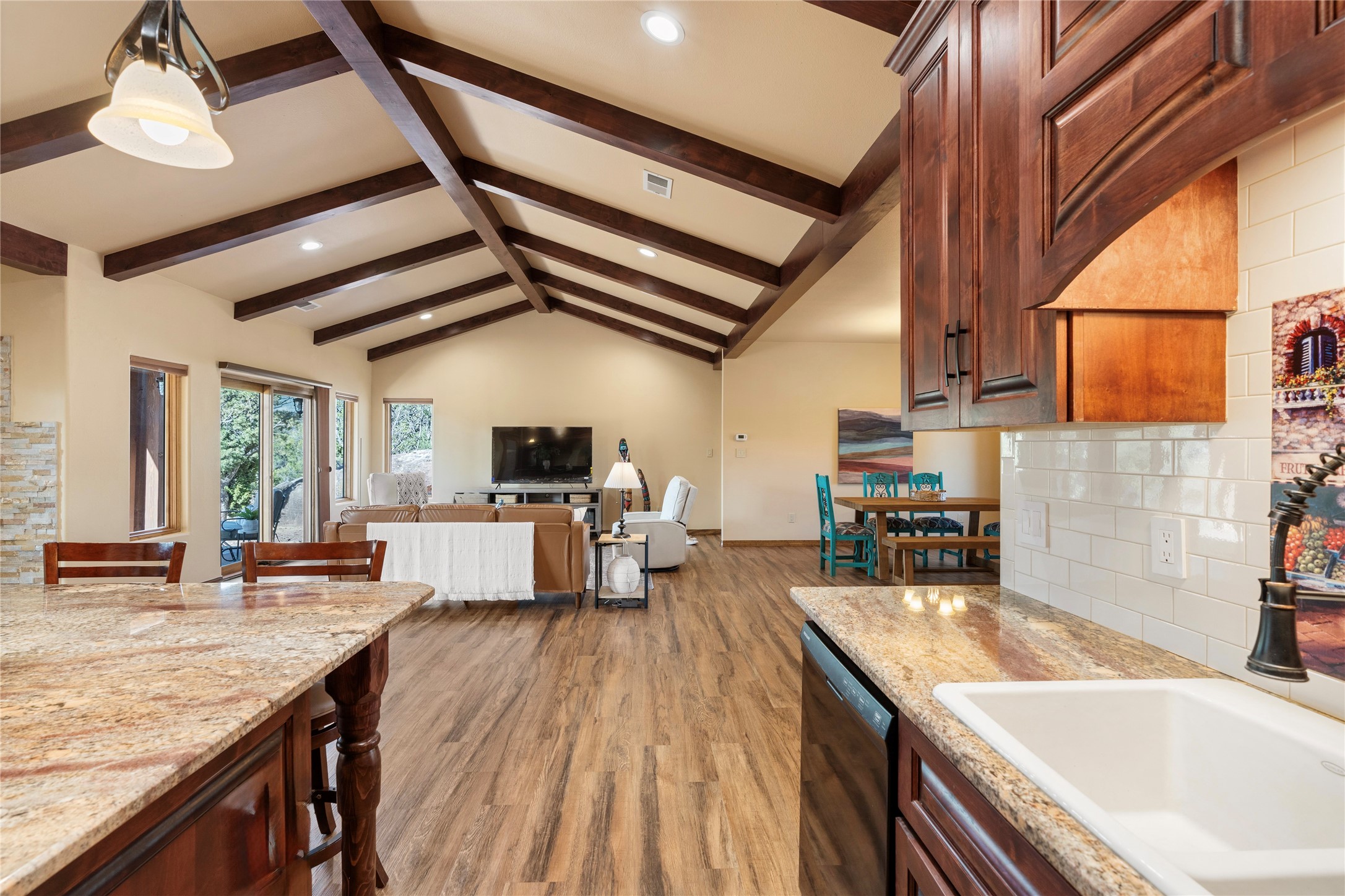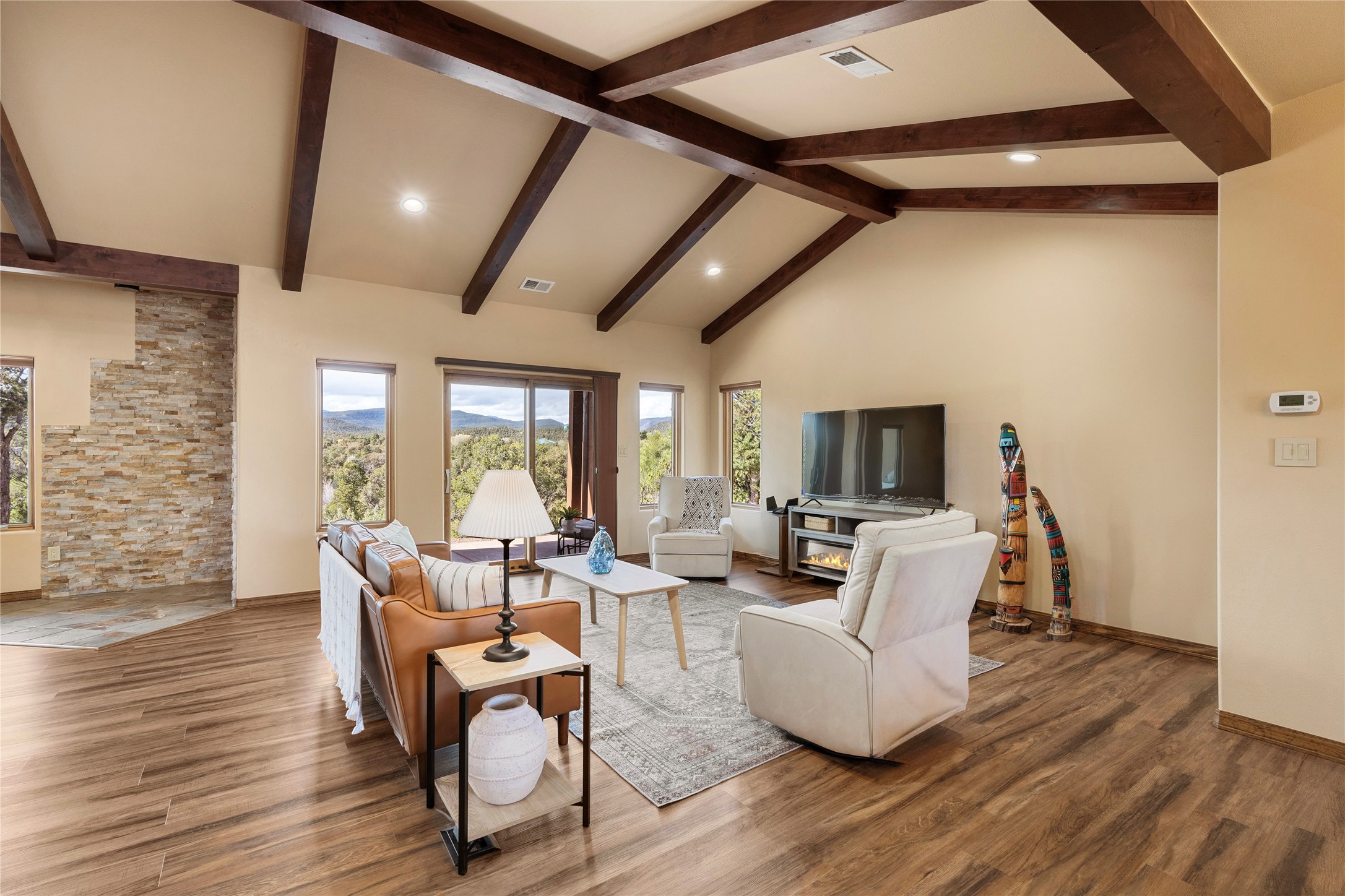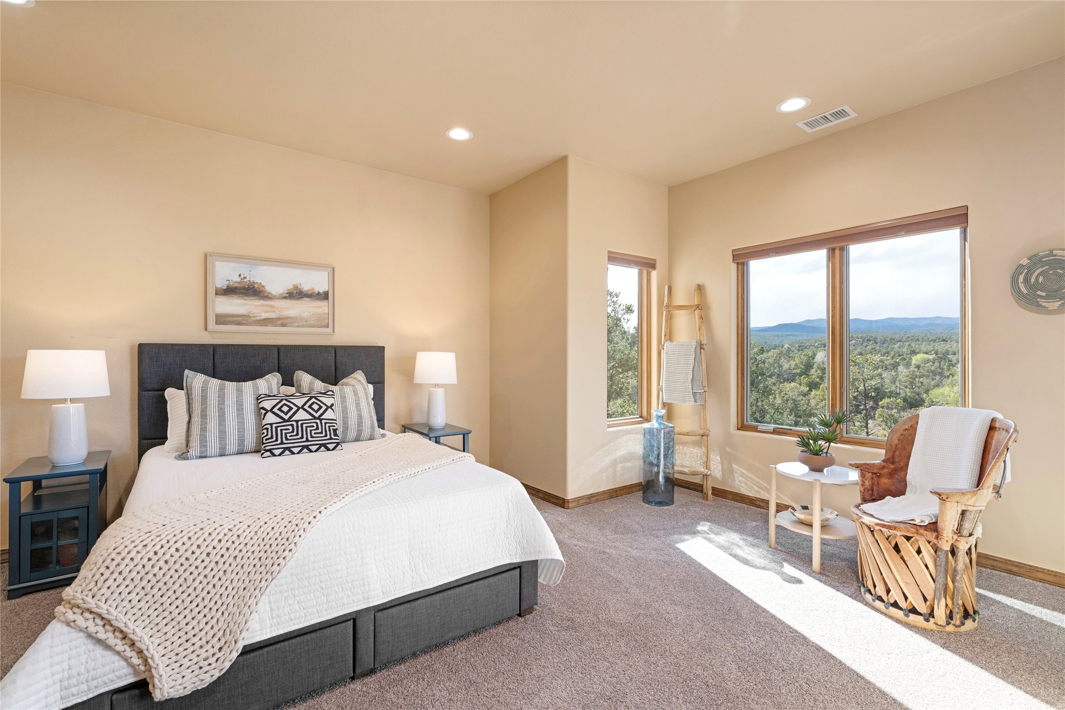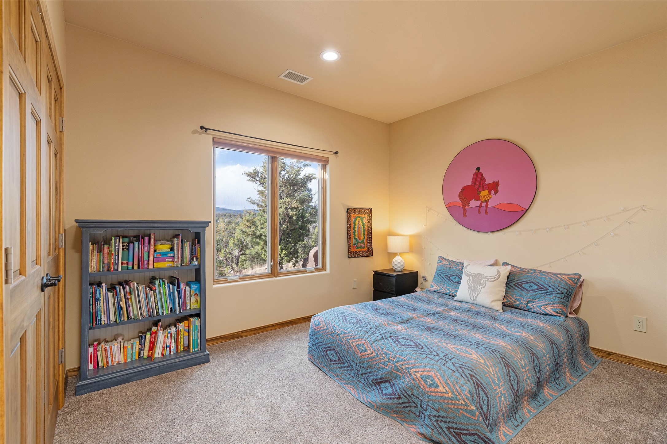 Built in 2021, this beautiful Pecos retreat is the perfect blend of modern comfort and cabin-like living with easy access to the amenities of Santa Fe and the Pecos Wilderness for outdoor enthusiasts. Located directly off of a county-maintained road, this is ideal for year-round living. Designed for both everyday living and entertaining, the open-concept kitchen features soft-close cabinetry, a large pantry and an Elmira Stove Works retro-inspired gas and electric range with convection oven. The spacious living room showcases vaulted ceilings with wood beams and opens to a covered rear portal perfect for taking in the surrounding scenery and enjoying the clear, starry night skies. The split floor plan provides excellent privacy. The generous primary suite includes a luxurious ensuite bath with dual vanities, granite counters, a custom tiled shower, two walk-in closets with built-ins, and separate commode areas. On the opposite side of the home, two well-sized guest bedrooms, one with dual walk-in closets, share a Jack-and-Jill bath with double sinks and granite finishes.Additional highlights include a spacious office with French doors, a finished 2-car garage with overhead storage and direct entry into a large laundry room, Pella windows and doors, forced air heating with central refrigerated A/C, a pitched pro-panel roof, tankless hot water heater, and a whole-house water softener. Serviced by Village of Pecos water and sewer, Mora-San Miguel Electric, and propane gas, this thoughtfully designed property offers comfort, functionality, and stunning views in a peaceful setting.