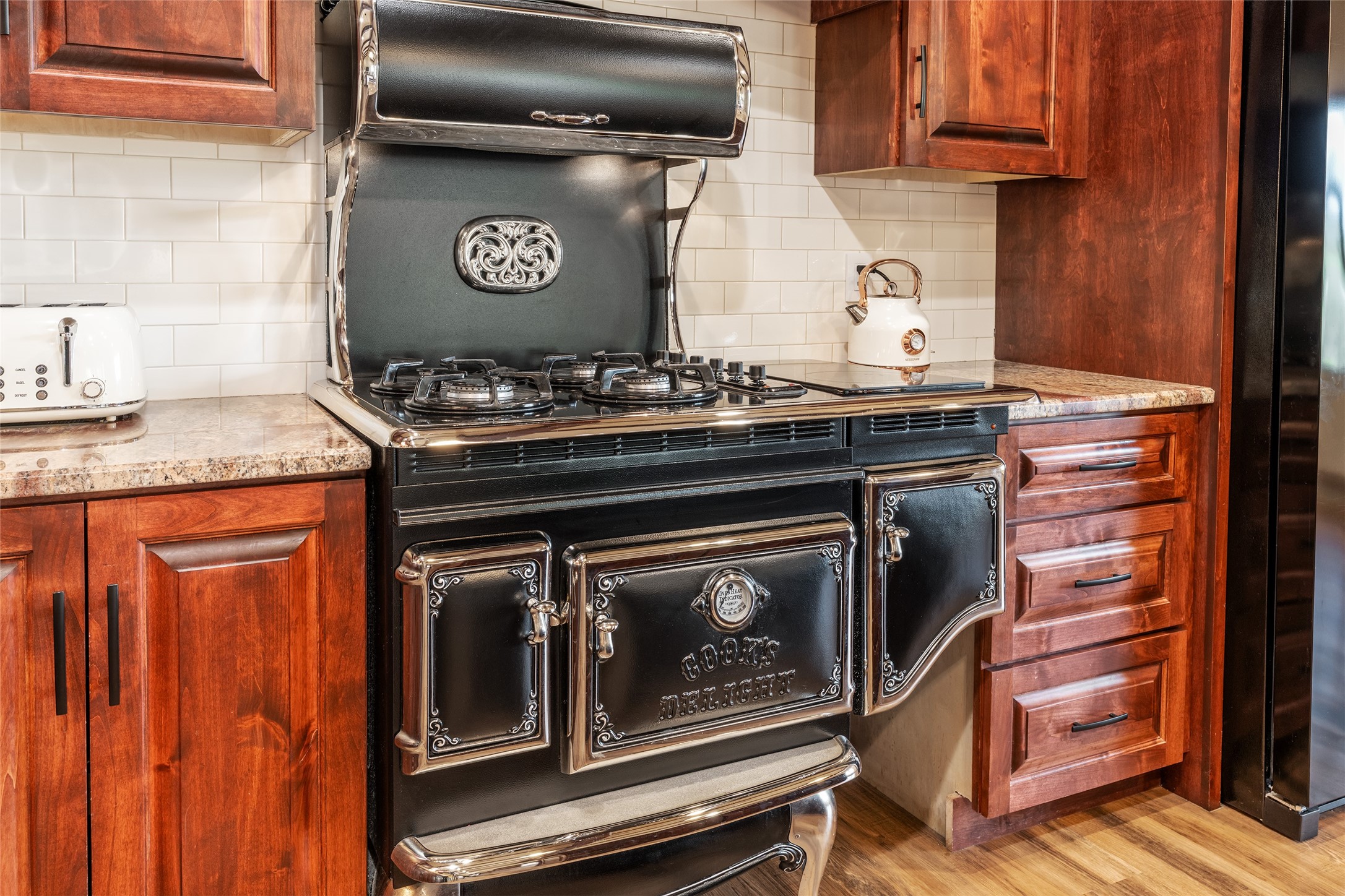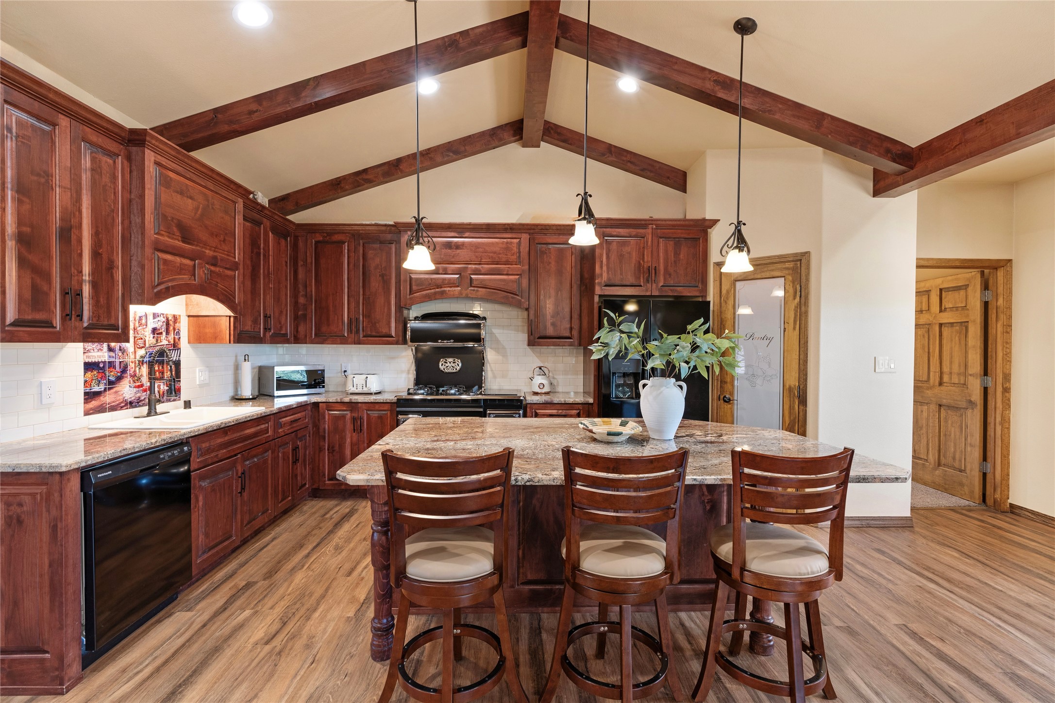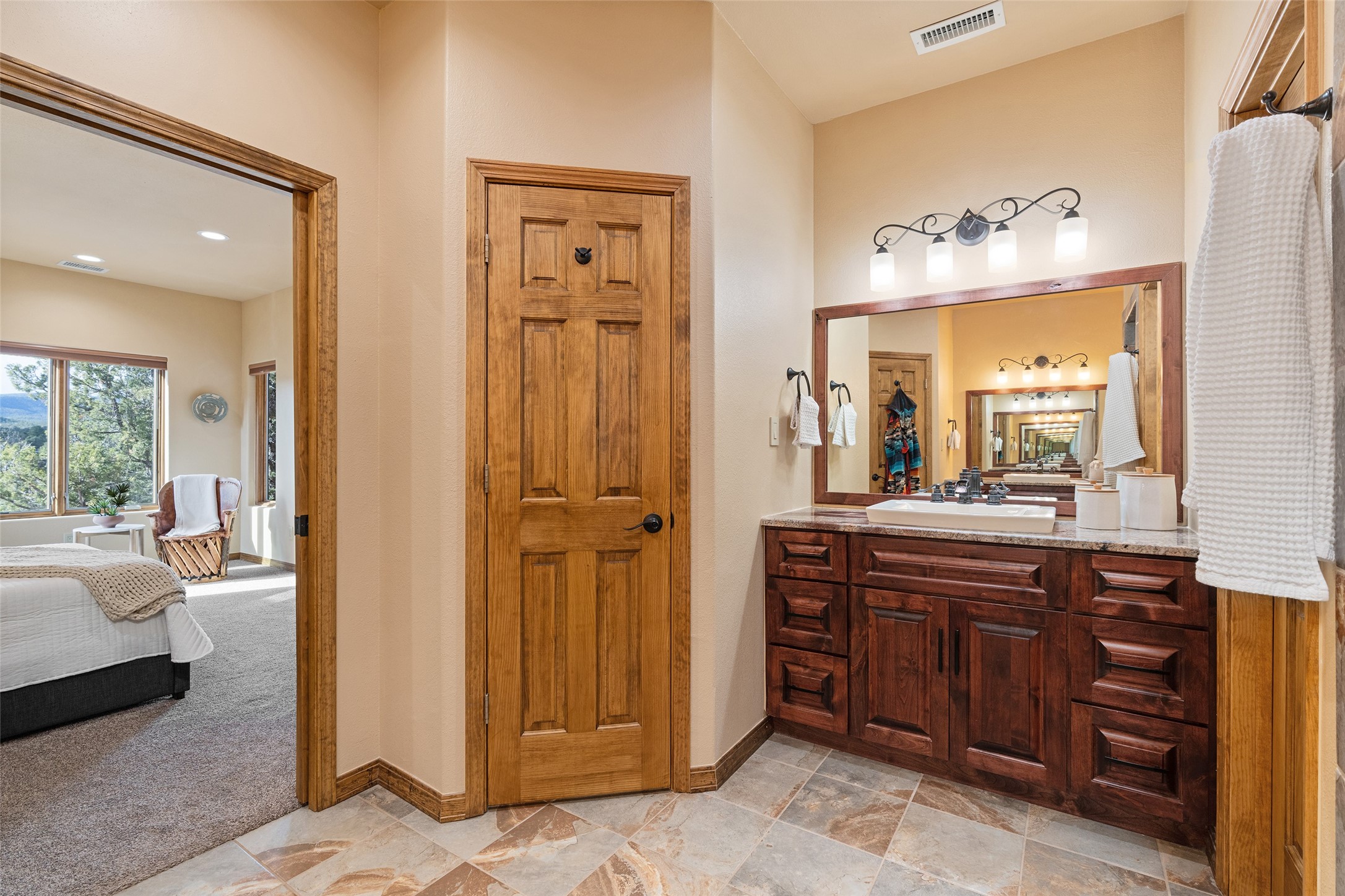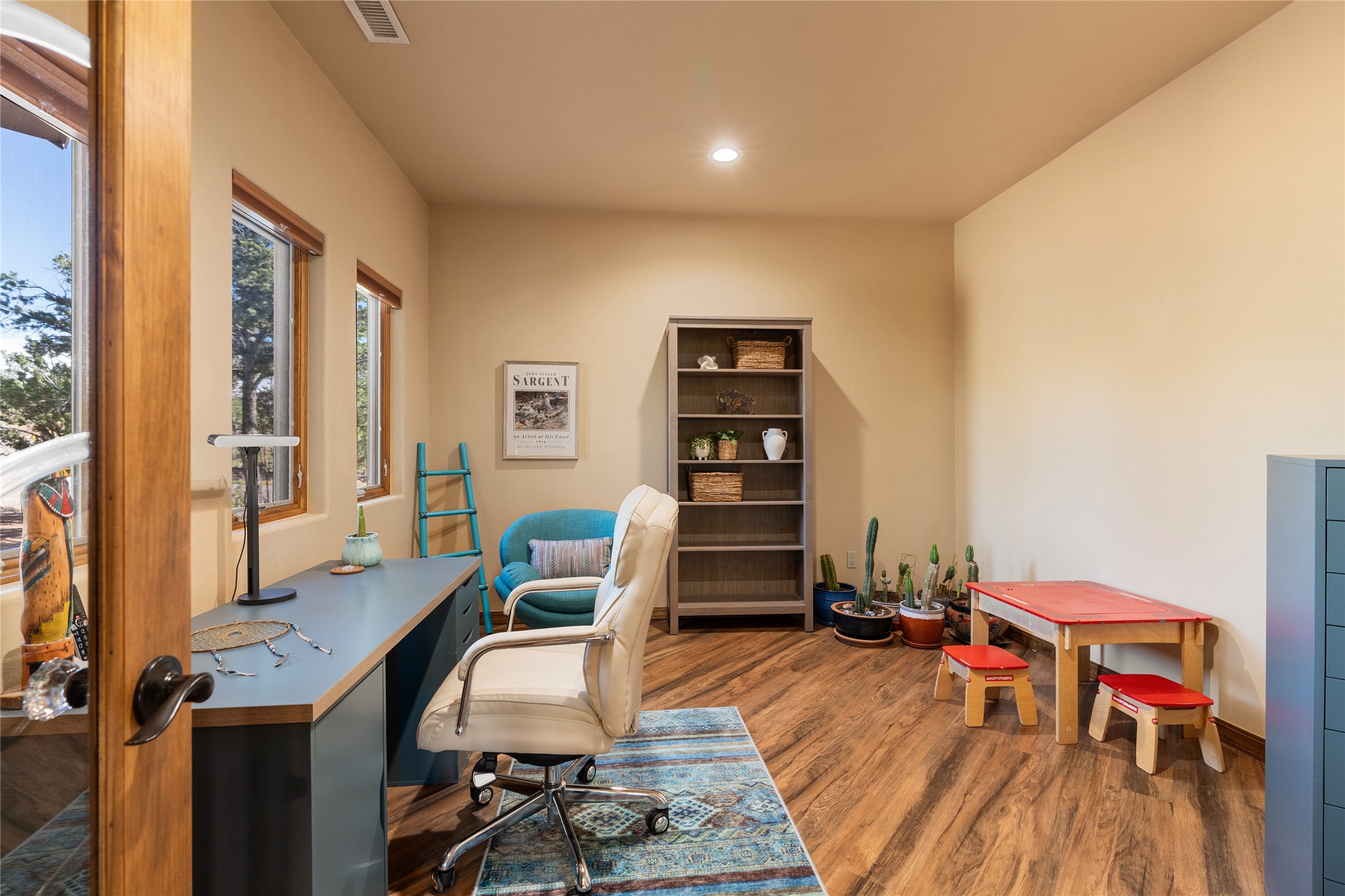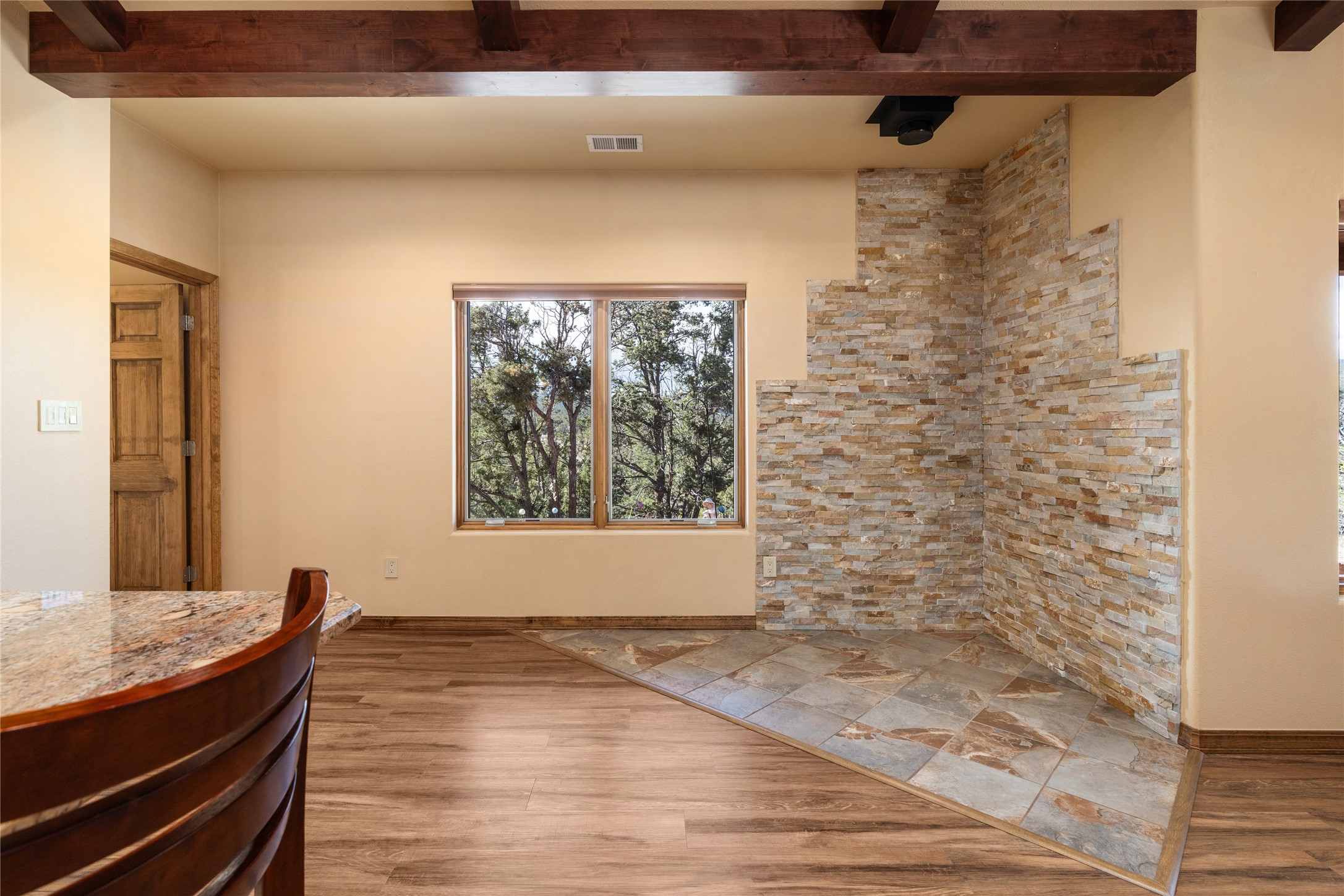 Built in 2021, this beautiful Pecos retreat is the perfect blend of modern comfort and cabin-like living with easy access to the amenities of Santa Fe and the Pecos Wilderness for outdoor enthusiasts. Located directly off of a county-maintained road, this is ideal for year-round living. Designed for both everyday living and entertaining, the open-concept kitchen features soft-close cabinetry, a large pantry and an Elmira Stove Works retro-inspired gas and electric range with convection oven. The spacious living room showcases vaulted ceilings with wood beams and opens to a covered rear portal perfect for taking in the surrounding scenery and enjoying the clear, starry night skies. The split floor plan provides excellent privacy. The generous primary suite includes a luxurious ensuite bath with dual vanities, granite counters, a custom tiled shower, two walk-in closets with built-ins, and separate commode areas. On the opposite side of the home, two well-sized guest bedrooms, one with dual walk-in closets, share a Jack-and-Jill bath with double sinks and granite finishes.Additional highlights include a spacious office with French doors, a finished 2-car garage with overhead storage and direct entry into a large laundry room, Pella windows and doors, forced air heating with central refrigerated A/C, a pitched pro-panel roof, tankless hot water heater, and a whole-house water softener. Serviced by Village of Pecos water and sewer, Mora-San Miguel Electric, and propane gas, this thoughtfully designed property offers comfort, functionality, and stunning views in a peaceful setting.