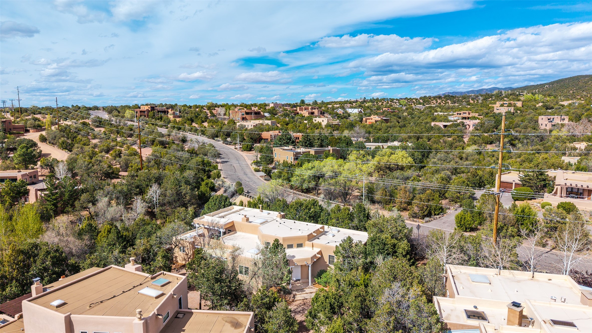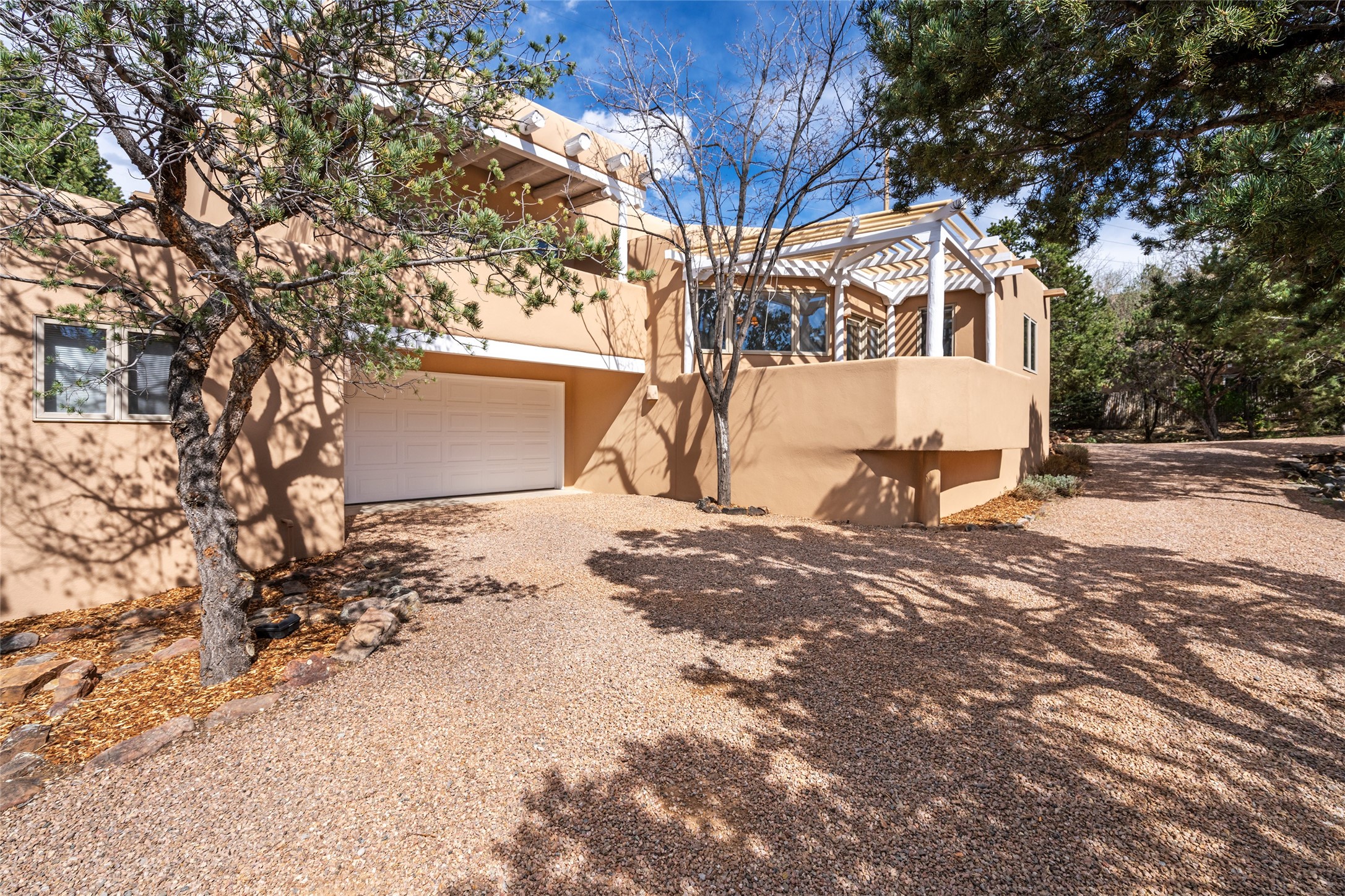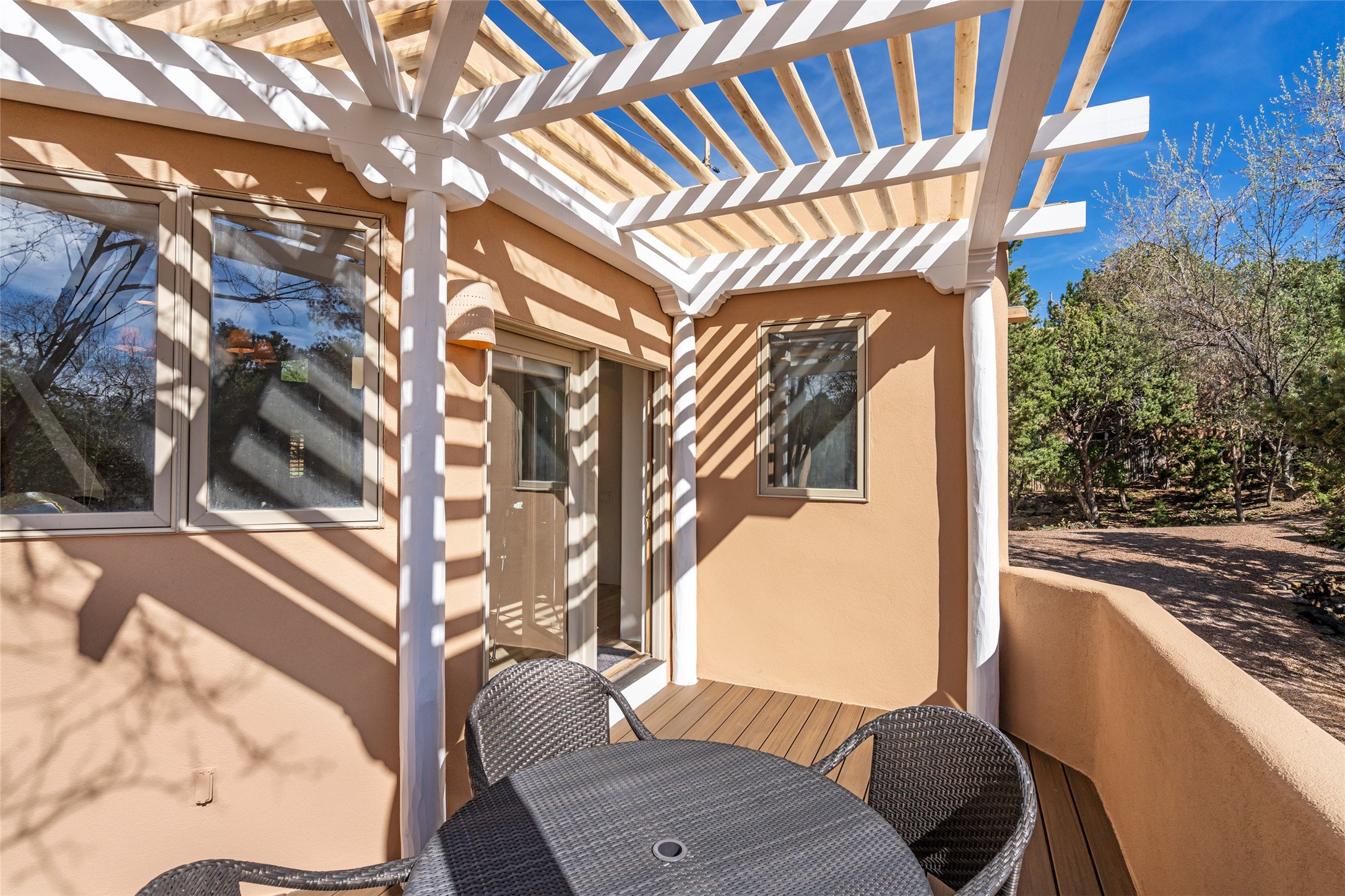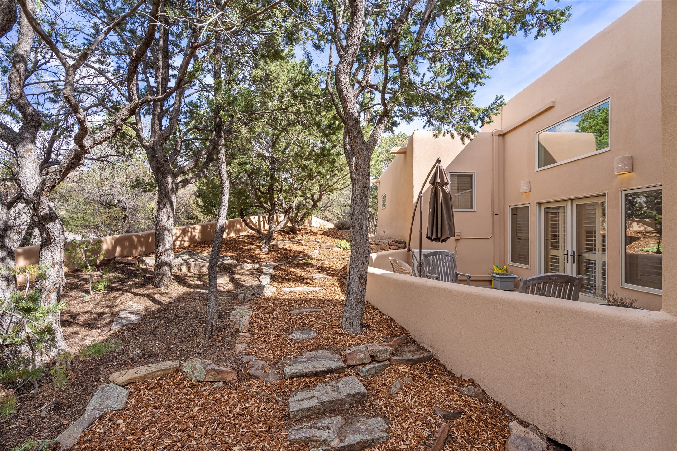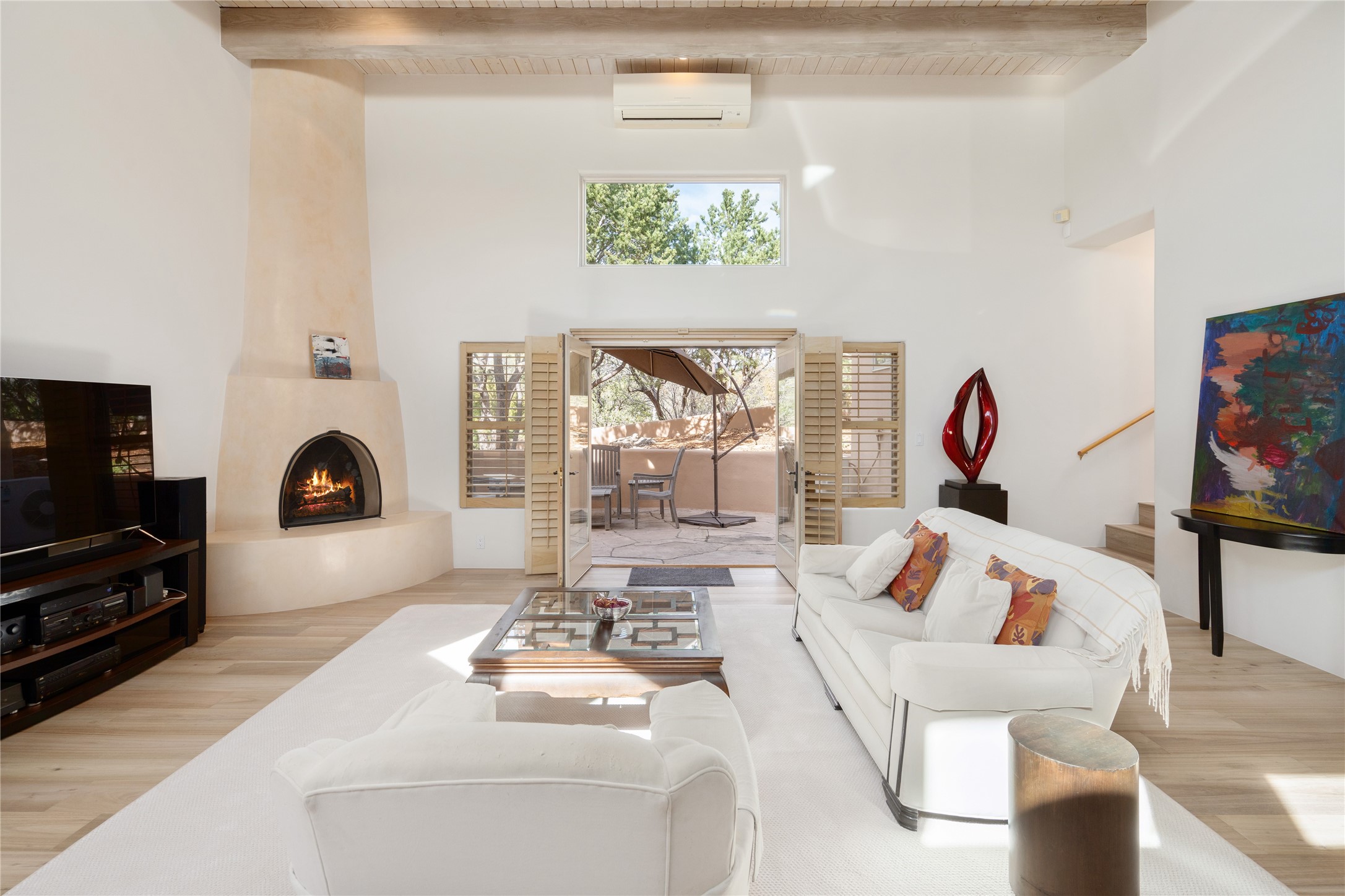 Situated on a beautifully private half-acre lot in the highly desirable Estancia Primera neighborhood, this thoughtfully updated home offers the perfect blend of Santa Fe charm and modern ease. Recent structural upgrades--including a brand new roof with transferable warranty and all-new stucco--provide peace of mind, while a newly built deck off the dining room invites morning coffee or sunset evenings beneath the trees. Inside, the home has been refreshed with brand new Engineered European Walnut wood flooring and a freshly painted interior, creating a clean, contemporary backdrop. The spacious living room is anchored by soaring ceilings with beams and a classic wood-burning kiva fireplace, offering warmth and timeless character. French doors open to a serene outdoor space, where mature trees create a sense of privacy and connection to nature. The kitchen is both functional and inviting, featuring granite countertops, stainless steel appliances, and abundant cabinetry and storage. The primary suite is a true retreat, complete with dual closets--including a cedar-lined closet--an en suite bath, and a private balcony ideal for quiet moments. On the opposite side of the home, two additional bedrooms and a guest bath provide comfortable separation for family or guests. A standout feature is the studio space just off the garage, complete with a sink--perfect for artists, hobbyists, or flexible use. Additional highlights include mini-splits throughout, new skylights and clerestory windows, plantation shutters, and a powder room. The home may also be offered essentially turnkey, with furnishings available making this an easy second home acquisition. Located just off Hyde Park Road, only minutes from the historic Plaza, Estancia Primera residents enjoy access to tennis courts, a seasonal pool, and scenic walking trails--offering a rare combination of convenience, community, and natural beauty.