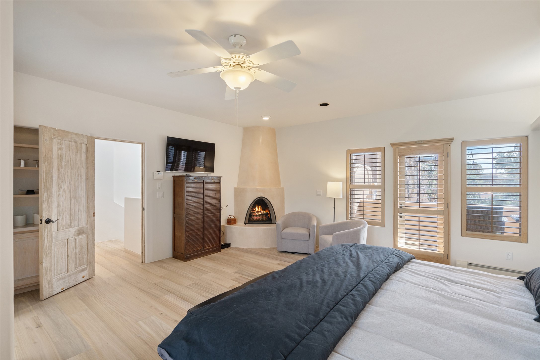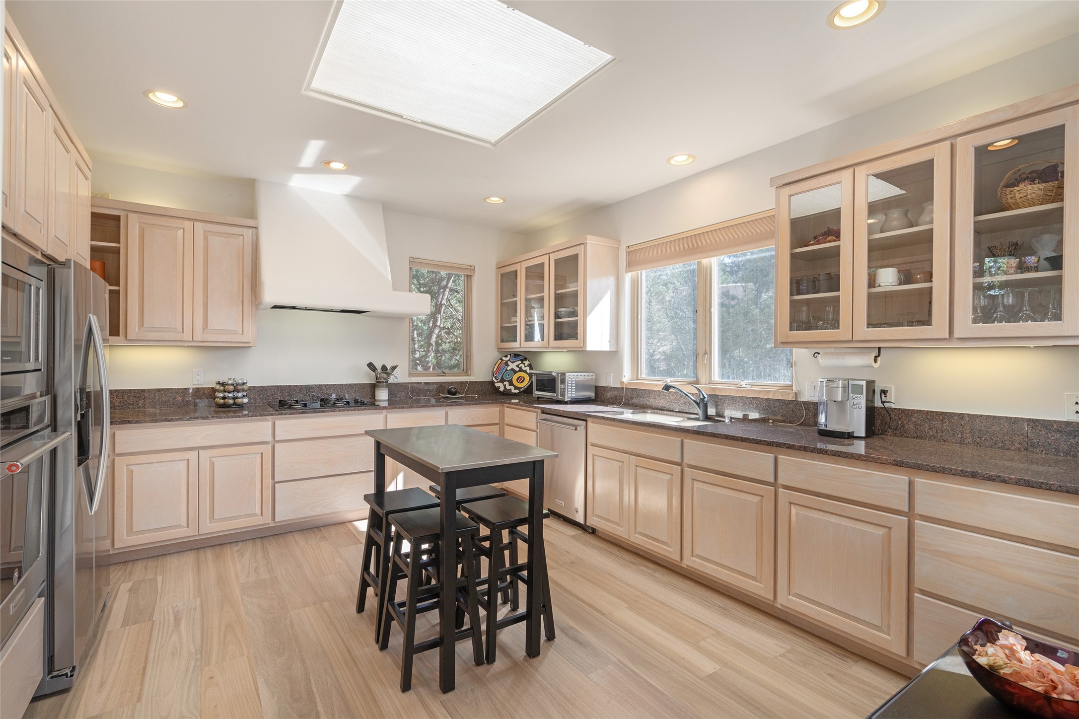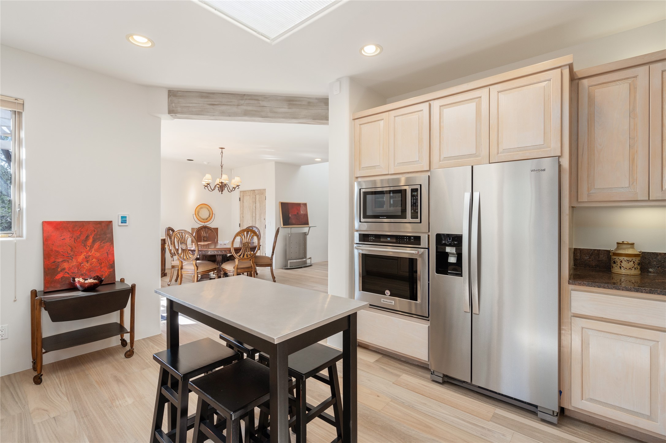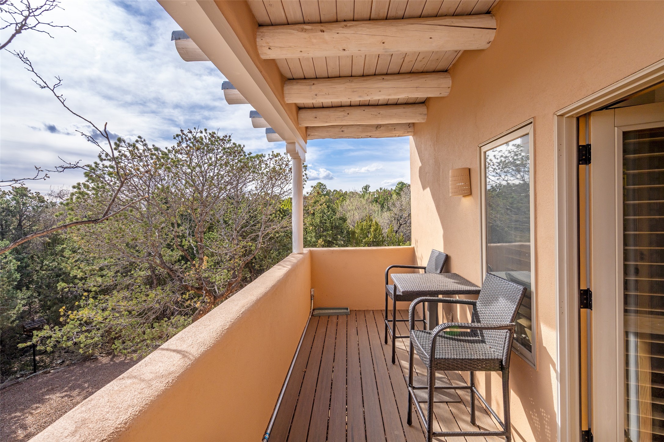 Situated on a beautifully private half-acre lot in the highly desirable Estancia Primera neighborhood, this thoughtfully updated home offers the perfect blend of Santa Fe charm and modern ease. Recent structural upgrades--including a brand new roof with transferable warranty and all-new stucco--provide peace of mind, while a newly built deck off the dining room invites morning coffee or sunset evenings beneath the trees. Inside, the home has been refreshed with brand new Engineered European Walnut wood flooring and a freshly painted interior, creating a clean, contemporary backdrop. The spacious living room is anchored by soaring ceilings with beams and a classic wood-burning kiva fireplace, offering warmth and timeless character. French doors open to a serene outdoor space, where mature trees create a sense of privacy and connection to nature. The kitchen is both functional and inviting, featuring granite countertops, stainless steel appliances, and abundant cabinetry and storage. The primary suite is a true retreat, complete with dual closets--including a cedar-lined closet--an en suite bath, and a private balcony ideal for quiet moments. On the opposite side of the home, two additional bedrooms and a guest bath provide comfortable separation for family or guests. A standout feature is the studio space just off the garage, complete with a sink--perfect for artists, hobbyists, or flexible use. Additional highlights include mini-splits throughout, new skylights and clerestory windows, plantation shutters, and a powder room. The home may also be offered essentially turnkey, with furnishings available making this an easy second home acquisition. Located just off Hyde Park Road, only minutes from the historic Plaza, Estancia Primera residents enjoy access to tennis courts, a seasonal pool, and scenic walking trails--offering a rare combination of convenience, community, and natural beauty.