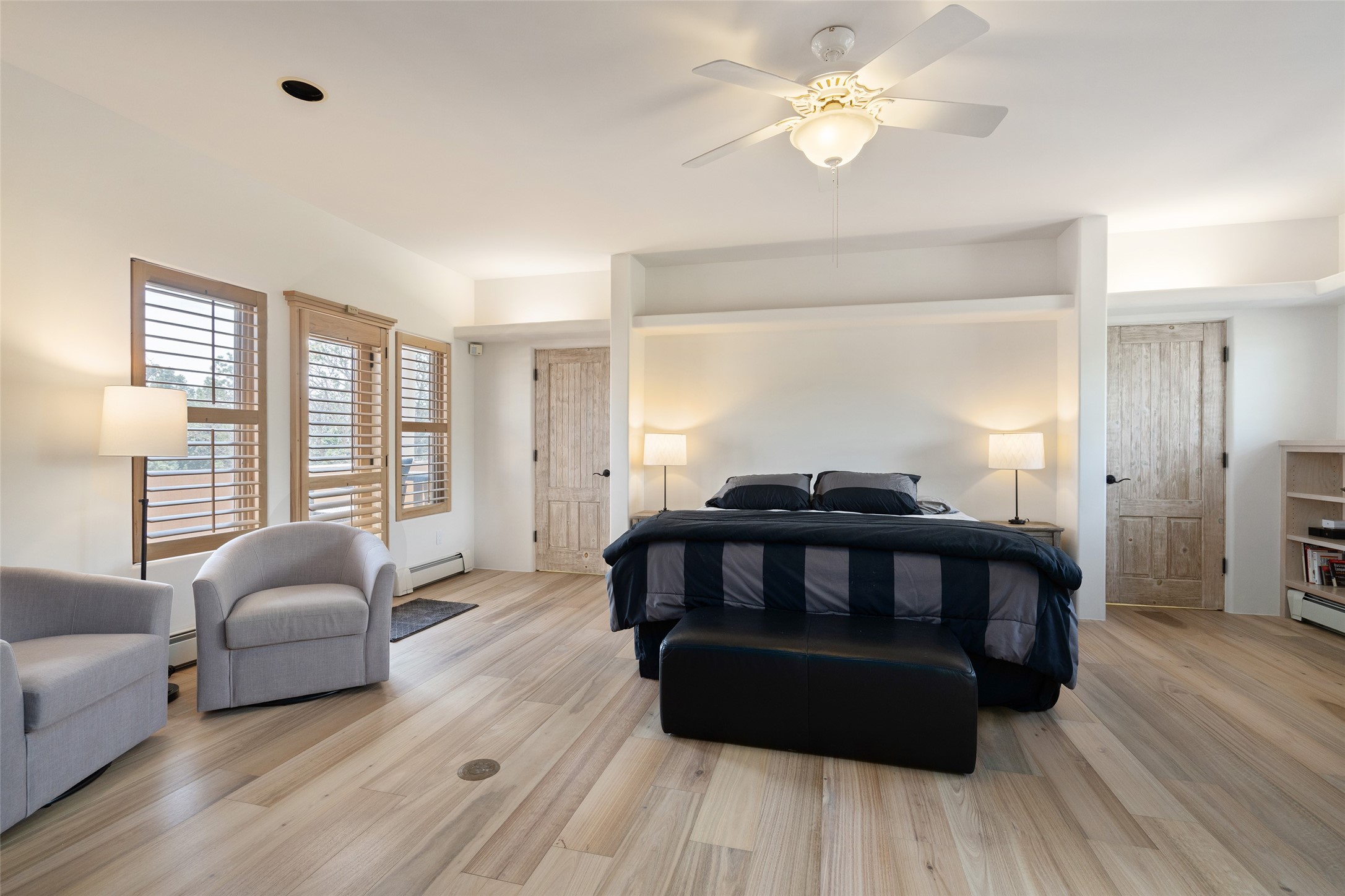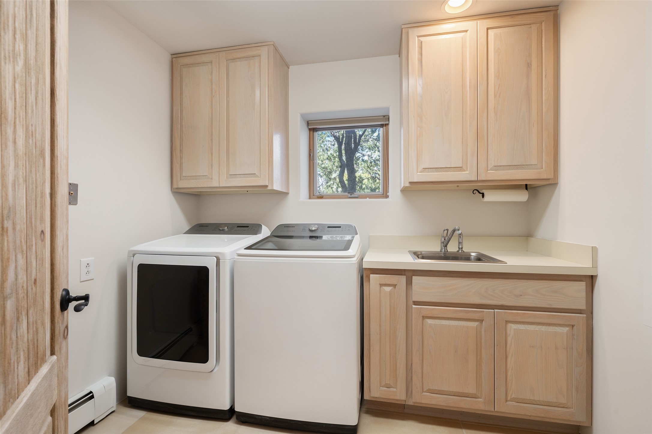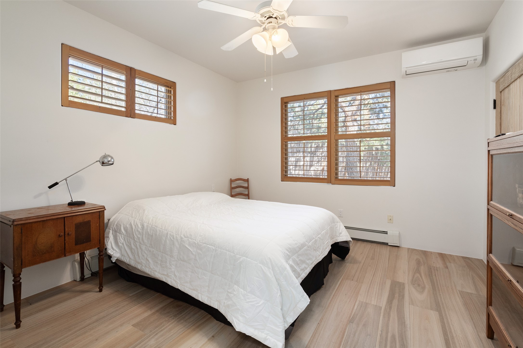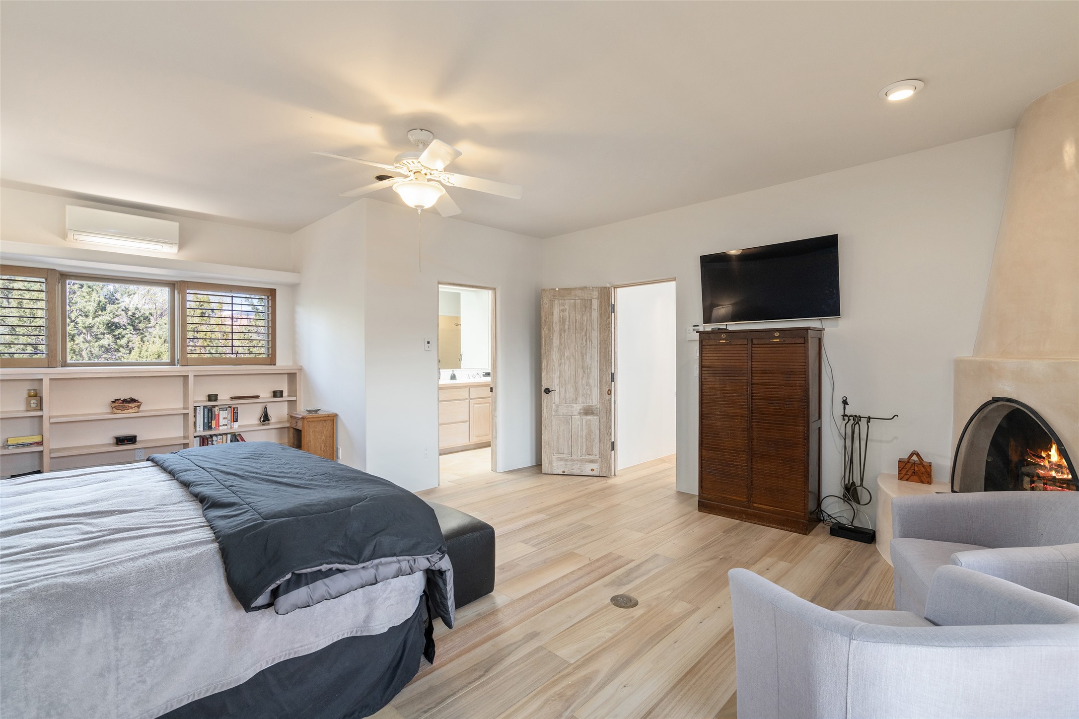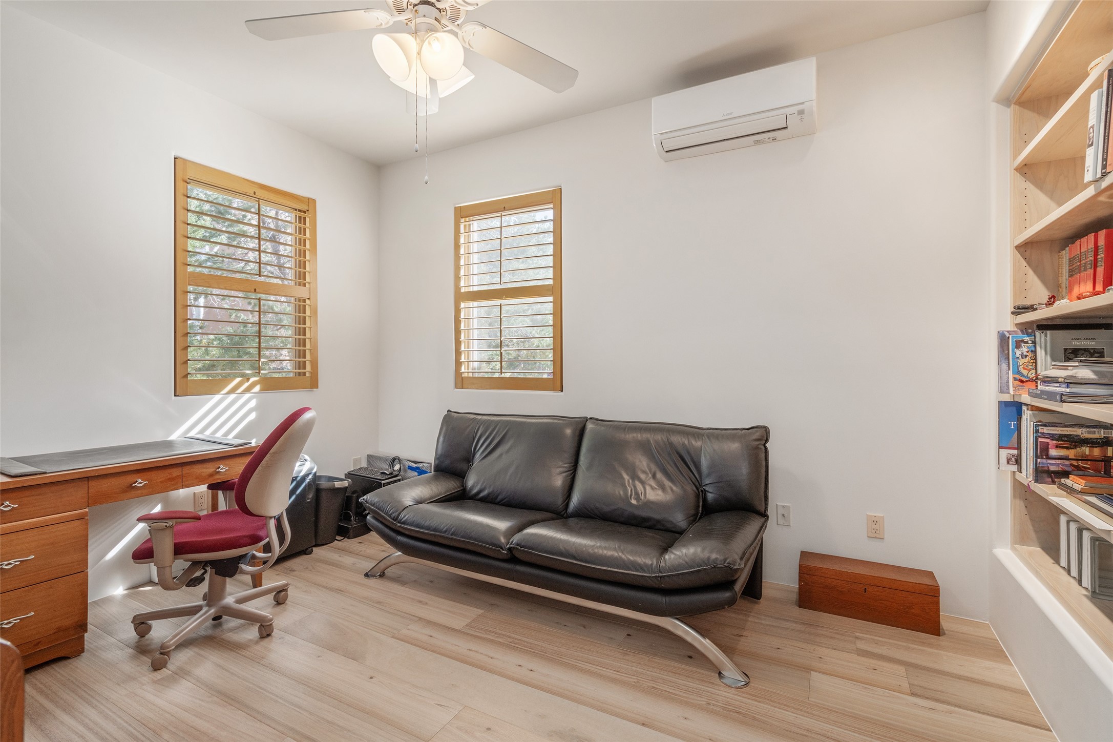 Situated on a beautifully private half-acre lot in the highly desirable Estancia Primera neighborhood, this thoughtfully updated home offers the perfect blend of Santa Fe charm and modern ease. Recent structural upgrades--including a brand new roof with transferable warranty and all-new stucco--provide peace of mind, while a newly built deck off the dining room invites morning coffee or sunset evenings beneath the trees. Inside, the home has been refreshed with brand new Engineered European Walnut wood flooring and a freshly painted interior, creating a clean, contemporary backdrop. The spacious living room is anchored by soaring ceilings with beams and a classic wood-burning kiva fireplace, offering warmth and timeless character. French doors open to a serene outdoor space, where mature trees create a sense of privacy and connection to nature. The kitchen is both functional and inviting, featuring granite countertops, stainless steel appliances, and abundant cabinetry and storage. The primary suite is a true retreat, complete with dual closets--including a cedar-lined closet--an en suite bath, and a private balcony ideal for quiet moments. On the opposite side of the home, two additional bedrooms and a guest bath provide comfortable separation for family or guests. A standout feature is the studio space just off the garage, complete with a sink--perfect for artists, hobbyists, or flexible use. Additional highlights include mini-splits throughout, new skylights and clerestory windows, plantation shutters, and a powder room. The home may also be offered essentially turnkey, with furnishings available making this an easy second home acquisition. Located just off Hyde Park Road, only minutes from the historic Plaza, Estancia Primera residents enjoy access to tennis courts, a seasonal pool, and scenic walking trails--offering a rare combination of convenience, community, and natural beauty.