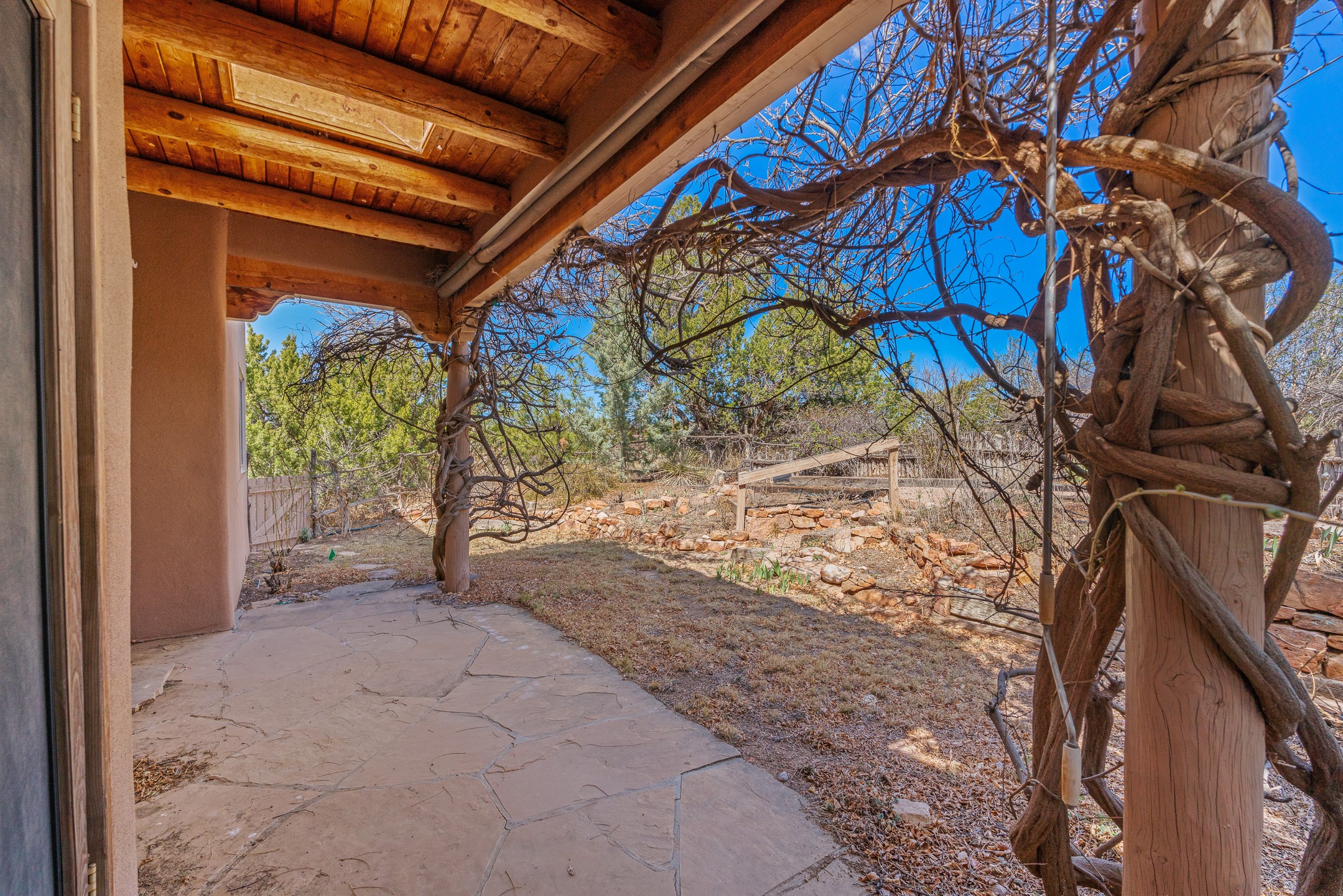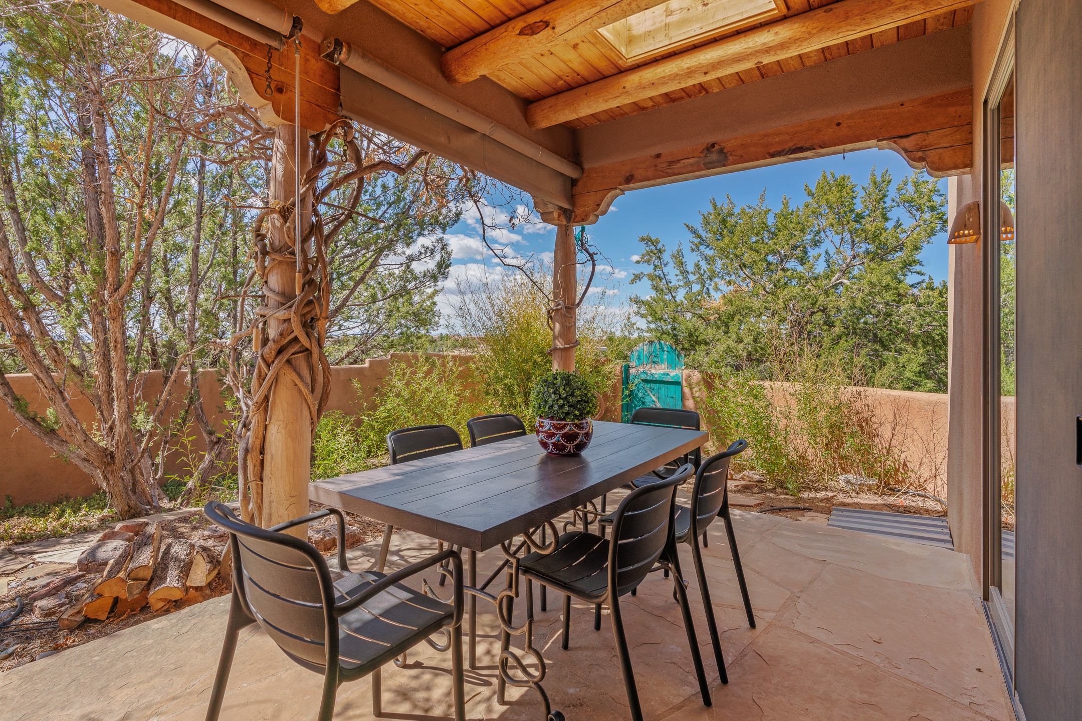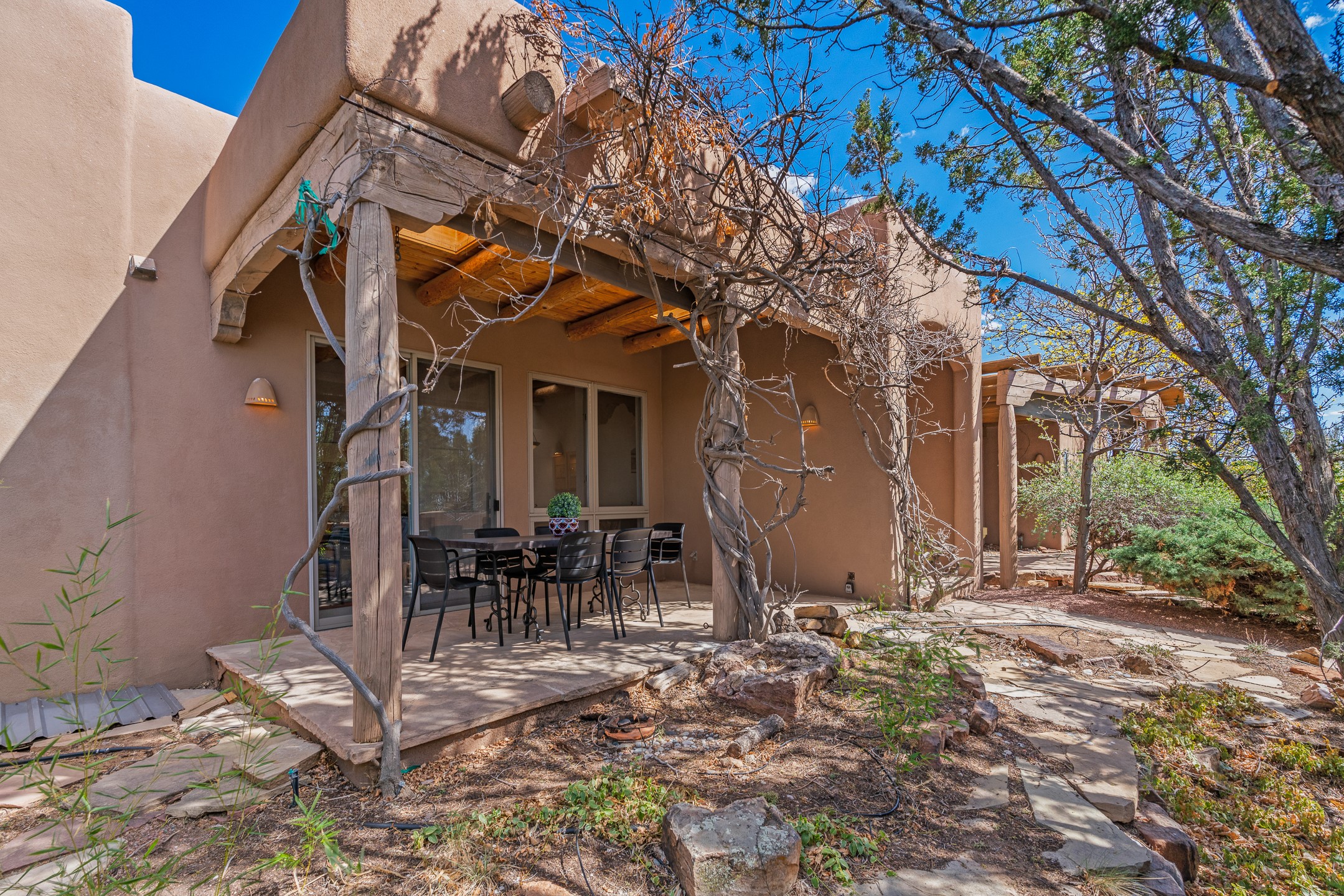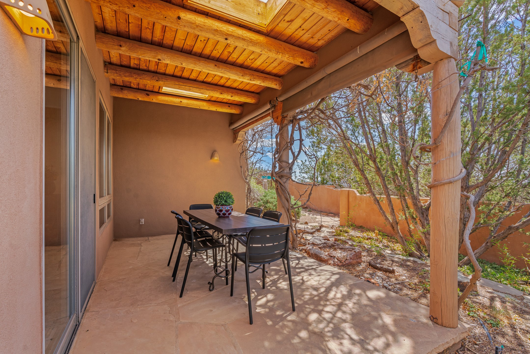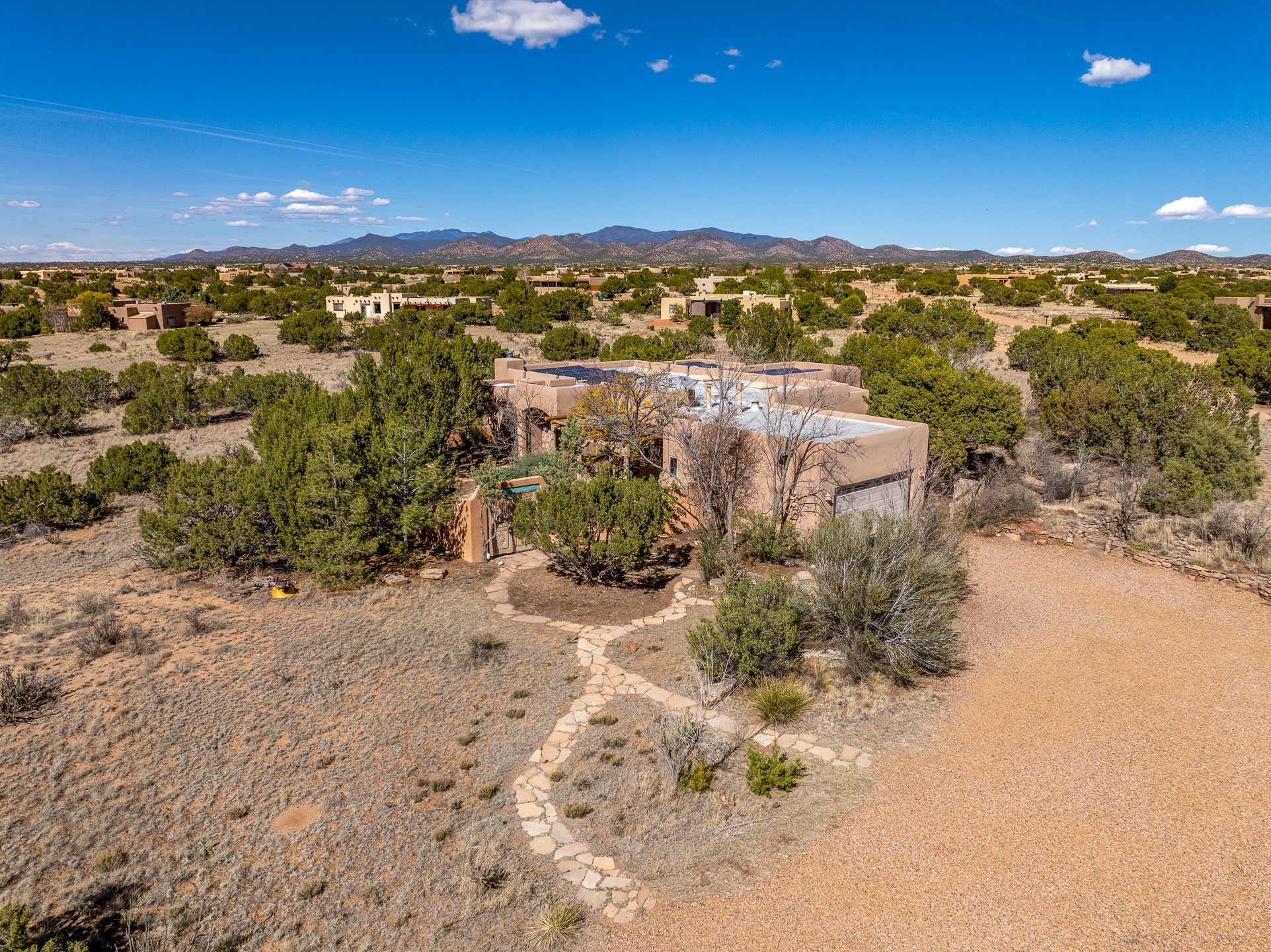 Sited on 1.6 acres in Eldorado, this 2,700 sq. ft. single-level home offers a rare blend of character, privacy, and thoughtful design--available for the first time since it was custom built in 1996. Surrounded by mature landscaping, the property is both welcoming and serene.The main living and dining area features a classic wood burning fireplace, vigas, and direct access to a charming front courtyard with a deep west-facing portal draped in mature wisteria--perfect for outdoor living and sunset evenings.A truly unique feature, the indoor heated lap pool serves as a central architectural element, separating the bedroom wings while enhancing privacy and creating a sense of retreat.The kitchen remains in its original configuration, offering generous space and a central cooking island. This opens to a covered portal within the courtyard.The bedrooms are well positioned for privacy. One guest bedroom opens directly to the enclosed backyard under a covered portal--ideal for a home office. The spacious primary suite also enjoys backyard access, with a covered sitting area that extends the home's connection to its beautifully landscaped surroundings.With solar in place, abundant natural light from the many skylights throughout and a distinctive layout, this Eldorado home offers a rare opportunity on a truly special property with mountain views.