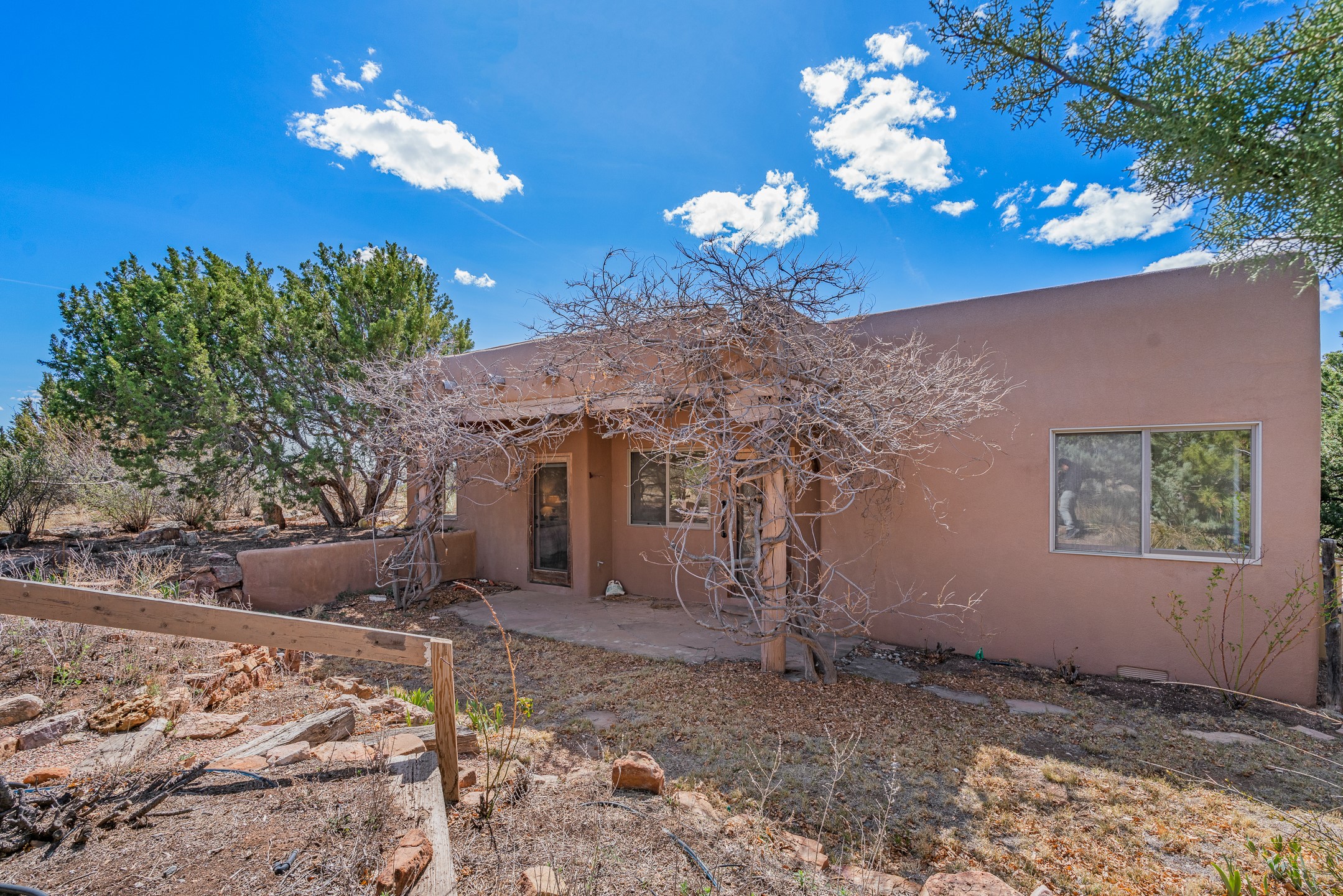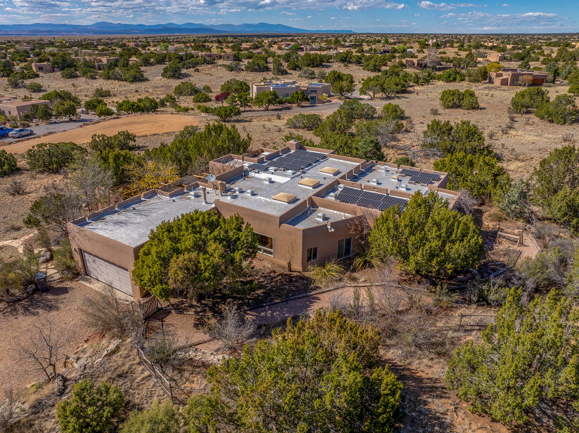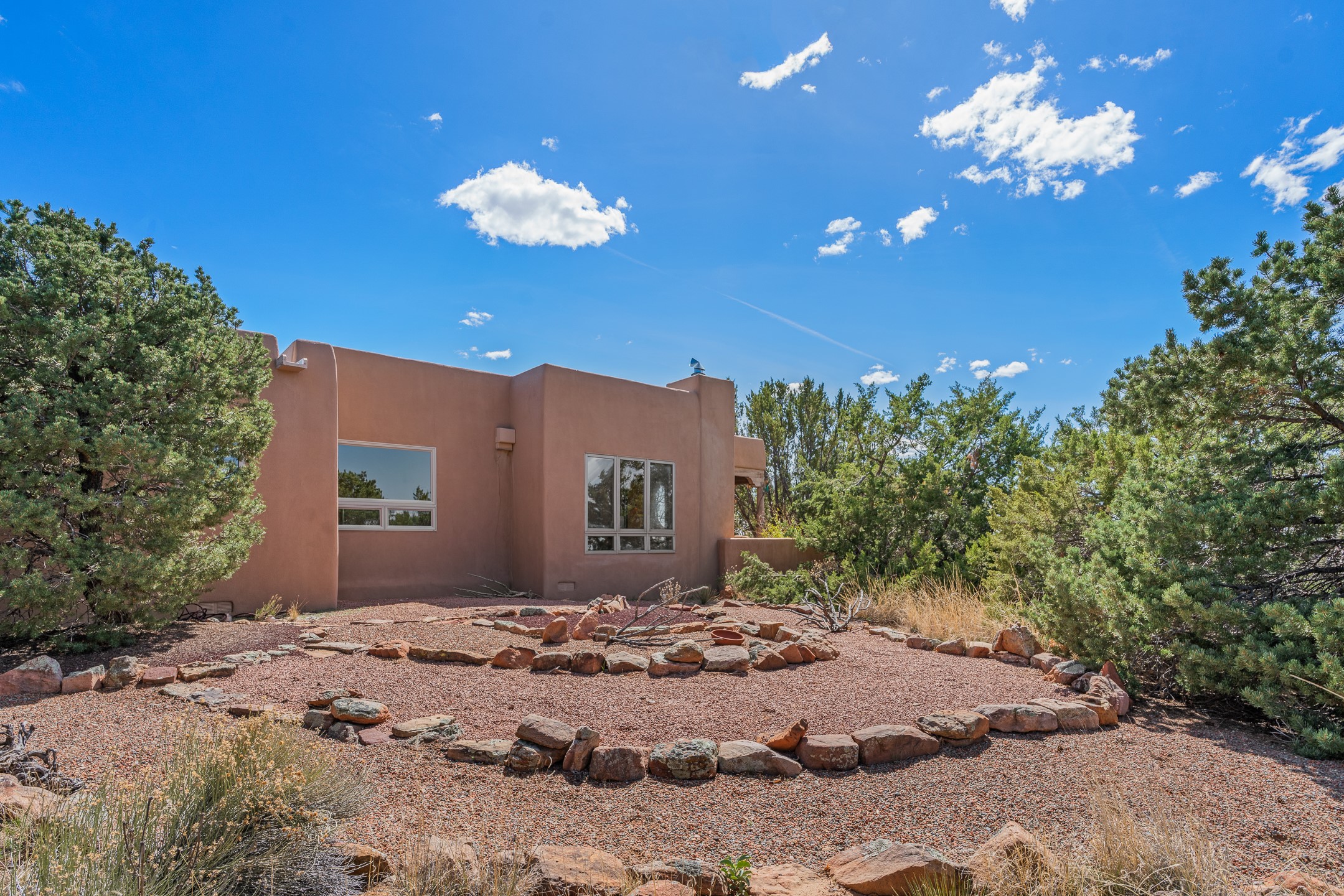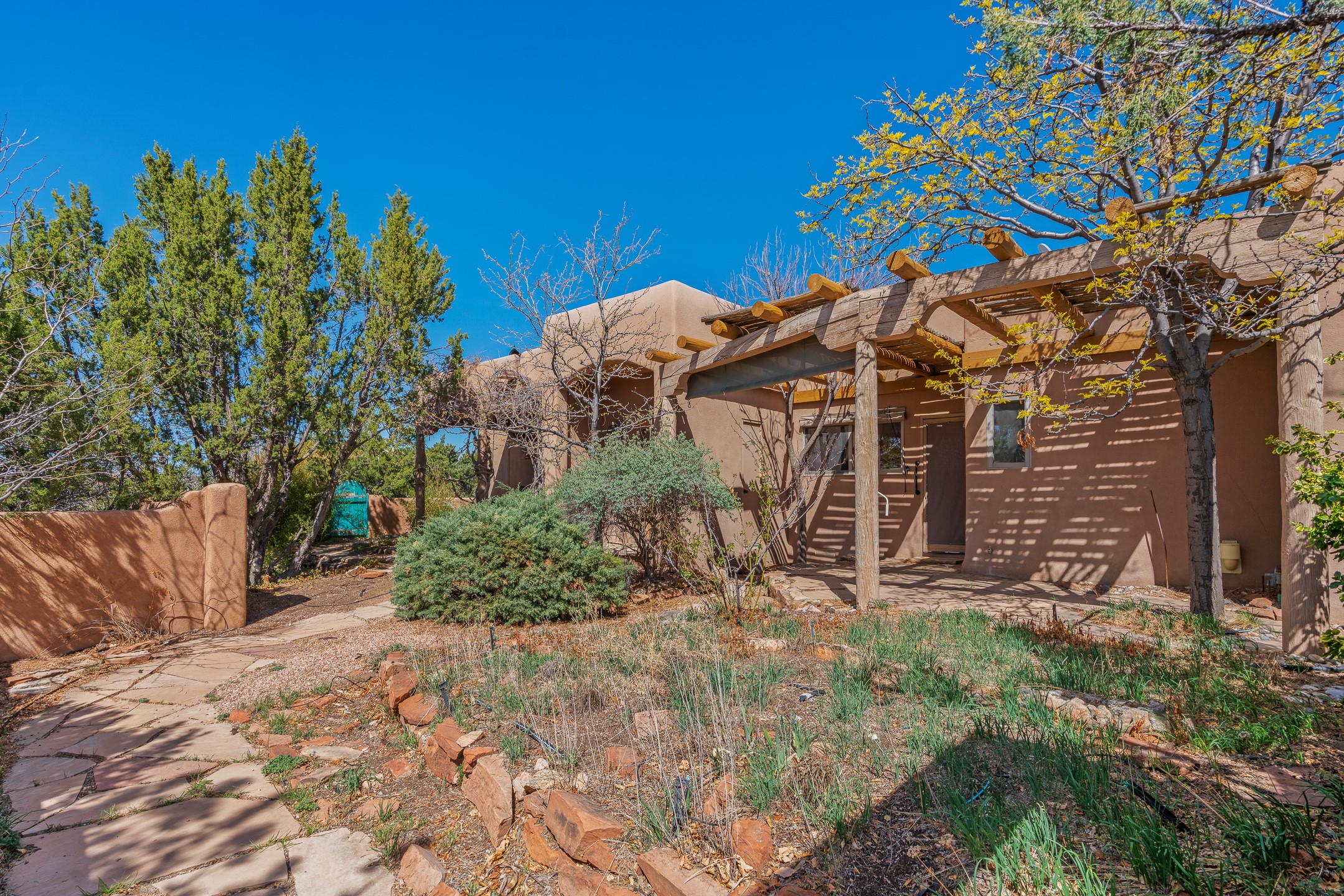 Sited on 1.6 acres in Eldorado, this 2,700 sq. ft. single-level home offers a rare blend of character, privacy, and thoughtful design--available for the first time since it was custom built in 1996. Surrounded by mature landscaping, the property is both welcoming and serene.The main living and dining area features a classic wood burning fireplace, vigas, and direct access to a charming front courtyard with a deep west-facing portal draped in mature wisteria--perfect for outdoor living and sunset evenings.A truly unique feature, the indoor heated lap pool serves as a central architectural element, separating the bedroom wings while enhancing privacy and creating a sense of retreat.The kitchen remains in its original configuration, offering generous space and a central cooking island. This opens to a covered portal within the courtyard.The bedrooms are well positioned for privacy. One guest bedroom opens directly to the enclosed backyard under a covered portal--ideal for a home office. The spacious primary suite also enjoys backyard access, with a covered sitting area that extends the home's connection to its beautifully landscaped surroundings.With solar in place, abundant natural light from the many skylights throughout and a distinctive layout, this Eldorado home offers a rare opportunity on a truly special property with mountain views.