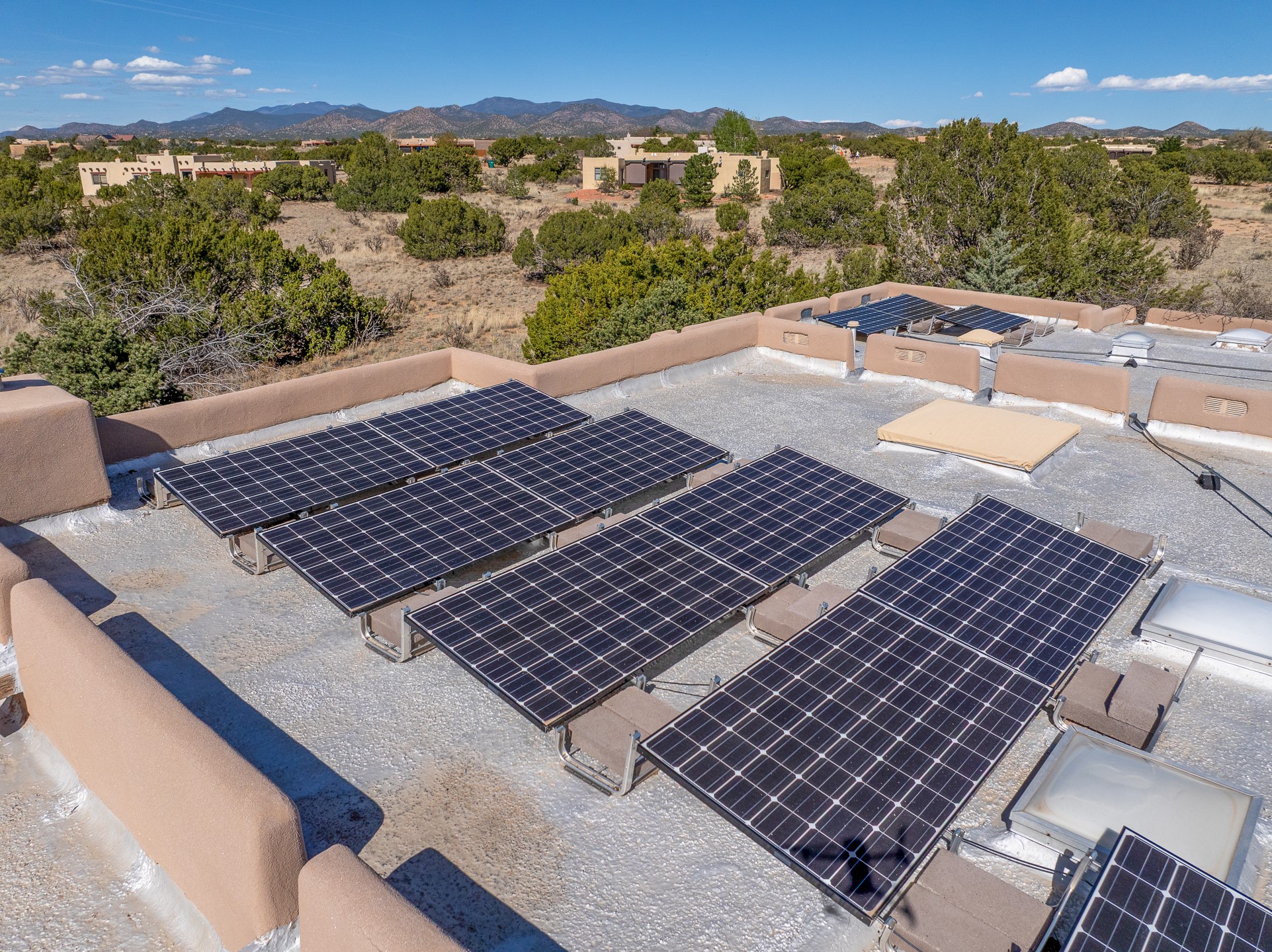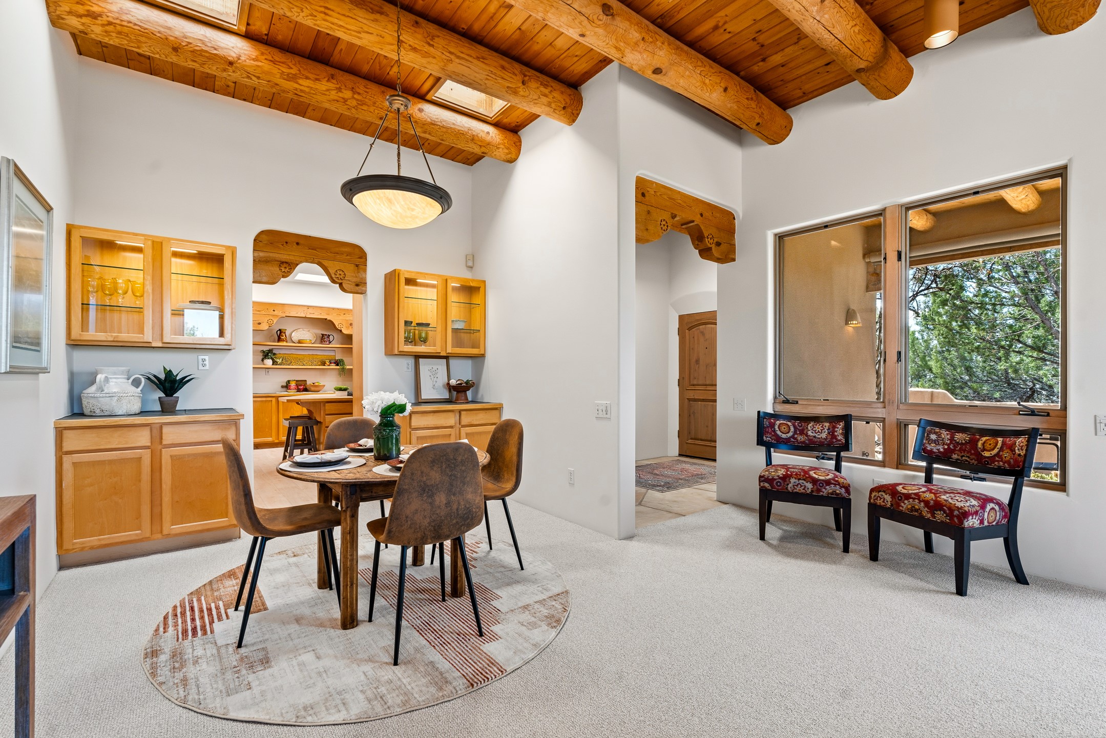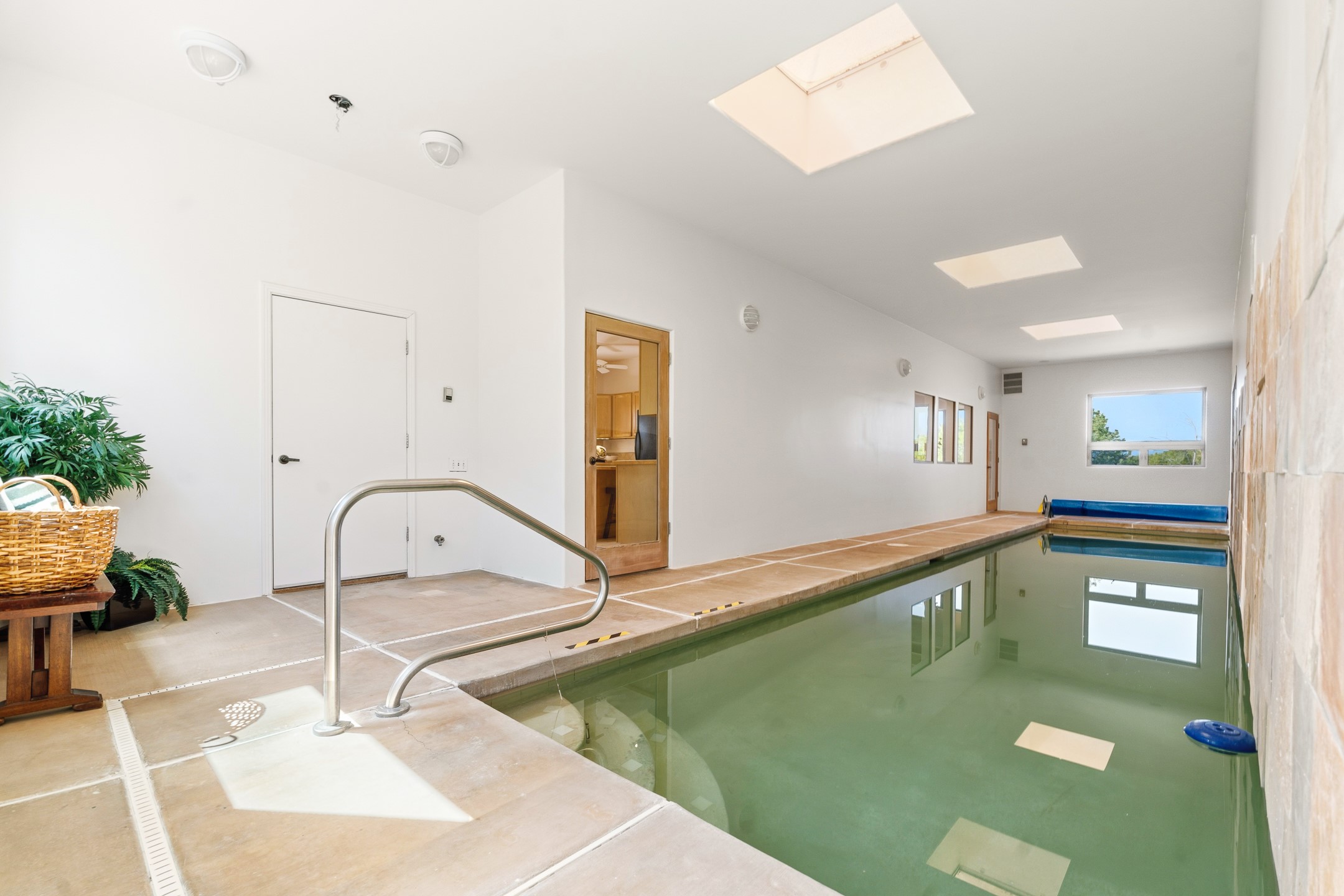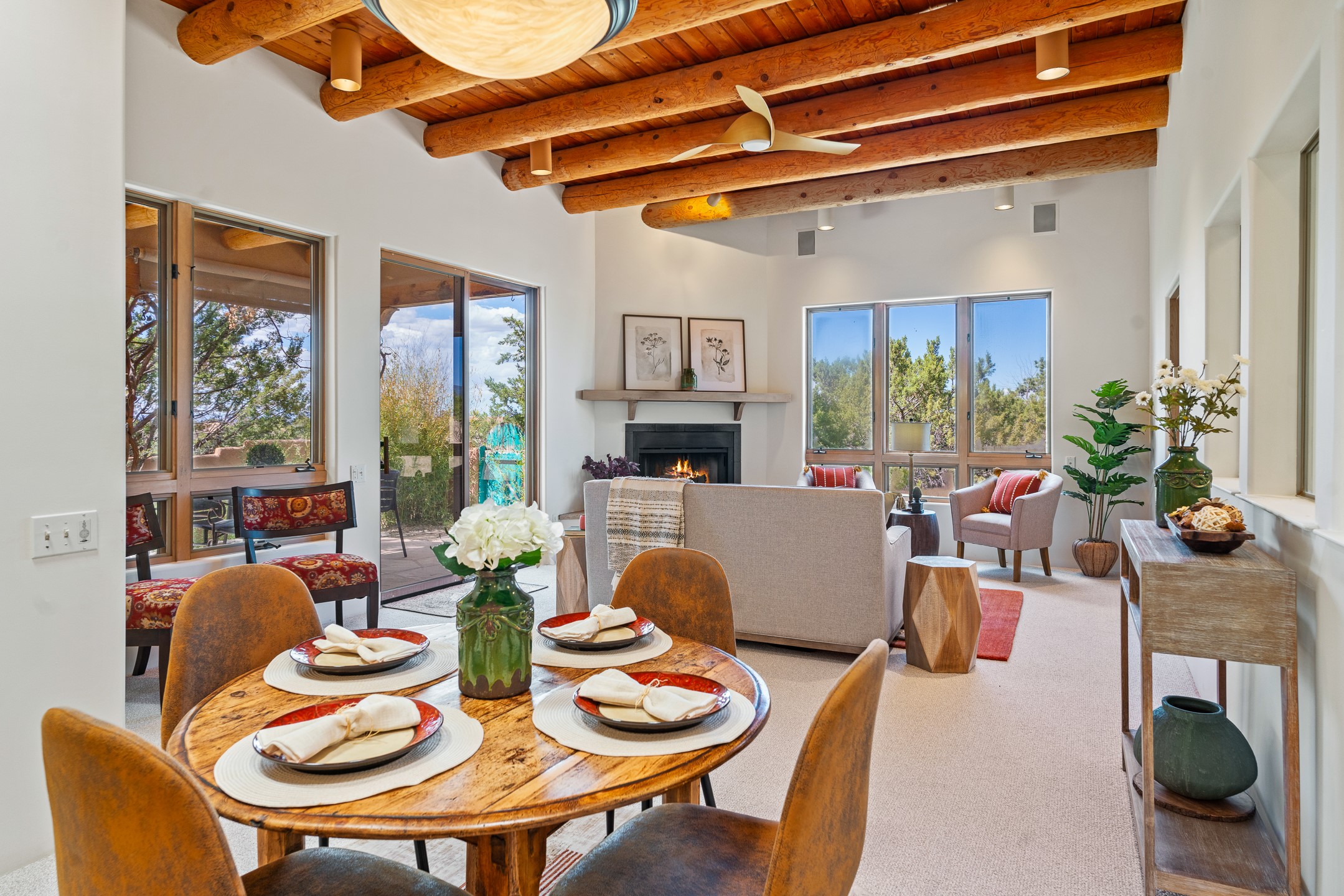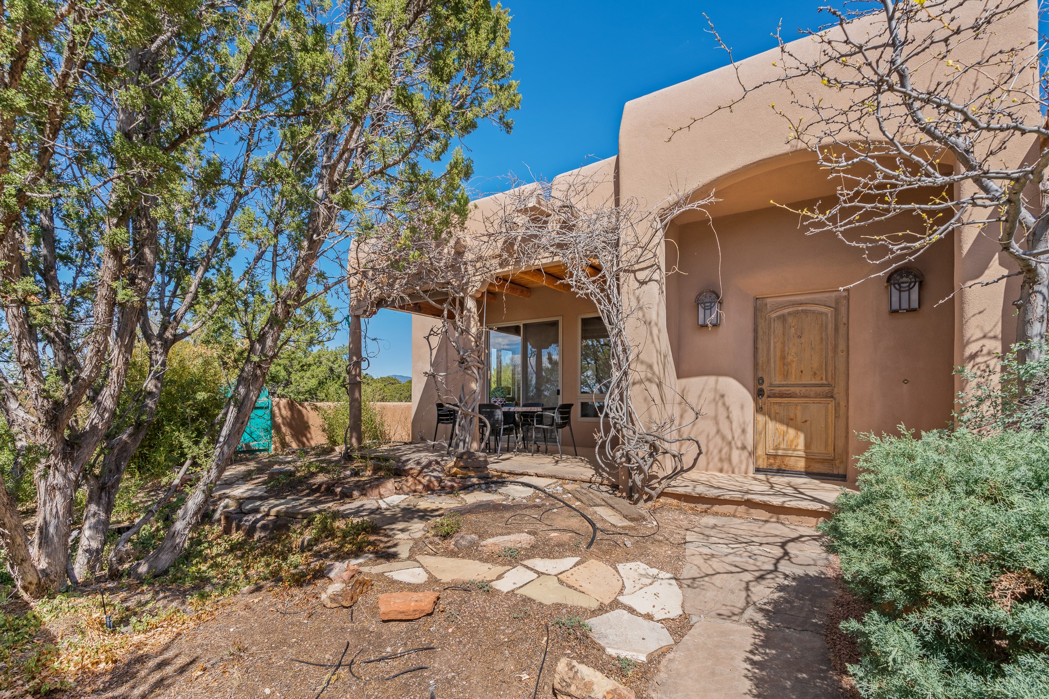 Sited on 1.6 acres in Eldorado, this 2,700 sq. ft. single-level home offers a rare blend of character, privacy, and thoughtful design--available for the first time since it was custom built in 1996. Surrounded by mature landscaping, the property is both welcoming and serene.The main living and dining area features a classic wood burning fireplace, vigas, and direct access to a charming front courtyard with a deep west-facing portal draped in mature wisteria--perfect for outdoor living and sunset evenings.A truly unique feature, the indoor heated lap pool serves as a central architectural element, separating the bedroom wings while enhancing privacy and creating a sense of retreat.The kitchen remains in its original configuration, offering generous space and a central cooking island. This opens to a covered portal within the courtyard.The bedrooms are well positioned for privacy. One guest bedroom opens directly to the enclosed backyard under a covered portal--ideal for a home office. The spacious primary suite also enjoys backyard access, with a covered sitting area that extends the home's connection to its beautifully landscaped surroundings.With solar in place, abundant natural light from the many skylights throughout and a distinctive layout, this Eldorado home offers a rare opportunity on a truly special property with mountain views.