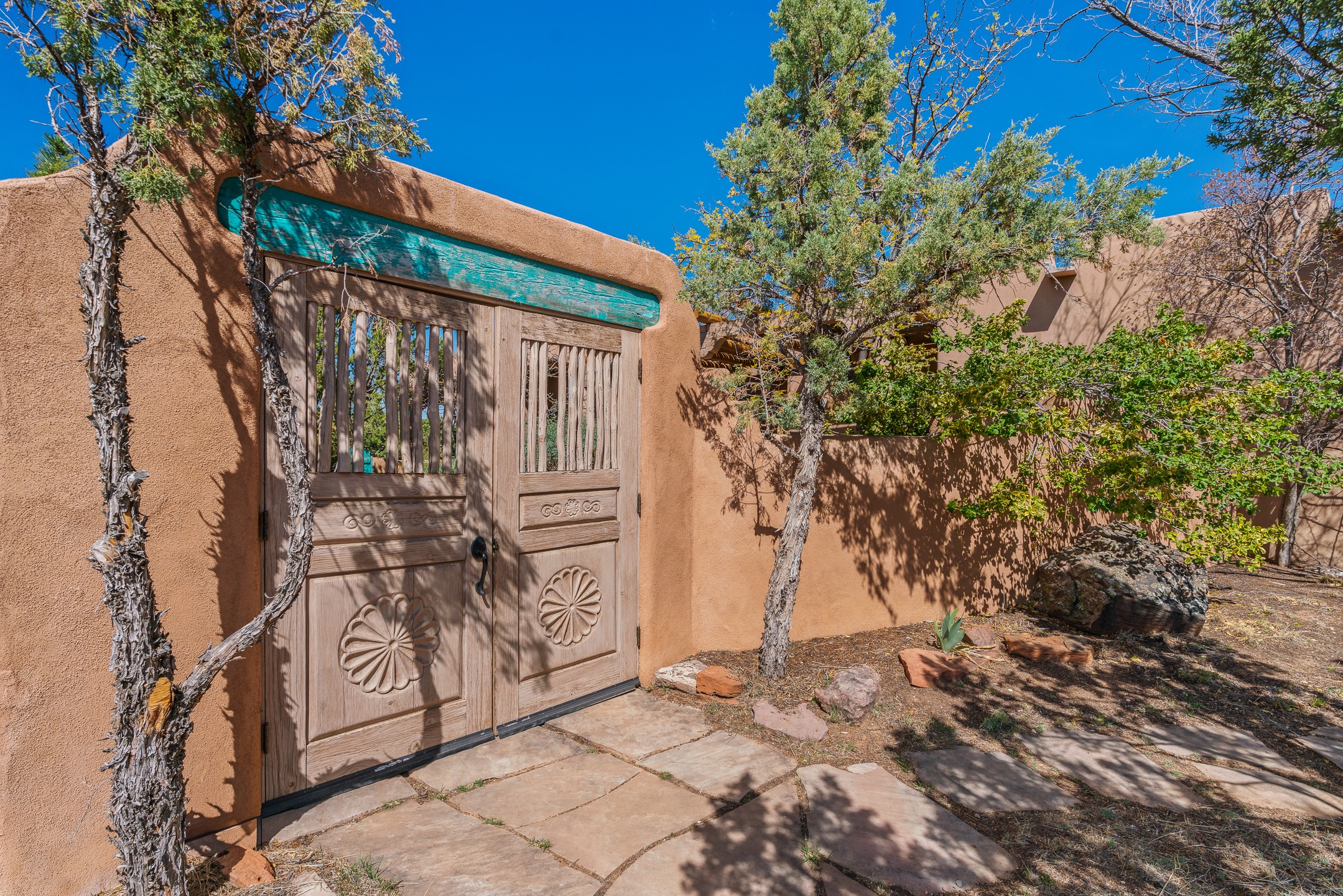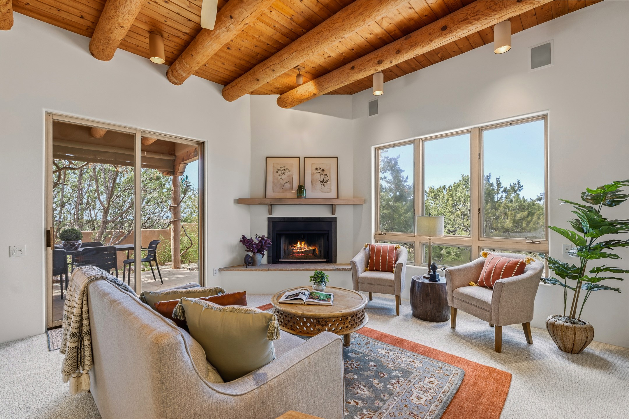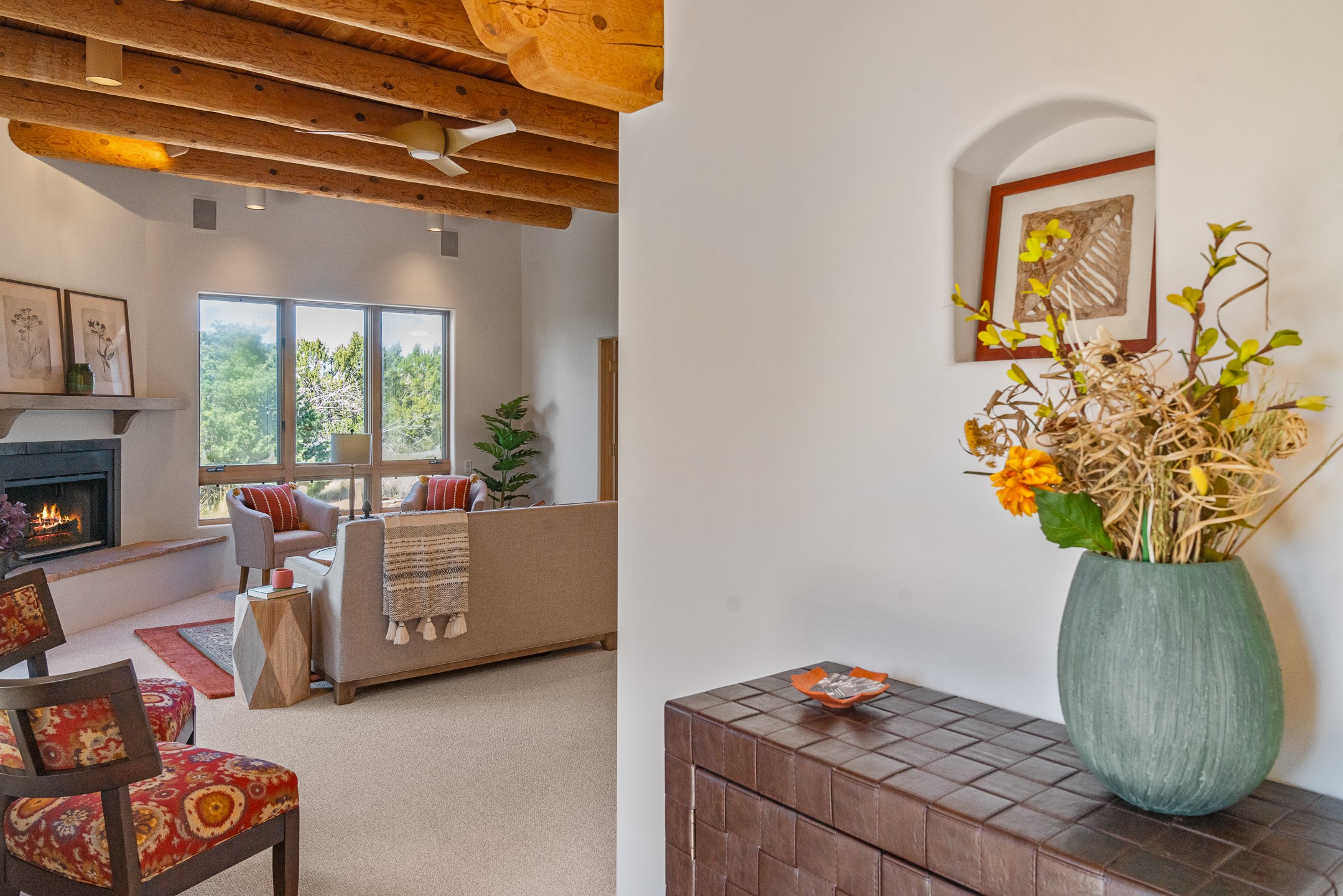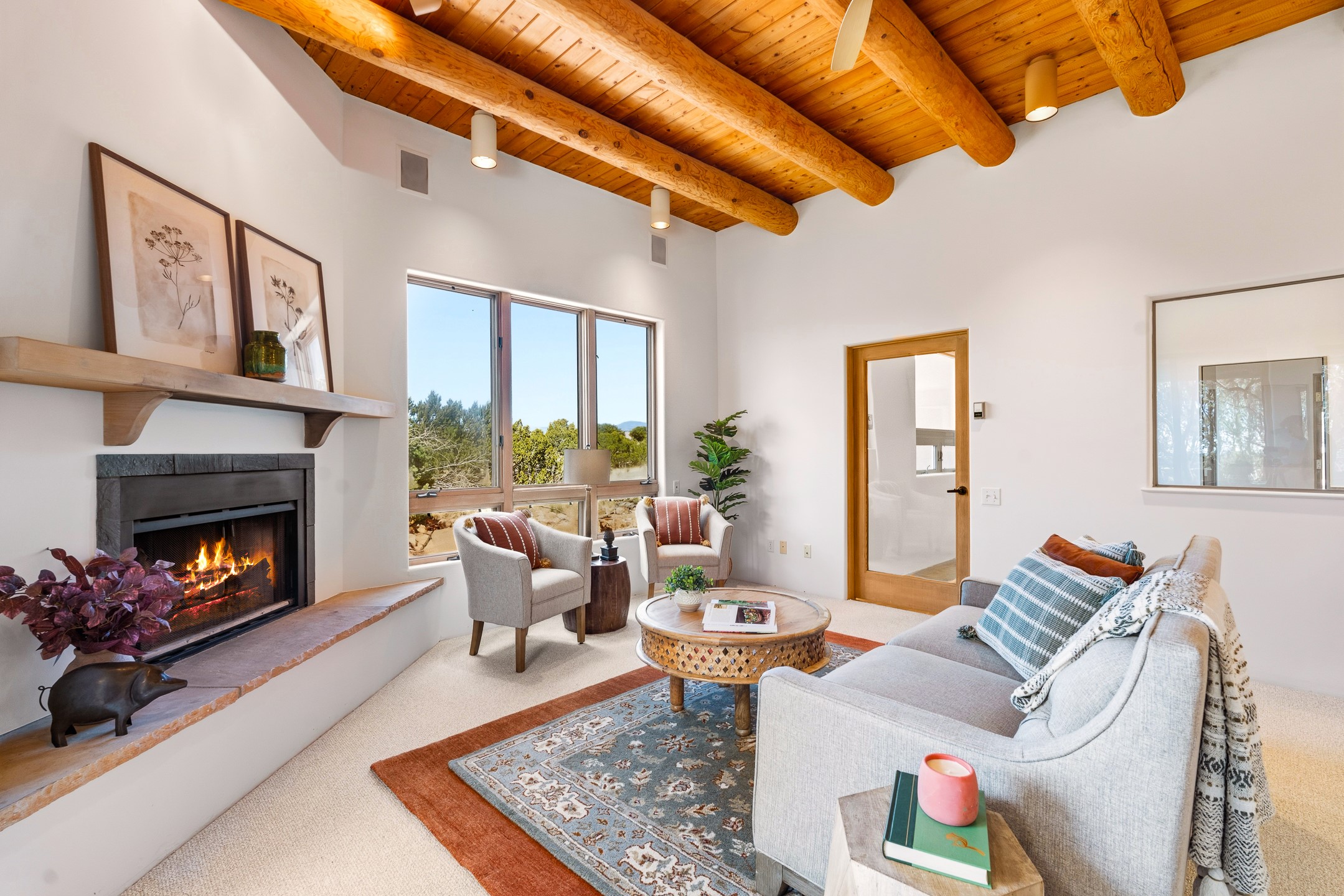 Sited on 1.6 acres in Eldorado, this 2,700 sq. ft. single-level home offers a rare blend of character, privacy, and thoughtful design--available for the first time since it was custom built in 1996. Surrounded by mature landscaping, the property is both welcoming and serene.The main living and dining area features a classic wood burning fireplace, vigas, and direct access to a charming front courtyard with a deep west-facing portal draped in mature wisteria--perfect for outdoor living and sunset evenings.A truly unique feature, the indoor heated lap pool serves as a central architectural element, separating the bedroom wings while enhancing privacy and creating a sense of retreat.The kitchen remains in its original configuration, offering generous space and a central cooking island. This opens to a covered portal within the courtyard.The bedrooms are well positioned for privacy. One guest bedroom opens directly to the enclosed backyard under a covered portal--ideal for a home office. The spacious primary suite also enjoys backyard access, with a covered sitting area that extends the home's connection to its beautifully landscaped surroundings.With solar in place, abundant natural light from the many skylights throughout and a distinctive layout, this Eldorado home offers a rare opportunity on a truly special property with mountain views.