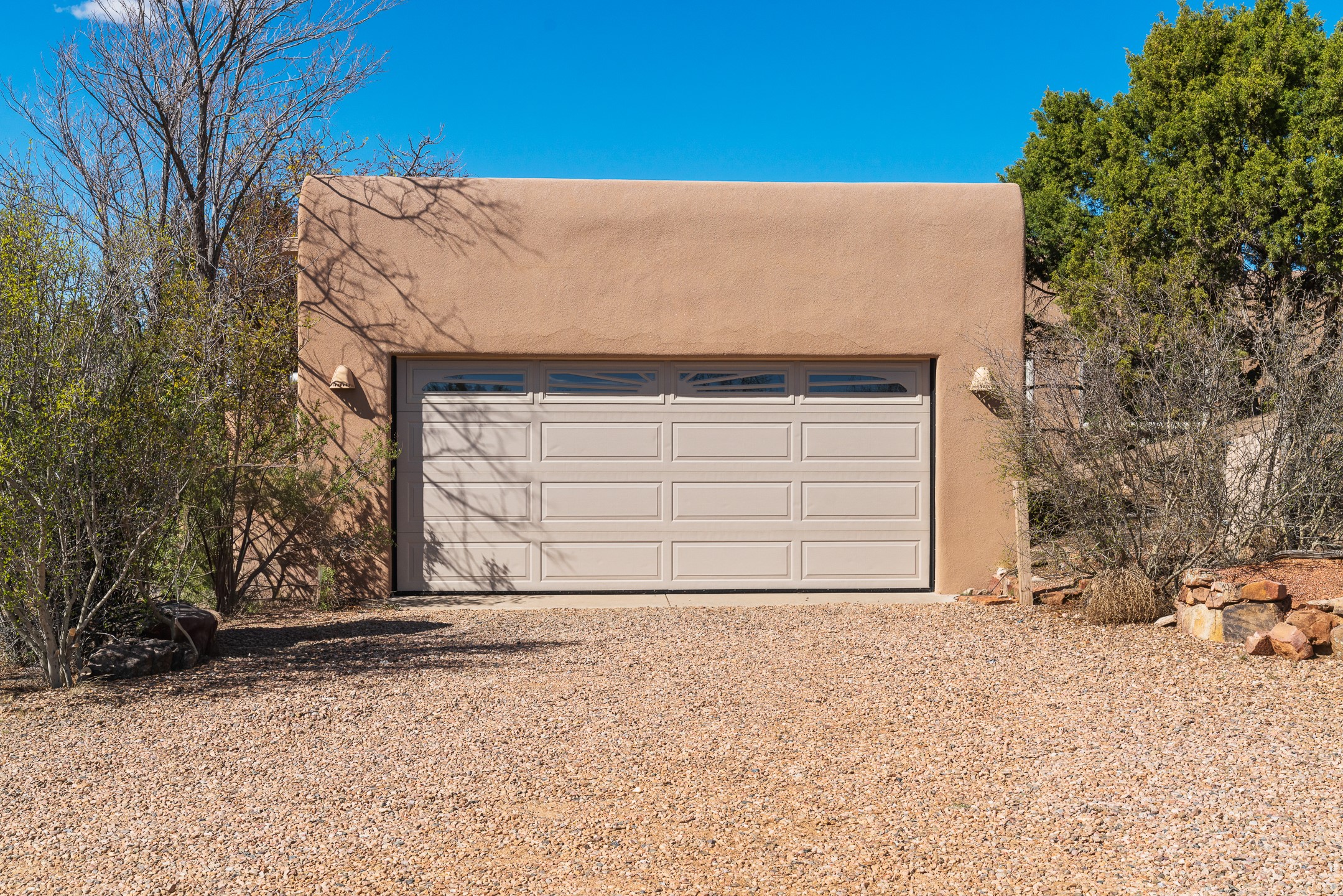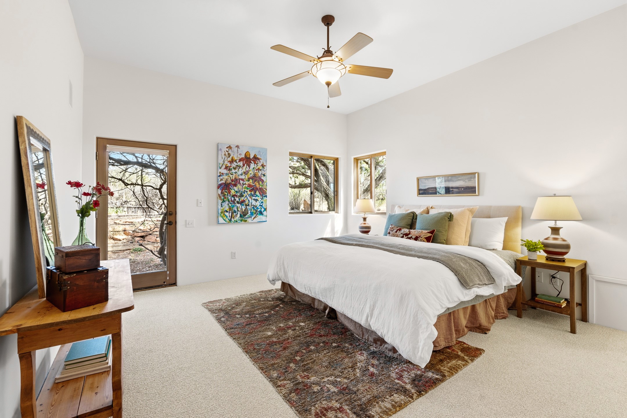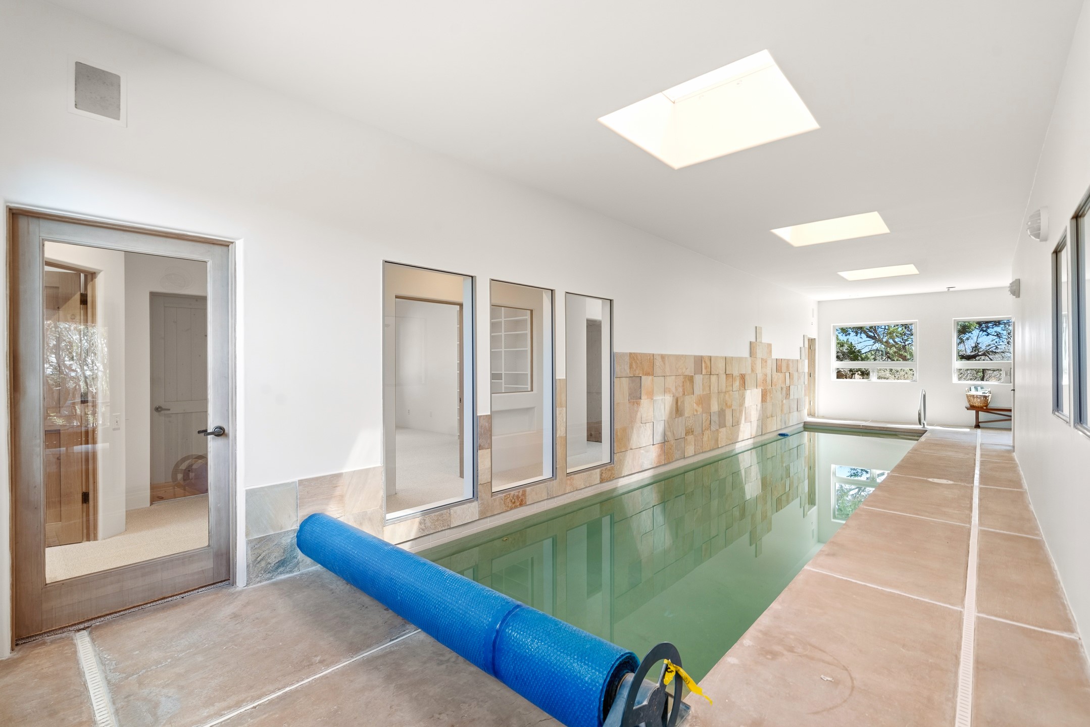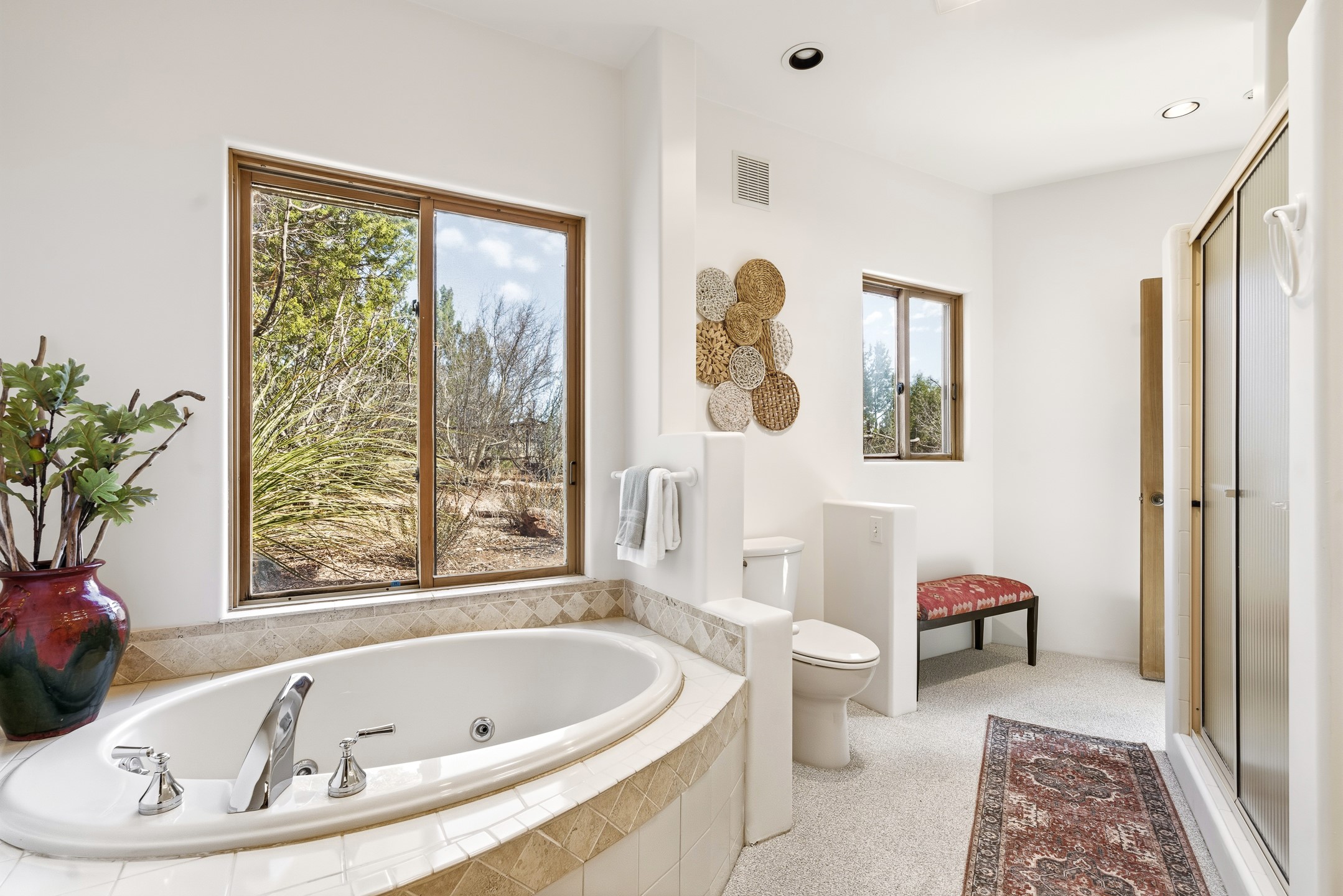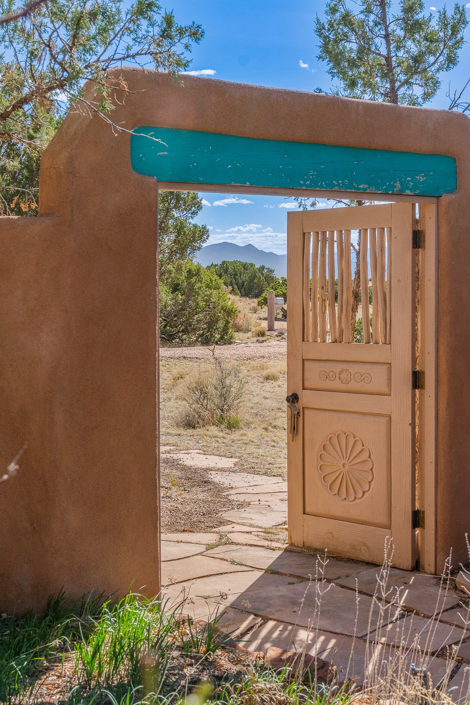 Sited on 1.6 acres in Eldorado, this 2,700 sq. ft. single-level home offers a rare blend of character, privacy, and thoughtful design--available for the first time since it was custom built in 1996. Surrounded by mature landscaping, the property is both welcoming and serene.The main living and dining area features a classic wood burning fireplace, vigas, and direct access to a charming front courtyard with a deep west-facing portal draped in mature wisteria--perfect for outdoor living and sunset evenings.A truly unique feature, the indoor heated lap pool serves as a central architectural element, separating the bedroom wings while enhancing privacy and creating a sense of retreat.The kitchen remains in its original configuration, offering generous space and a central cooking island. This opens to a covered portal within the courtyard.The bedrooms are well positioned for privacy. One guest bedroom opens directly to the enclosed backyard under a covered portal--ideal for a home office. The spacious primary suite also enjoys backyard access, with a covered sitting area that extends the home's connection to its beautifully landscaped surroundings.With solar in place, abundant natural light from the many skylights throughout and a distinctive layout, this Eldorado home offers a rare opportunity on a truly special property with mountain views.