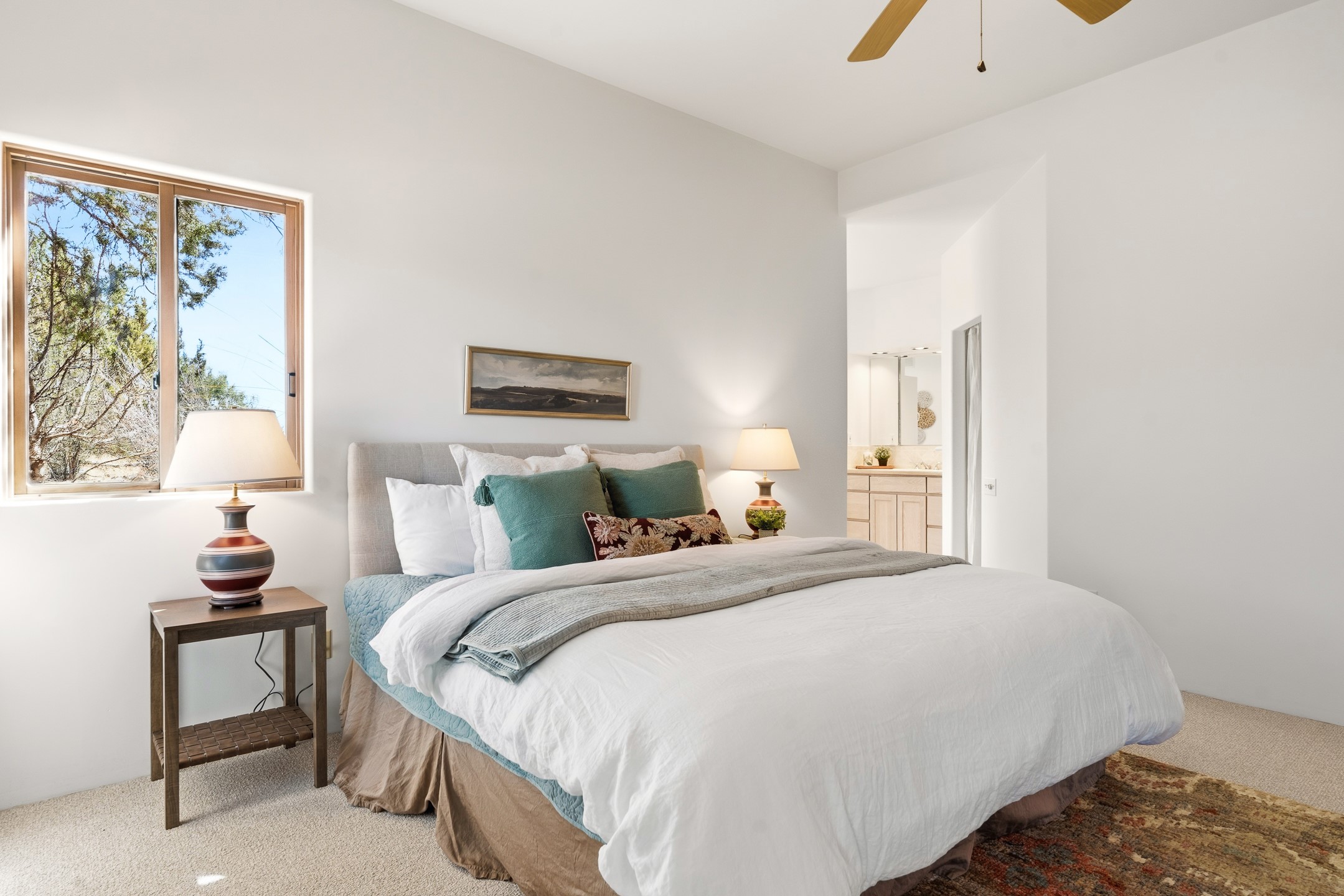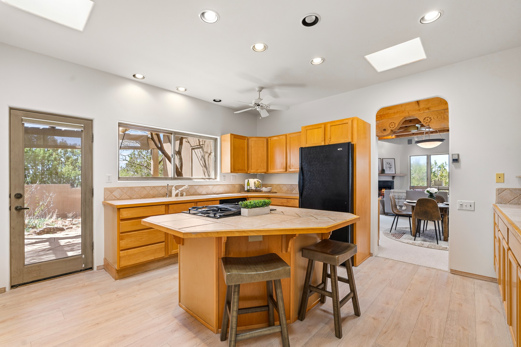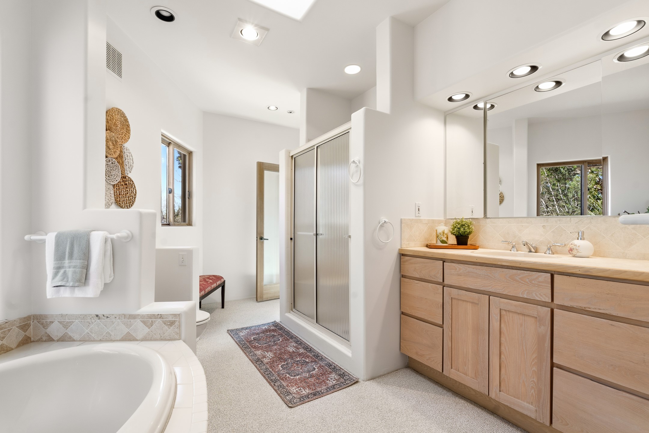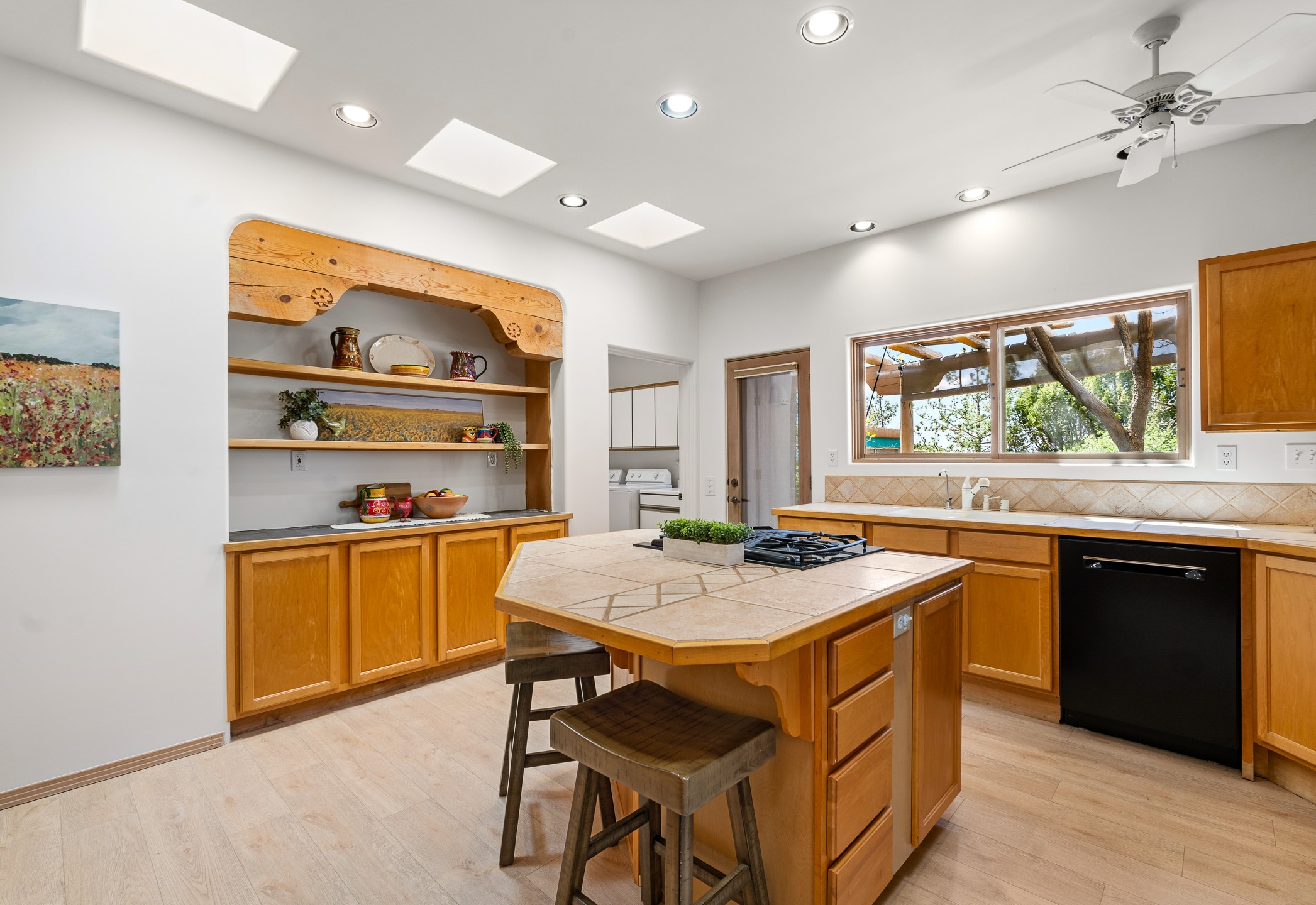 Sited on 1.6 acres in Eldorado, this 2,700 sq. ft. single-level home offers a rare blend of character, privacy, and thoughtful design--available for the first time since it was custom built in 1996. Surrounded by mature landscaping, the property is both welcoming and serene.The main living and dining area features a classic wood burning fireplace, vigas, and direct access to a charming front courtyard with a deep west-facing portal draped in mature wisteria--perfect for outdoor living and sunset evenings.A truly unique feature, the indoor heated lap pool serves as a central architectural element, separating the bedroom wings while enhancing privacy and creating a sense of retreat.The kitchen remains in its original configuration, offering generous space and a central cooking island. This opens to a covered portal within the courtyard.The bedrooms are well positioned for privacy. One guest bedroom opens directly to the enclosed backyard under a covered portal--ideal for a home office. The spacious primary suite also enjoys backyard access, with a covered sitting area that extends the home's connection to its beautifully landscaped surroundings.With solar in place, abundant natural light from the many skylights throughout and a distinctive layout, this Eldorado home offers a rare opportunity on a truly special property with mountain views.