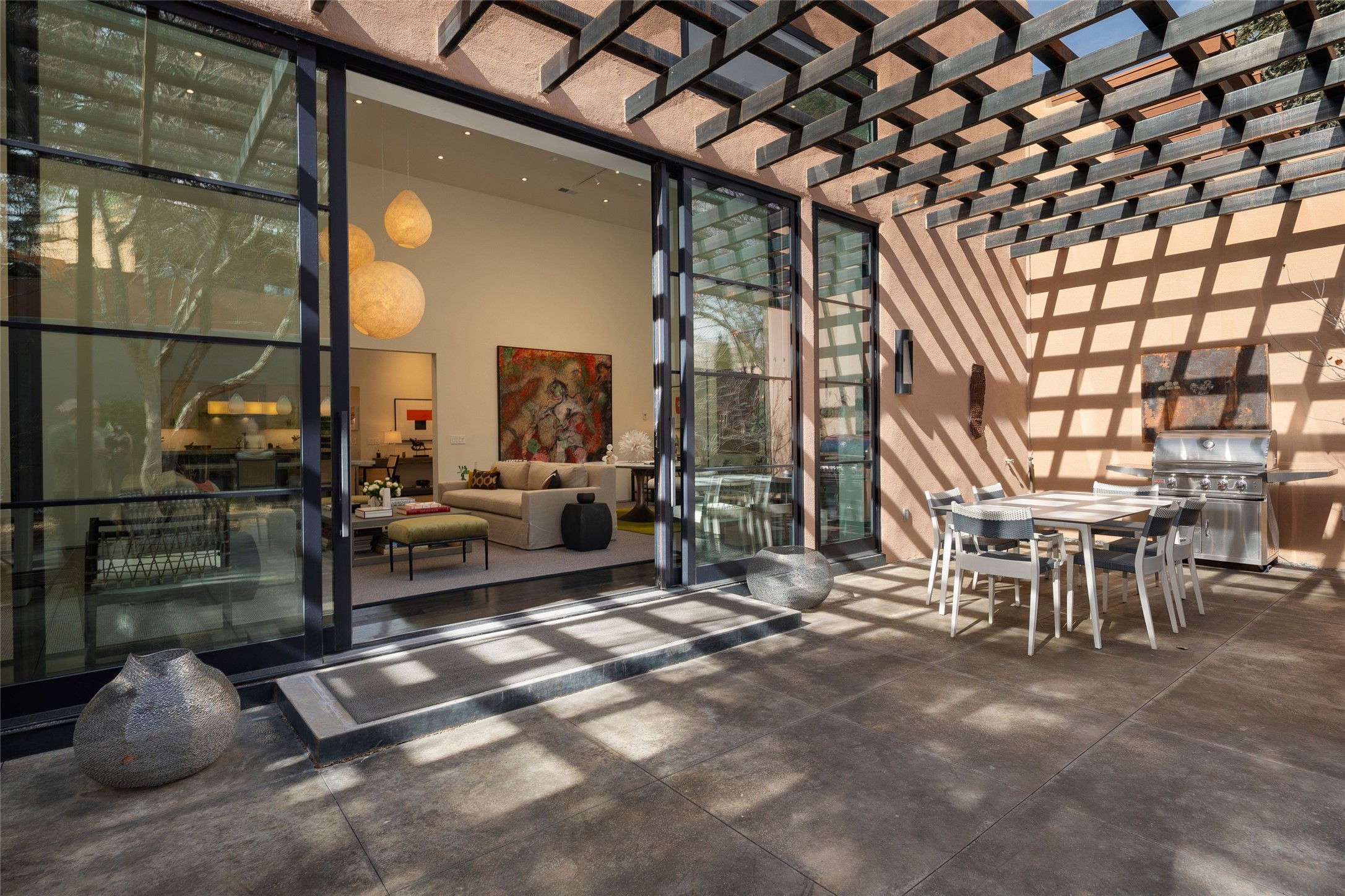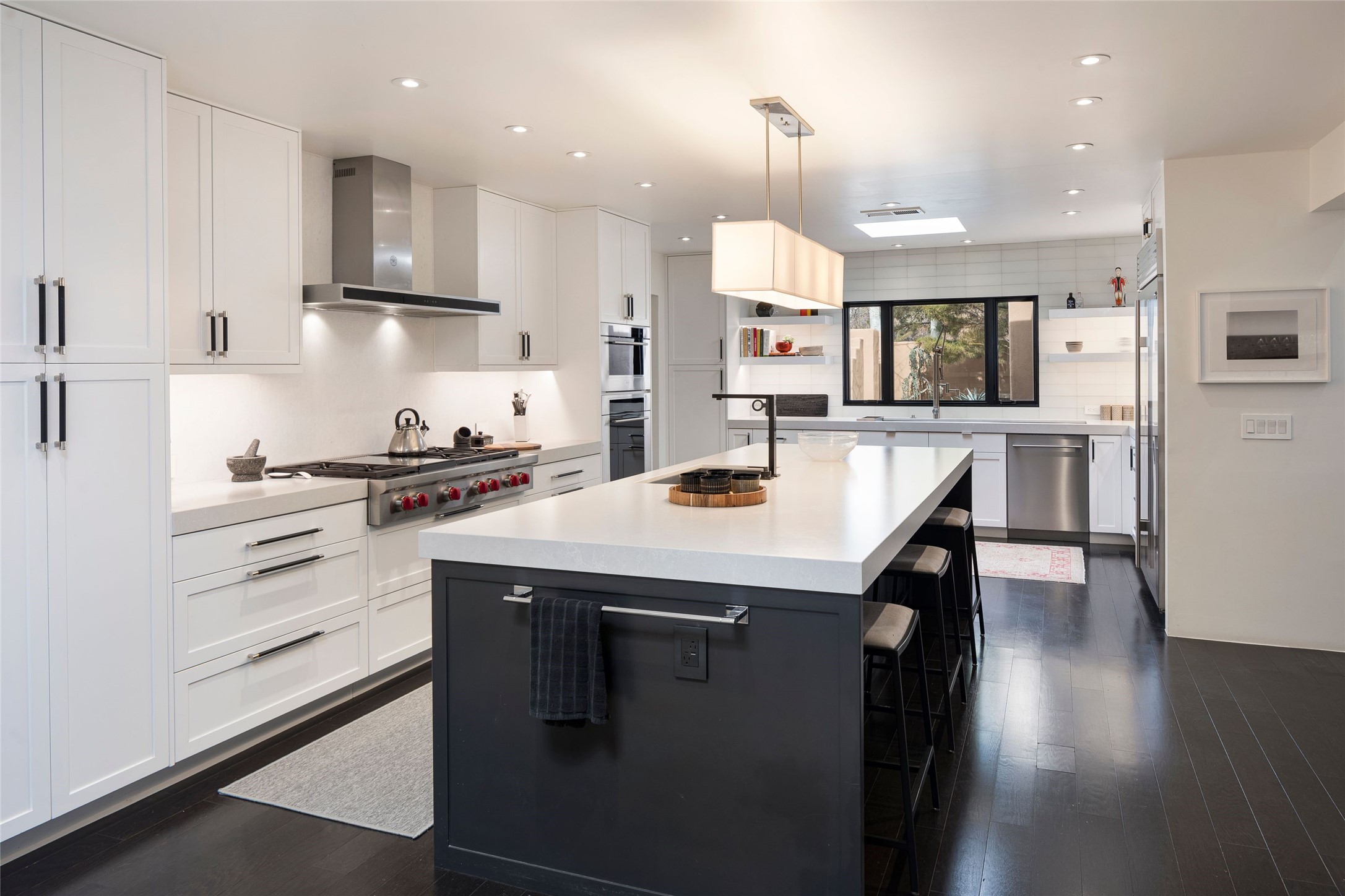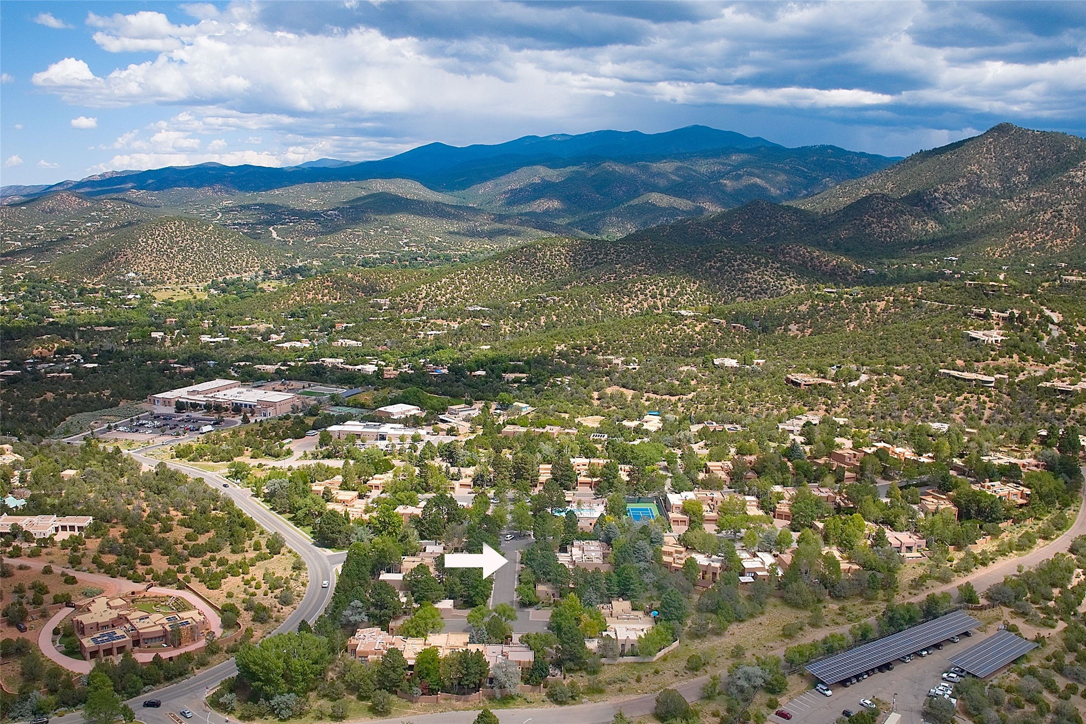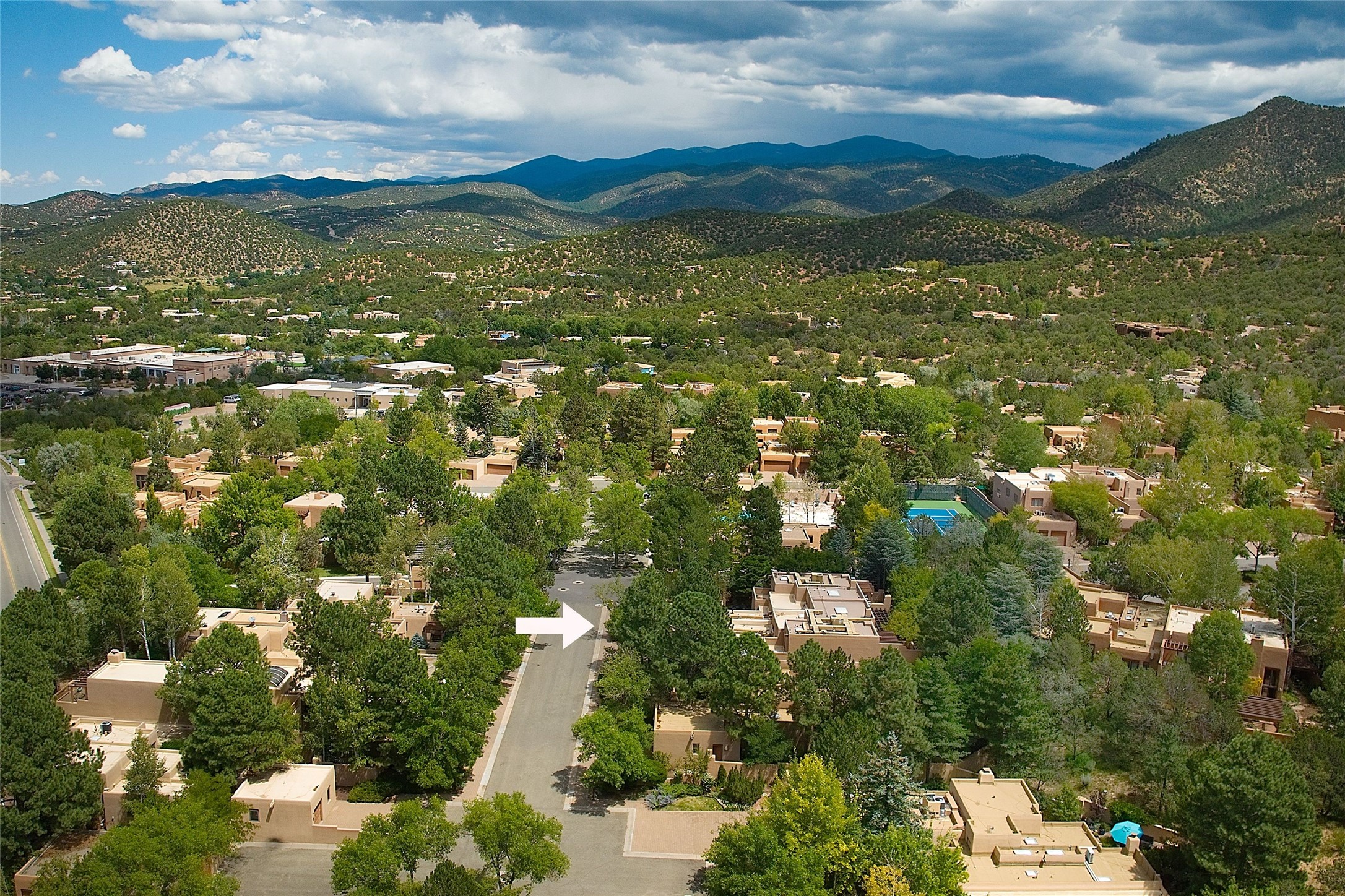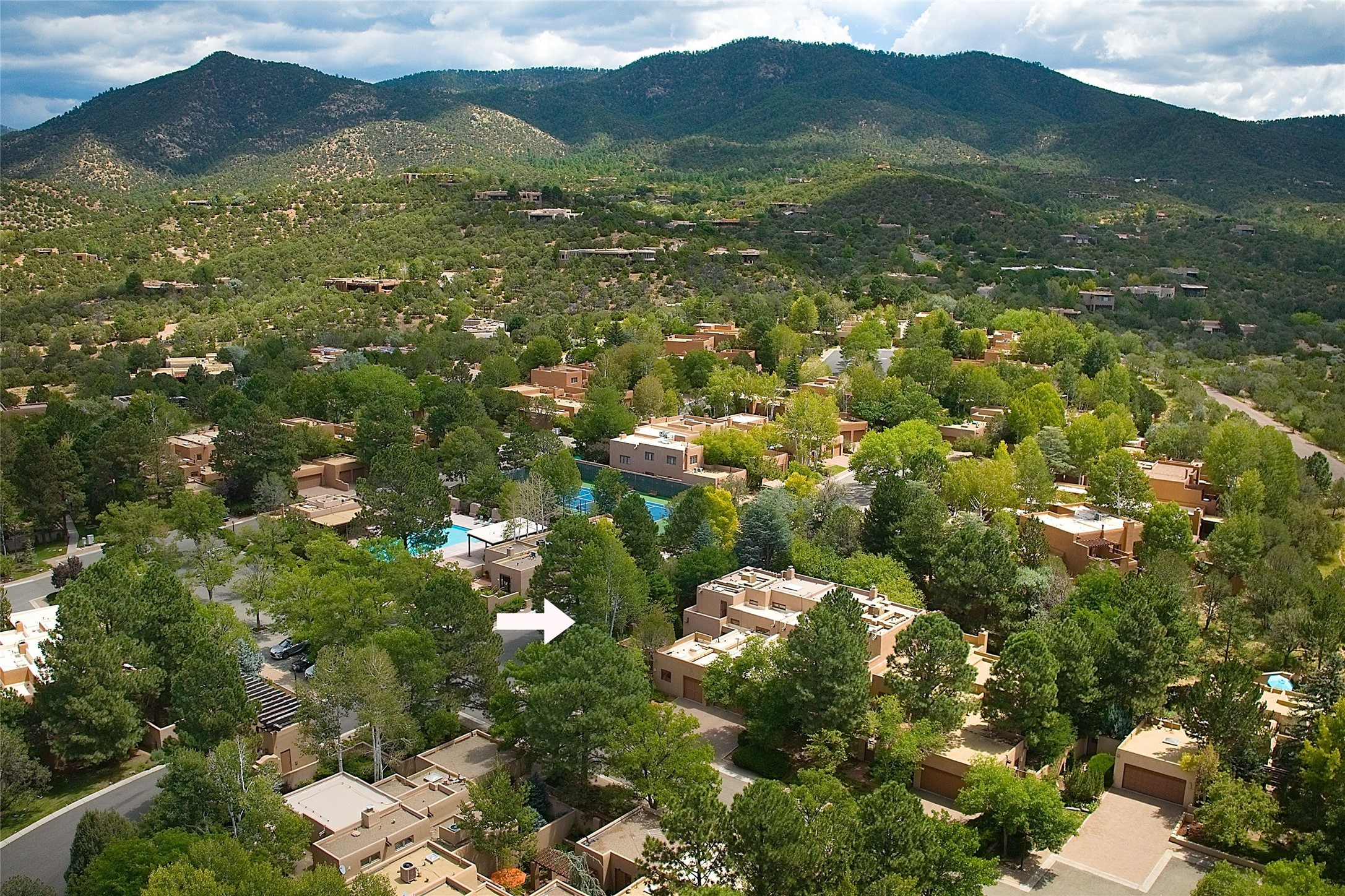 Exquisite Los Miradores 4-bedroom, 4.5-bath condo, where modern elegance meets artistic finesse. This stunning residence was reimagined and remodeled in 2020-2021, showcasing a balanced blend of wood, steel, glass, and stone that appeals to the most discerning tastes. As you enter, you'll be greeted by an impressive entry gallery with a clerestory window that bathes the space in natural light. The formal dining room, complemented by a wet bar, invites you to host dinner parties and soirees. Two-story grand living room includes sliding glass doors flanked by sidelights connecting to an entertainment patio complete with a gas fire pit and a contemporary steel pergola, ideal for alfresco dining under the New Mexican skies. Deluxe gourmet kitchen, featuring custom cabinetry, elegant quartz countertops, and top-of-the-line appliances, including a Wolf six-burner cooktop with griddle, Wolf wall oven, and Sub-Zero side-by-side refrigerator/freezer. Expansive center island and large breakfast area make this kitchen a culinary gathering area. The luxurious owner's suite, designed as a private sanctuary with a spa-like bath promises relaxation and tranquility. A guest suite is conveniently located on the ground floor, alongside a dedicated office and media room. Upper level, with two additional suites, each with en-suite baths, provide privacy for family or guests. High-walled patios and beautifully landscaped gardens. An oversized two-car garage ensures ample space for your vehicles and storage needs. The gated community of Los Miradores offers many amenities, including a seasonal pool, workout facility, tennis court and security patrol.