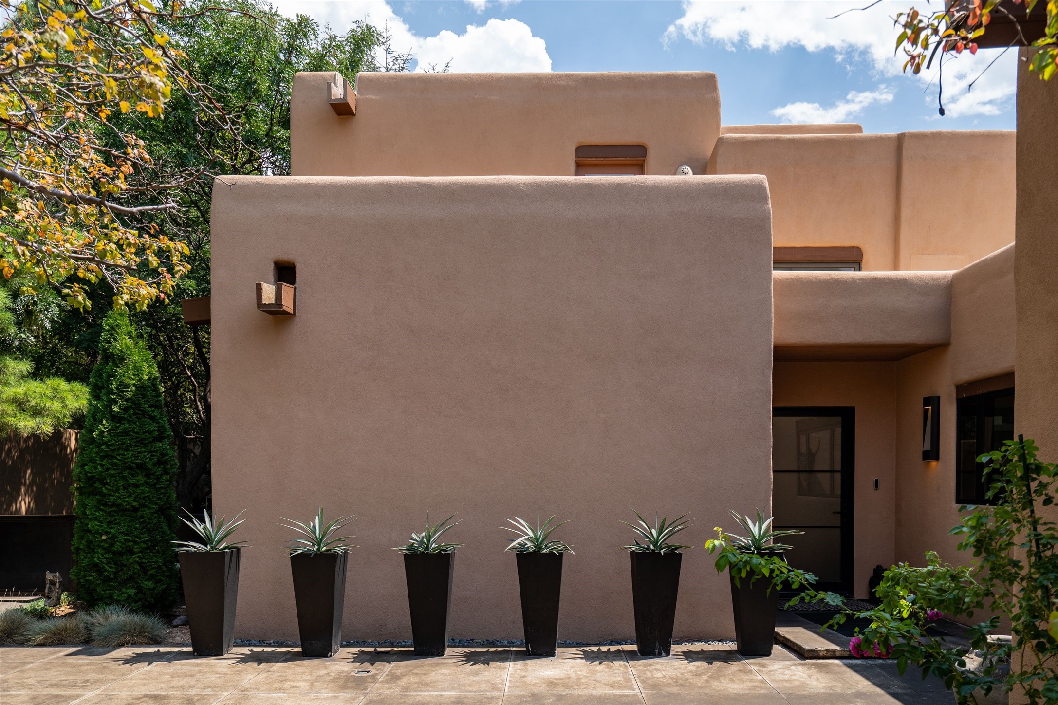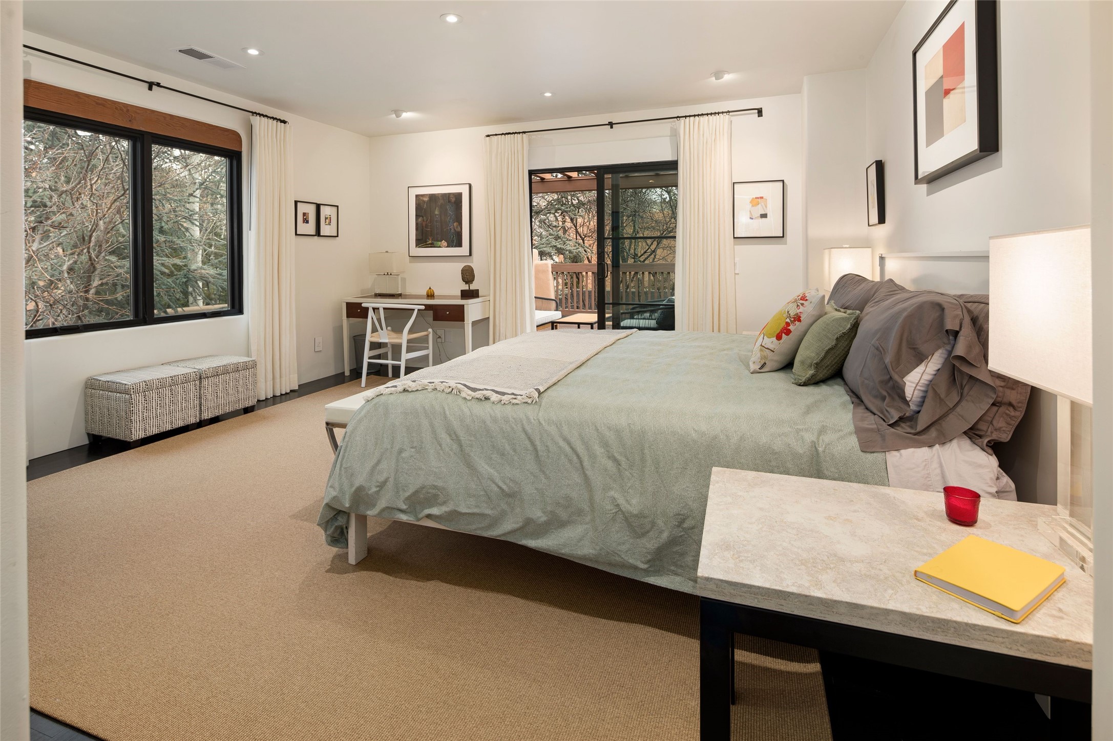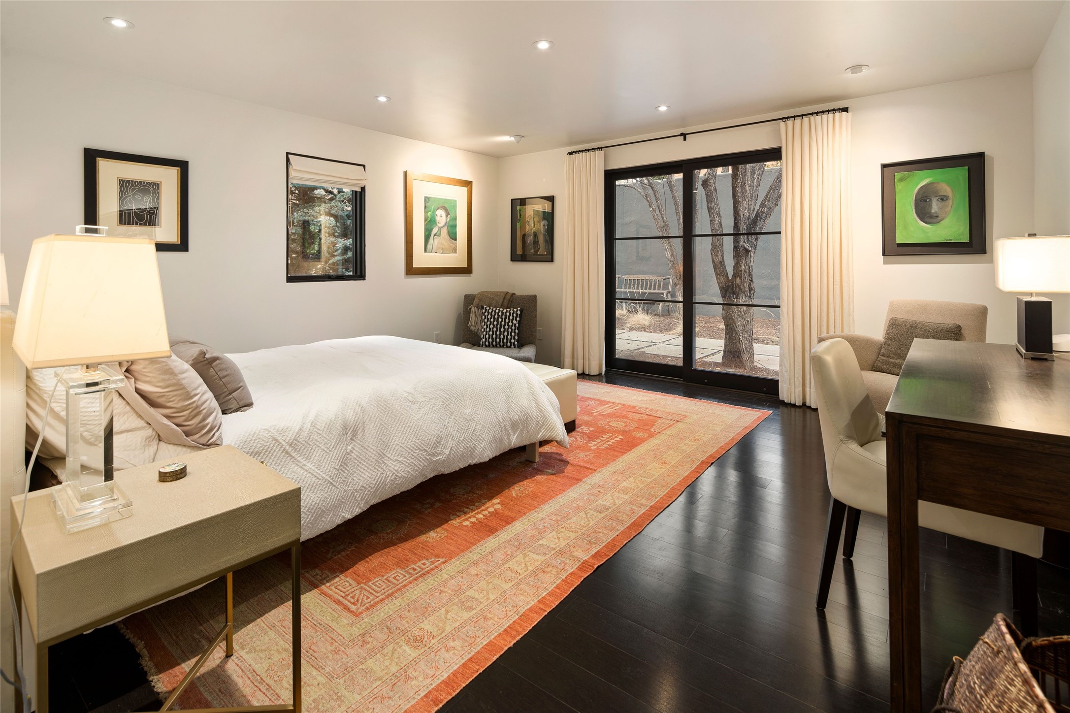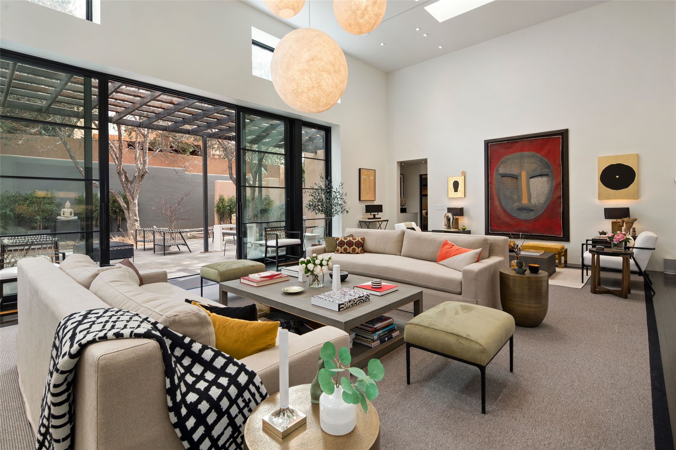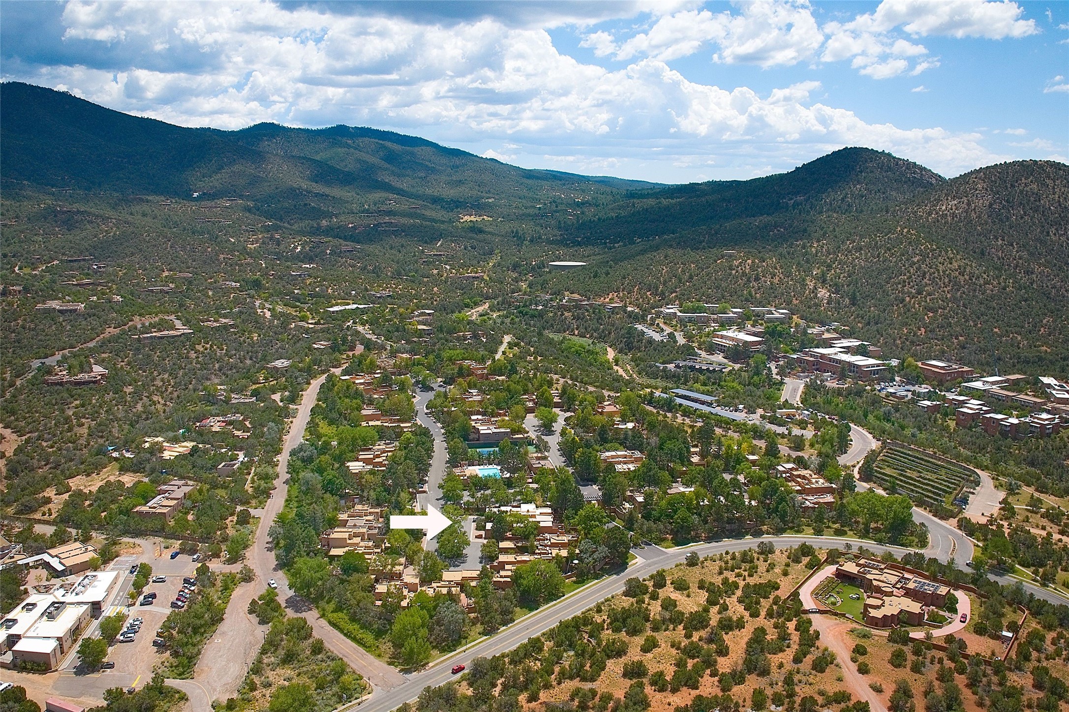 Exquisite Los Miradores 4-bedroom, 4.5-bath condo, where modern elegance meets artistic finesse. This stunning residence was reimagined and remodeled in 2020-2021, showcasing a balanced blend of wood, steel, glass, and stone that appeals to the most discerning tastes. As you enter, you'll be greeted by an impressive entry gallery with a clerestory window that bathes the space in natural light. The formal dining room, complemented by a wet bar, invites you to host dinner parties and soirees. Two-story grand living room includes sliding glass doors flanked by sidelights connecting to an entertainment patio complete with a gas fire pit and a contemporary steel pergola, ideal for alfresco dining under the New Mexican skies. Deluxe gourmet kitchen, featuring custom cabinetry, elegant quartz countertops, and top-of-the-line appliances, including a Wolf six-burner cooktop with griddle, Wolf wall oven, and Sub-Zero side-by-side refrigerator/freezer. Expansive center island and large breakfast area make this kitchen a culinary gathering area. The luxurious owner's suite, designed as a private sanctuary with a spa-like bath promises relaxation and tranquility. A guest suite is conveniently located on the ground floor, alongside a dedicated office and media room. Upper level, with two additional suites, each with en-suite baths, provide privacy for family or guests. High-walled patios and beautifully landscaped gardens. An oversized two-car garage ensures ample space for your vehicles and storage needs. The gated community of Los Miradores offers many amenities, including a seasonal pool, workout facility, tennis court and security patrol.