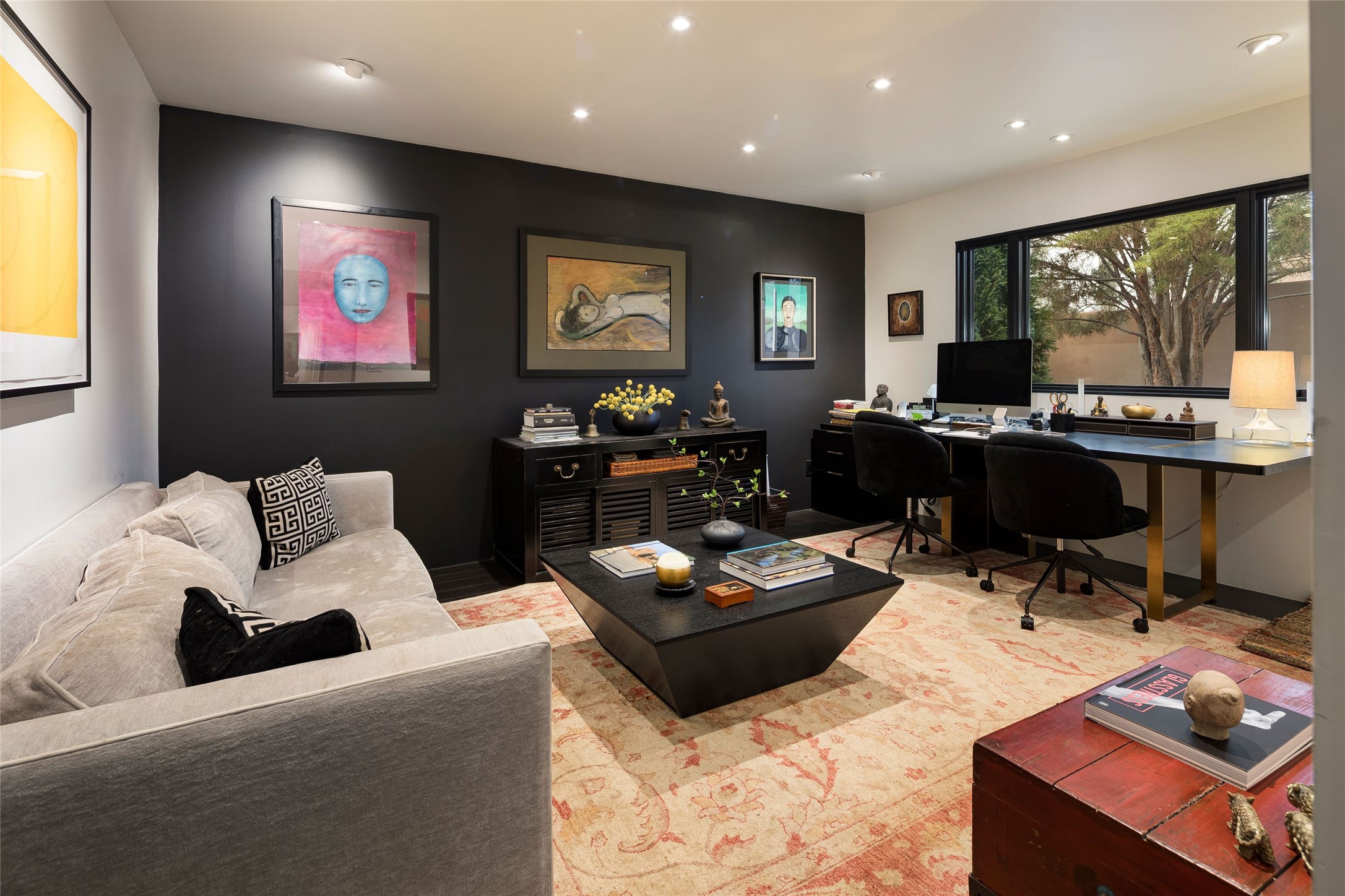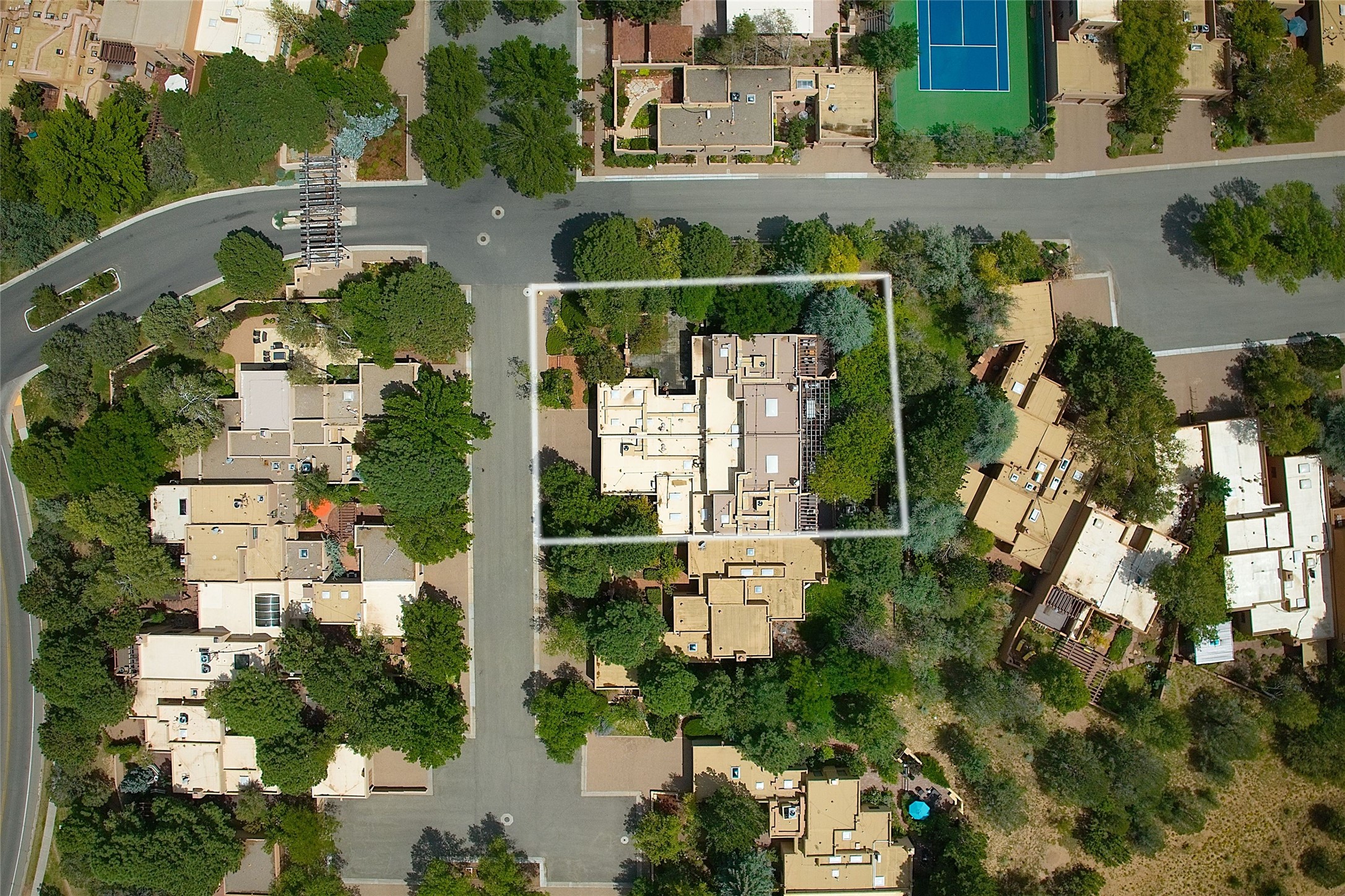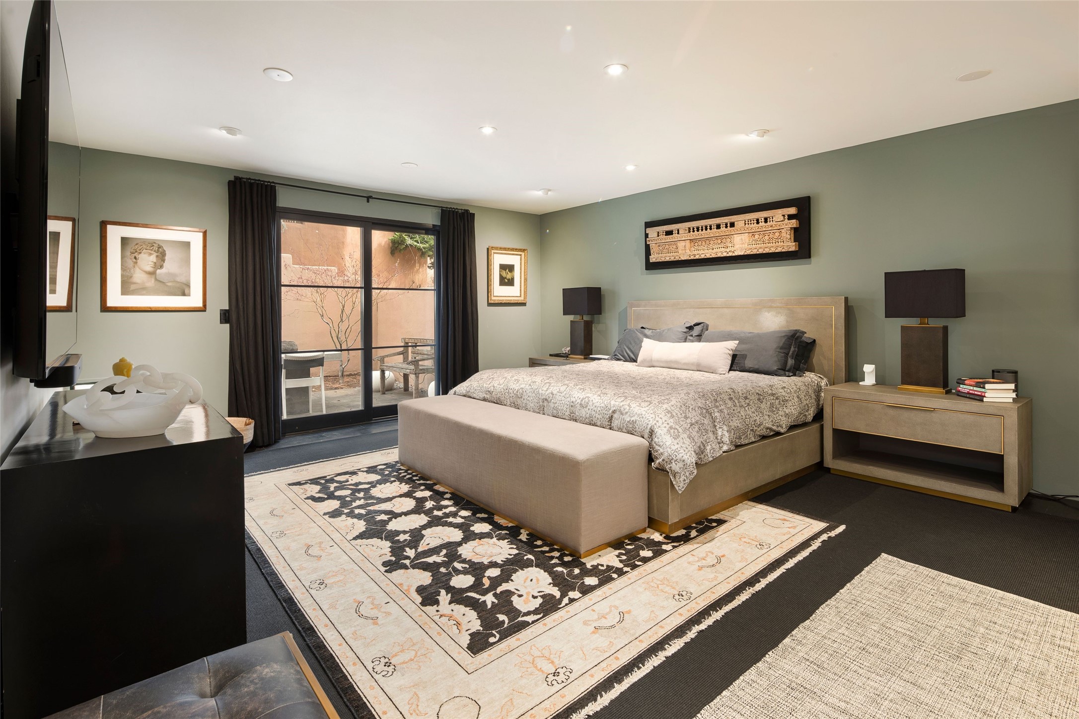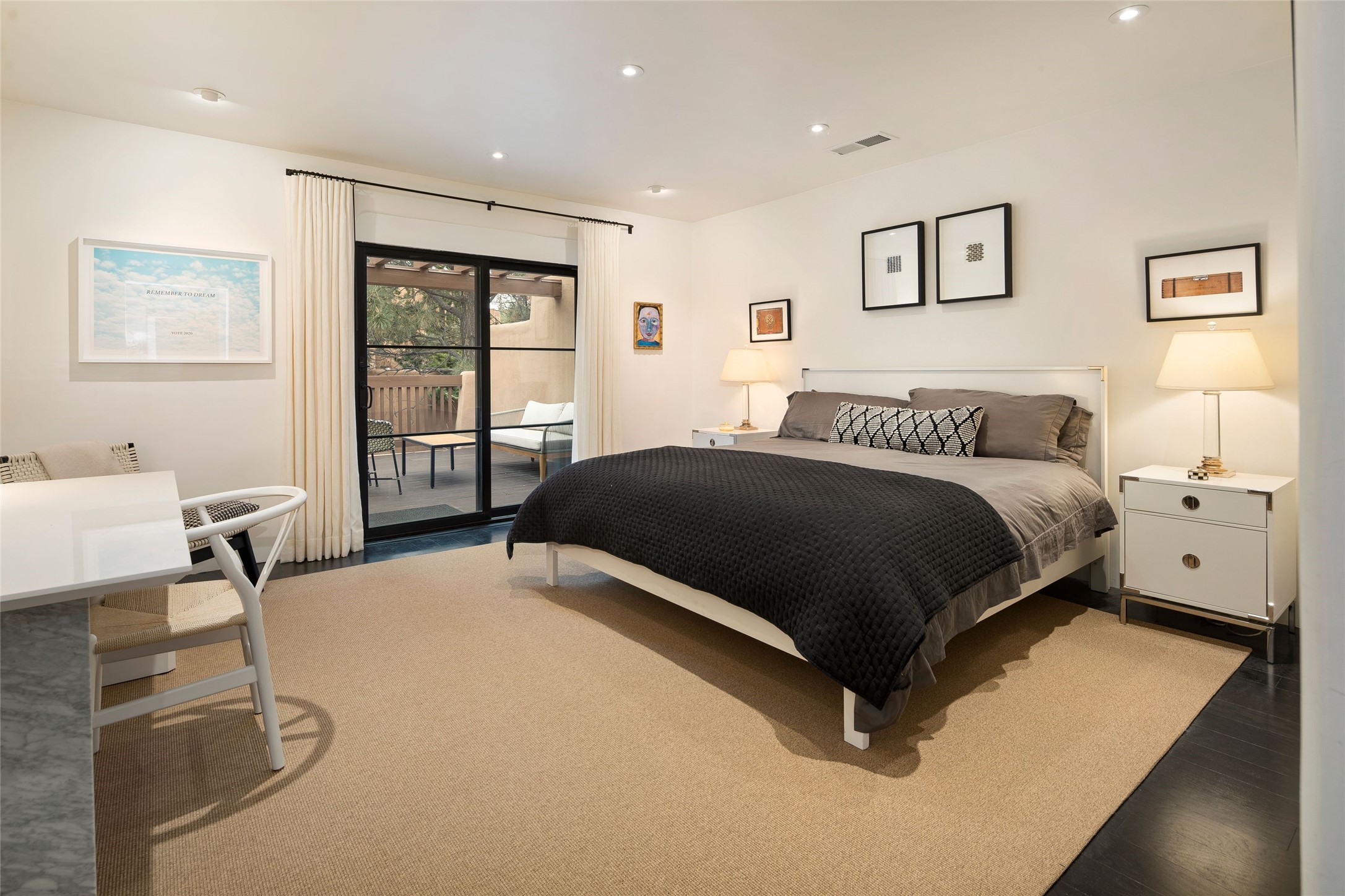 Exquisite Los Miradores 4-bedroom, 4.5-bath condo, where modern elegance meets artistic finesse. This stunning residence was reimagined and remodeled in 2020-2021, showcasing a balanced blend of wood, steel, glass, and stone that appeals to the most discerning tastes. As you enter, you'll be greeted by an impressive entry gallery with a clerestory window that bathes the space in natural light. The formal dining room, complemented by a wet bar, invites you to host dinner parties and soirees. Two-story grand living room includes sliding glass doors flanked by sidelights connecting to an entertainment patio complete with a gas fire pit and a contemporary steel pergola, ideal for alfresco dining under the New Mexican skies. Deluxe gourmet kitchen, featuring custom cabinetry, elegant quartz countertops, and top-of-the-line appliances, including a Wolf six-burner cooktop with griddle, Wolf wall oven, and Sub-Zero side-by-side refrigerator/freezer. Expansive center island and large breakfast area make this kitchen a culinary gathering area. The luxurious owner's suite, designed as a private sanctuary with a spa-like bath promises relaxation and tranquility. A guest suite is conveniently located on the ground floor, alongside a dedicated office and media room. Upper level, with two additional suites, each with en-suite baths, provide privacy for family or guests. High-walled patios and beautifully landscaped gardens. An oversized two-car garage ensures ample space for your vehicles and storage needs. The gated community of Los Miradores offers many amenities, including a seasonal pool, workout facility, tennis court and security patrol.