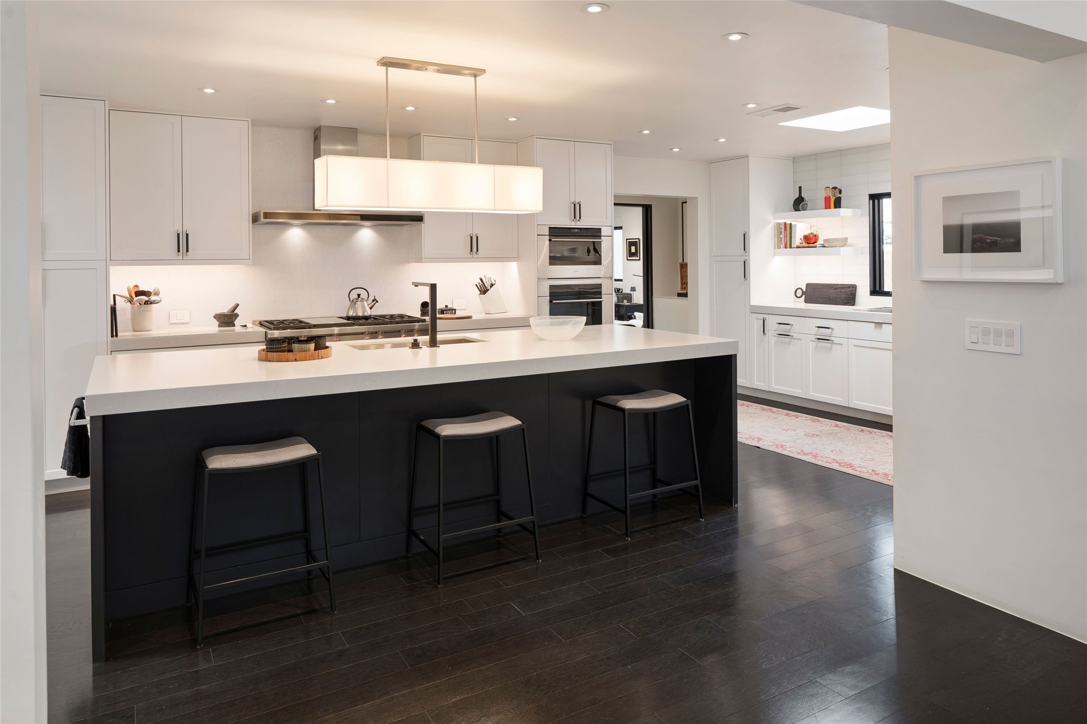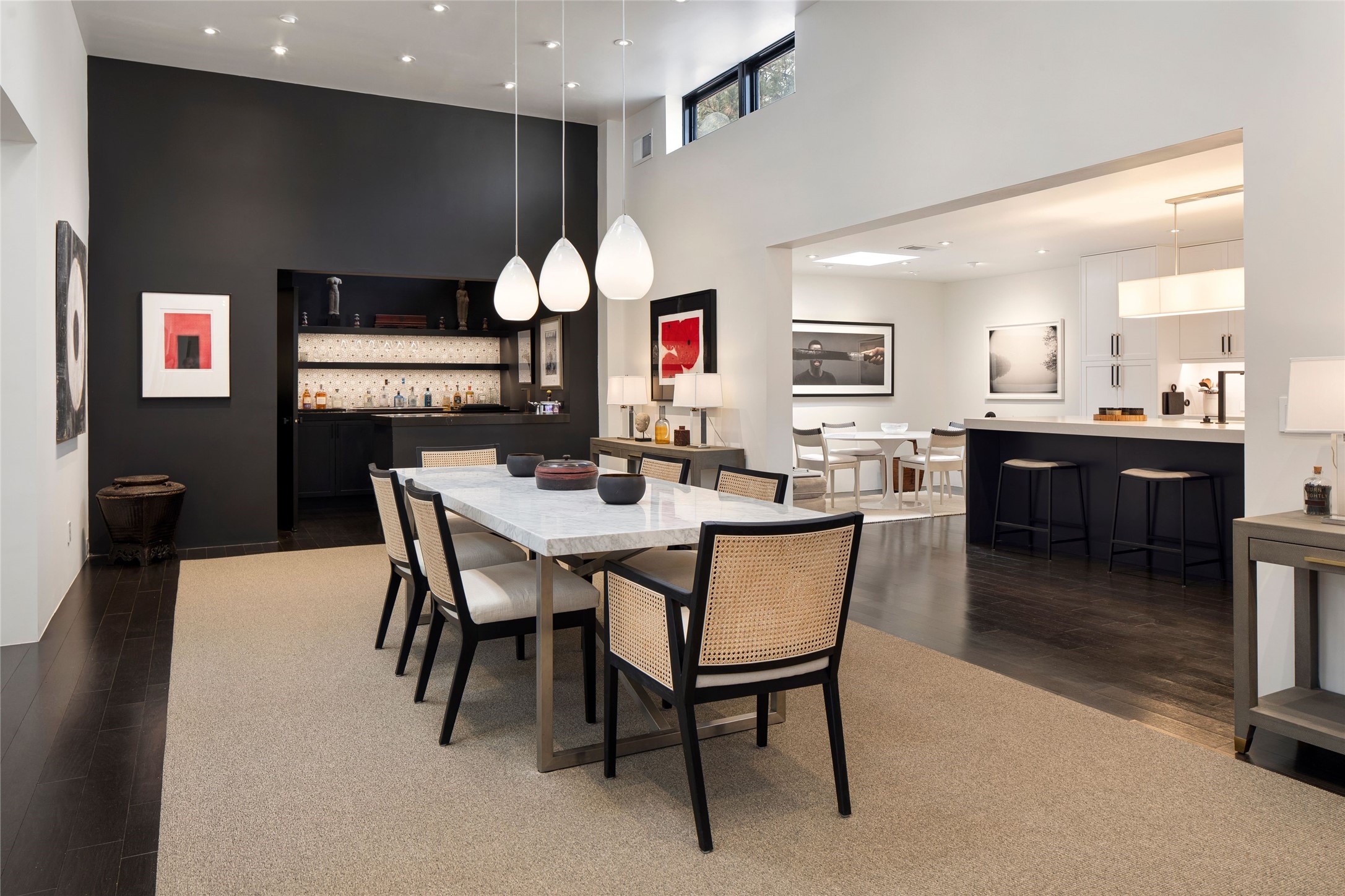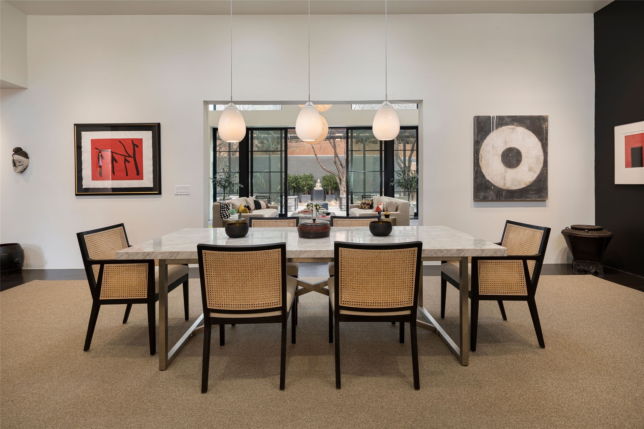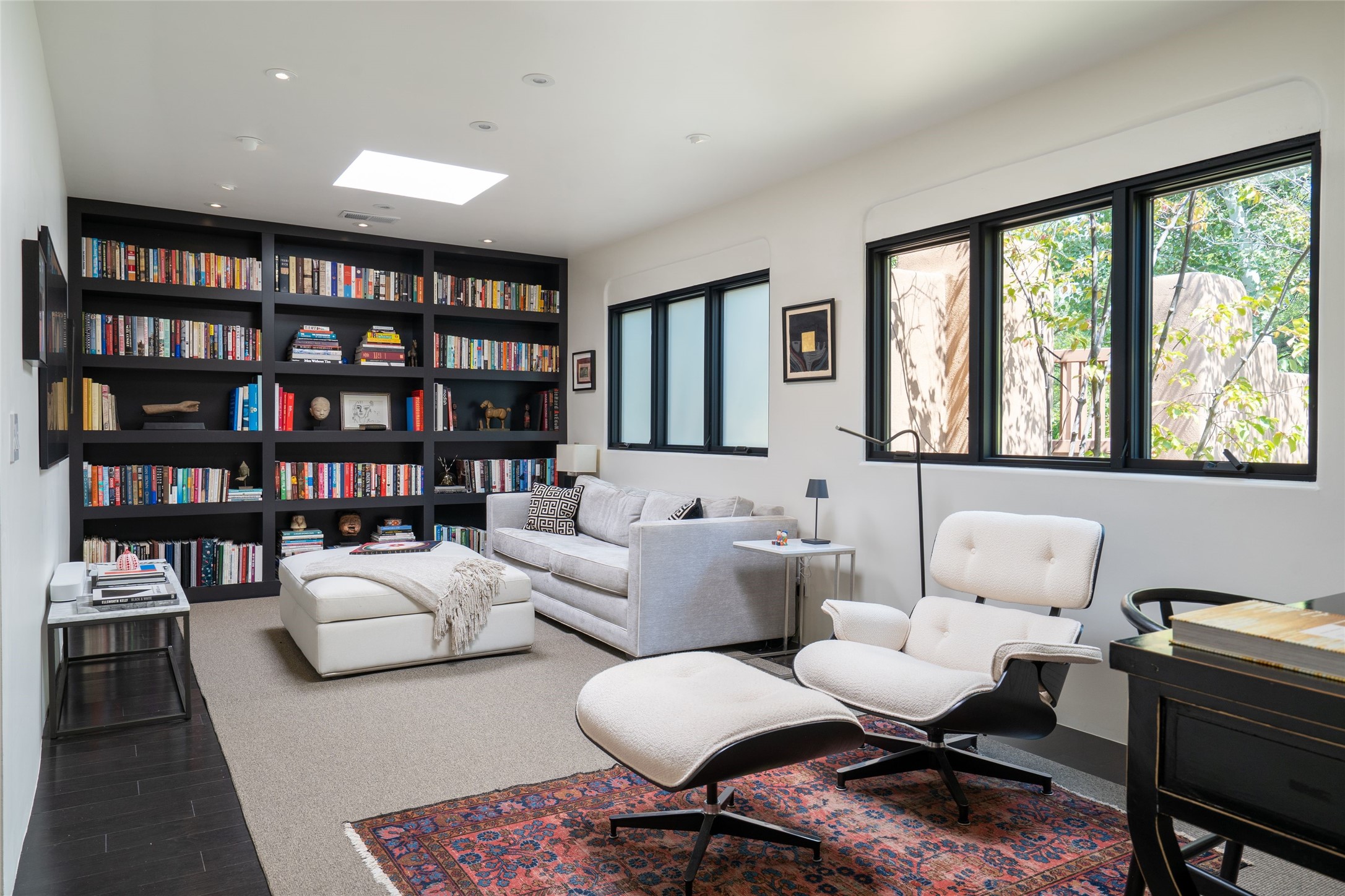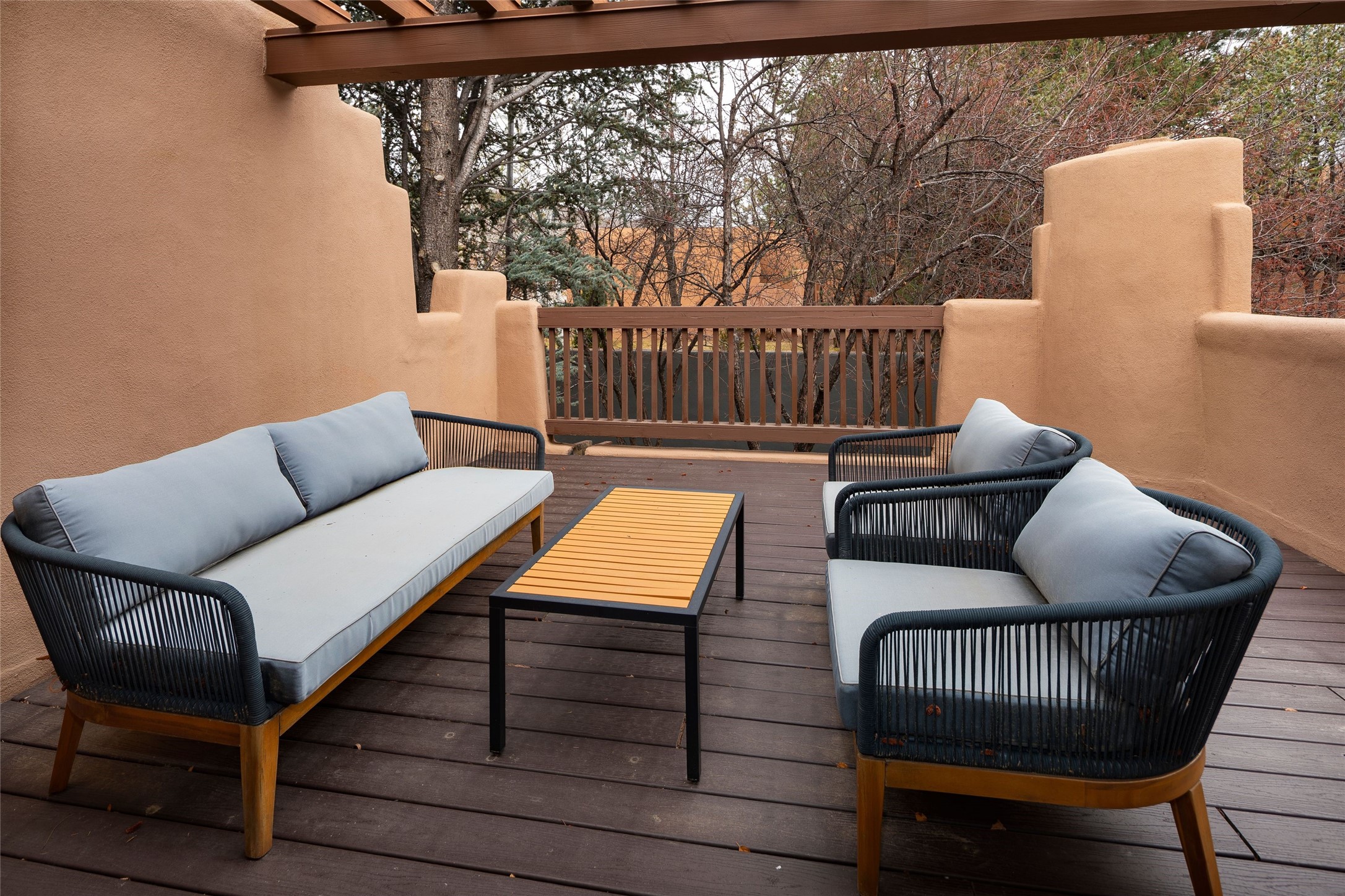 Exquisite Los Miradores 4-bedroom, 4.5-bath condo, where modern elegance meets artistic finesse. This stunning residence was reimagined and remodeled in 2020-2021, showcasing a balanced blend of wood, steel, glass, and stone that appeals to the most discerning tastes. As you enter, you'll be greeted by an impressive entry gallery with a clerestory window that bathes the space in natural light. The formal dining room, complemented by a wet bar, invites you to host dinner parties and soirees. Two-story grand living room includes sliding glass doors flanked by sidelights connecting to an entertainment patio complete with a gas fire pit and a contemporary steel pergola, ideal for alfresco dining under the New Mexican skies. Deluxe gourmet kitchen, featuring custom cabinetry, elegant quartz countertops, and top-of-the-line appliances, including a Wolf six-burner cooktop with griddle, Wolf wall oven, and Sub-Zero side-by-side refrigerator/freezer. Expansive center island and large breakfast area make this kitchen a culinary gathering area. The luxurious owner's suite, designed as a private sanctuary with a spa-like bath promises relaxation and tranquility. A guest suite is conveniently located on the ground floor, alongside a dedicated office and media room. Upper level, with two additional suites, each with en-suite baths, provide privacy for family or guests. High-walled patios and beautifully landscaped gardens. An oversized two-car garage ensures ample space for your vehicles and storage needs. The gated community of Los Miradores offers many amenities, including a seasonal pool, workout facility, tennis court and security patrol.