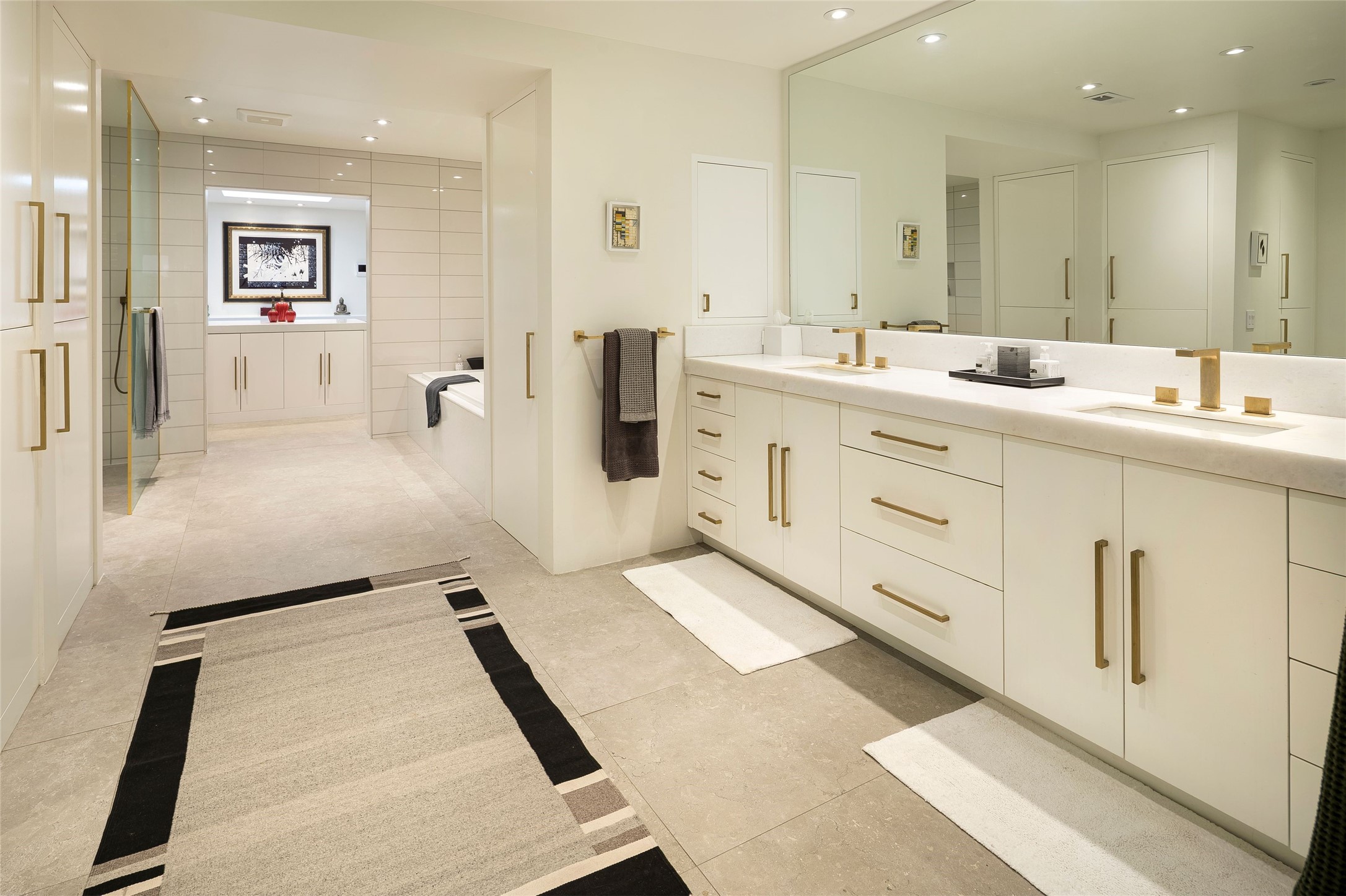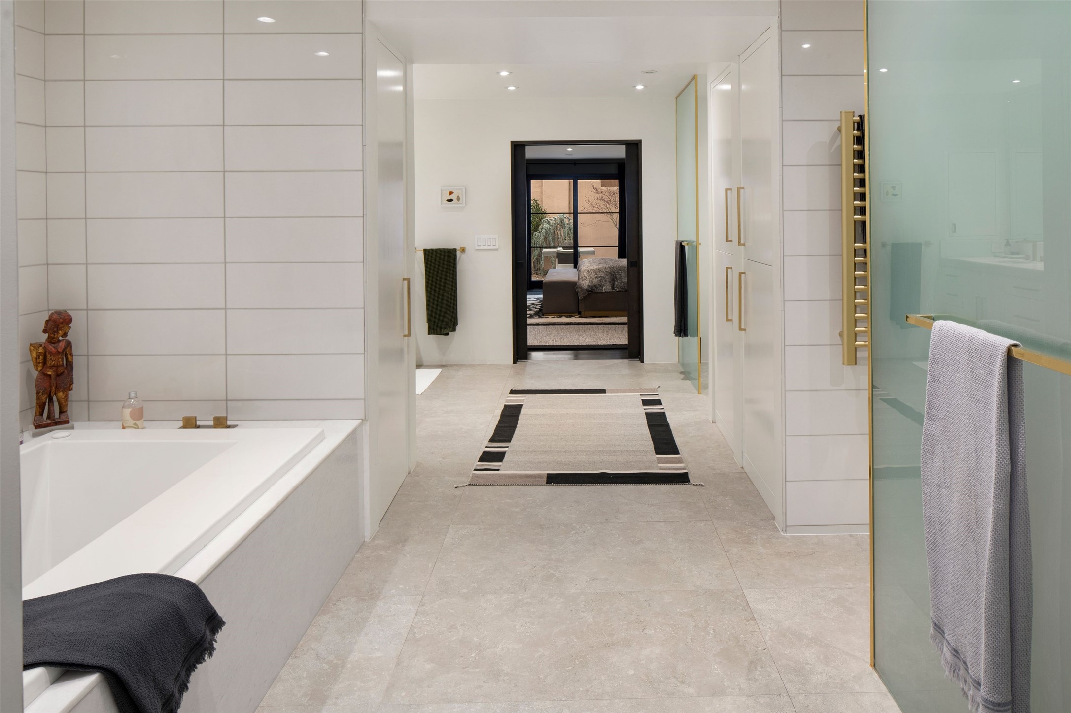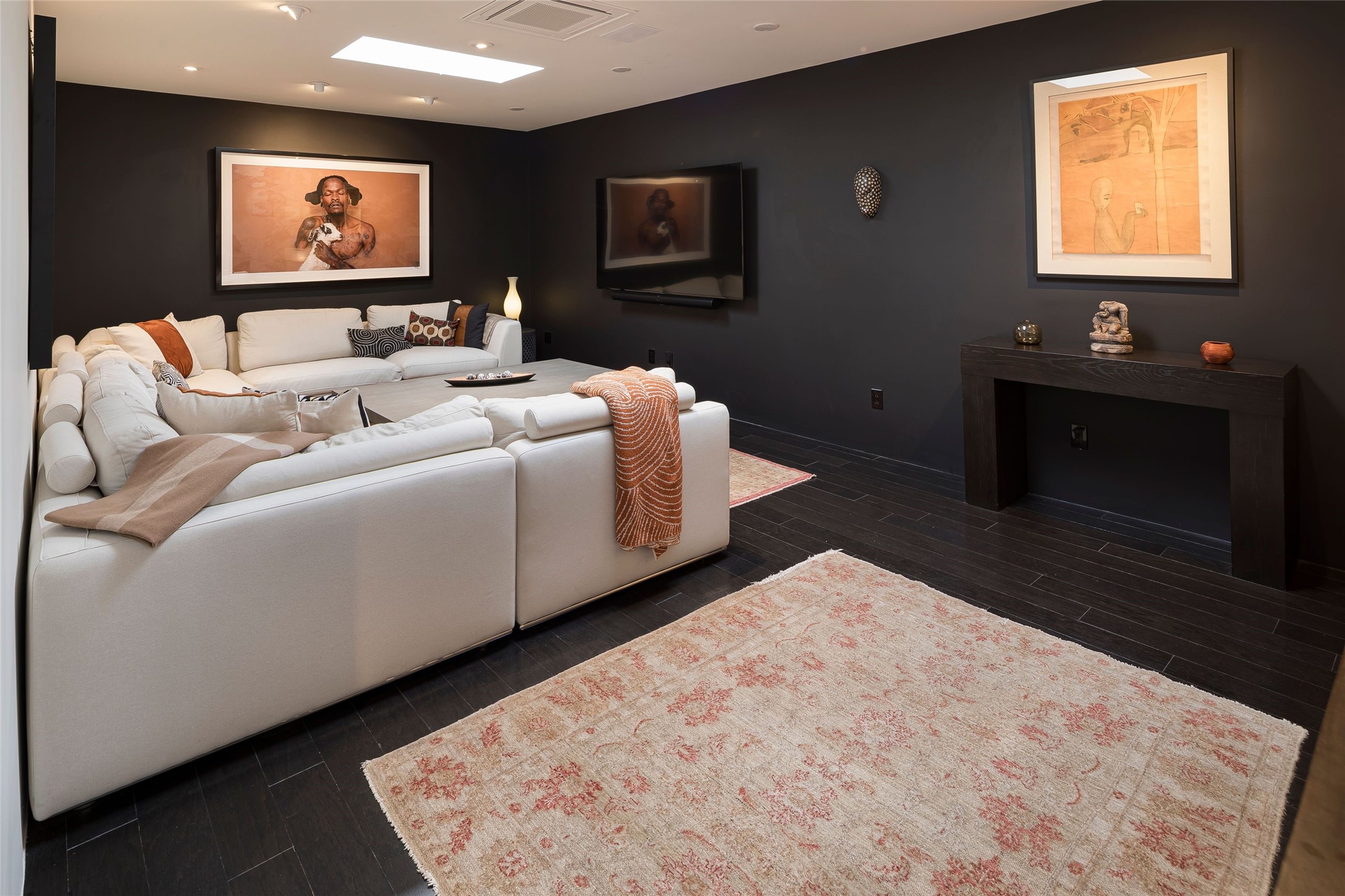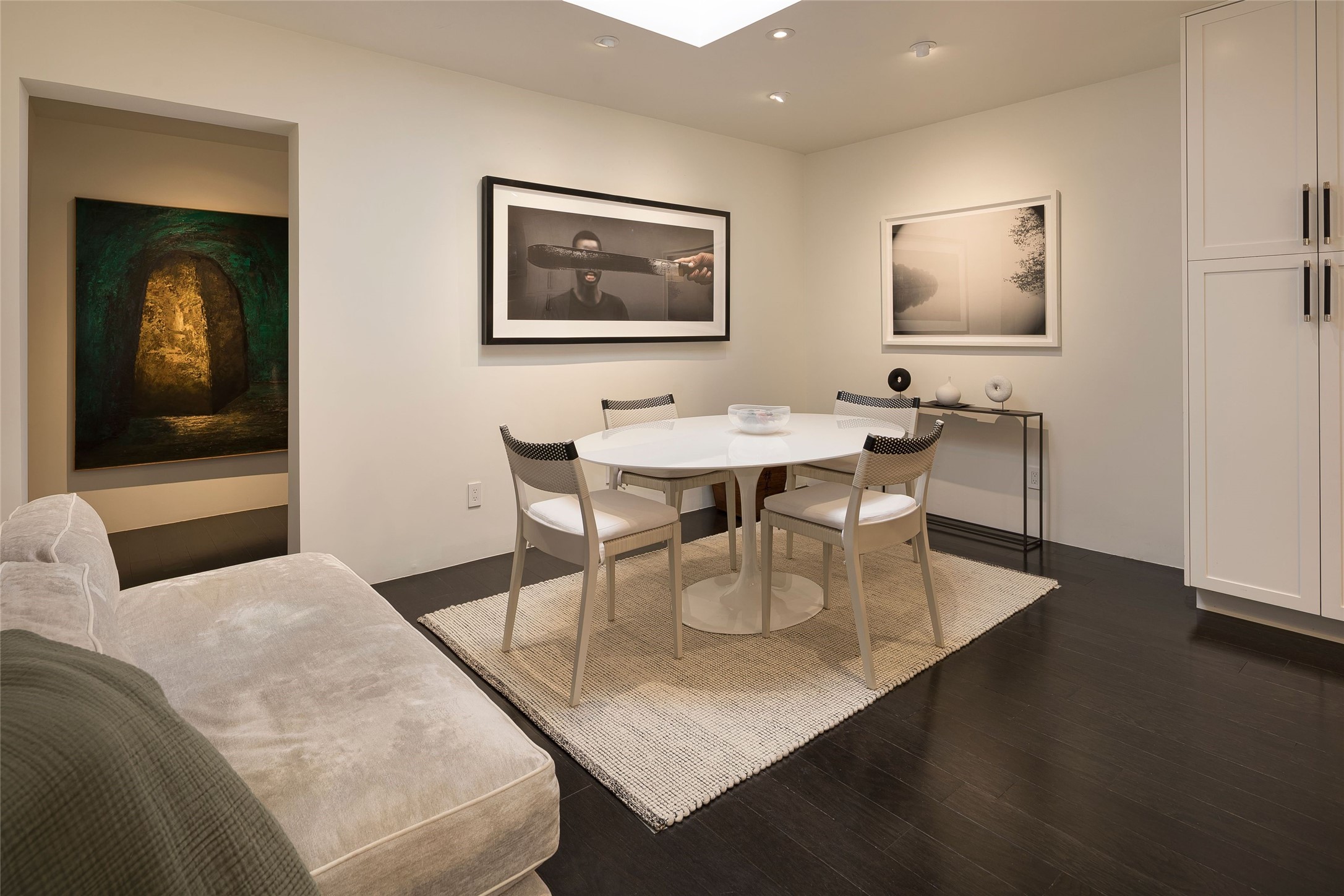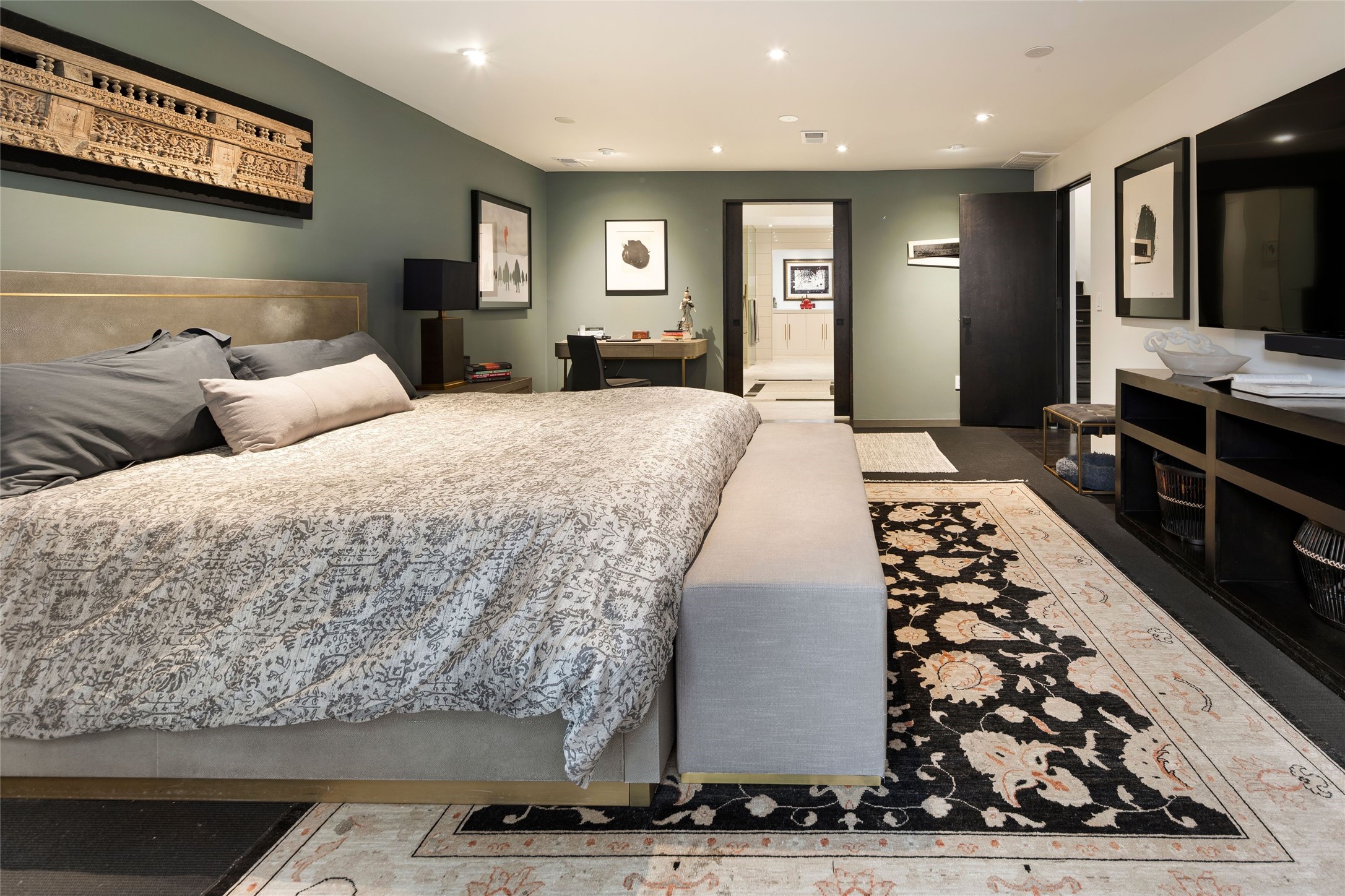 Exquisite Los Miradores 4-bedroom, 4.5-bath condo, where modern elegance meets artistic finesse. This stunning residence was reimagined and remodeled in 2020-2021, showcasing a balanced blend of wood, steel, glass, and stone that appeals to the most discerning tastes. As you enter, you'll be greeted by an impressive entry gallery with a clerestory window that bathes the space in natural light. The formal dining room, complemented by a wet bar, invites you to host dinner parties and soirees. Two-story grand living room includes sliding glass doors flanked by sidelights connecting to an entertainment patio complete with a gas fire pit and a contemporary steel pergola, ideal for alfresco dining under the New Mexican skies. Deluxe gourmet kitchen, featuring custom cabinetry, elegant quartz countertops, and top-of-the-line appliances, including a Wolf six-burner cooktop with griddle, Wolf wall oven, and Sub-Zero side-by-side refrigerator/freezer. Expansive center island and large breakfast area make this kitchen a culinary gathering area. The luxurious owner's suite, designed as a private sanctuary with a spa-like bath promises relaxation and tranquility. A guest suite is conveniently located on the ground floor, alongside a dedicated office and media room. Upper level, with two additional suites, each with en-suite baths, provide privacy for family or guests. High-walled patios and beautifully landscaped gardens. An oversized two-car garage ensures ample space for your vehicles and storage needs. The gated community of Los Miradores offers many amenities, including a seasonal pool, workout facility, tennis court and security patrol.
