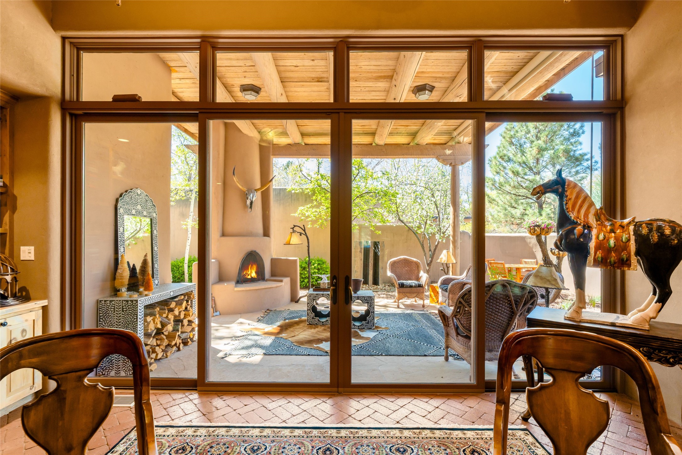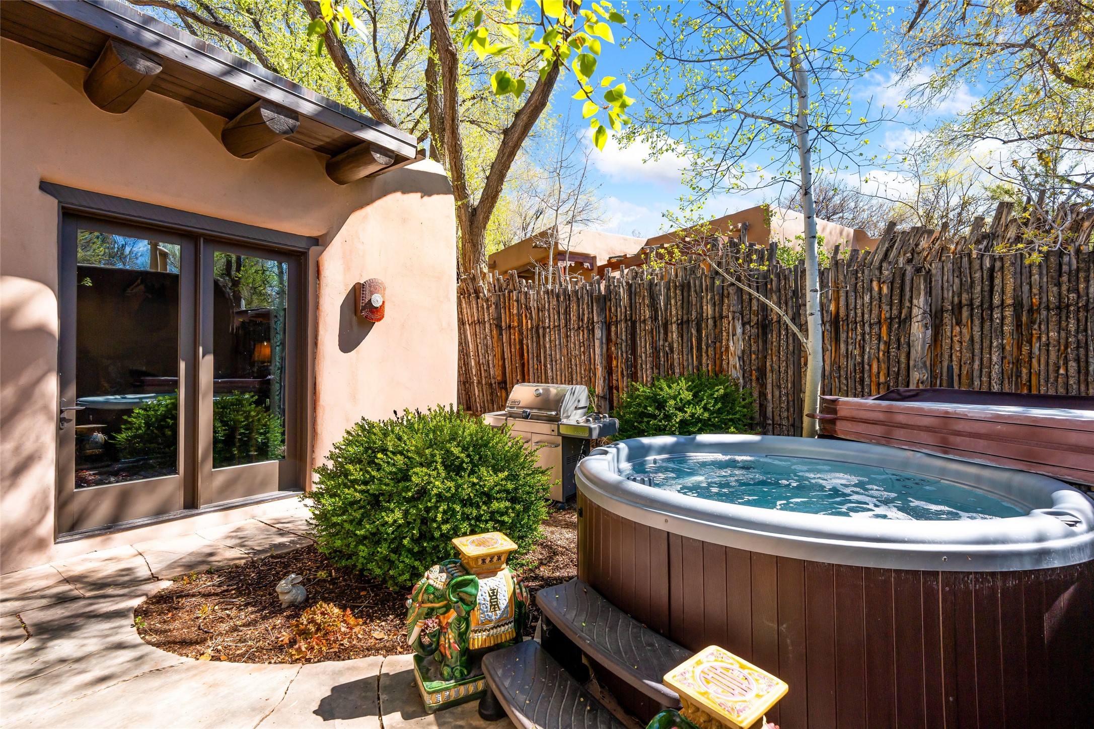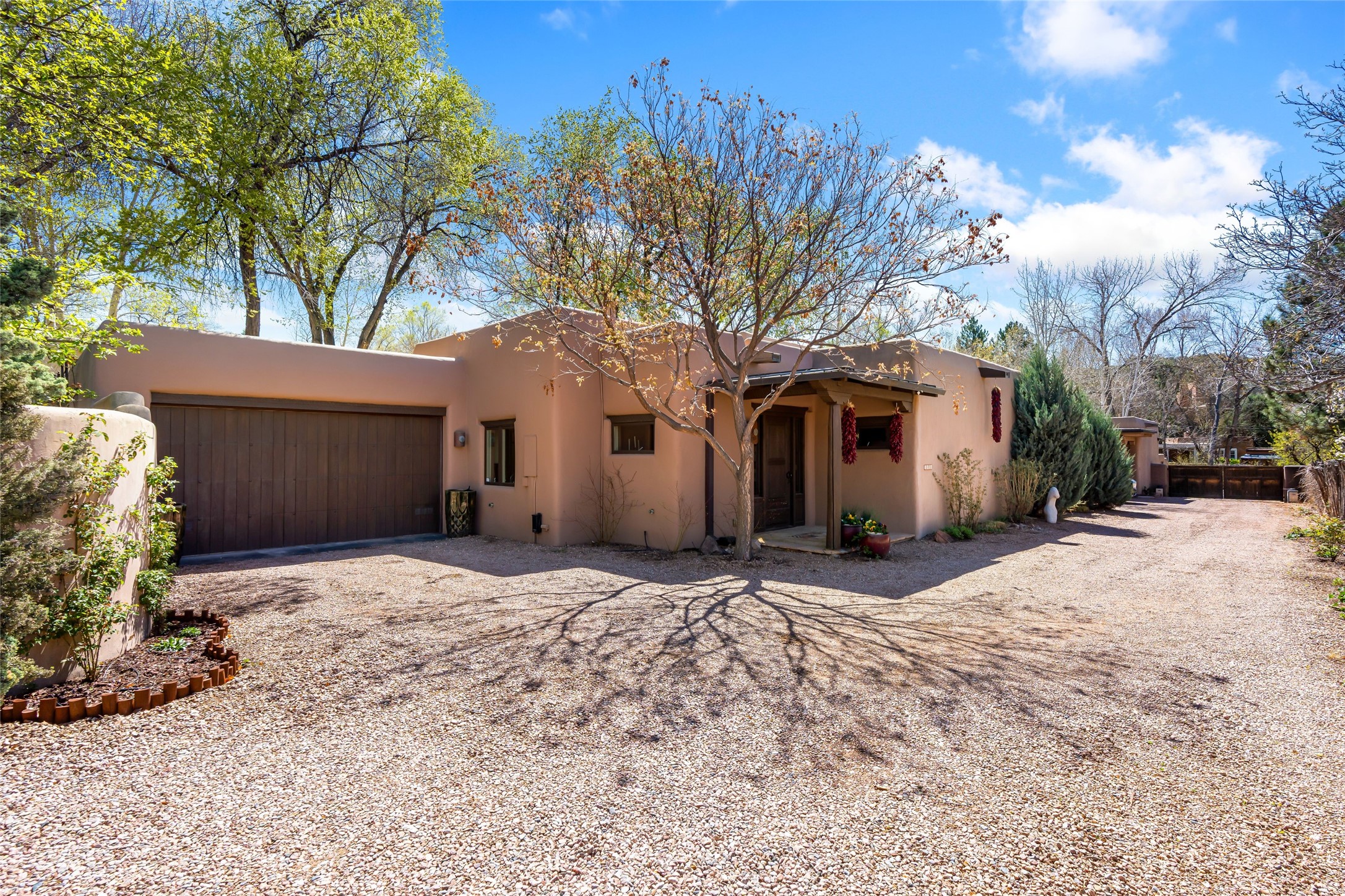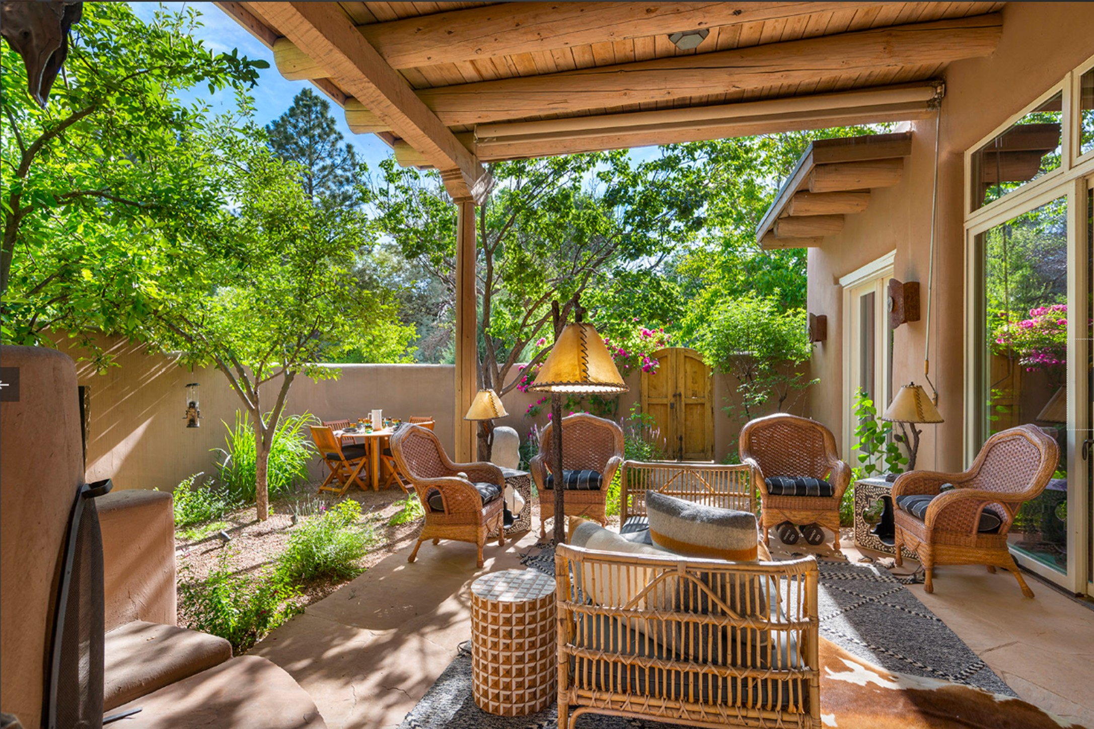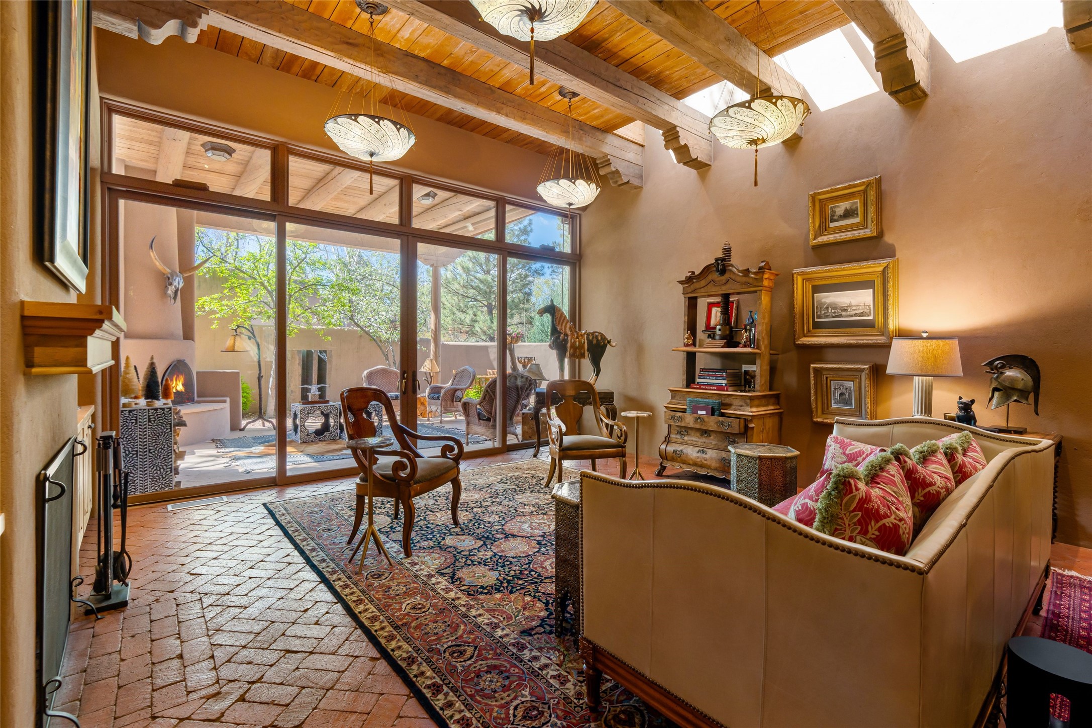 Reminiscent of Old World charm, this Eastside Santa Fe property is situated in a private, gated and quiet location close to Canyon Road, Patrick Smith Park, and the Camino Pequeno river walk. Comprising 2,133 sq.ft., a single-story adobe and frame constructed home was designed by John Midyette and built by Philip Coombs in 2005, and is adorned with brick floors, high ceilings, antique beams, hand-carved doors, and traditional plastered walls. Completely surrounded by seasonal landscaping, an outdoor water feature, a bubbling hot tub and privacy walls, the outdoors becomes an additionalsumptuous living and entertaining area. The primary suite has a wood burning kiva fireplace with a large spa-like bathroom mirroring the greenery from the outdoors. A secondary bedroom suite is separated from the primary suite with its own private outdoor access. A third bedroom is currently being used as a family room. A powder room is near the living area. The open-concept kitchen/living/formal dining area has a wood burning fireplace and is flooded in ambient natural light with a wall of glass tempting one to step into the deep covered portal flanked by another kiva fireplace. The cook'skitchen is accented by white limestone countertops, light custom cabinets and upscale appliances. There is a direct access 2-car garage with additional parking in front of the garage. New forced air heating/AC, tankless water heater, whole home water filtration, and smart water monitor with auto shut-off valve systems are in place. This lovingly maintained property is a timeless reflection of one looking to experience a refined and sophisticated lifestyle.