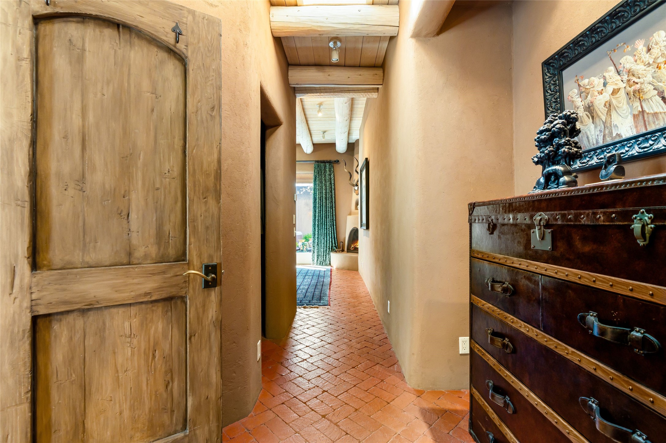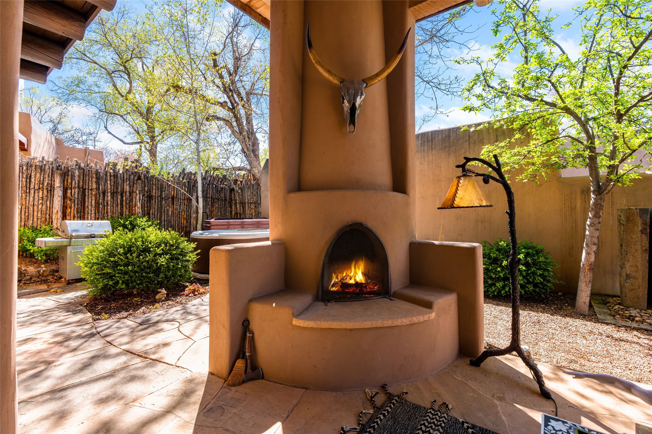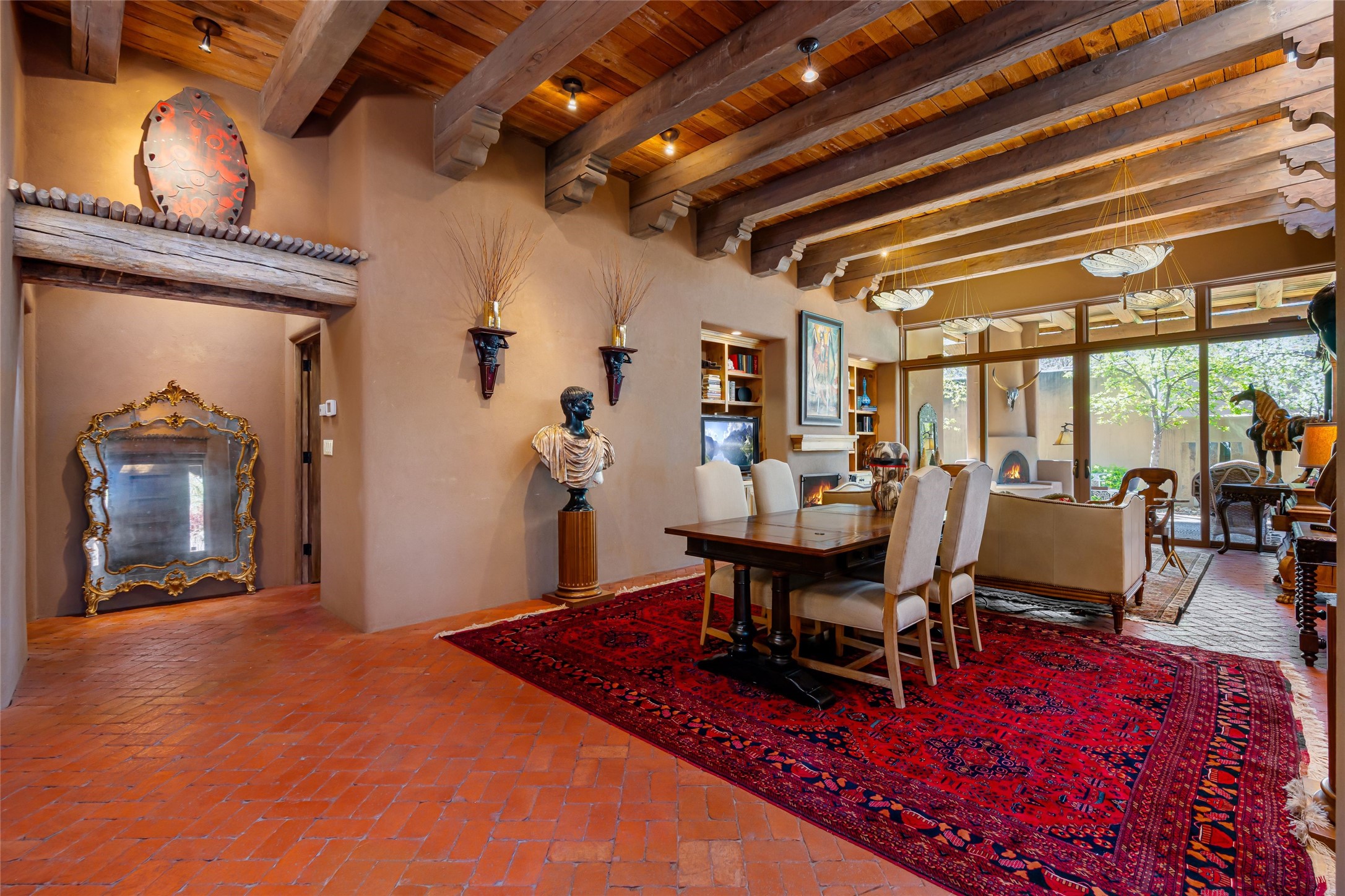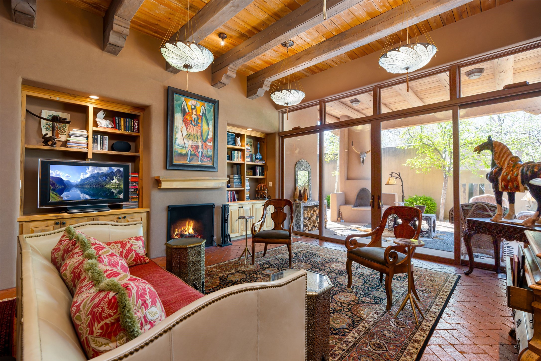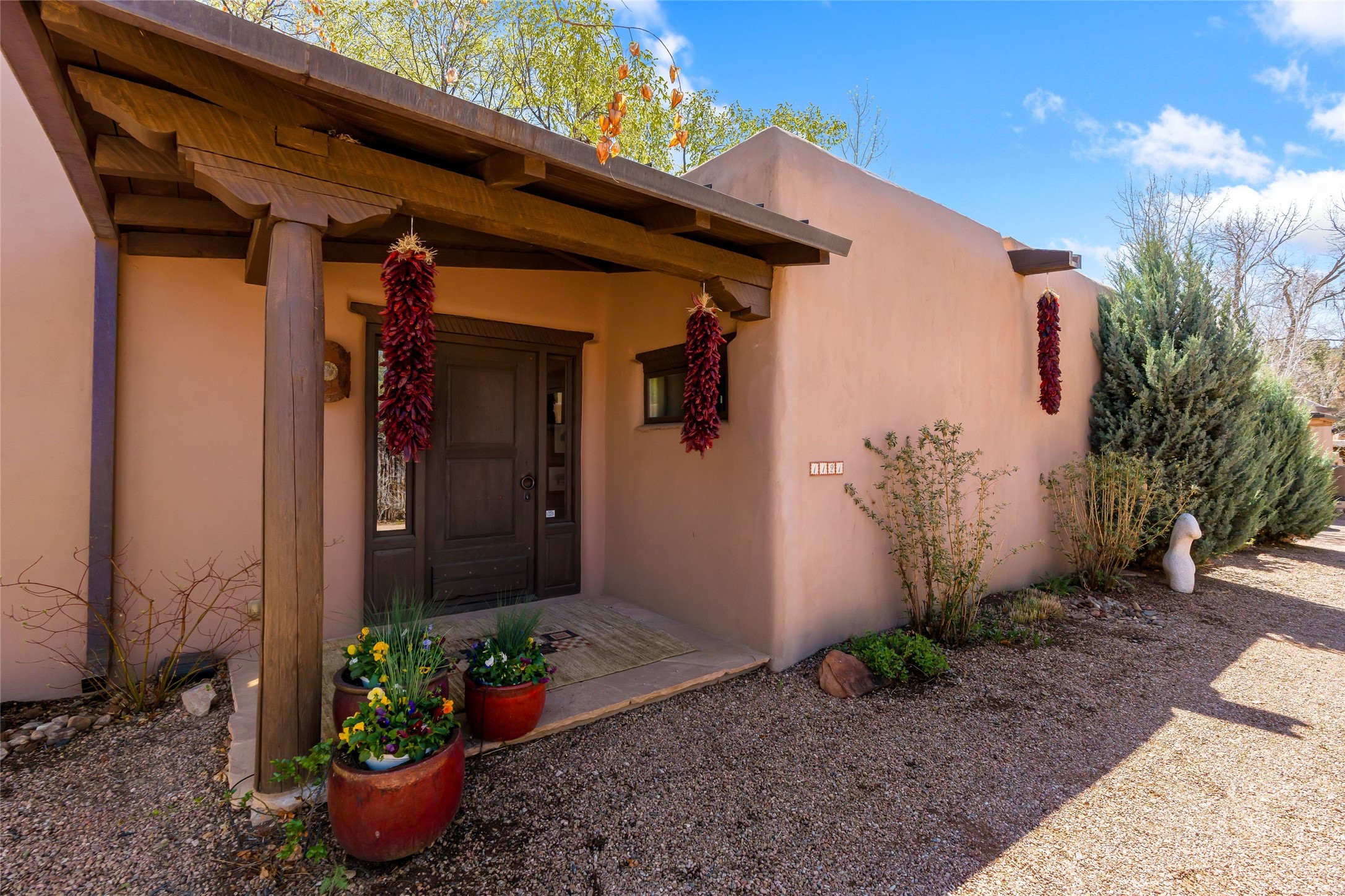 Reminiscent of Old World charm, this Eastside Santa Fe property is situated in a private, gated and quiet location close to Canyon Road, Patrick Smith Park, and the Camino Pequeno river walk. Comprising 2,133 sq.ft., a single-story adobe and frame constructed home was designed by John Midyette and built by Philip Coombs in 2005, and is adorned with brick floors, high ceilings, antique beams, hand-carved doors, and traditional plastered walls. Completely surrounded by seasonal landscaping, an outdoor water feature, a bubbling hot tub and privacy walls, the outdoors becomes an additionalsumptuous living and entertaining area. The primary suite has a wood burning kiva fireplace with a large spa-like bathroom mirroring the greenery from the outdoors. A secondary bedroom suite is separated from the primary suite with its own private outdoor access. A third bedroom is currently being used as a family room. A powder room is near the living area. The open-concept kitchen/living/formal dining area has a wood burning fireplace and is flooded in ambient natural light with a wall of glass tempting one to step into the deep covered portal flanked by another kiva fireplace. The cook'skitchen is accented by white limestone countertops, light custom cabinets and upscale appliances. There is a direct access 2-car garage with additional parking in front of the garage. New forced air heating/AC, tankless water heater, whole home water filtration, and smart water monitor with auto shut-off valve systems are in place. This lovingly maintained property is a timeless reflection of one looking to experience a refined and sophisticated lifestyle.