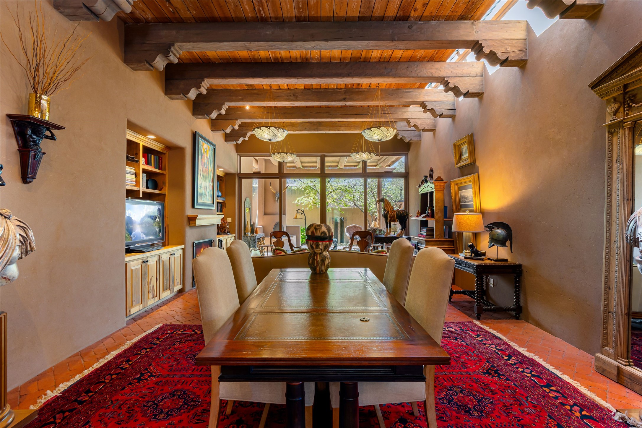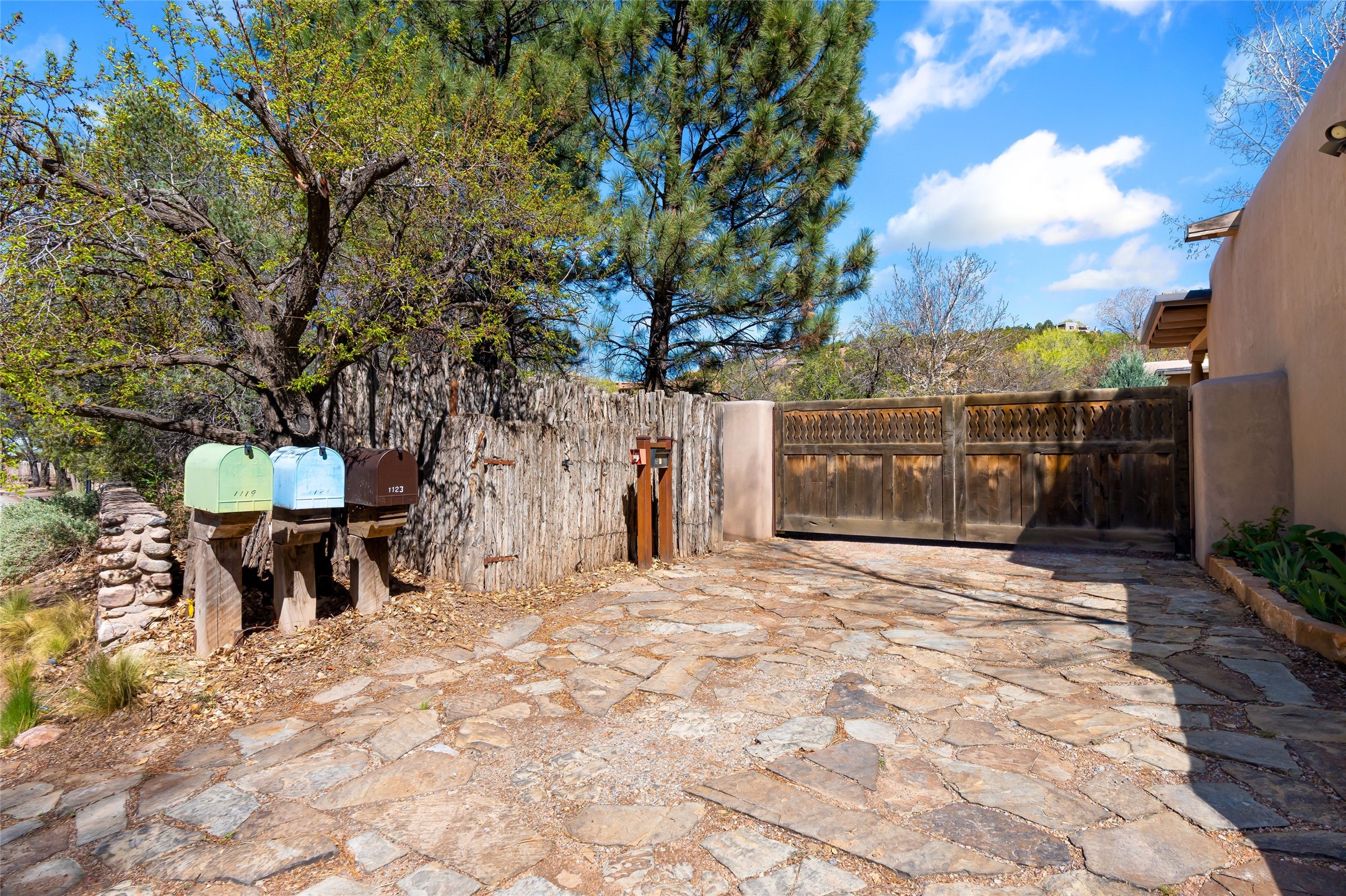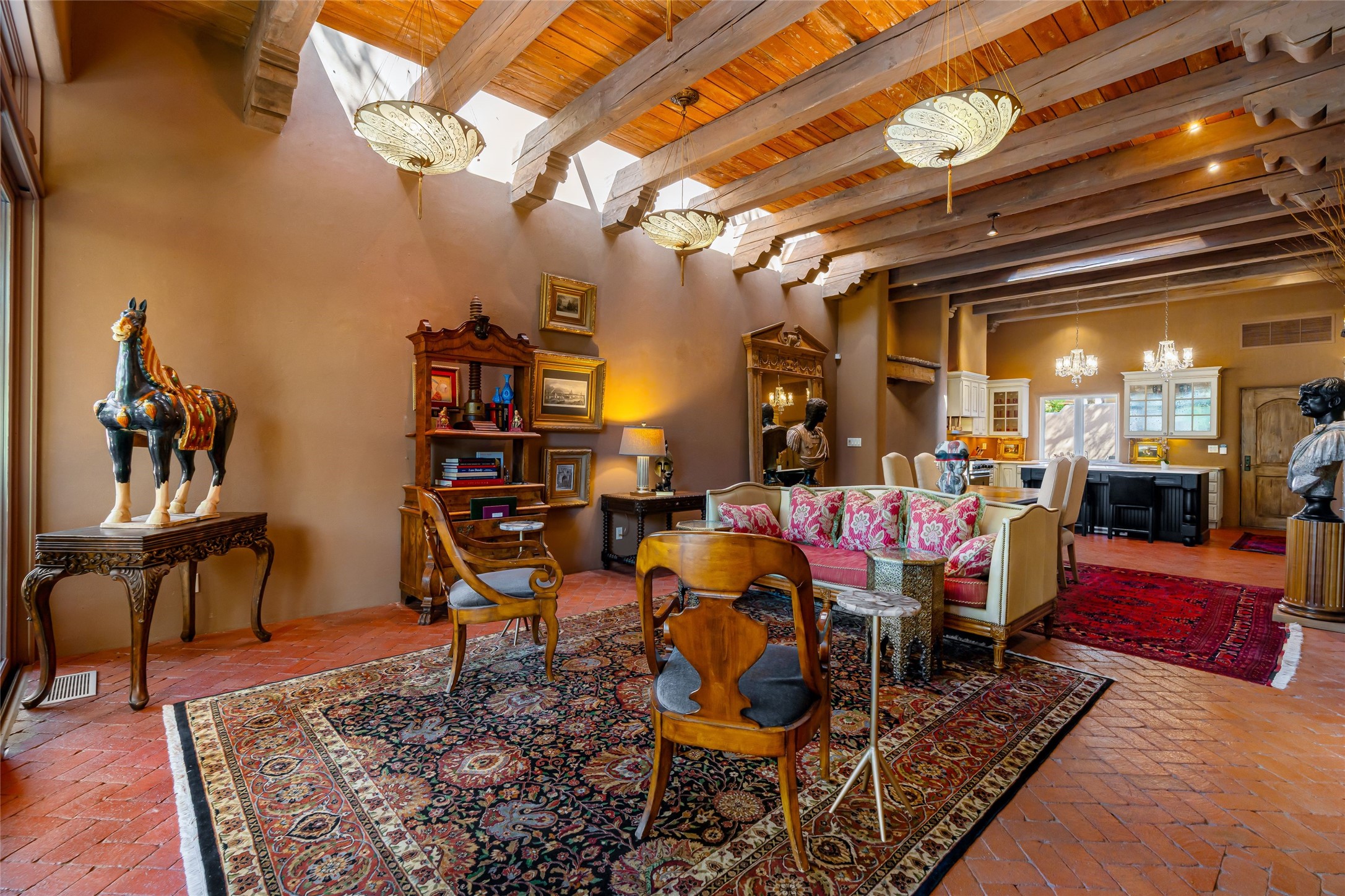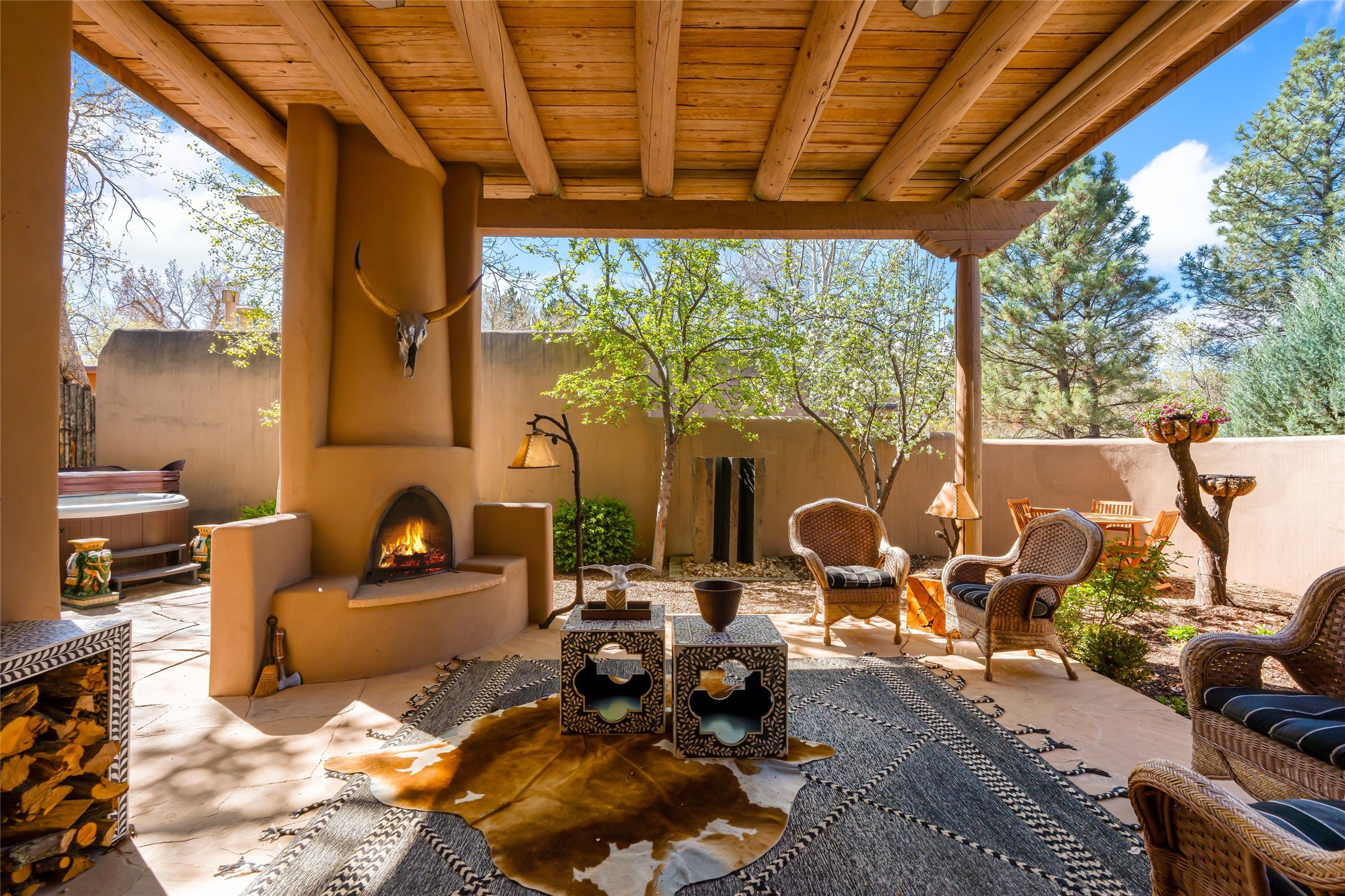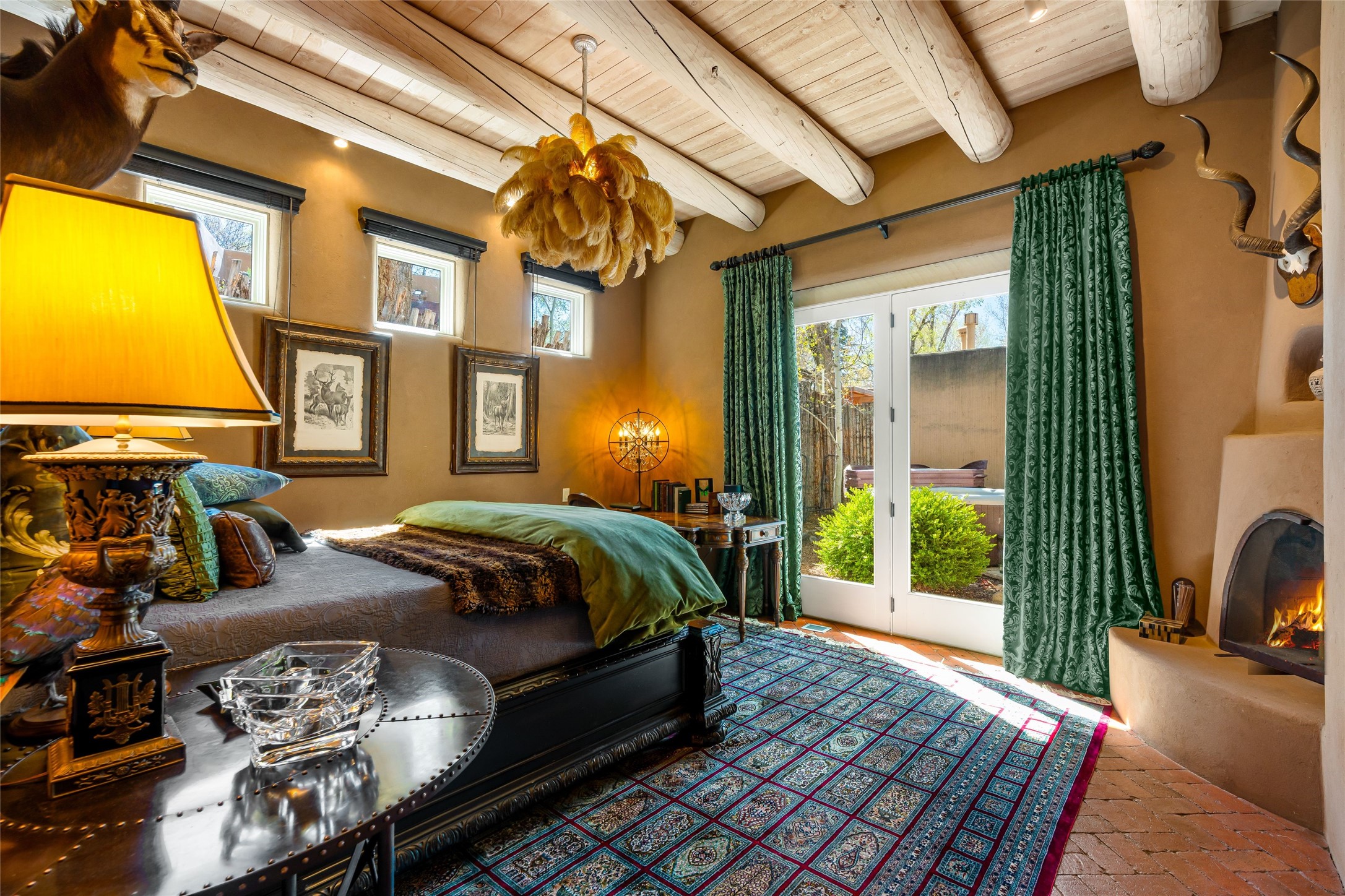 Reminiscent of Old World charm, this Eastside Santa Fe property is situated in a private, gated and quiet location close to Canyon Road, Patrick Smith Park, and the Camino Pequeno river walk. Comprising 2,133 sq.ft., a single-story adobe and frame constructed home was designed by John Midyette and built by Philip Coombs in 2005, and is adorned with brick floors, high ceilings, antique beams, hand-carved doors, and traditional plastered walls. Completely surrounded by seasonal landscaping, an outdoor water feature, a bubbling hot tub and privacy walls, the outdoors becomes an additionalsumptuous living and entertaining area. The primary suite has a wood burning kiva fireplace with a large spa-like bathroom mirroring the greenery from the outdoors. A secondary bedroom suite is separated from the primary suite with its own private outdoor access. A third bedroom is currently being used as a family room. A powder room is near the living area. The open-concept kitchen/living/formal dining area has a wood burning fireplace and is flooded in ambient natural light with a wall of glass tempting one to step into the deep covered portal flanked by another kiva fireplace. The cook'skitchen is accented by white limestone countertops, light custom cabinets and upscale appliances. There is a direct access 2-car garage with additional parking in front of the garage. New forced air heating/AC, tankless water heater, whole home water filtration, and smart water monitor with auto shut-off valve systems are in place. This lovingly maintained property is a timeless reflection of one looking to experience a refined and sophisticated lifestyle.