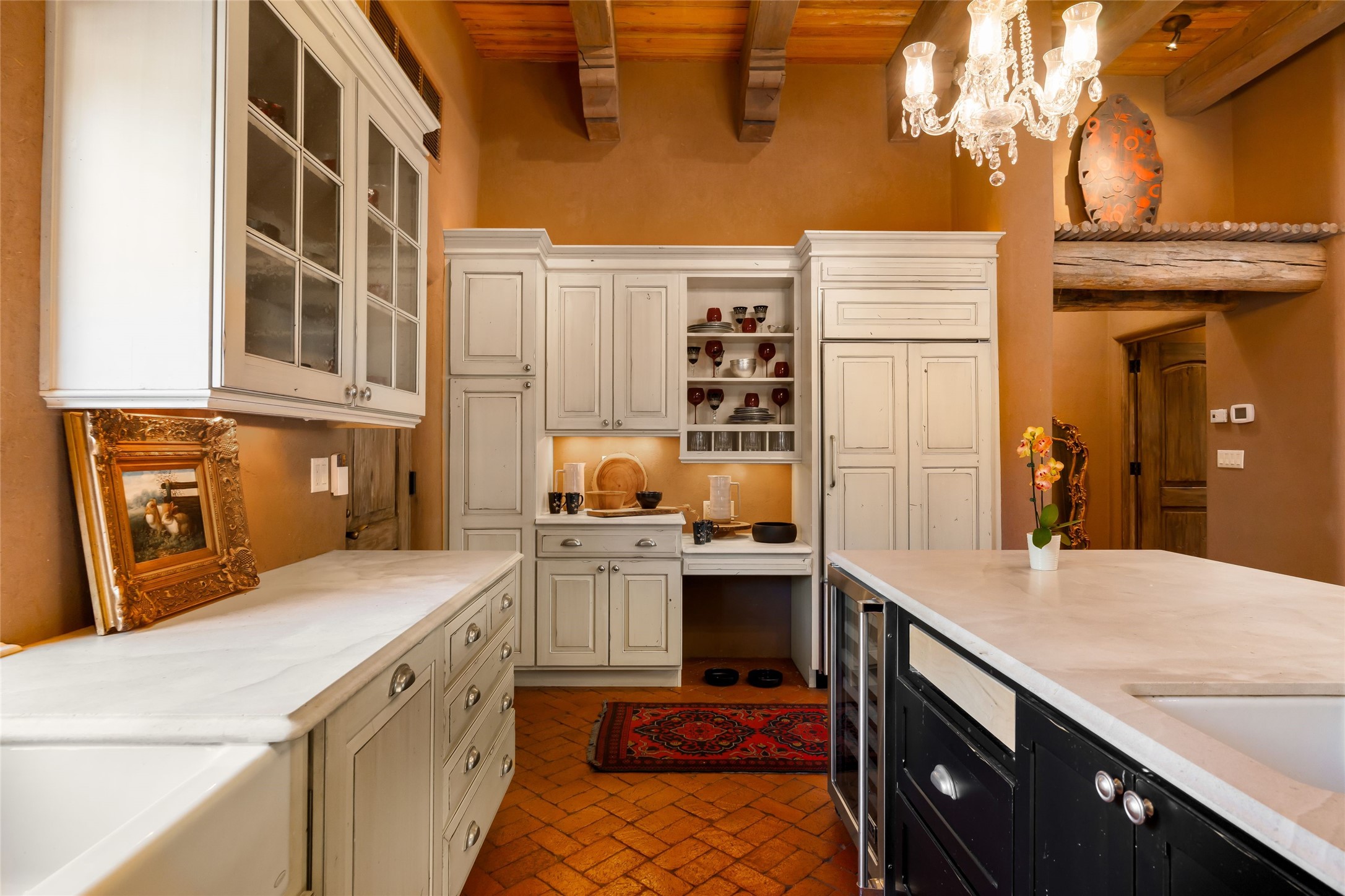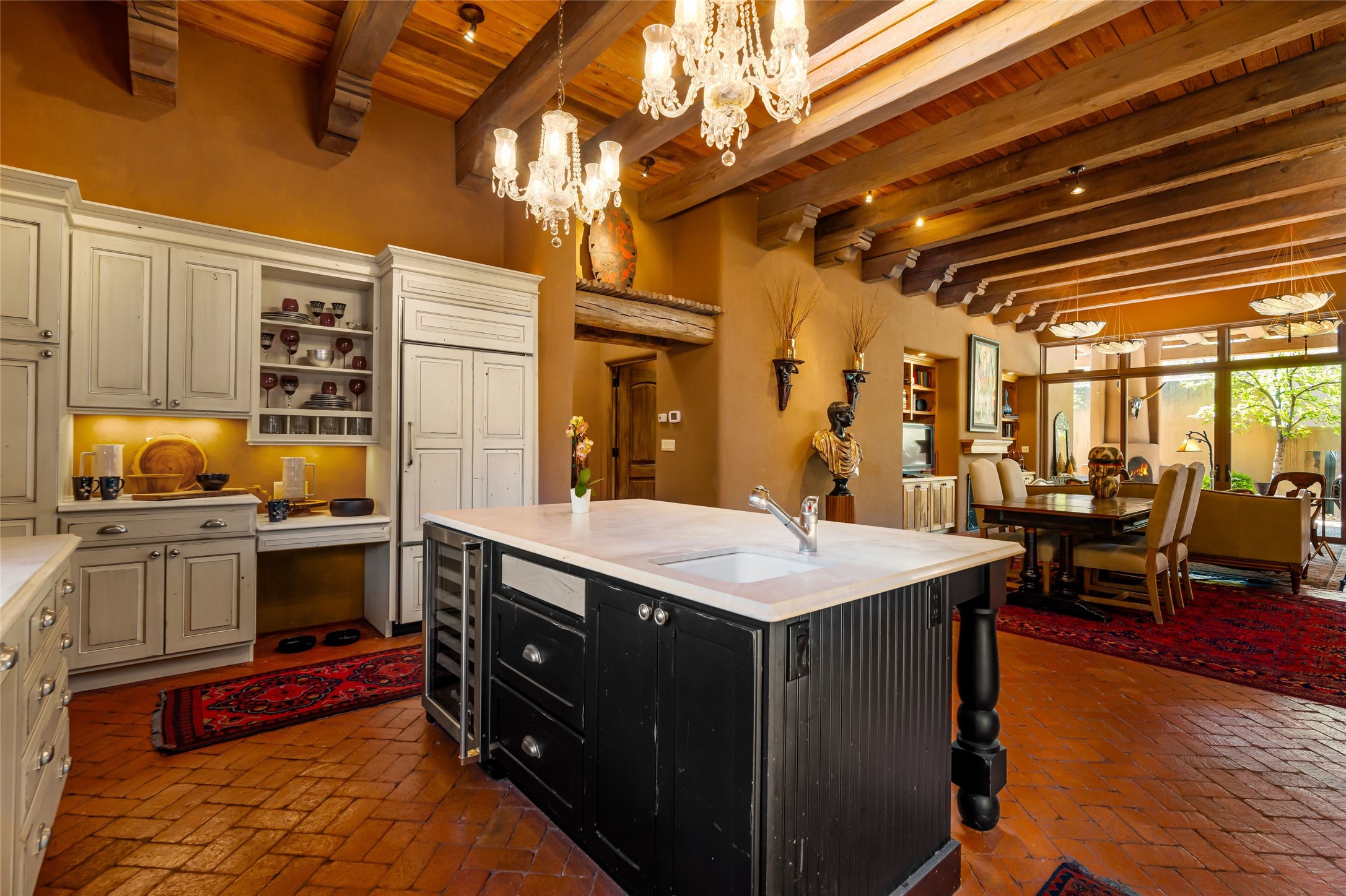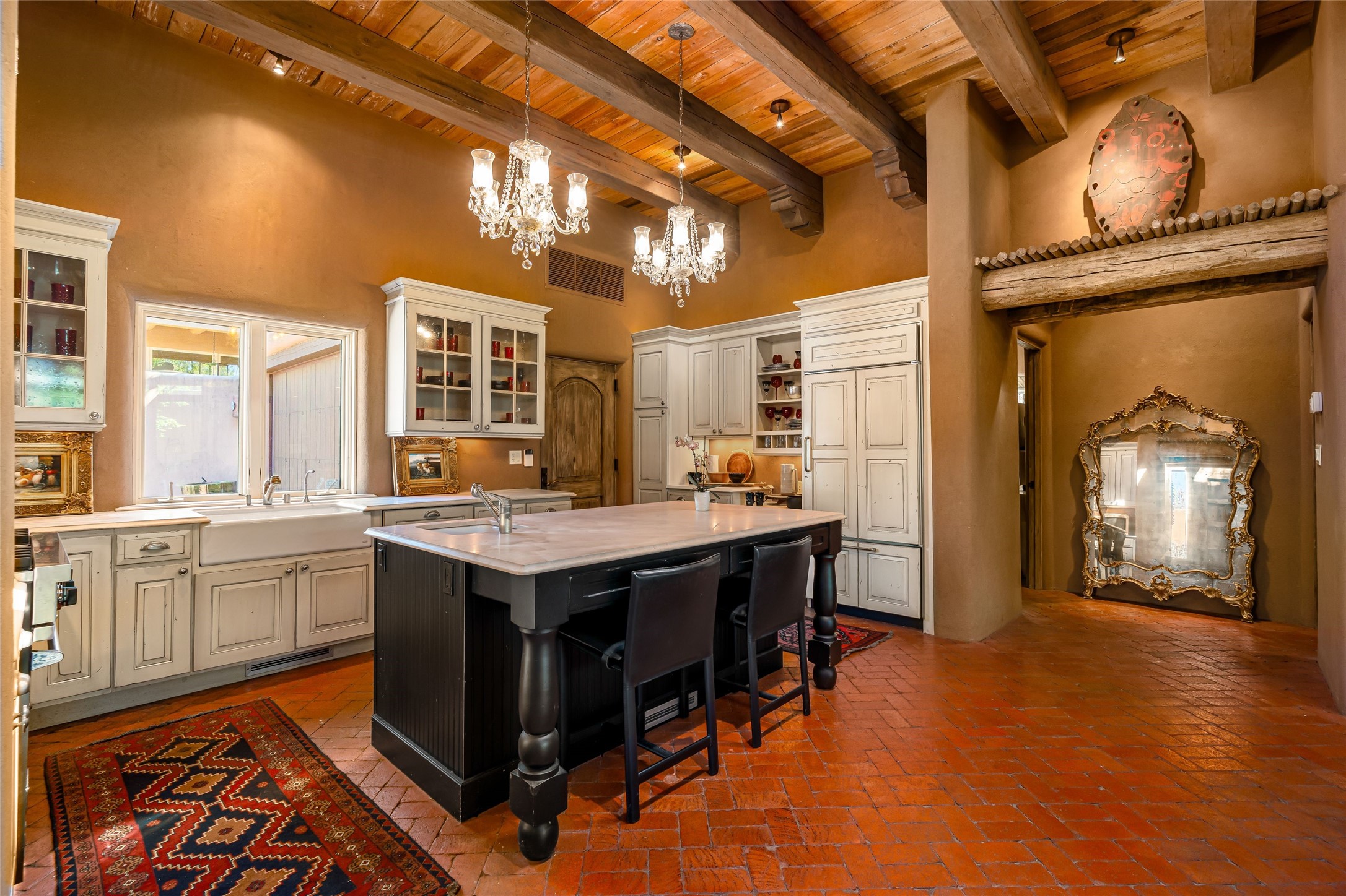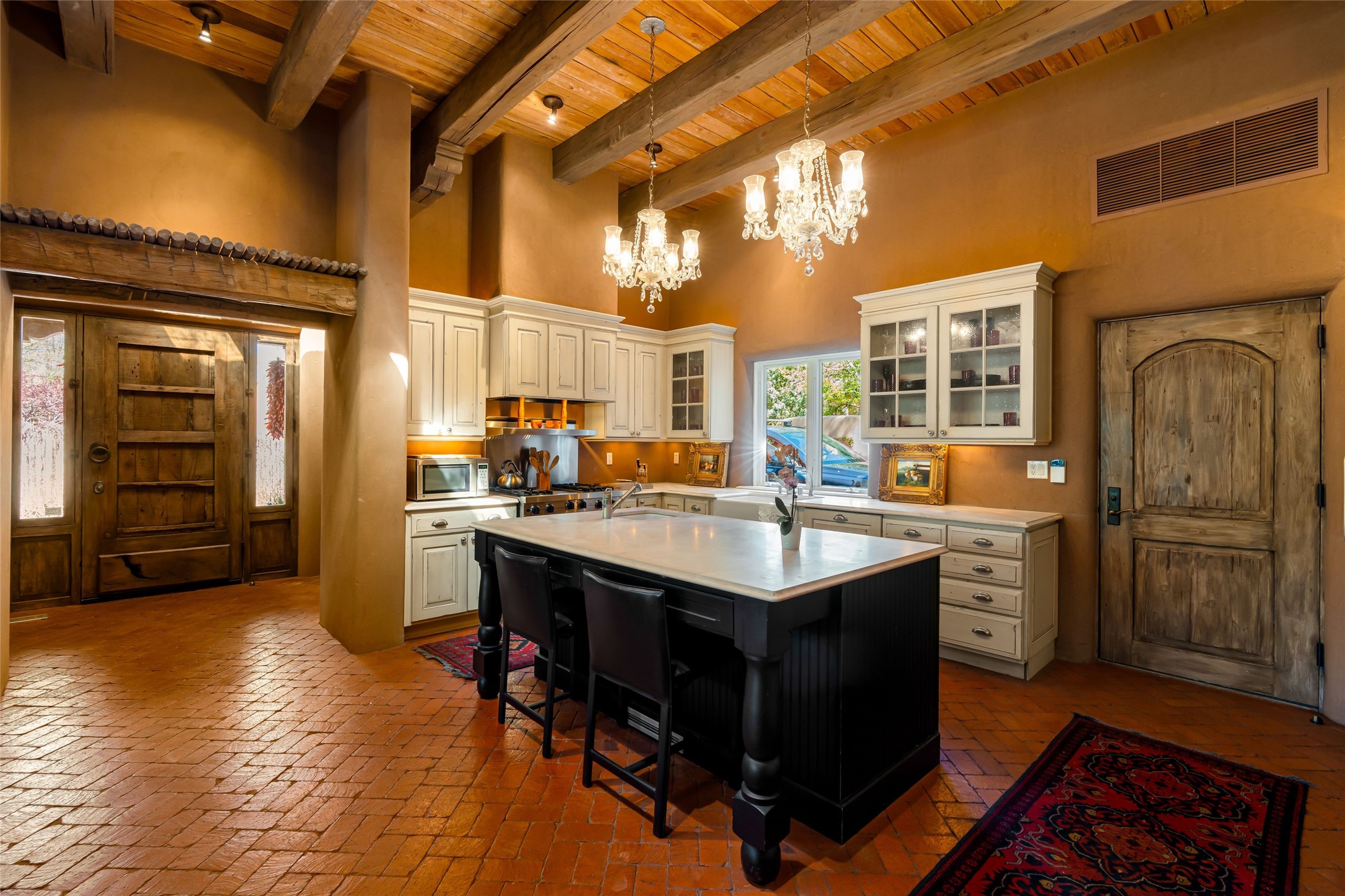 Reminiscent of Old World charm, this Eastside Santa Fe property is situated in a private, gated and quiet location close to Canyon Road, Patrick Smith Park, and the Camino Pequeno river walk. Comprising 2,133 sq.ft., a single-story adobe and frame constructed home was designed by John Midyette and built by Philip Coombs in 2005, and is adorned with brick floors, high ceilings, antique beams, hand-carved doors, and traditional plastered walls. Completely surrounded by seasonal landscaping, an outdoor water feature, a bubbling hot tub and privacy walls, the outdoors becomes an additionalsumptuous living and entertaining area. The primary suite has a wood burning kiva fireplace with a large spa-like bathroom mirroring the greenery from the outdoors. A secondary bedroom suite is separated from the primary suite with its own private outdoor access. A third bedroom is currently being used as a family room. A powder room is near the living area. The open-concept kitchen/living/formal dining area has a wood burning fireplace and is flooded in ambient natural light with a wall of glass tempting one to step into the deep covered portal flanked by another kiva fireplace. The cook'skitchen is accented by white limestone countertops, light custom cabinets and upscale appliances. There is a direct access 2-car garage with additional parking in front of the garage. New forced air heating/AC, tankless water heater, whole home water filtration, and smart water monitor with auto shut-off valve systems are in place. This lovingly maintained property is a timeless reflection of one looking to experience a refined and sophisticated lifestyle.