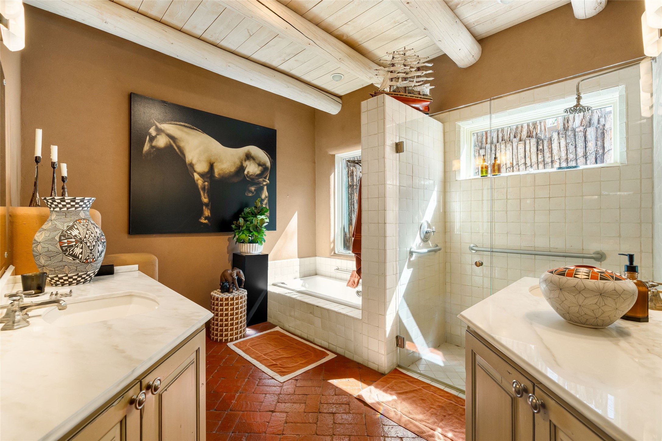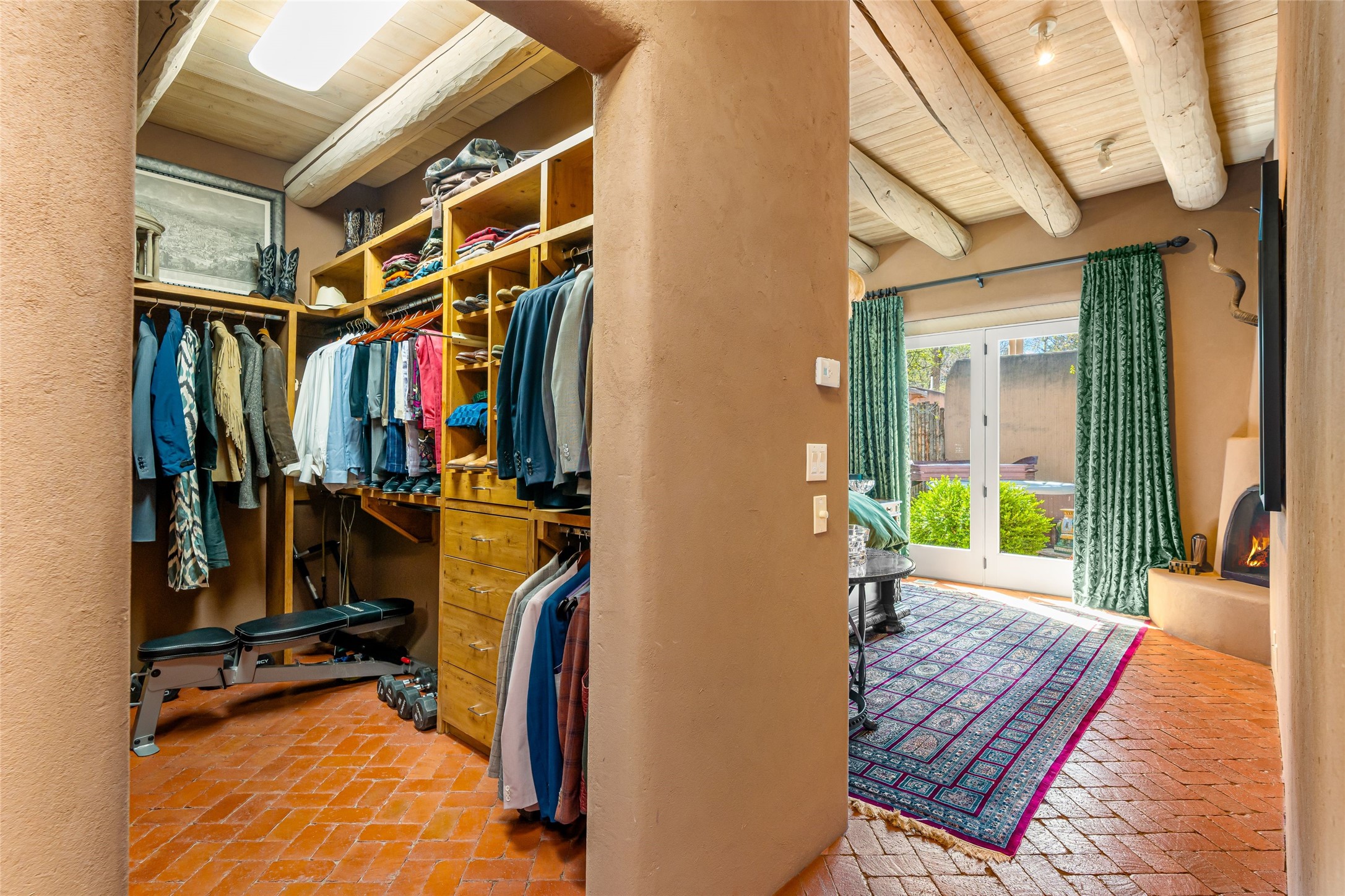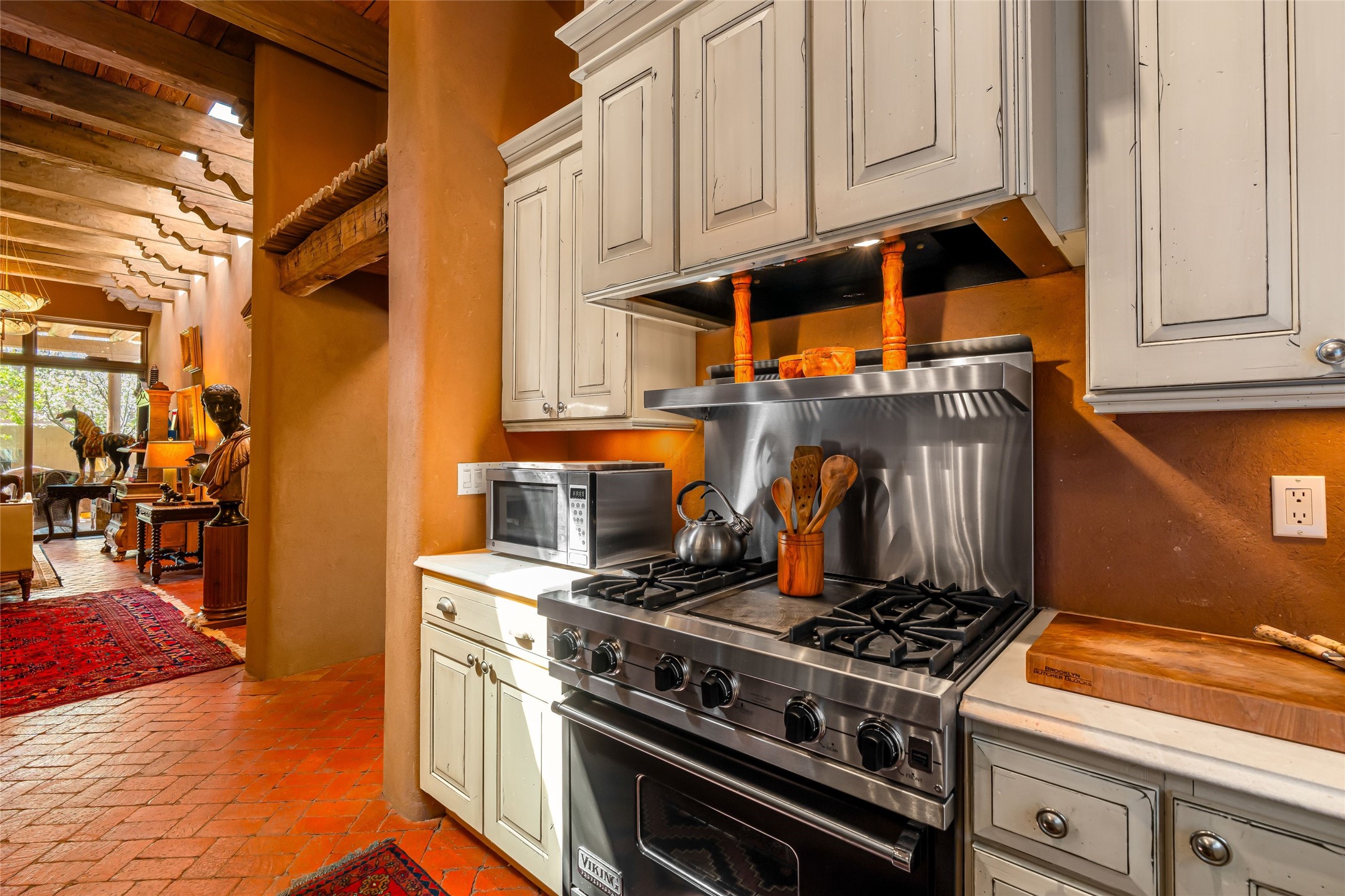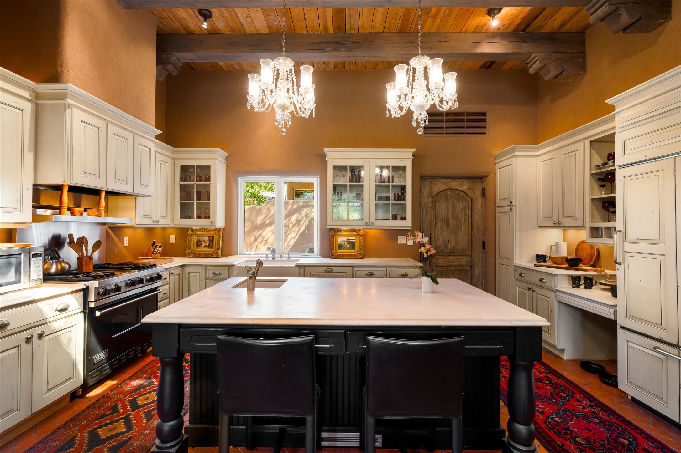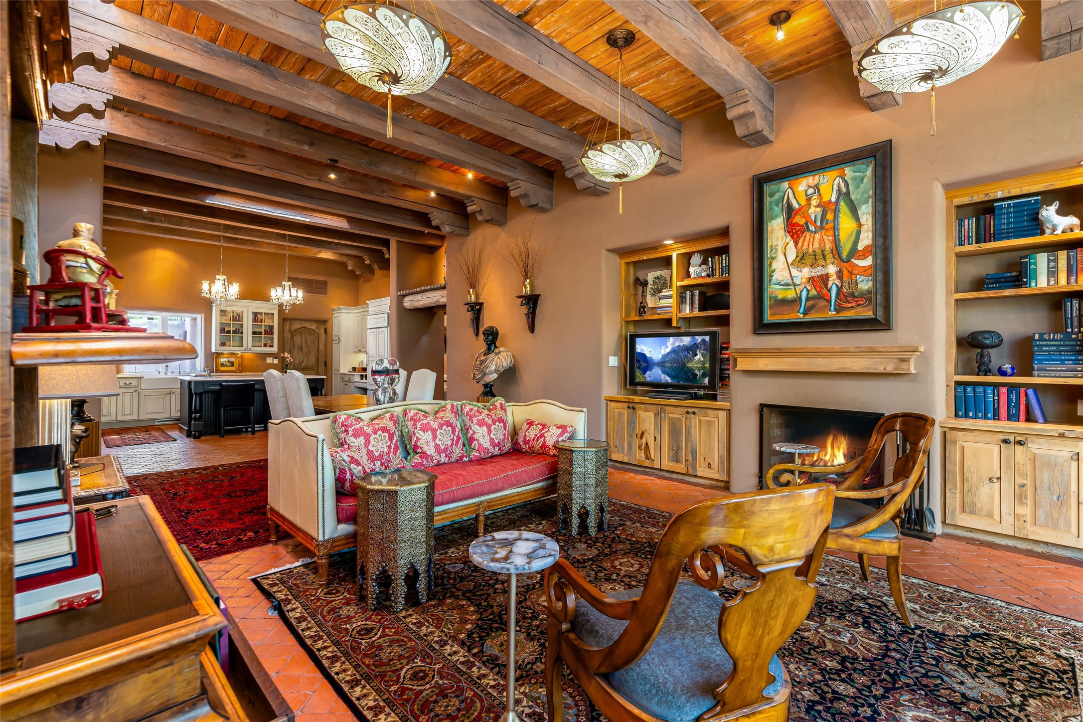 Reminiscent of Old World charm, this Eastside Santa Fe property is situated in a private, gated and quiet location close to Canyon Road, Patrick Smith Park, and the Camino Pequeno river walk. Comprising 2,133 sq.ft., a single-story adobe and frame constructed home was designed by John Midyette and built by Philip Coombs in 2005, and is adorned with brick floors, high ceilings, antique beams, hand-carved doors, and traditional plastered walls. Completely surrounded by seasonal landscaping, an outdoor water feature, a bubbling hot tub and privacy walls, the outdoors becomes an additionalsumptuous living and entertaining area. The primary suite has a wood burning kiva fireplace with a large spa-like bathroom mirroring the greenery from the outdoors. A secondary bedroom suite is separated from the primary suite with its own private outdoor access. A third bedroom is currently being used as a family room. A powder room is near the living area. The open-concept kitchen/living/formal dining area has a wood burning fireplace and is flooded in ambient natural light with a wall of glass tempting one to step into the deep covered portal flanked by another kiva fireplace. The cook'skitchen is accented by white limestone countertops, light custom cabinets and upscale appliances. There is a direct access 2-car garage with additional parking in front of the garage. New forced air heating/AC, tankless water heater, whole home water filtration, and smart water monitor with auto shut-off valve systems are in place. This lovingly maintained property is a timeless reflection of one looking to experience a refined and sophisticated lifestyle.