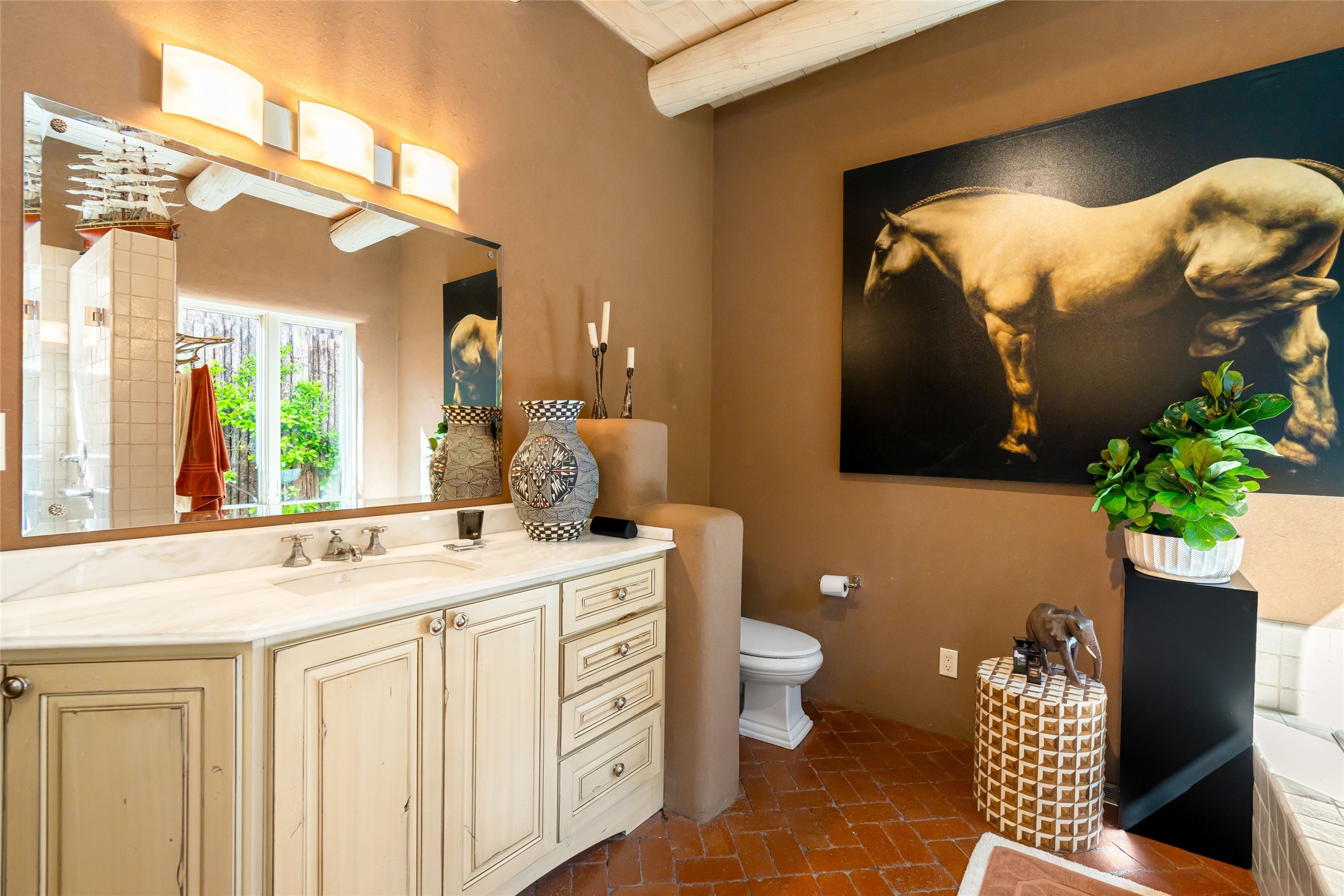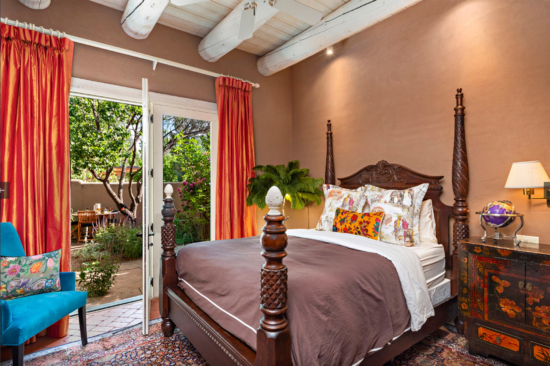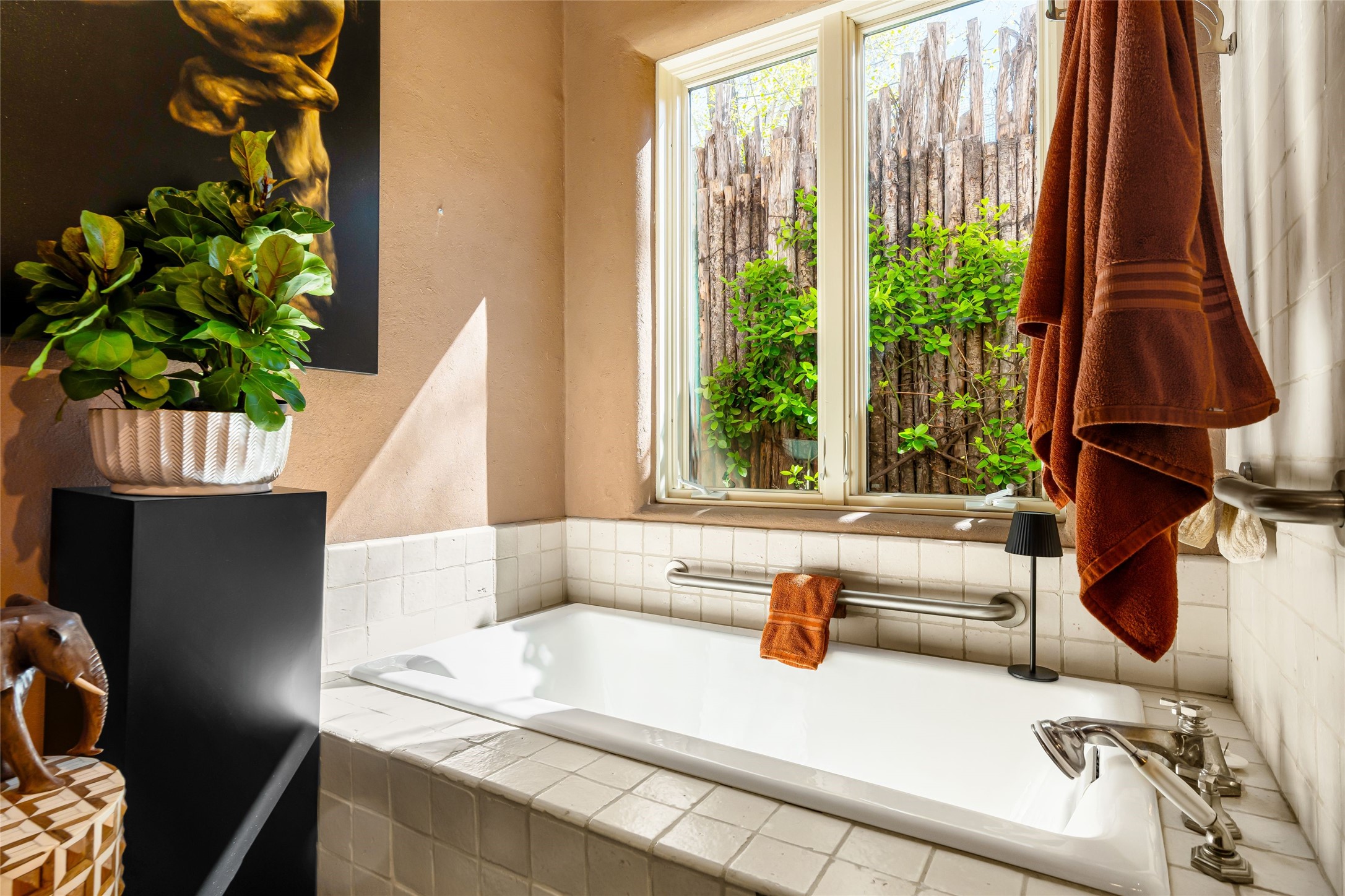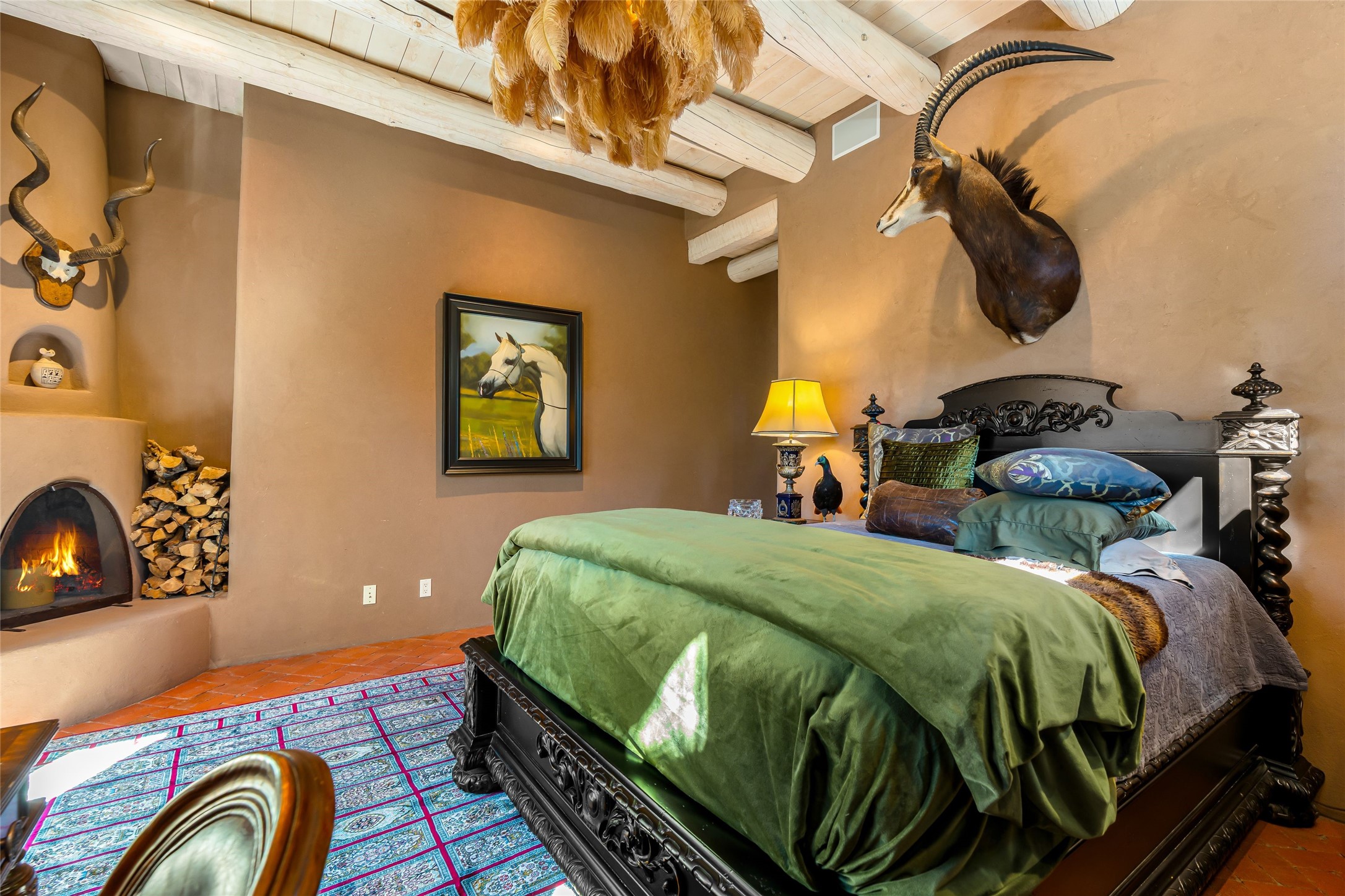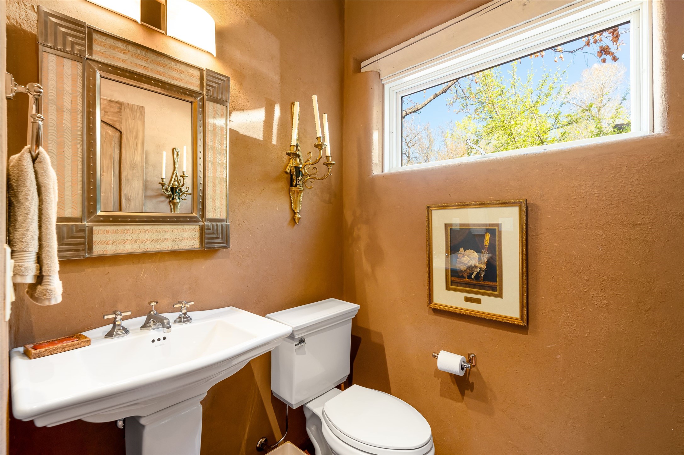 Reminiscent of Old World charm, this Eastside Santa Fe property is situated in a private, gated and quiet location close to Canyon Road, Patrick Smith Park, and the Camino Pequeno river walk. Comprising 2,133 sq.ft., a single-story adobe and frame constructed home was designed by John Midyette and built by Philip Coombs in 2005, and is adorned with brick floors, high ceilings, antique beams, hand-carved doors, and traditional plastered walls. Completely surrounded by seasonal landscaping, an outdoor water feature, a bubbling hot tub and privacy walls, the outdoors becomes an additionalsumptuous living and entertaining area. The primary suite has a wood burning kiva fireplace with a large spa-like bathroom mirroring the greenery from the outdoors. A secondary bedroom suite is separated from the primary suite with its own private outdoor access. A third bedroom is currently being used as a family room. A powder room is near the living area. The open-concept kitchen/living/formal dining area has a wood burning fireplace and is flooded in ambient natural light with a wall of glass tempting one to step into the deep covered portal flanked by another kiva fireplace. The cook'skitchen is accented by white limestone countertops, light custom cabinets and upscale appliances. There is a direct access 2-car garage with additional parking in front of the garage. New forced air heating/AC, tankless water heater, whole home water filtration, and smart water monitor with auto shut-off valve systems are in place. This lovingly maintained property is a timeless reflection of one looking to experience a refined and sophisticated lifestyle.