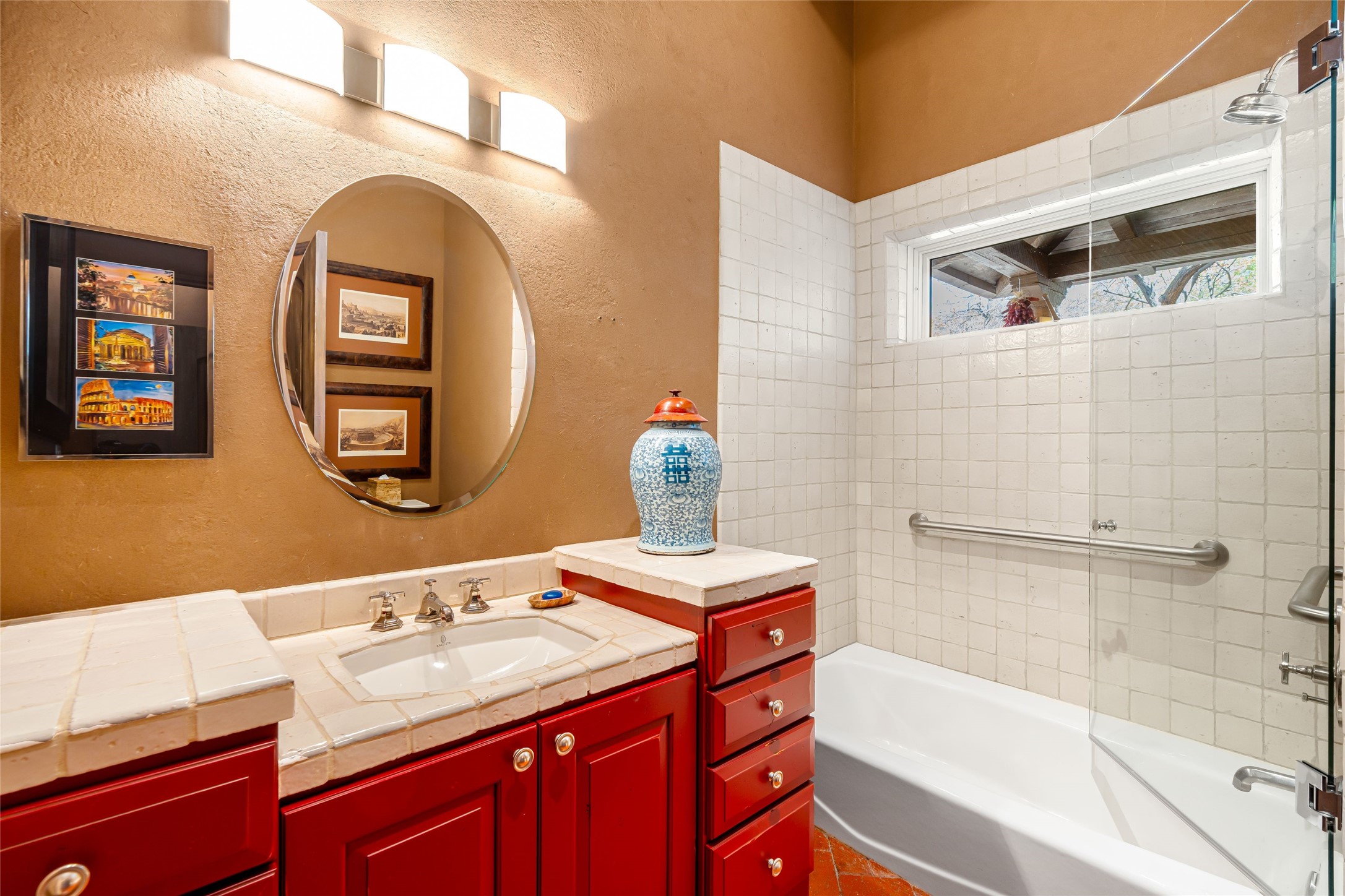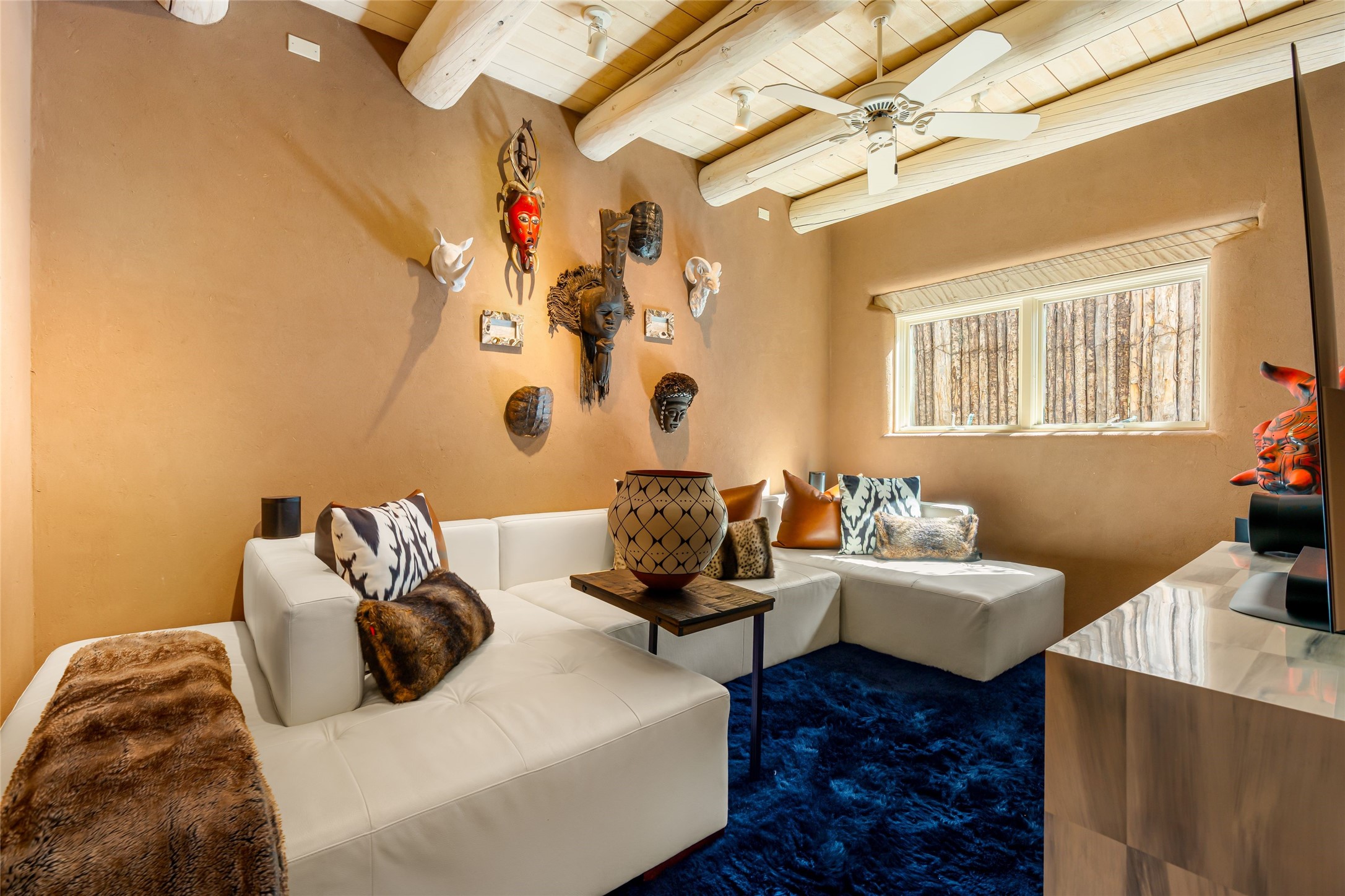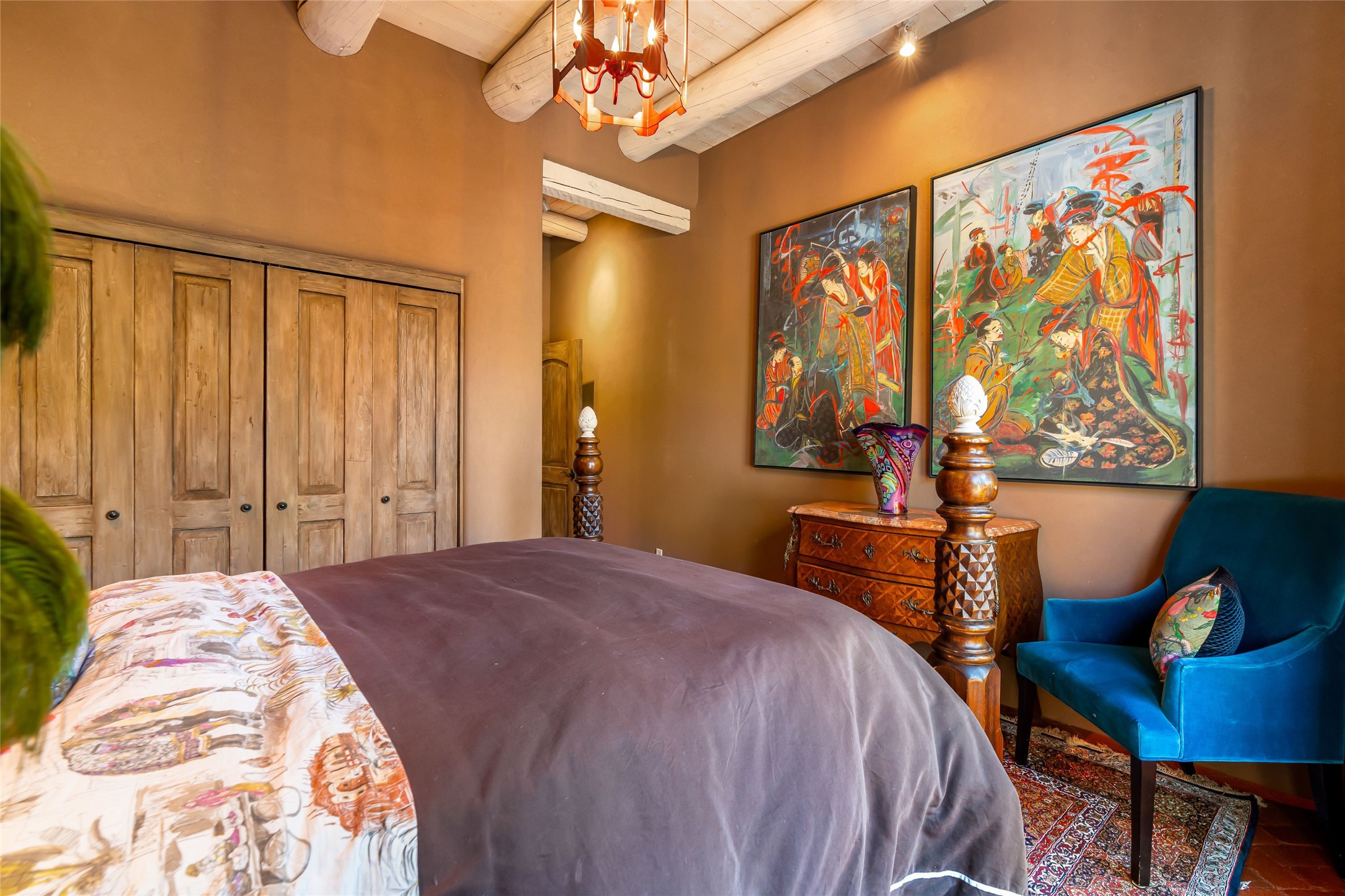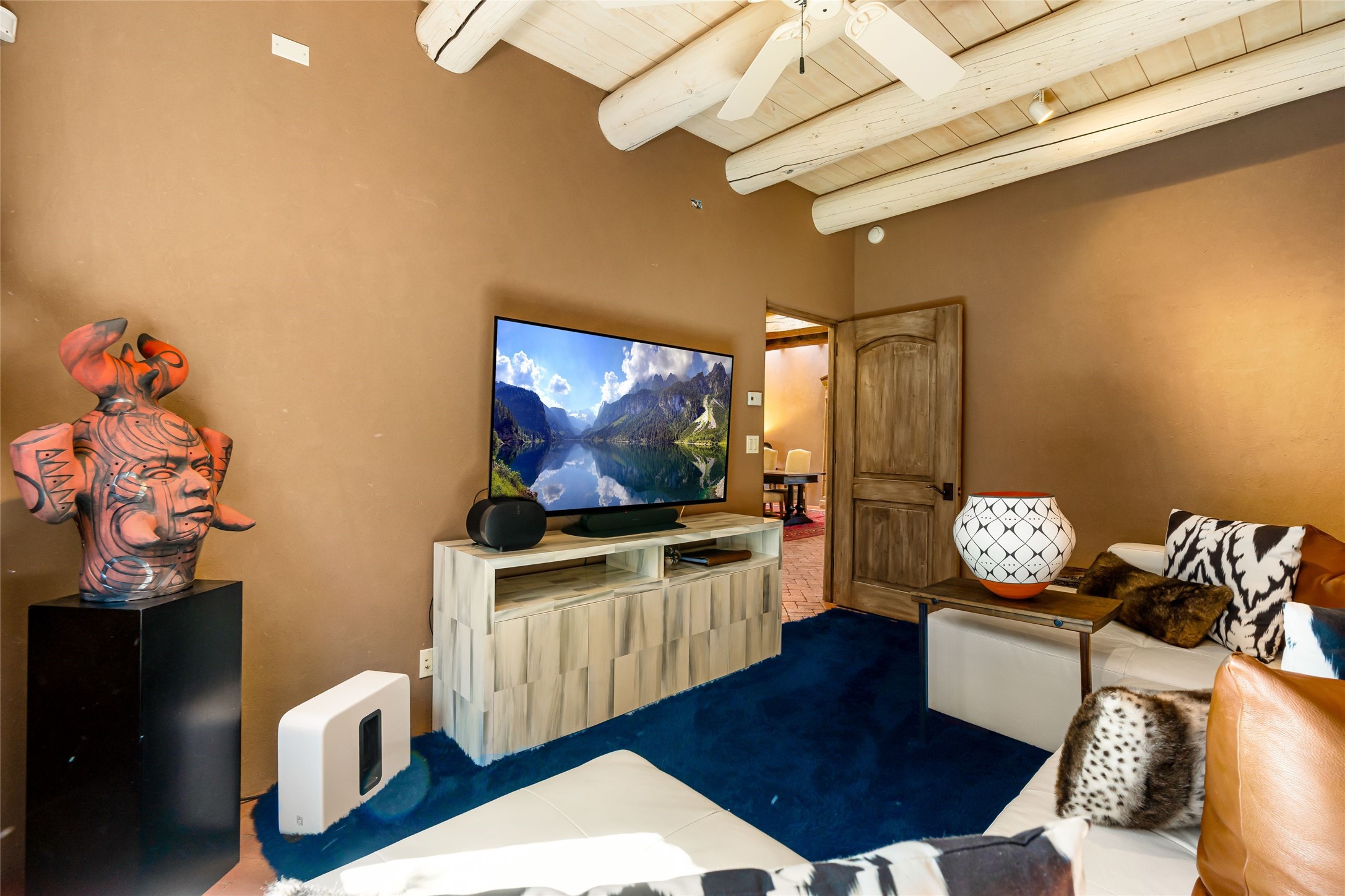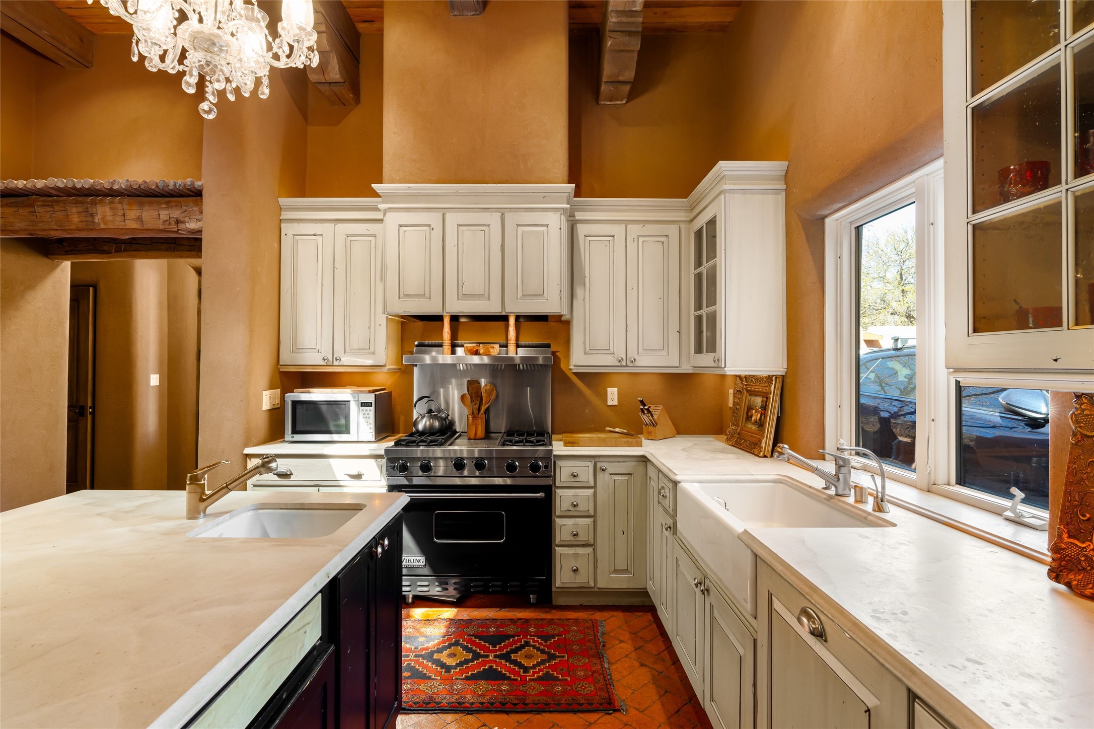 Reminiscent of Old World charm, this Eastside Santa Fe property is situated in a private, gated and quiet location close to Canyon Road, Patrick Smith Park, and the Camino Pequeno river walk. Comprising 2,133 sq.ft., a single-story adobe and frame constructed home was designed by John Midyette and built by Philip Coombs in 2005, and is adorned with brick floors, high ceilings, antique beams, hand-carved doors, and traditional plastered walls. Completely surrounded by seasonal landscaping, an outdoor water feature, a bubbling hot tub and privacy walls, the outdoors becomes an additionalsumptuous living and entertaining area. The primary suite has a wood burning kiva fireplace with a large spa-like bathroom mirroring the greenery from the outdoors. A secondary bedroom suite is separated from the primary suite with its own private outdoor access. A third bedroom is currently being used as a family room. A powder room is near the living area. The open-concept kitchen/living/formal dining area has a wood burning fireplace and is flooded in ambient natural light with a wall of glass tempting one to step into the deep covered portal flanked by another kiva fireplace. The cook'skitchen is accented by white limestone countertops, light custom cabinets and upscale appliances. There is a direct access 2-car garage with additional parking in front of the garage. New forced air heating/AC, tankless water heater, whole home water filtration, and smart water monitor with auto shut-off valve systems are in place. This lovingly maintained property is a timeless reflection of one looking to experience a refined and sophisticated lifestyle.
