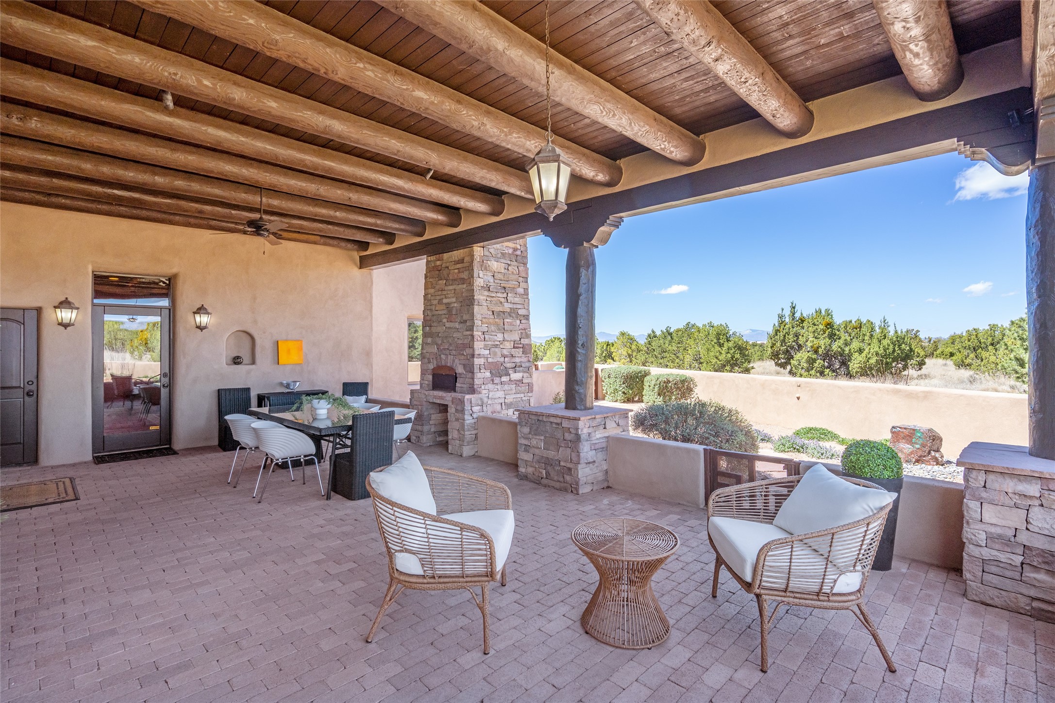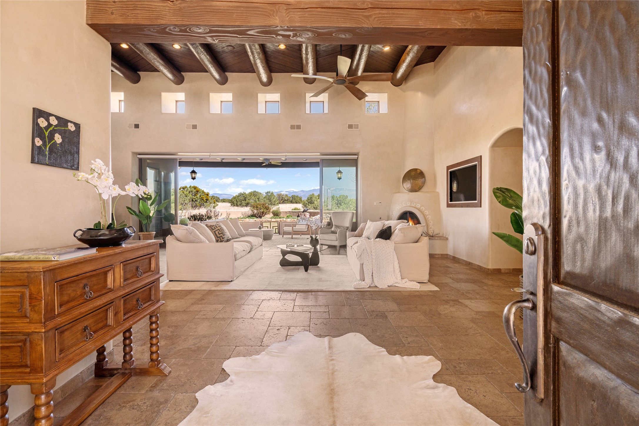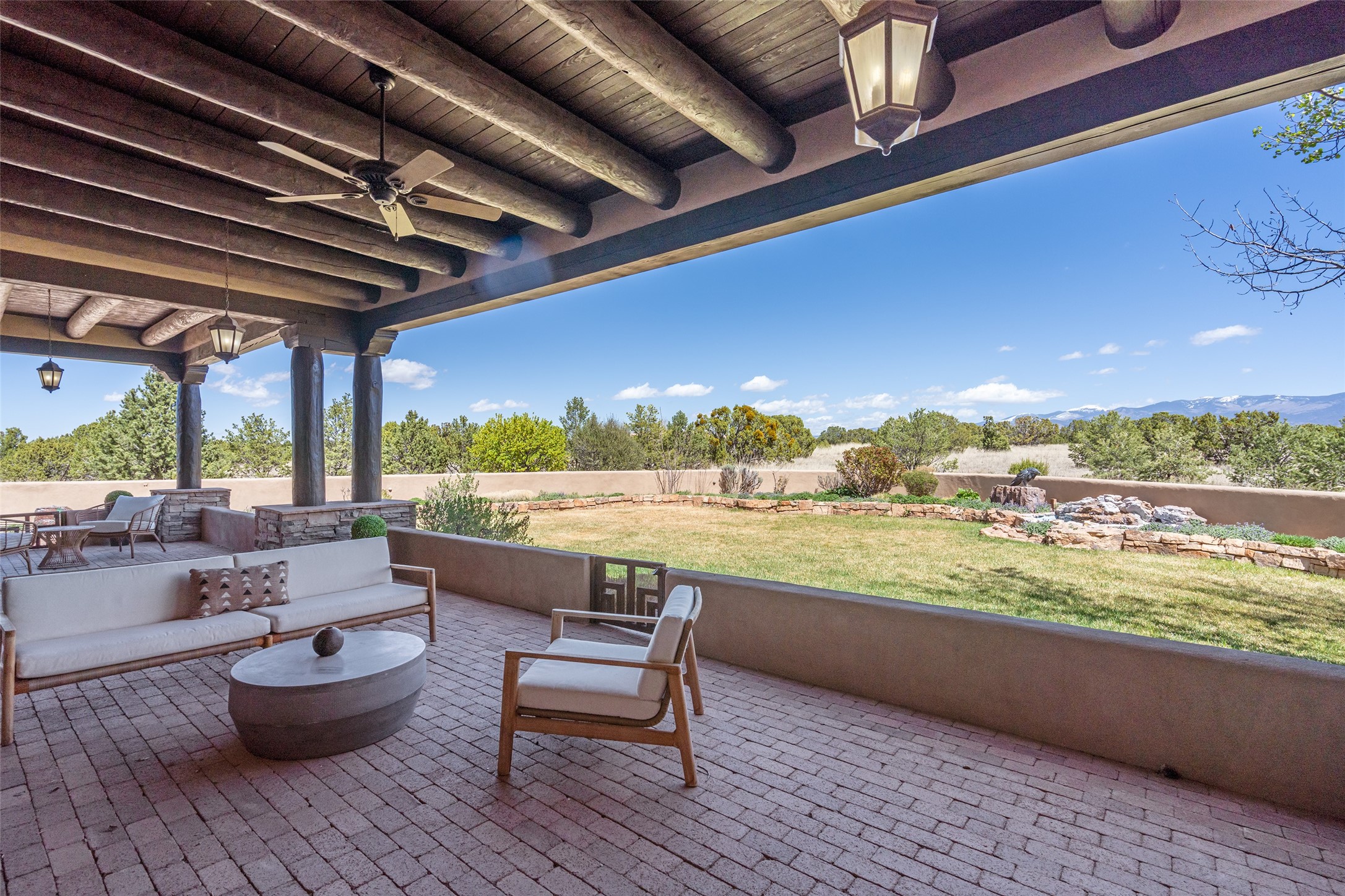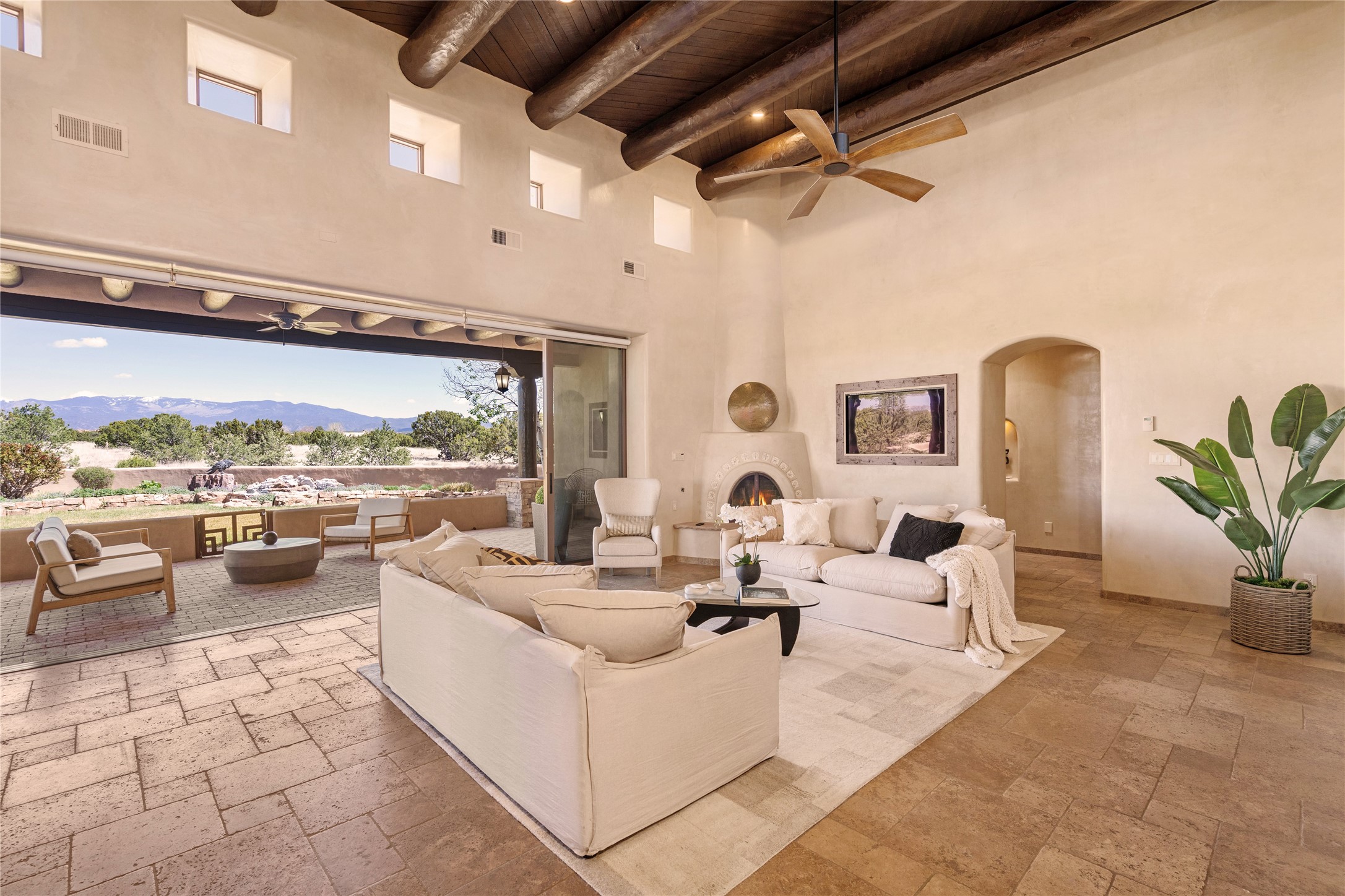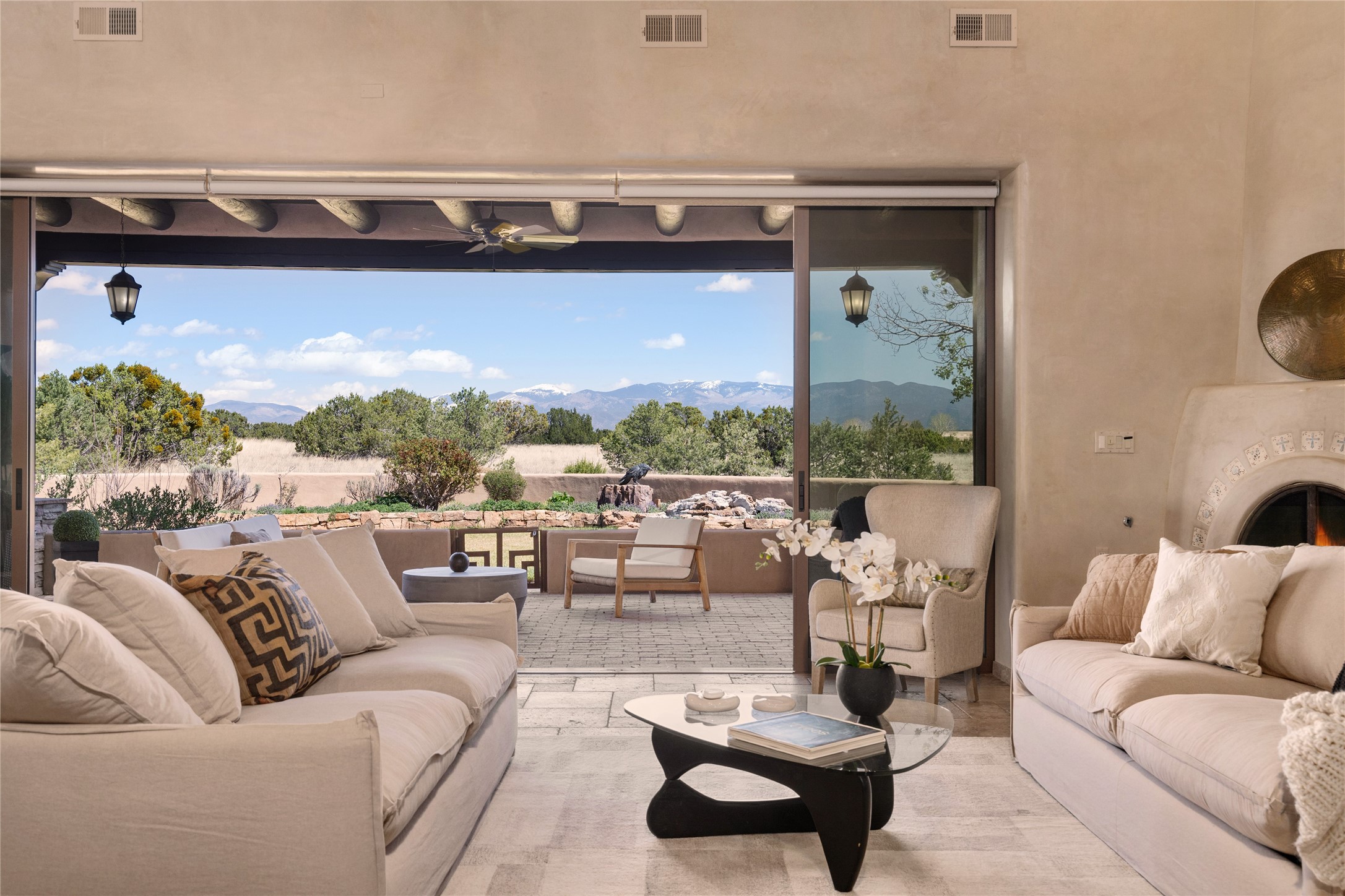 PANORAMIC VIEWS AND TIMELESS DESIGN IN LAS CAMPANAS. This refined residence in the Las Campanas community combines sweeping mountain vistas with many updates and enduring style in a hard-to-find 4 bedroom with a dramatic architecture. An inviting courtyard entry opens to generous living spaces framed by a dramatic sliding glass wall, creating seamless indoor-outdoor living. Towering viga-lined ceilings and plaster walls frame the spaces. The gourmet kitchen features dual Sub-Zero refrigerators, a Sub-Zero ice maker, and expanded storage. The Owners' suite offers a quiet and spacious retreat, while a large media/game room provides flexibility for entertainment or relaxation. Recent enhancements include upgraded landscaping, refreshed interiors, and mechanical improvements that elevate both comfort and efficiency. Outdoor areas are designed for year-round enjoyment, with covered dining spaces, a pizza oven, and xeric, drip-irrigated gardens that are both lush and easy to maintain. Residents enjoy close proximity to The Club at Las Campanas, with spa, fitness, and dining amenities (membership available through the private Club at Las Campanas) as well as direct access to miles of walking paths. A move-in ready home blending elegant finishes, multiple upgrades, and the best of Santa Fe living.
