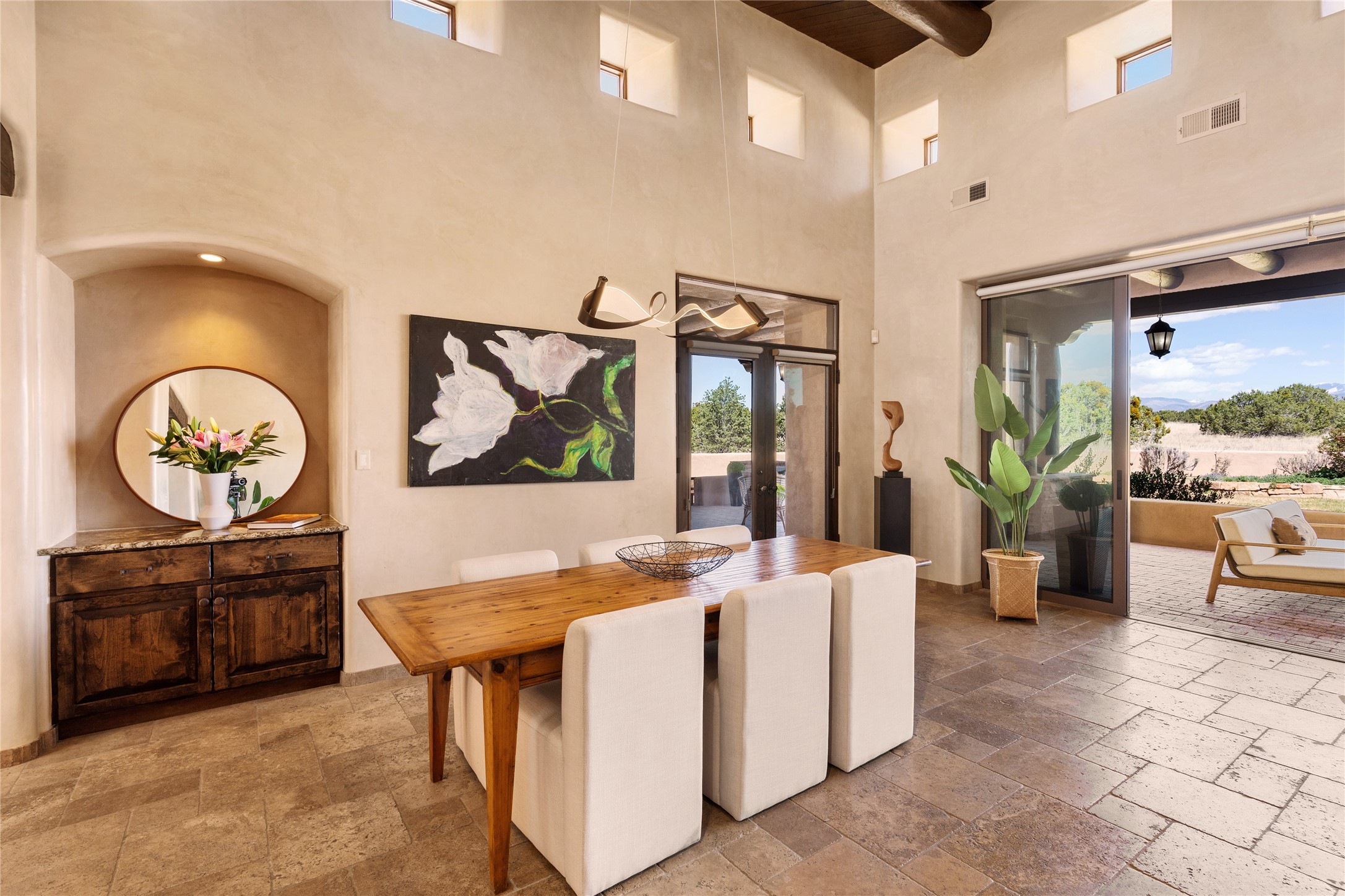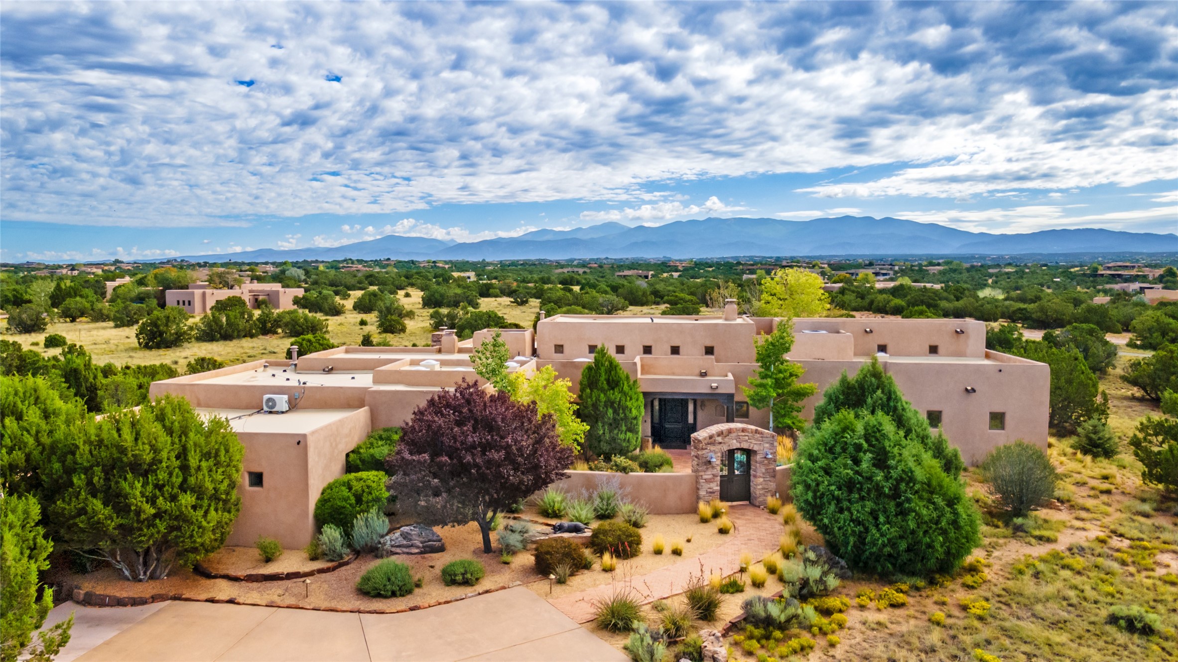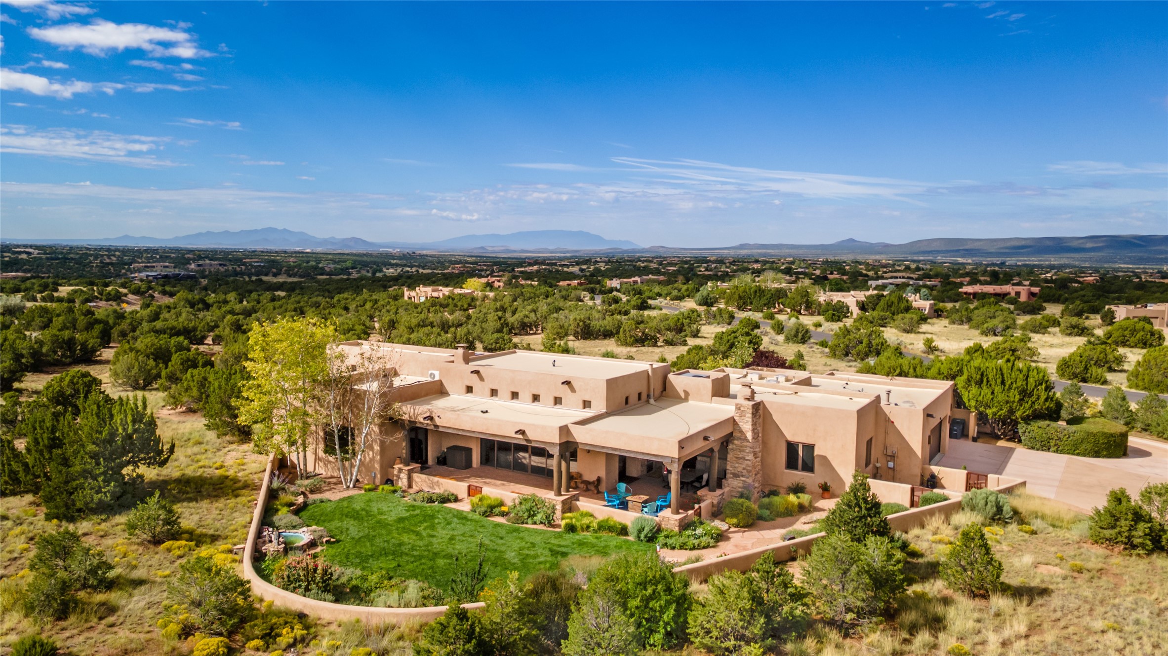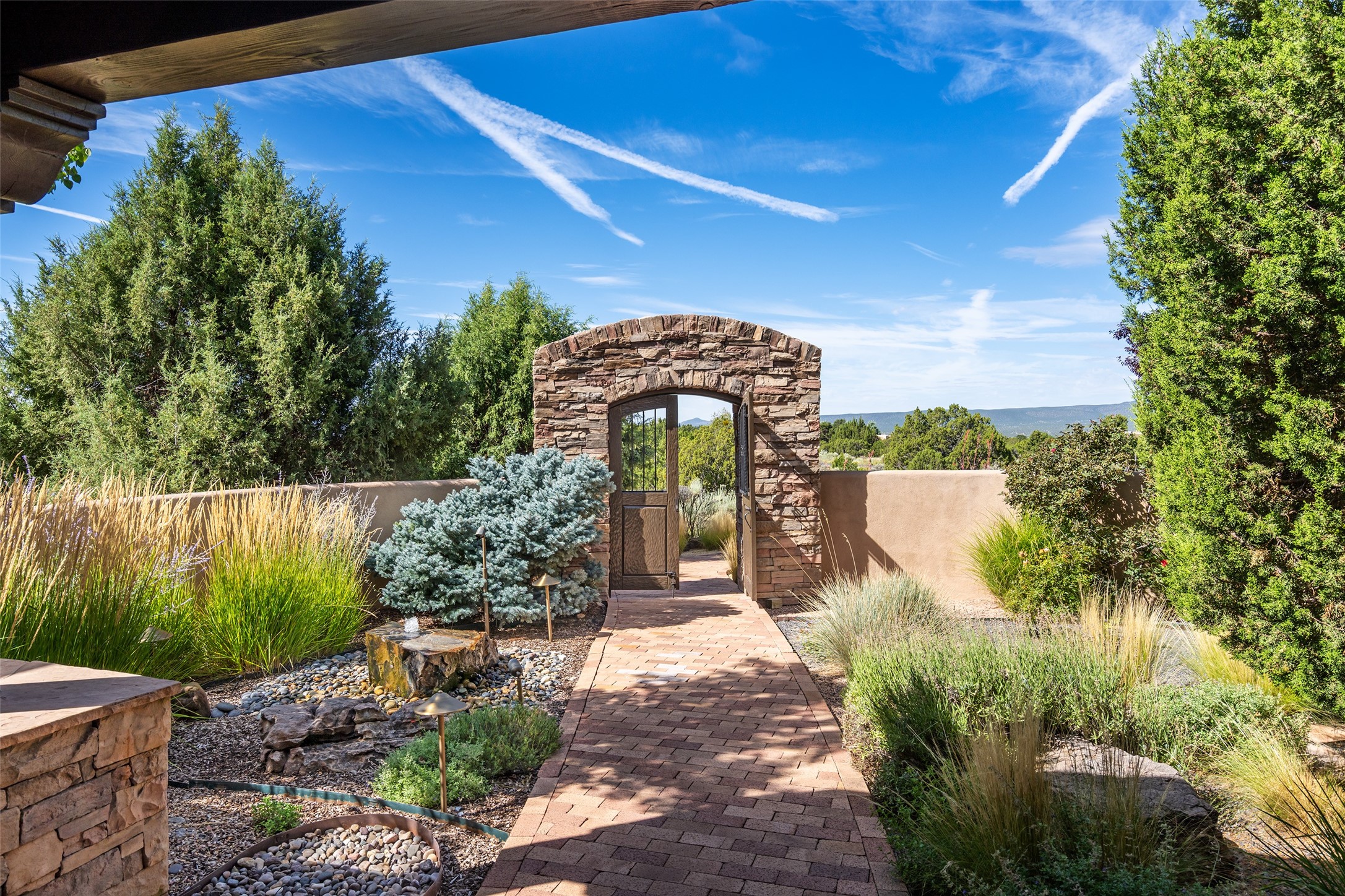 PANORAMIC VIEWS AND TIMELESS DESIGN IN LAS CAMPANAS. This refined residence in the Las Campanas community combines sweeping mountain vistas with many updates and enduring style in a hard-to-find 4 bedroom with a dramatic architecture. An inviting courtyard entry opens to generous living spaces framed by a dramatic sliding glass wall, creating seamless indoor-outdoor living. Towering viga-lined ceilings and plaster walls frame the spaces. The gourmet kitchen features dual Sub-Zero refrigerators, a Sub-Zero ice maker, and expanded storage. The Owners' suite offers a quiet and spacious retreat, while a large media/game room provides flexibility for entertainment or relaxation. Recent enhancements include upgraded landscaping, refreshed interiors, and mechanical improvements that elevate both comfort and efficiency. Outdoor areas are designed for year-round enjoyment, with covered dining spaces, a pizza oven, and xeric, drip-irrigated gardens that are both lush and easy to maintain. Residents enjoy close proximity to The Club at Las Campanas, with spa, fitness, and dining amenities (membership available through the private Club at Las Campanas) as well as direct access to miles of walking paths. A move-in ready home blending elegant finishes, multiple upgrades, and the best of Santa Fe living.