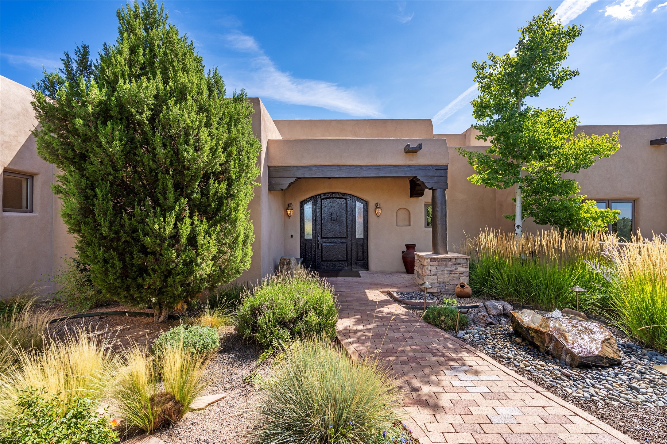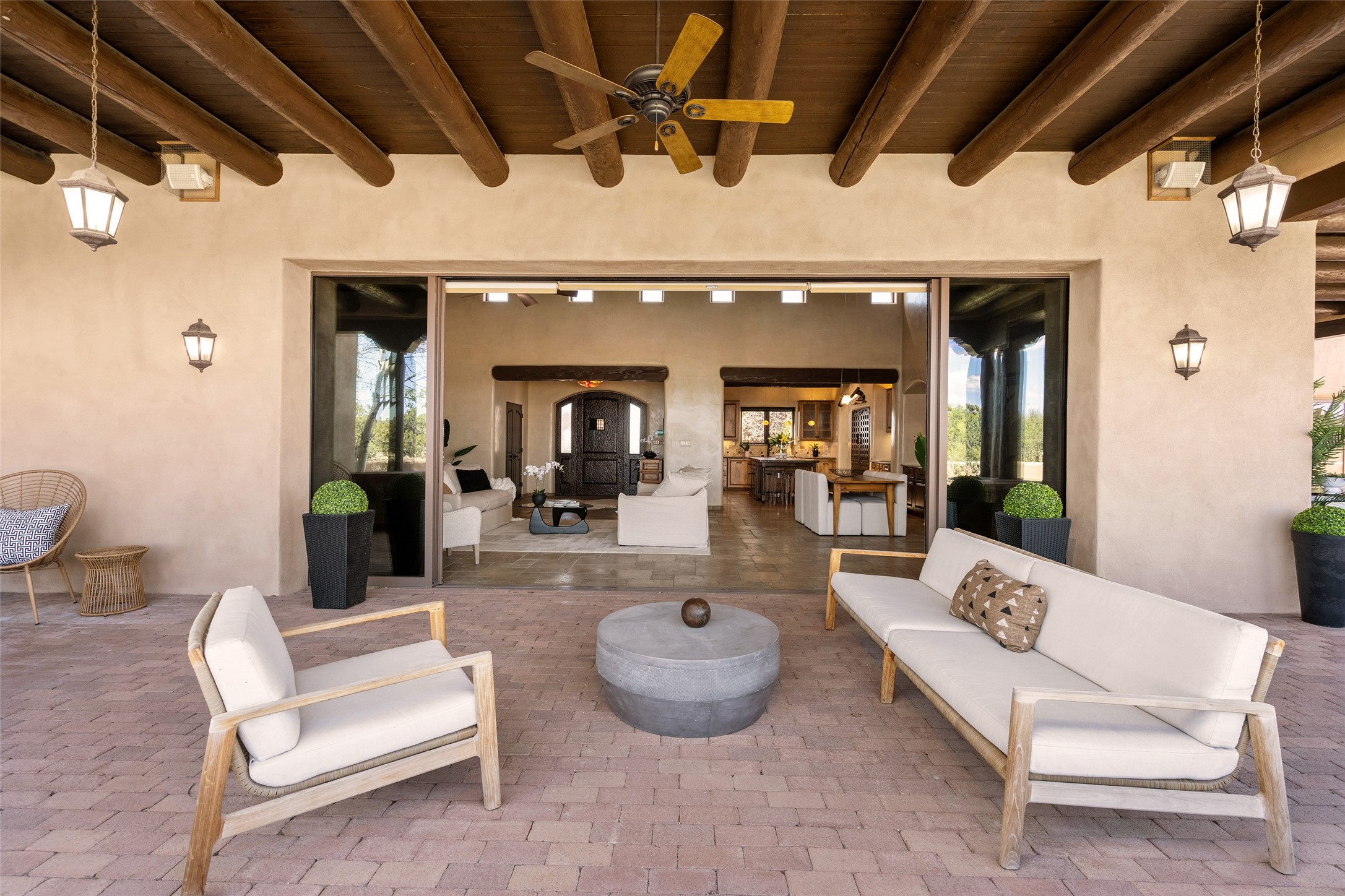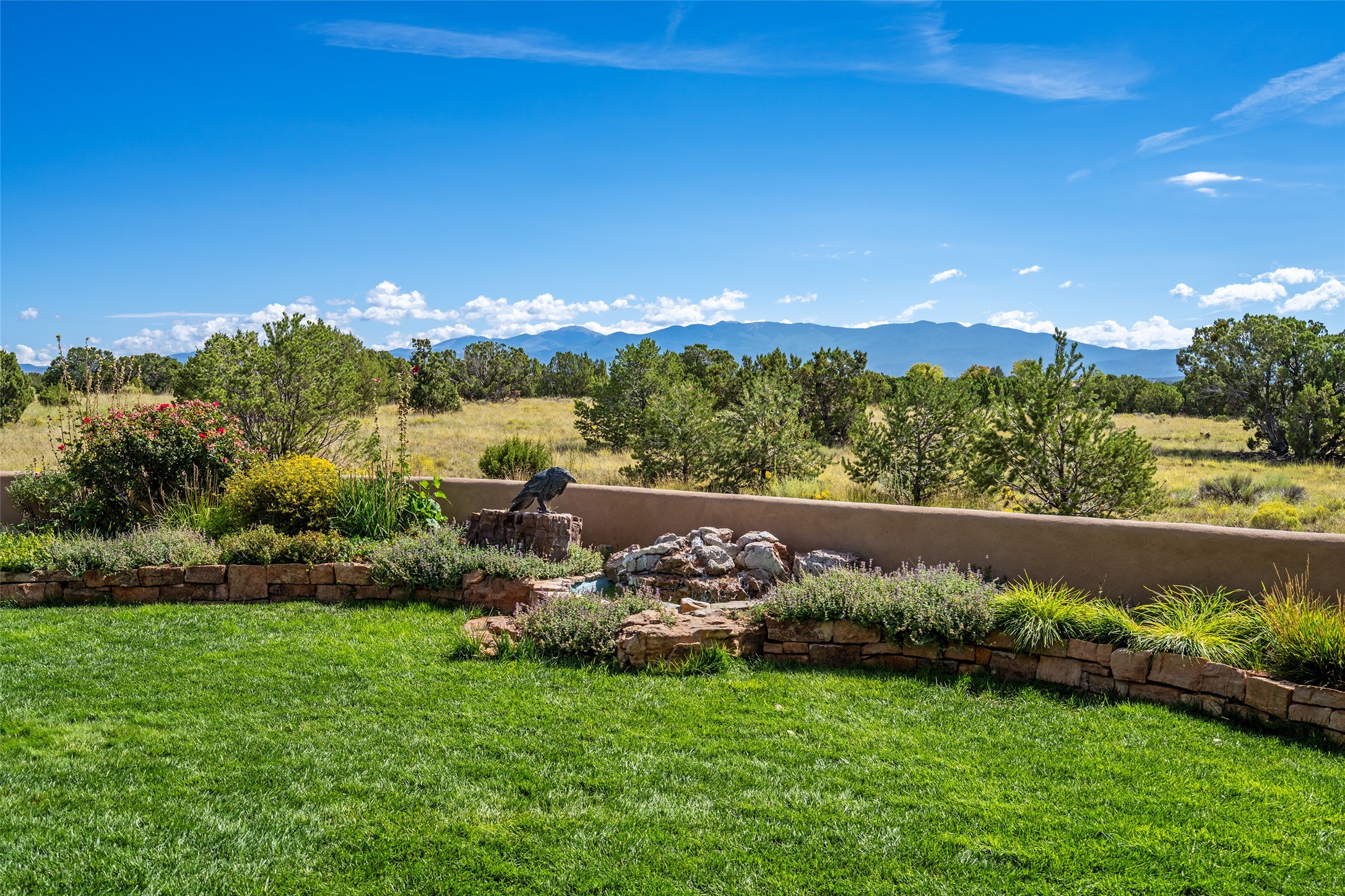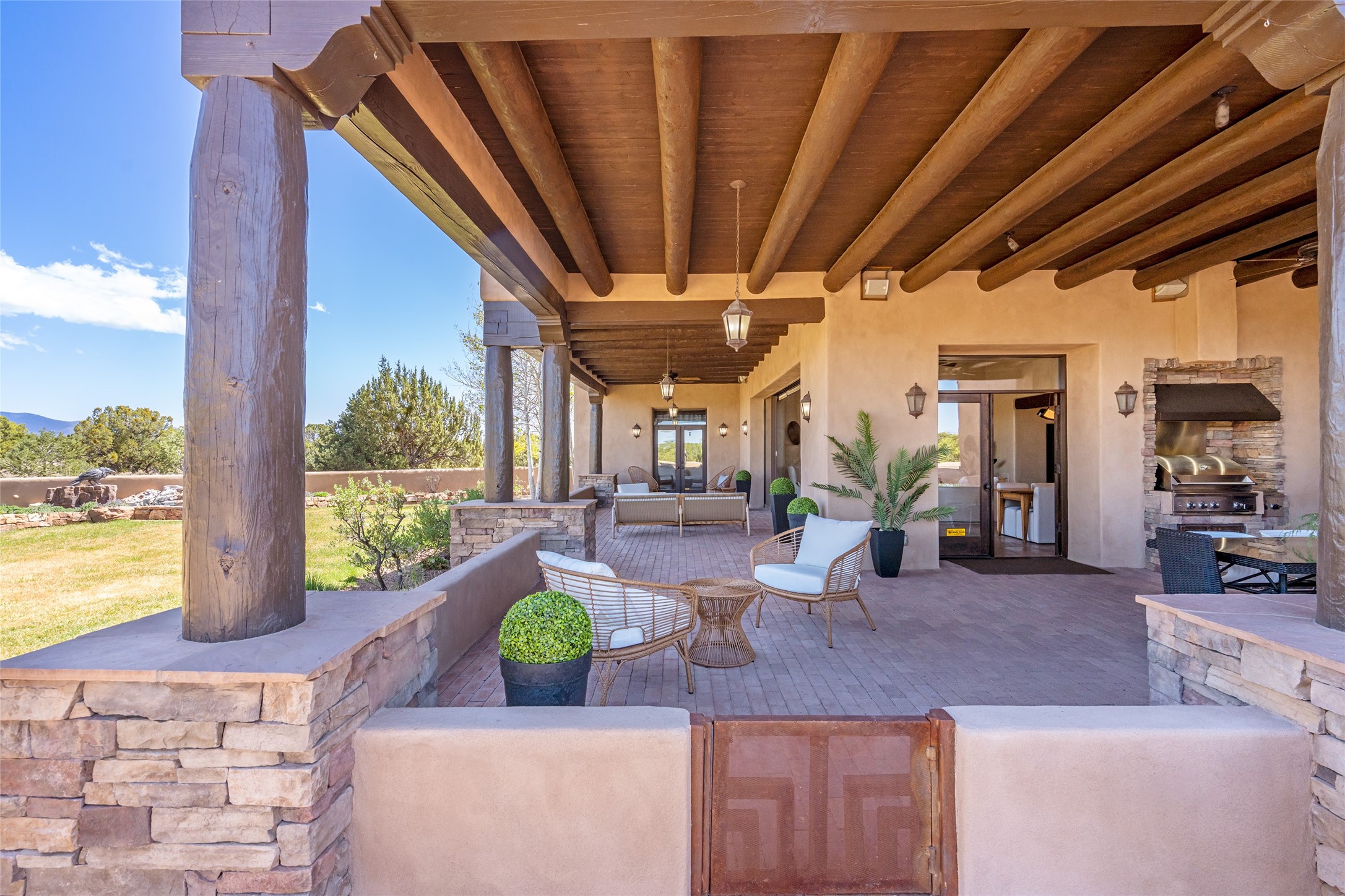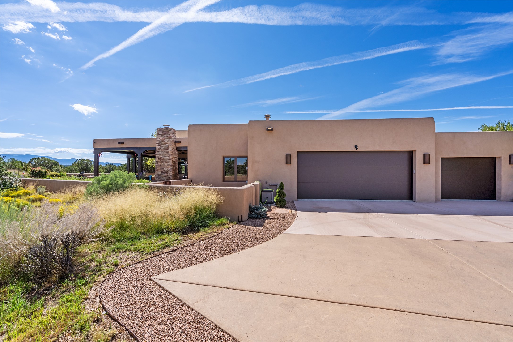 PANORAMIC VIEWS AND TIMELESS DESIGN IN LAS CAMPANAS. This refined residence in the Las Campanas community combines sweeping mountain vistas with many updates and enduring style in a hard-to-find 4 bedroom with a dramatic architecture. An inviting courtyard entry opens to generous living spaces framed by a dramatic sliding glass wall, creating seamless indoor-outdoor living. Towering viga-lined ceilings and plaster walls frame the spaces. The gourmet kitchen features dual Sub-Zero refrigerators, a Sub-Zero ice maker, and expanded storage. The Owners' suite offers a quiet and spacious retreat, while a large media/game room provides flexibility for entertainment or relaxation. Recent enhancements include upgraded landscaping, refreshed interiors, and mechanical improvements that elevate both comfort and efficiency. Outdoor areas are designed for year-round enjoyment, with covered dining spaces, a pizza oven, and xeric, drip-irrigated gardens that are both lush and easy to maintain. Residents enjoy close proximity to The Club at Las Campanas, with spa, fitness, and dining amenities (membership available through the private Club at Las Campanas) as well as direct access to miles of walking paths. A move-in ready home blending elegant finishes, multiple upgrades, and the best of Santa Fe living.