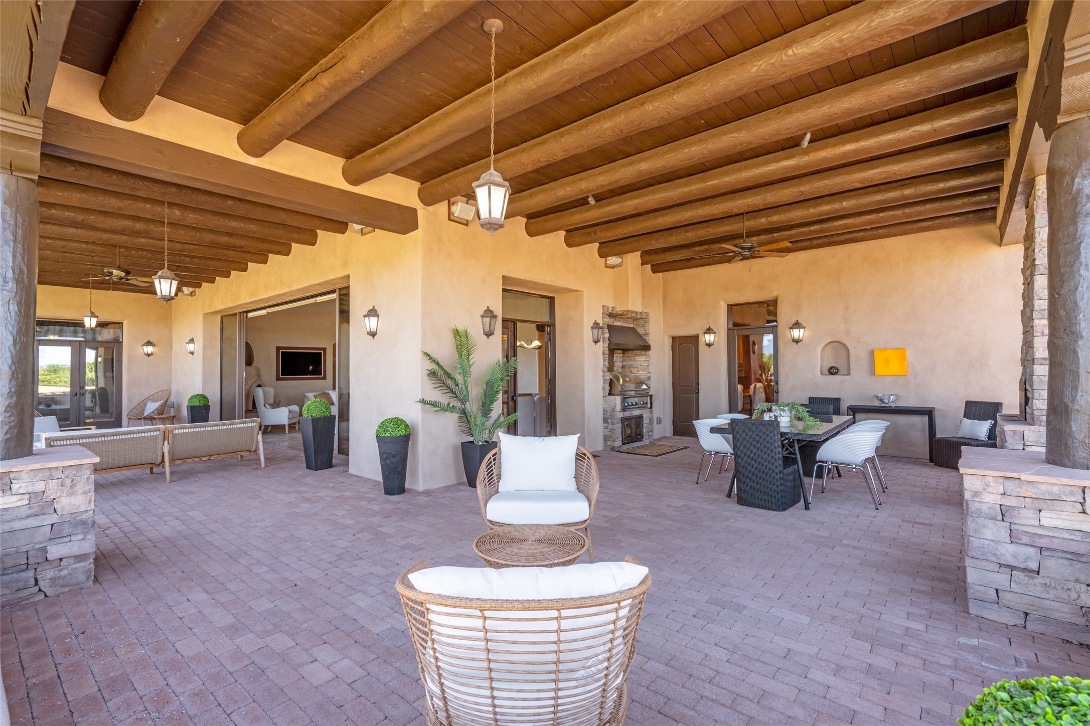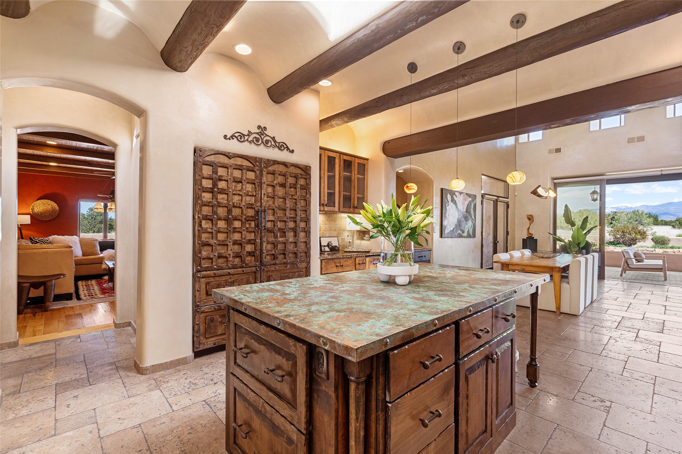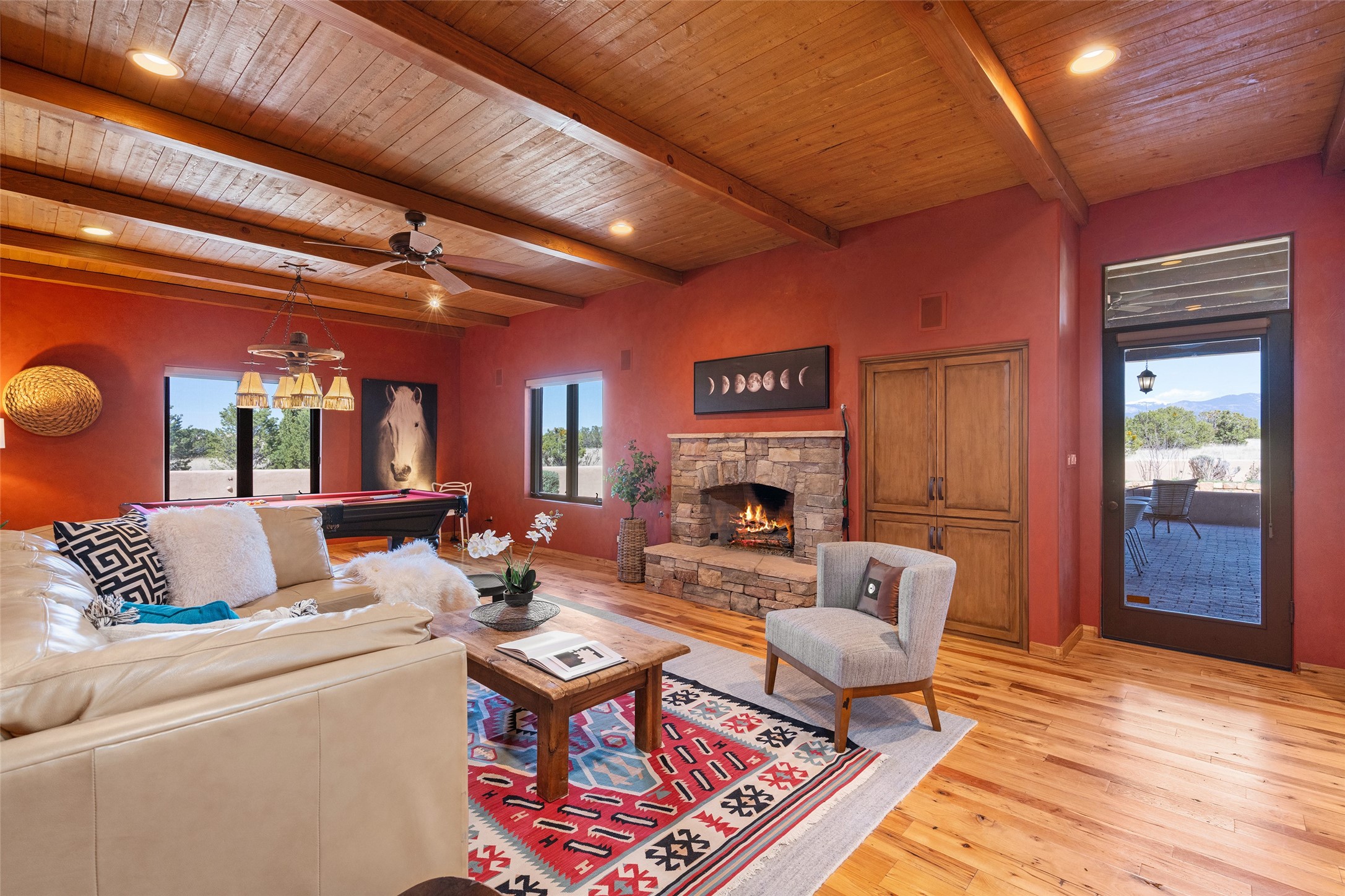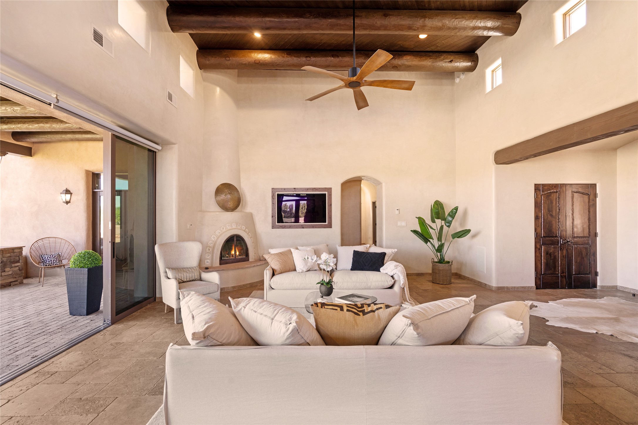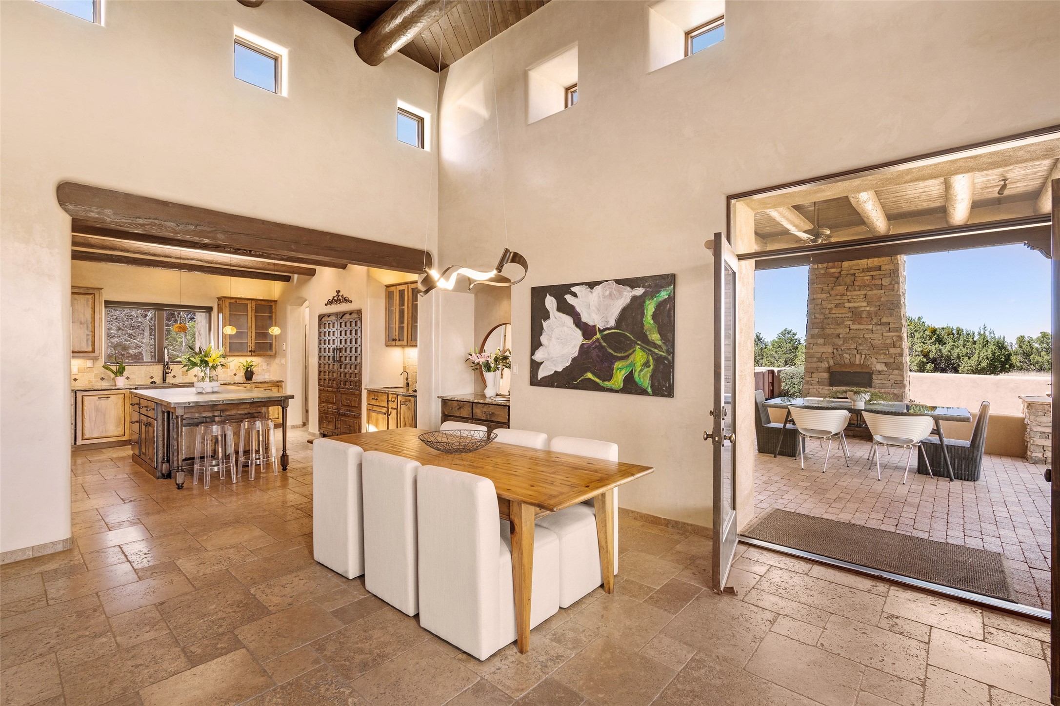 PANORAMIC VIEWS AND TIMELESS DESIGN IN LAS CAMPANAS. This refined residence in the Las Campanas community combines sweeping mountain vistas with many updates and enduring style in a hard-to-find 4 bedroom with a dramatic architecture. An inviting courtyard entry opens to generous living spaces framed by a dramatic sliding glass wall, creating seamless indoor-outdoor living. Towering viga-lined ceilings and plaster walls frame the spaces. The gourmet kitchen features dual Sub-Zero refrigerators, a Sub-Zero ice maker, and expanded storage. The Owners' suite offers a quiet and spacious retreat, while a large media/game room provides flexibility for entertainment or relaxation. Recent enhancements include upgraded landscaping, refreshed interiors, and mechanical improvements that elevate both comfort and efficiency. Outdoor areas are designed for year-round enjoyment, with covered dining spaces, a pizza oven, and xeric, drip-irrigated gardens that are both lush and easy to maintain. Residents enjoy close proximity to The Club at Las Campanas, with spa, fitness, and dining amenities (membership available through the private Club at Las Campanas) as well as direct access to miles of walking paths. A move-in ready home blending elegant finishes, multiple upgrades, and the best of Santa Fe living.