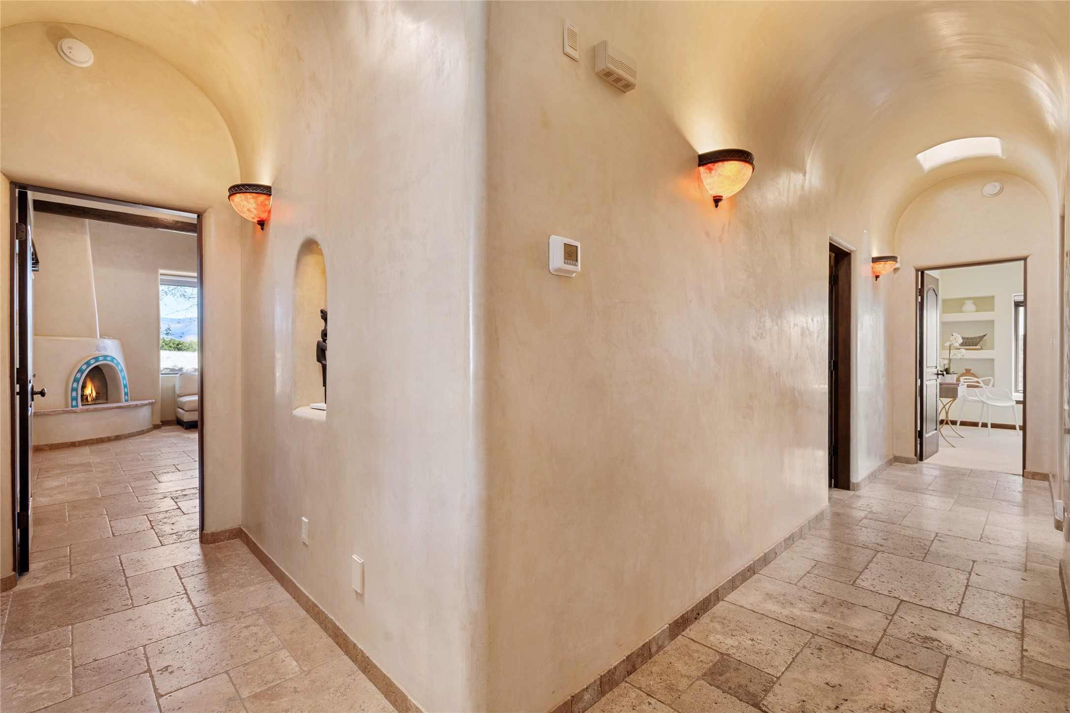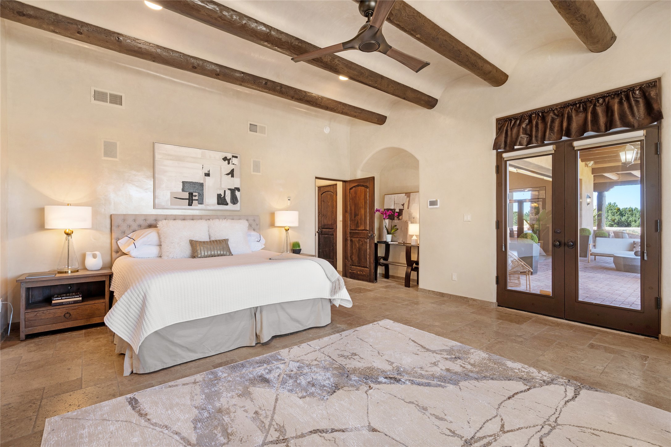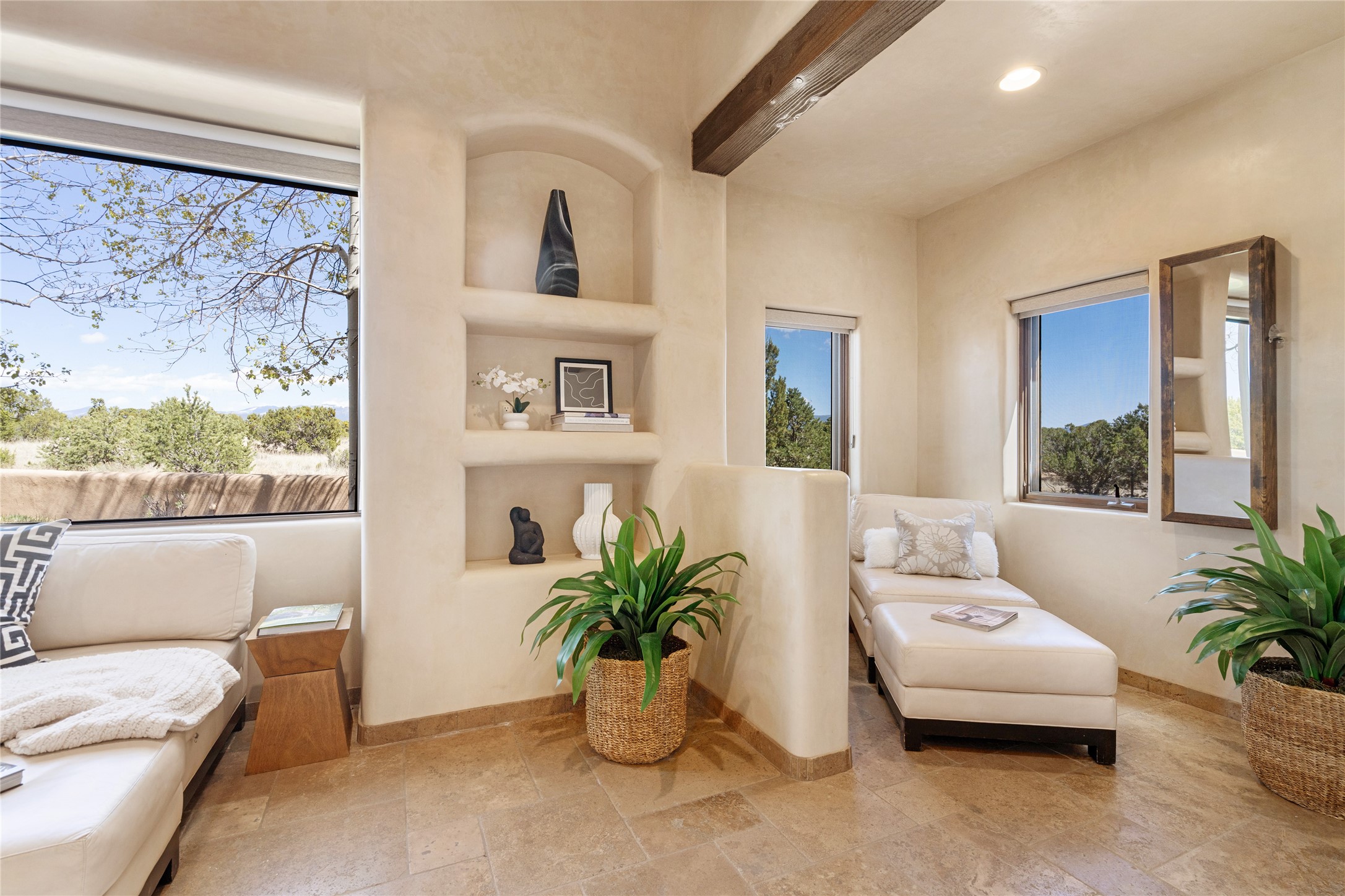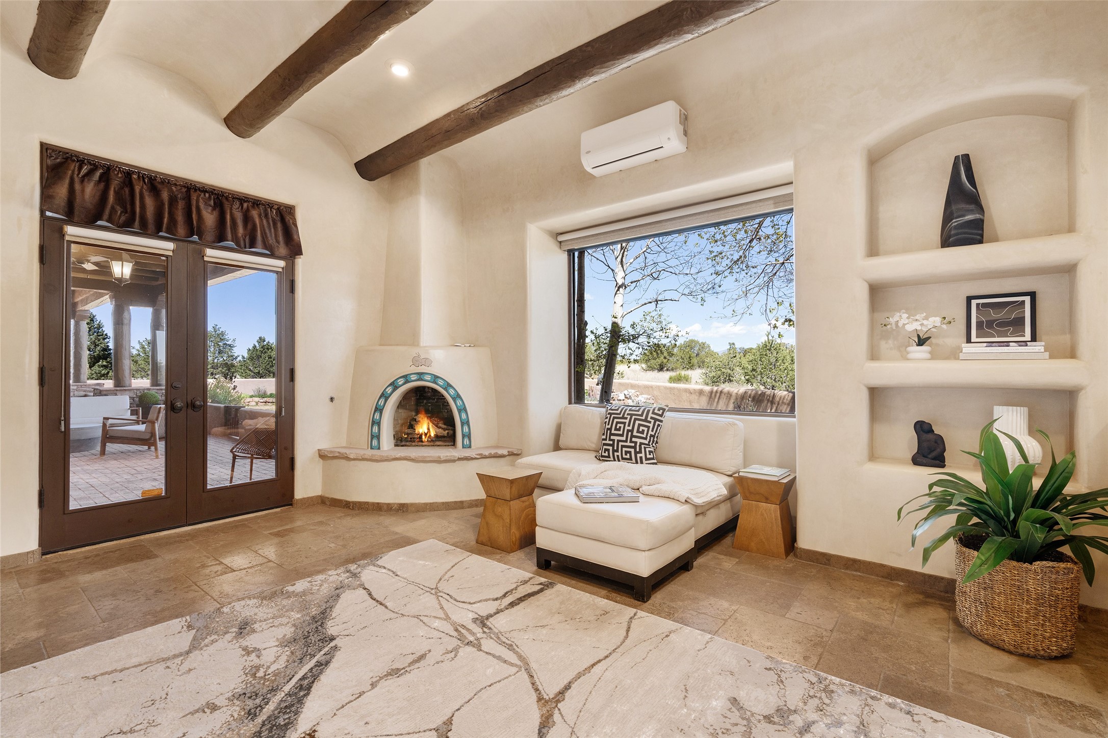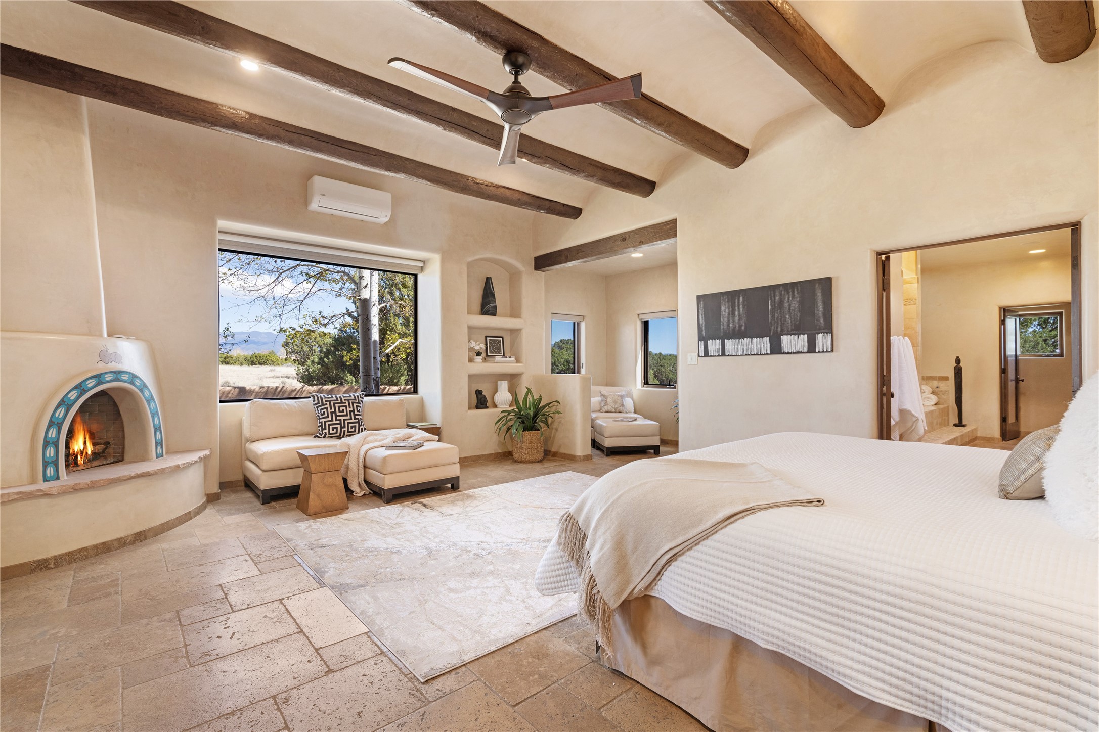 PANORAMIC VIEWS AND TIMELESS DESIGN IN LAS CAMPANAS. This refined residence in the Las Campanas community combines sweeping mountain vistas with many updates and enduring style in a hard-to-find 4 bedroom with a dramatic architecture. An inviting courtyard entry opens to generous living spaces framed by a dramatic sliding glass wall, creating seamless indoor-outdoor living. Towering viga-lined ceilings and plaster walls frame the spaces. The gourmet kitchen features dual Sub-Zero refrigerators, a Sub-Zero ice maker, and expanded storage. The Owners' suite offers a quiet and spacious retreat, while a large media/game room provides flexibility for entertainment or relaxation. Recent enhancements include upgraded landscaping, refreshed interiors, and mechanical improvements that elevate both comfort and efficiency. Outdoor areas are designed for year-round enjoyment, with covered dining spaces, a pizza oven, and xeric, drip-irrigated gardens that are both lush and easy to maintain. Residents enjoy close proximity to The Club at Las Campanas, with spa, fitness, and dining amenities (membership available through the private Club at Las Campanas) as well as direct access to miles of walking paths. A move-in ready home blending elegant finishes, multiple upgrades, and the best of Santa Fe living.
