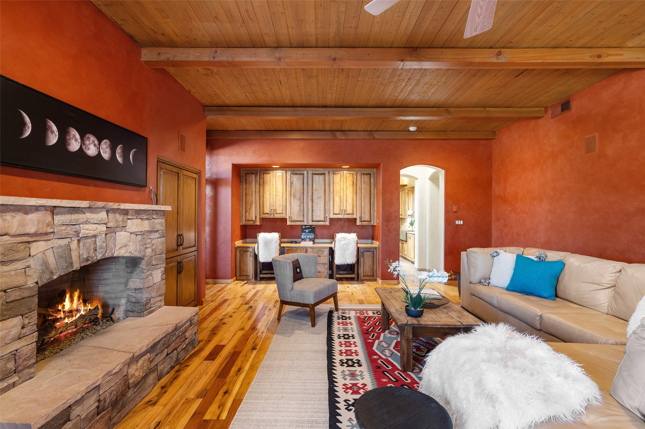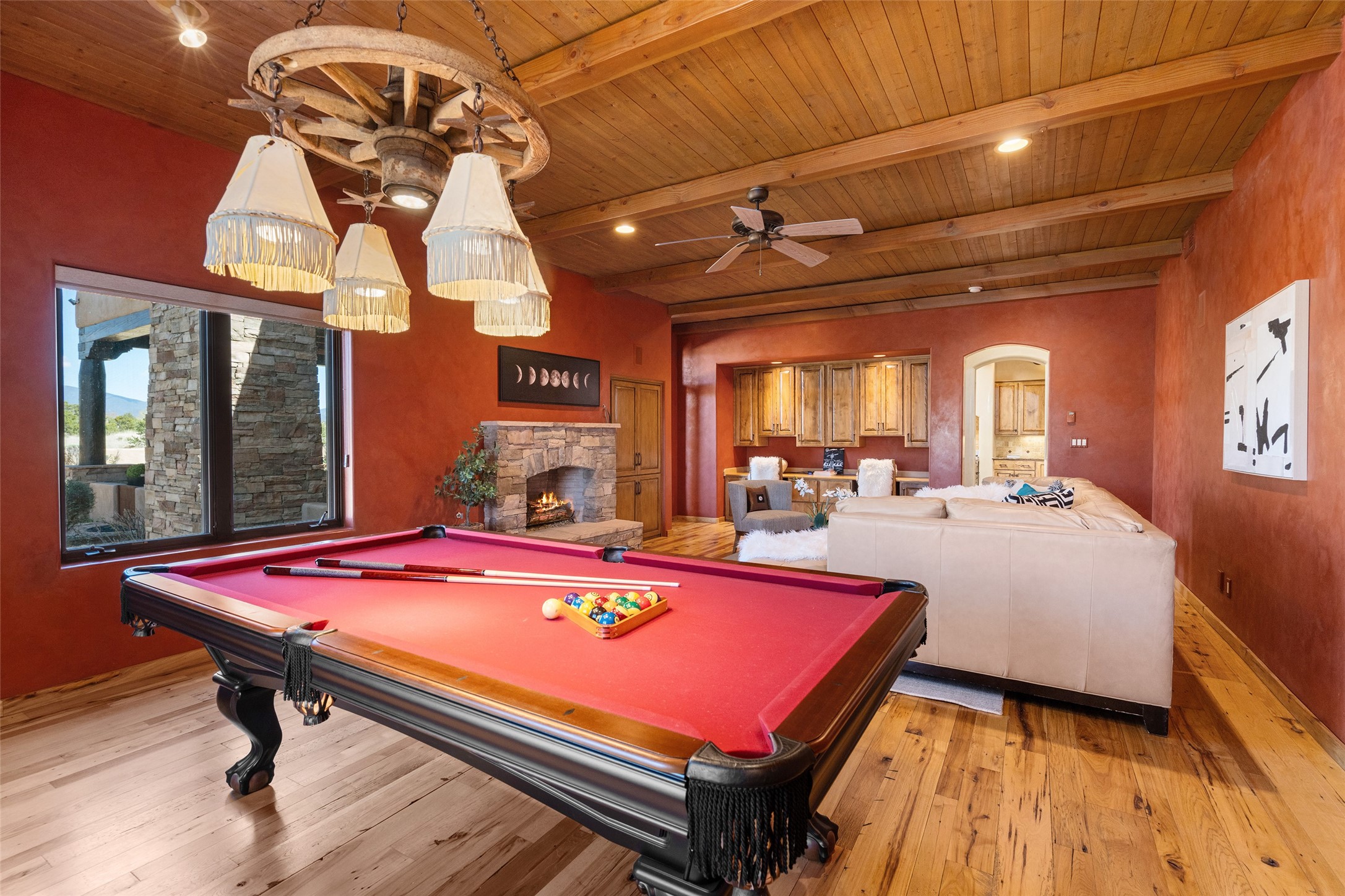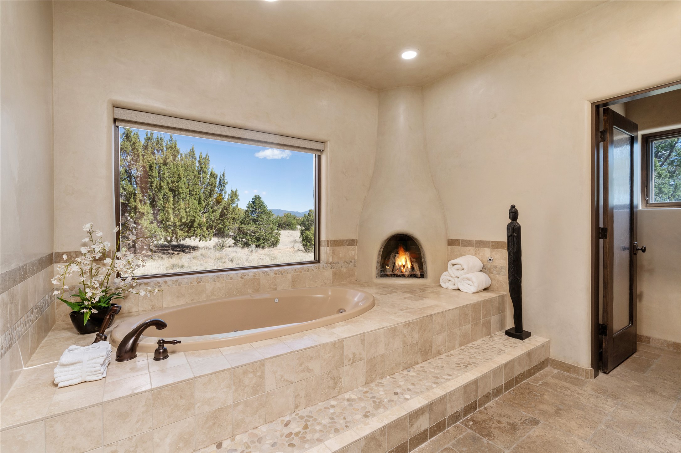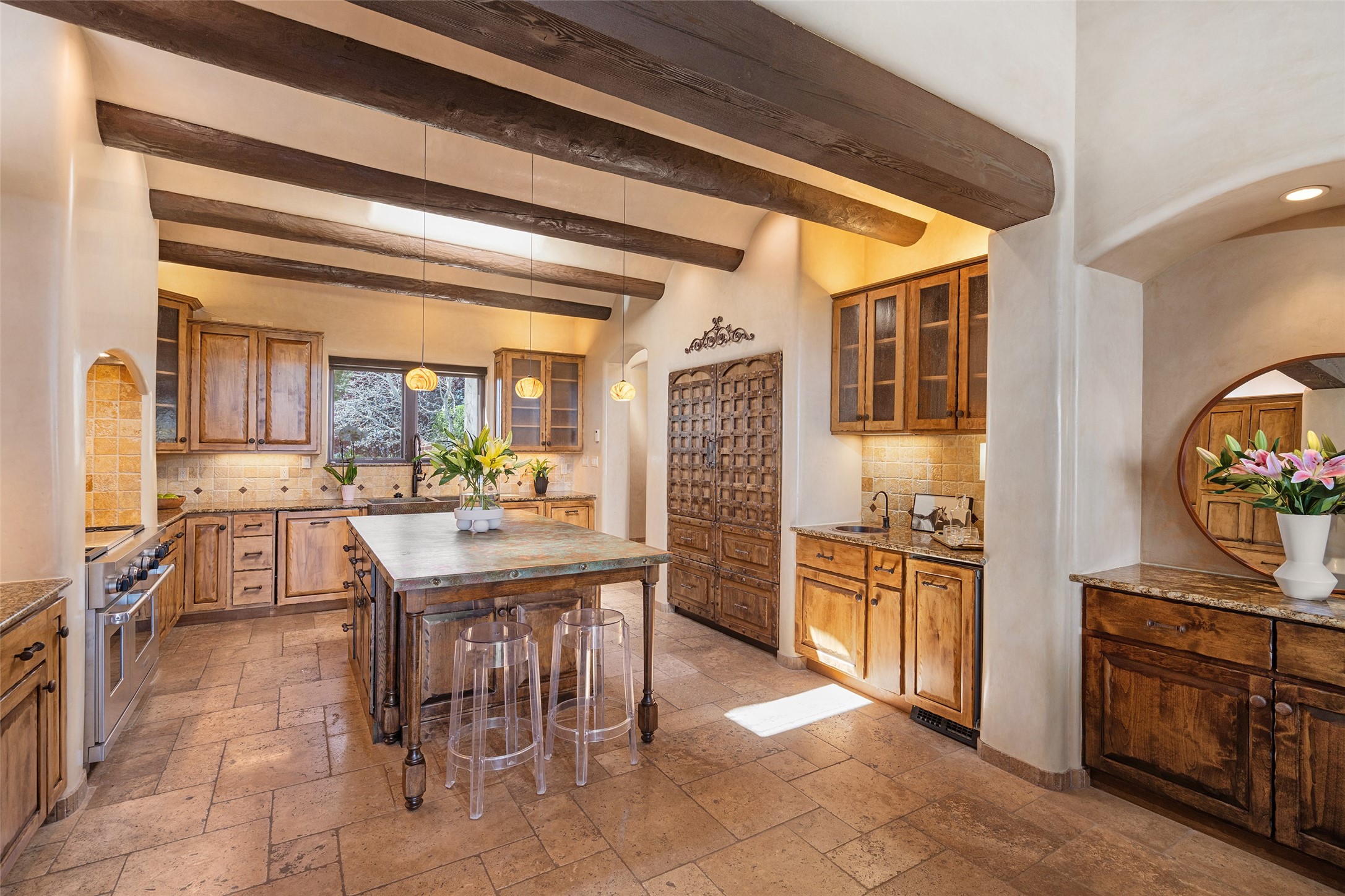 PANORAMIC VIEWS AND TIMELESS DESIGN IN LAS CAMPANAS. This refined residence in the Las Campanas community combines sweeping mountain vistas with many updates and enduring style in a hard-to-find 4 bedroom with a dramatic architecture. An inviting courtyard entry opens to generous living spaces framed by a dramatic sliding glass wall, creating seamless indoor-outdoor living. Towering viga-lined ceilings and plaster walls frame the spaces. The gourmet kitchen features dual Sub-Zero refrigerators, a Sub-Zero ice maker, and expanded storage. The Owners' suite offers a quiet and spacious retreat, while a large media/game room provides flexibility for entertainment or relaxation. Recent enhancements include upgraded landscaping, refreshed interiors, and mechanical improvements that elevate both comfort and efficiency. Outdoor areas are designed for year-round enjoyment, with covered dining spaces, a pizza oven, and xeric, drip-irrigated gardens that are both lush and easy to maintain. Residents enjoy close proximity to The Club at Las Campanas, with spa, fitness, and dining amenities (membership available through the private Club at Las Campanas) as well as direct access to miles of walking paths. A move-in ready home blending elegant finishes, multiple upgrades, and the best of Santa Fe living.
