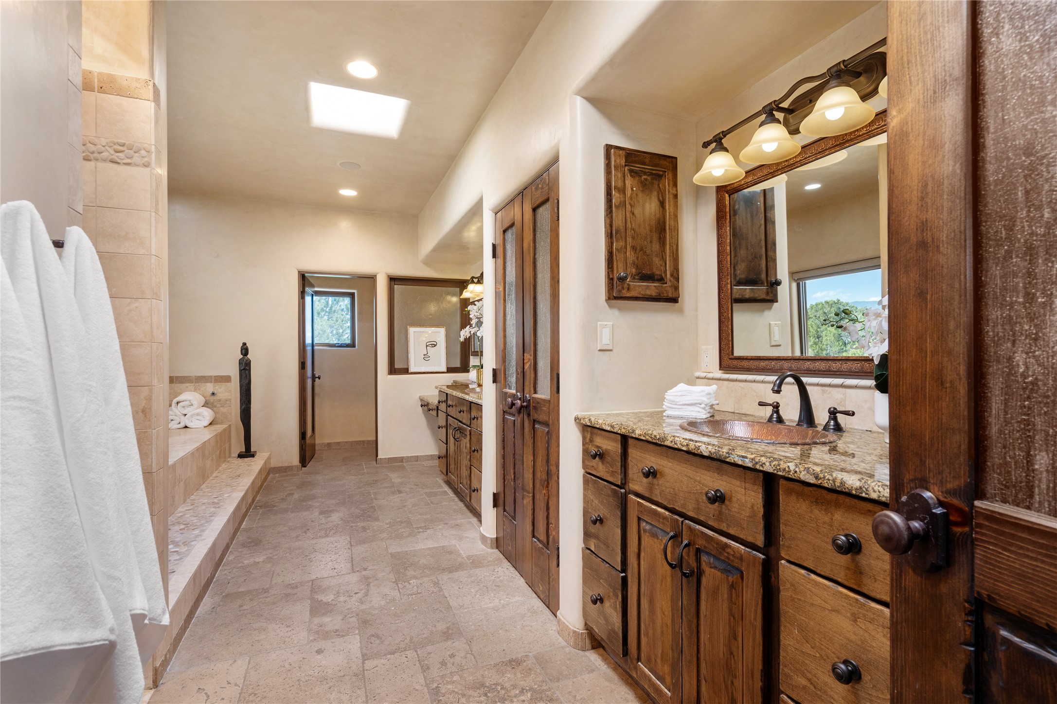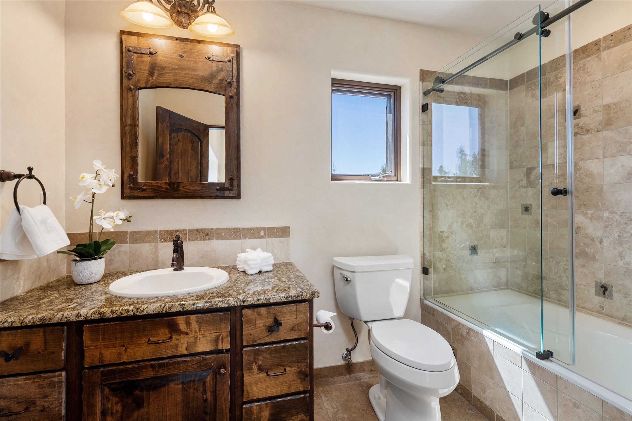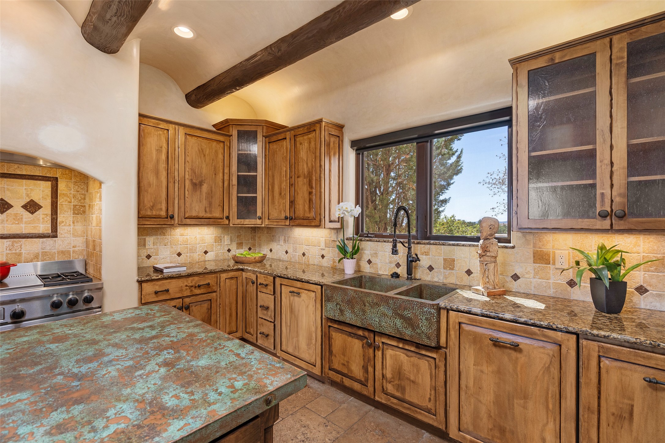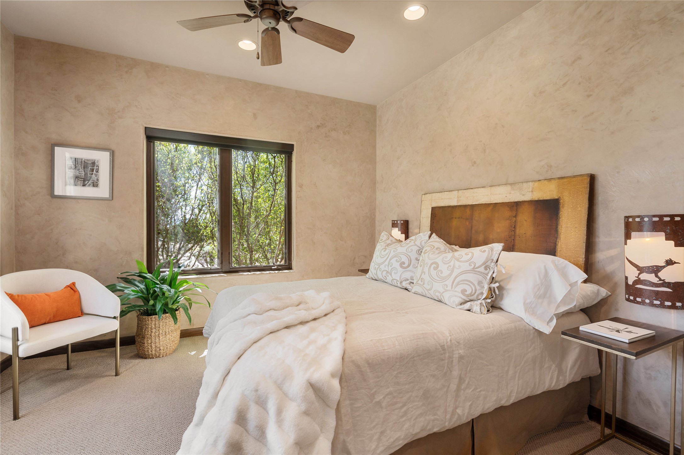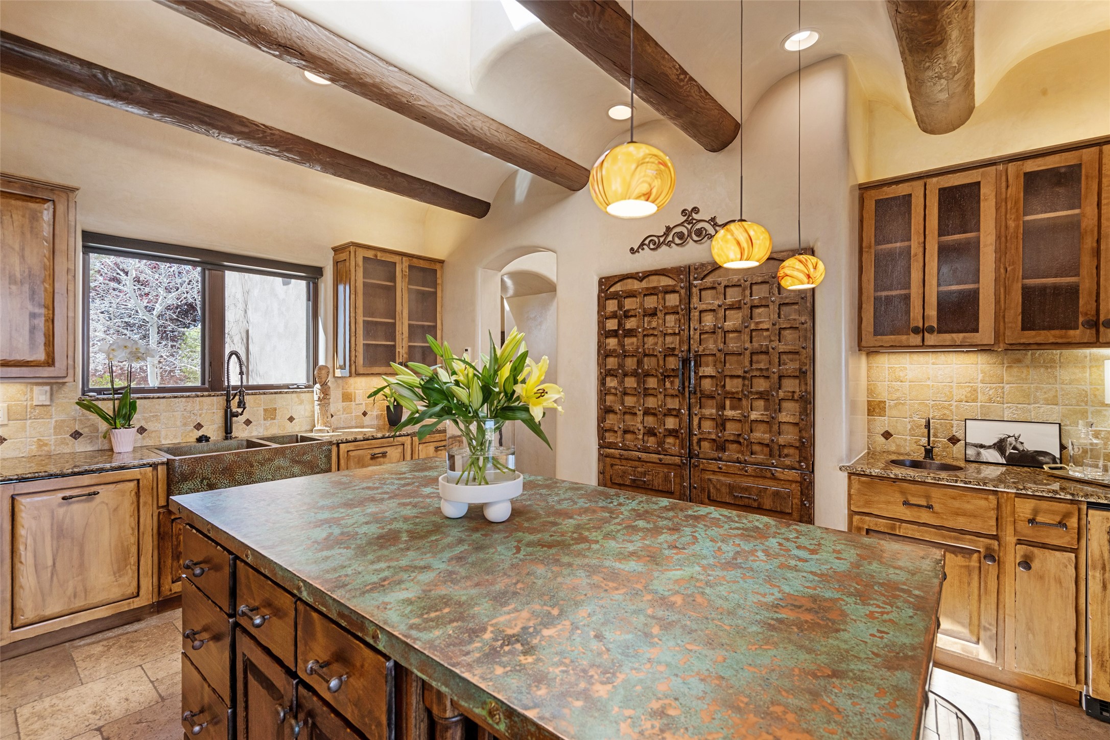 PANORAMIC VIEWS AND TIMELESS DESIGN IN LAS CAMPANAS. This refined residence in the Las Campanas community combines sweeping mountain vistas with many updates and enduring style in a hard-to-find 4 bedroom with a dramatic architecture. An inviting courtyard entry opens to generous living spaces framed by a dramatic sliding glass wall, creating seamless indoor-outdoor living. Towering viga-lined ceilings and plaster walls frame the spaces. The gourmet kitchen features dual Sub-Zero refrigerators, a Sub-Zero ice maker, and expanded storage. The Owners' suite offers a quiet and spacious retreat, while a large media/game room provides flexibility for entertainment or relaxation. Recent enhancements include upgraded landscaping, refreshed interiors, and mechanical improvements that elevate both comfort and efficiency. Outdoor areas are designed for year-round enjoyment, with covered dining spaces, a pizza oven, and xeric, drip-irrigated gardens that are both lush and easy to maintain. Residents enjoy close proximity to The Club at Las Campanas, with spa, fitness, and dining amenities (membership available through the private Club at Las Campanas) as well as direct access to miles of walking paths. A move-in ready home blending elegant finishes, multiple upgrades, and the best of Santa Fe living.