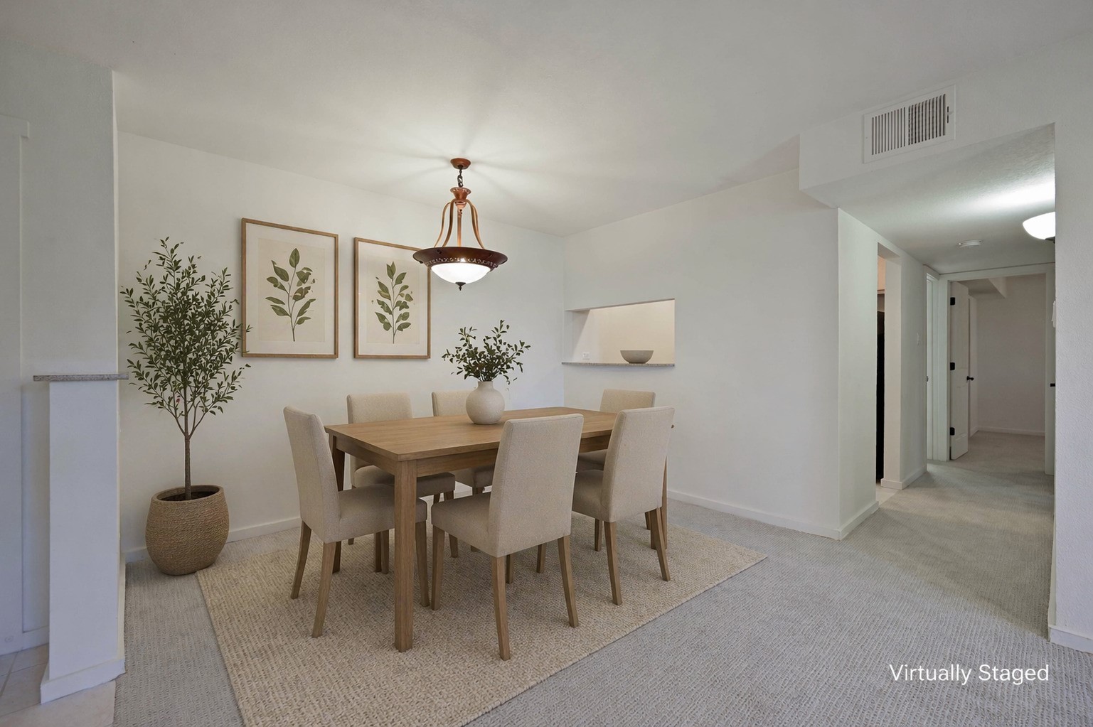 Welcome home to this charming two-bedroom, two-bath condo situated in the neatly maintained San Mateo gated community, surrounded by mature trees and verdant spaces. Located on the second floor, this comfortable home features two full baths, including a primary suite with a relaxing Jacuzzi tub. Enjoy beautiful southern exposure with great natural light and views of the Ortiz Mountains. The interior offers stainless steel appliances, in-unit laundry, recently upgraded carpeting, and a new water heater. Residents appreciate the peaceful setting and access to great community amenities, including a pool, clubhouse, and landscaped common areas. Conveniently located near shopping, restaurants, major routes, and just a short drive to the Plaza, this condo offers easy access to everything you need while maintaining a calm, private atmosphere. A wonderful opportunity to enjoy low-maintenance living in a central and desirable location.
