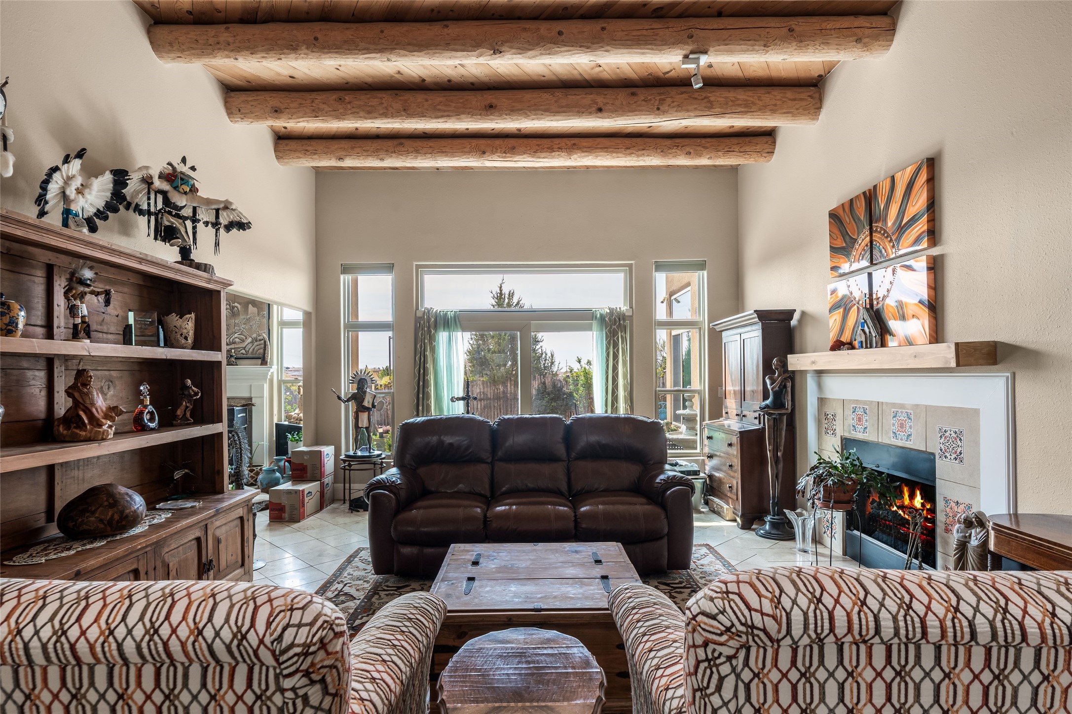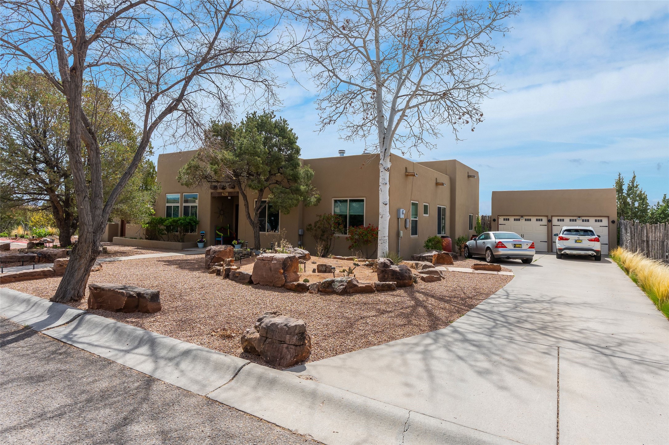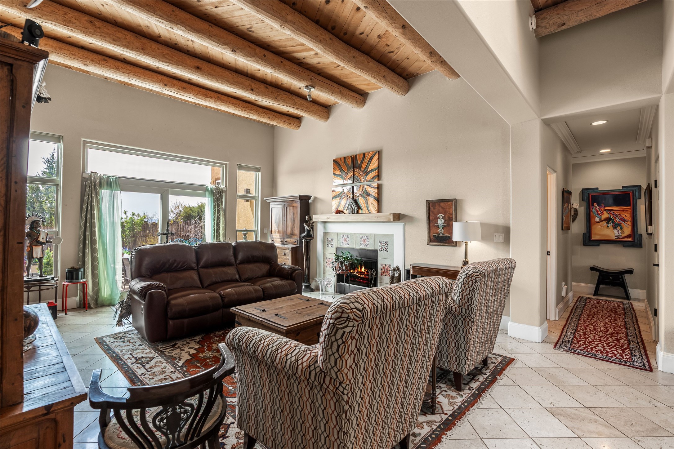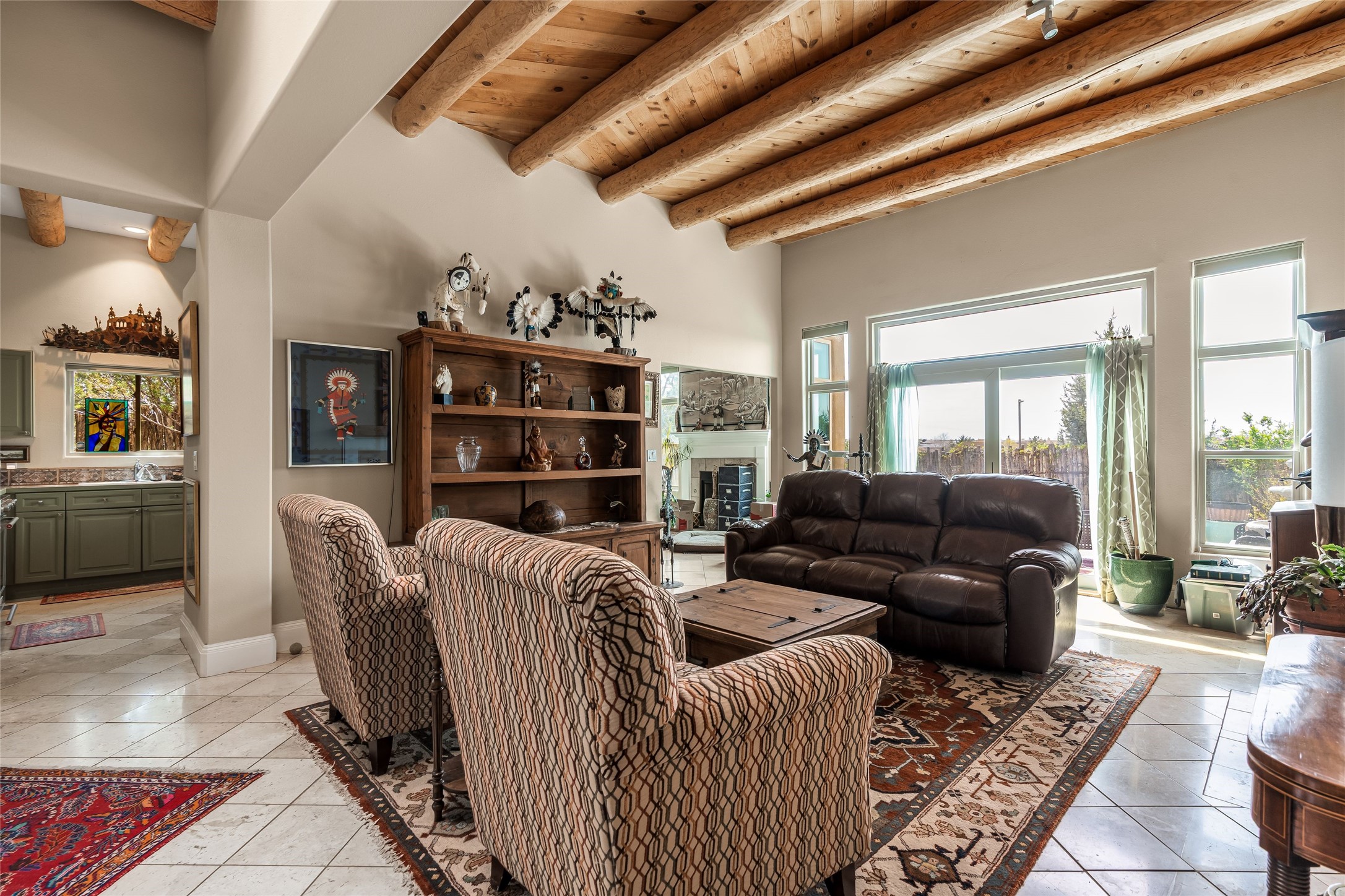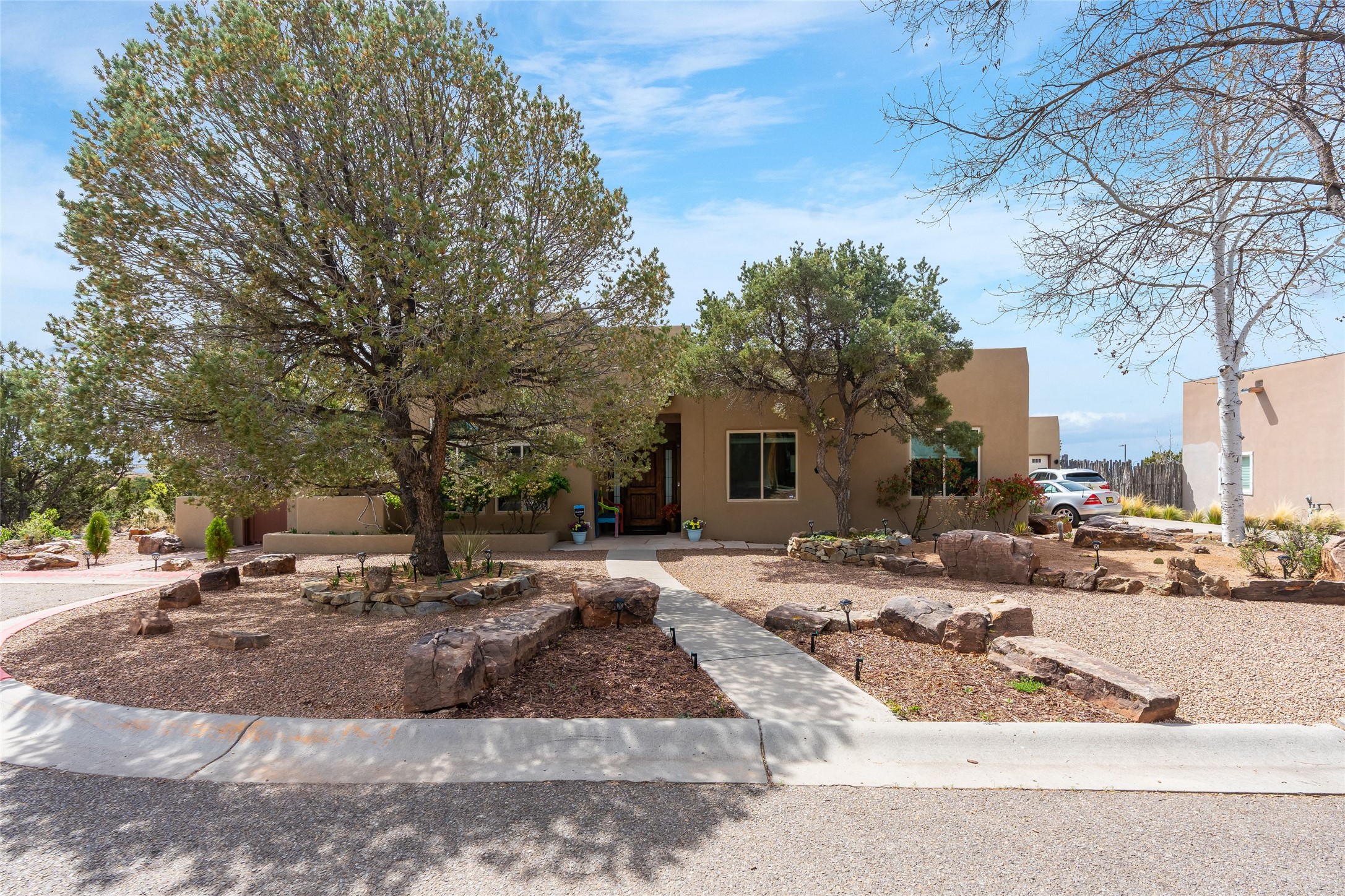 Experience exceptional single level living in the highly sought after Nava Ade community, featuring two private primary suites thoughtfully positioned on opposite sides of the home. A versatile third bedroom or office sits between them, offering flexibility for work, guests, or creative space. Step inside to soaring ceilings accented with classic vigas, elegant travertine floors, and generous open concept living spaces designed for comfort and effortless entertaining. The chef's kitchen is equipped with newer stainless steel KitchenAid appliances, while newly installed windows bathe the home in natural light throughout the day. Two gas fireplaces--one in the dining room and one in the living room--create warm, inviting spaces year round. Recent upgrades, including a new HVAC system, ensure modern comfort and efficiency. Outside, enjoy beautifully landscaped front and back yards, perfect for relaxing or hosting gatherings. The property sits at the end of a quiet lane, adjoining common area open space with direct access to Nava Ade's walking paths. A detached two car garage and a spacious private driveway provide ample parking for residents and guests. Residents of Nava Ade enjoy access to a community fitness center, swimming pool, parks, and miles of walking paths, making this home a true blend of convenience, comfort, and lifestyle. This is a move in ready gem in one of Santa Fe's most desirable neighborhoods.