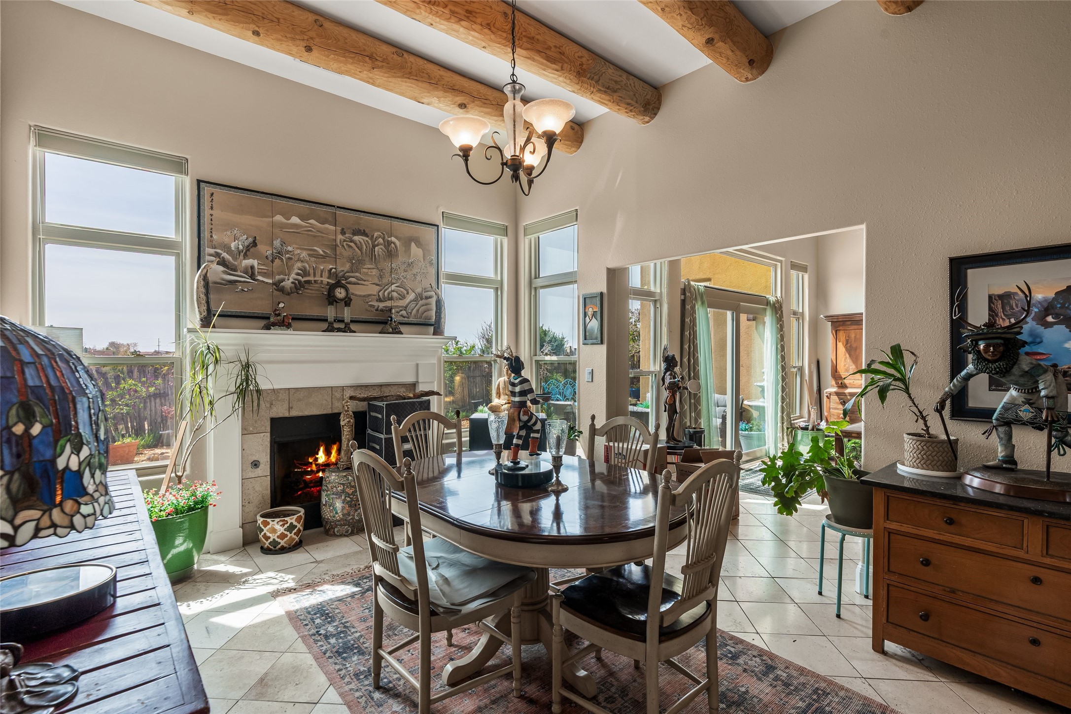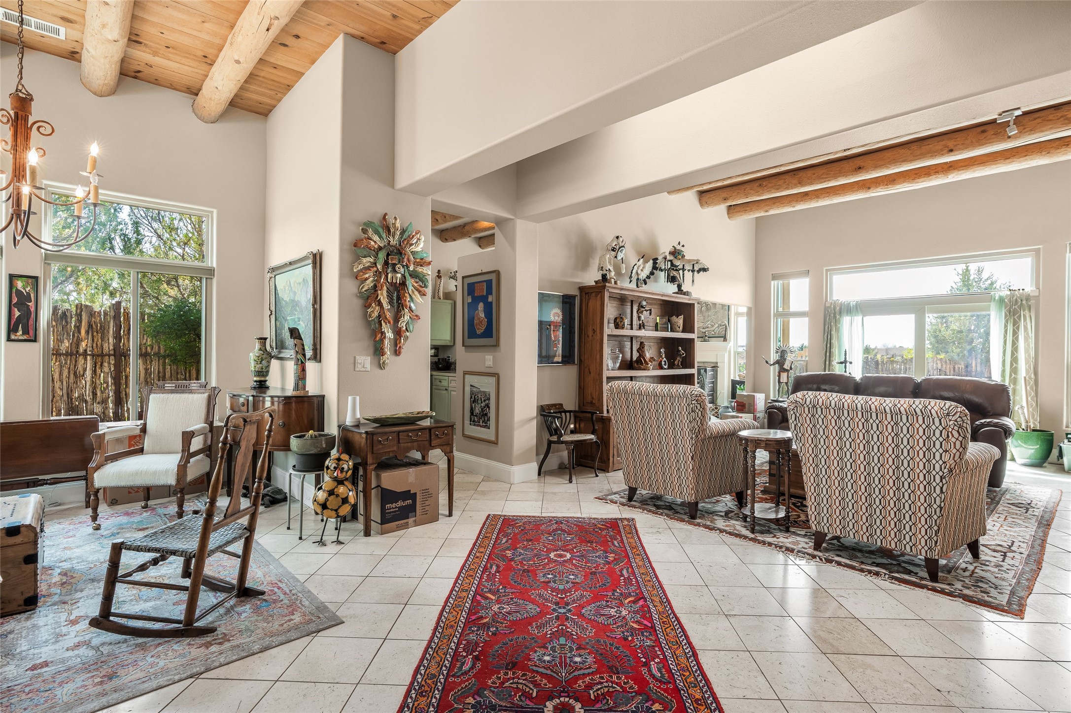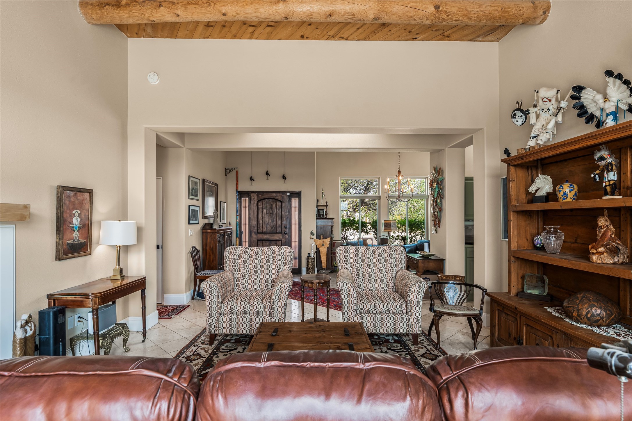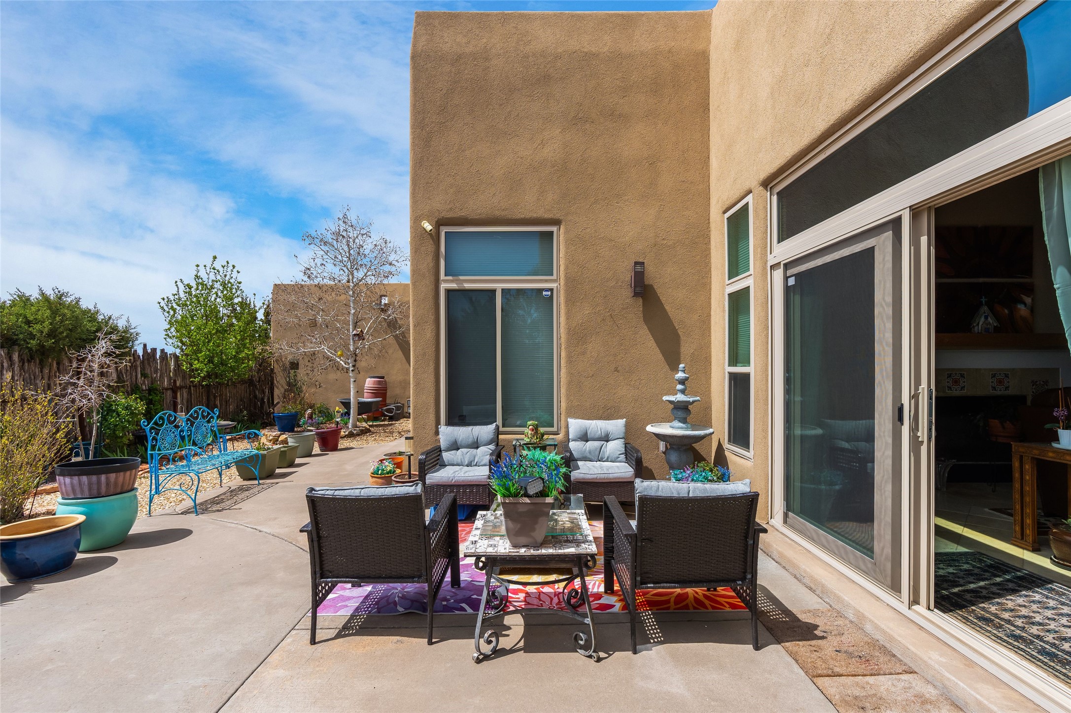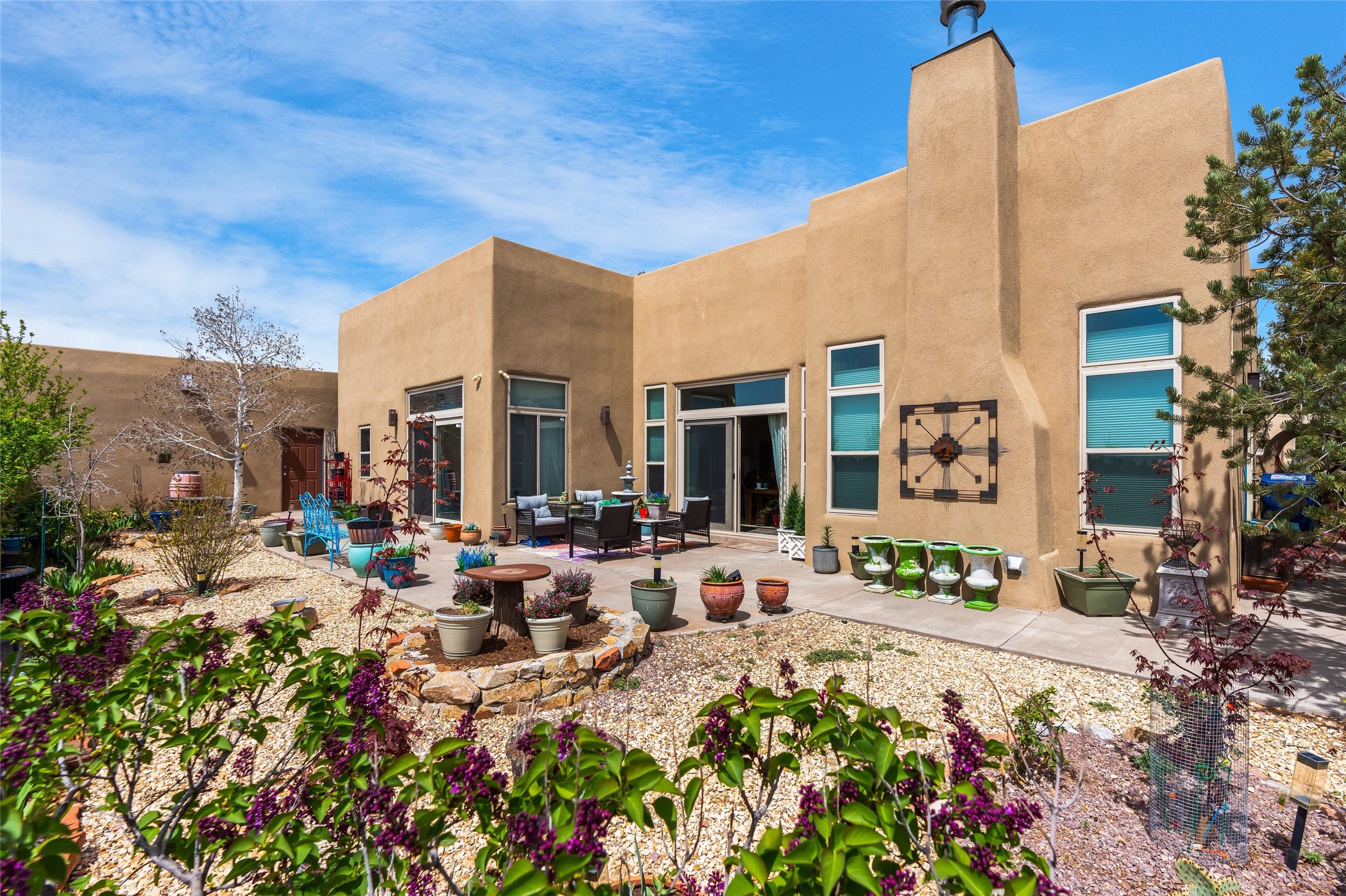 Experience exceptional single level living in the highly sought after Nava Ade community, featuring two private primary suites thoughtfully positioned on opposite sides of the home. A versatile third bedroom or office sits between them, offering flexibility for work, guests, or creative space. Step inside to soaring ceilings accented with classic vigas, elegant travertine floors, and generous open concept living spaces designed for comfort and effortless entertaining. The chef's kitchen is equipped with newer stainless steel KitchenAid appliances, while newly installed windows bathe the home in natural light throughout the day. Two gas fireplaces--one in the dining room and one in the living room--create warm, inviting spaces year round. Recent upgrades, including a new HVAC system, ensure modern comfort and efficiency. Outside, enjoy beautifully landscaped front and back yards, perfect for relaxing or hosting gatherings. The property sits at the end of a quiet lane, adjoining common area open space with direct access to Nava Ade's walking paths. A detached two car garage and a spacious private driveway provide ample parking for residents and guests. Residents of Nava Ade enjoy access to a community fitness center, swimming pool, parks, and miles of walking paths, making this home a true blend of convenience, comfort, and lifestyle. This is a move in ready gem in one of Santa Fe's most desirable neighborhoods.