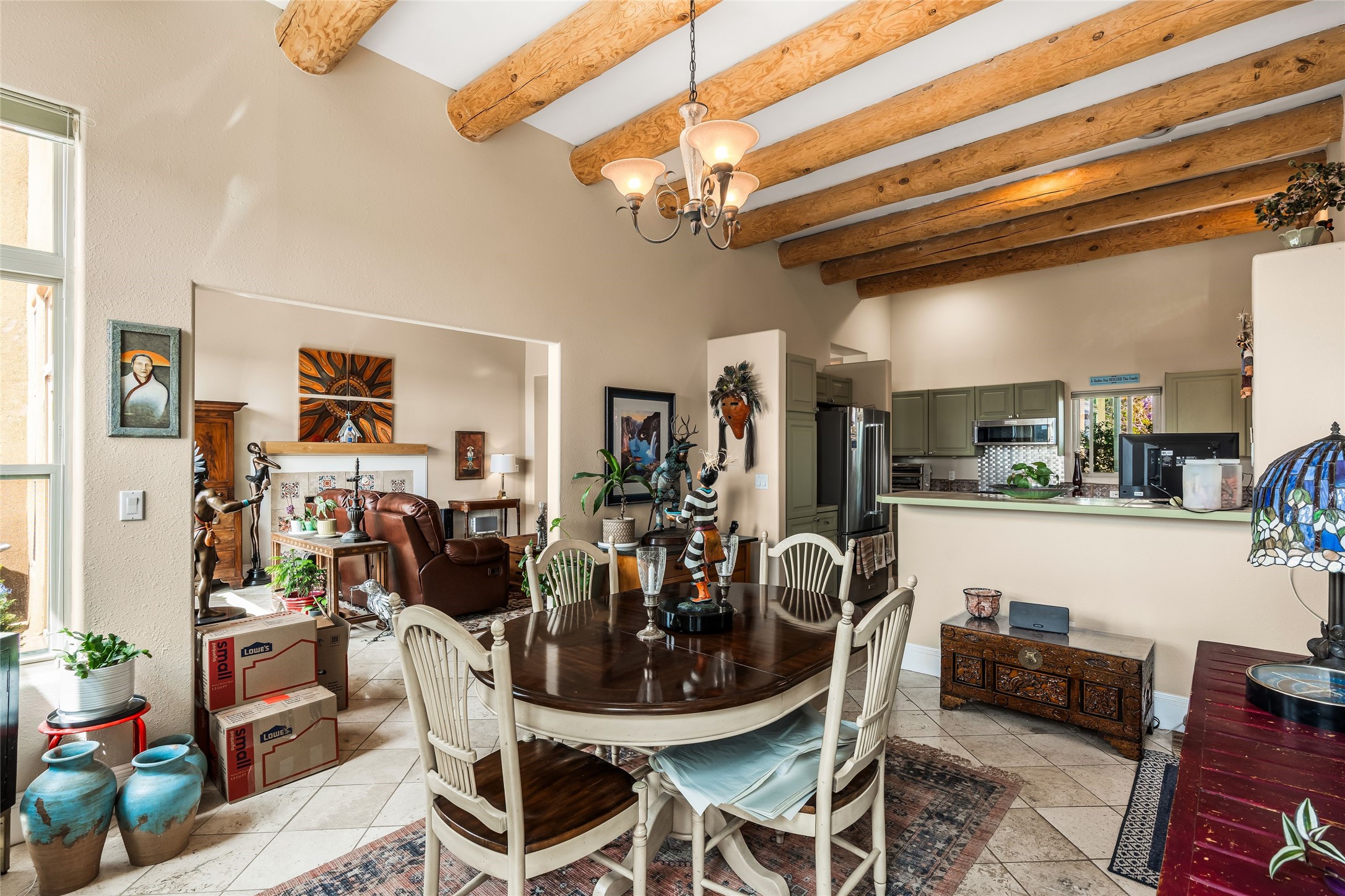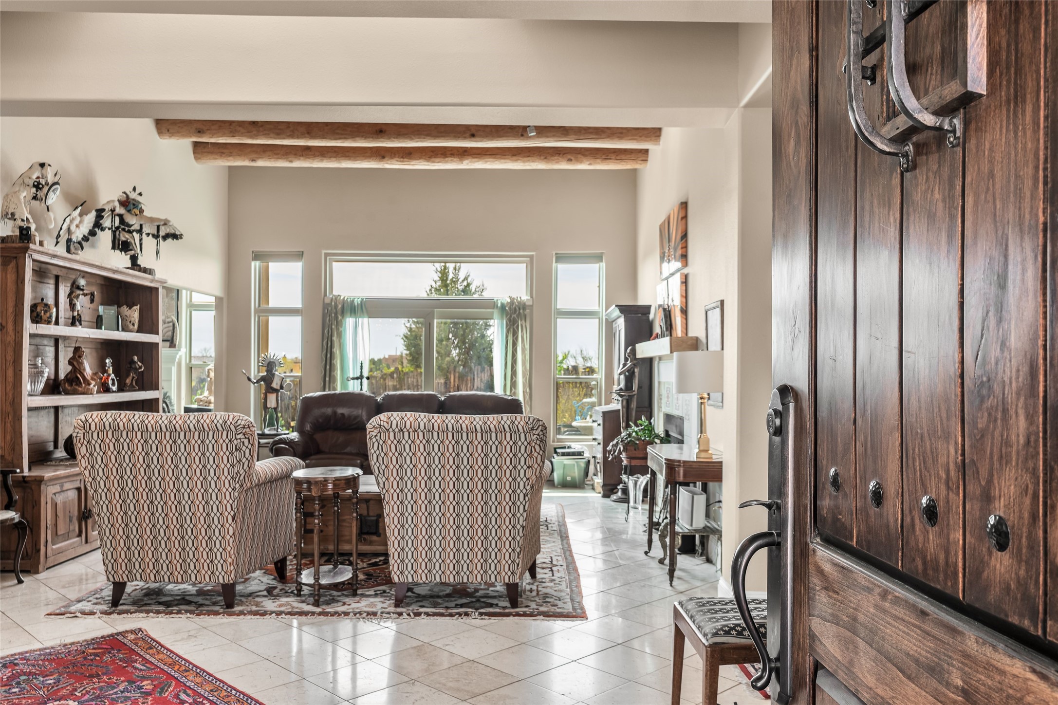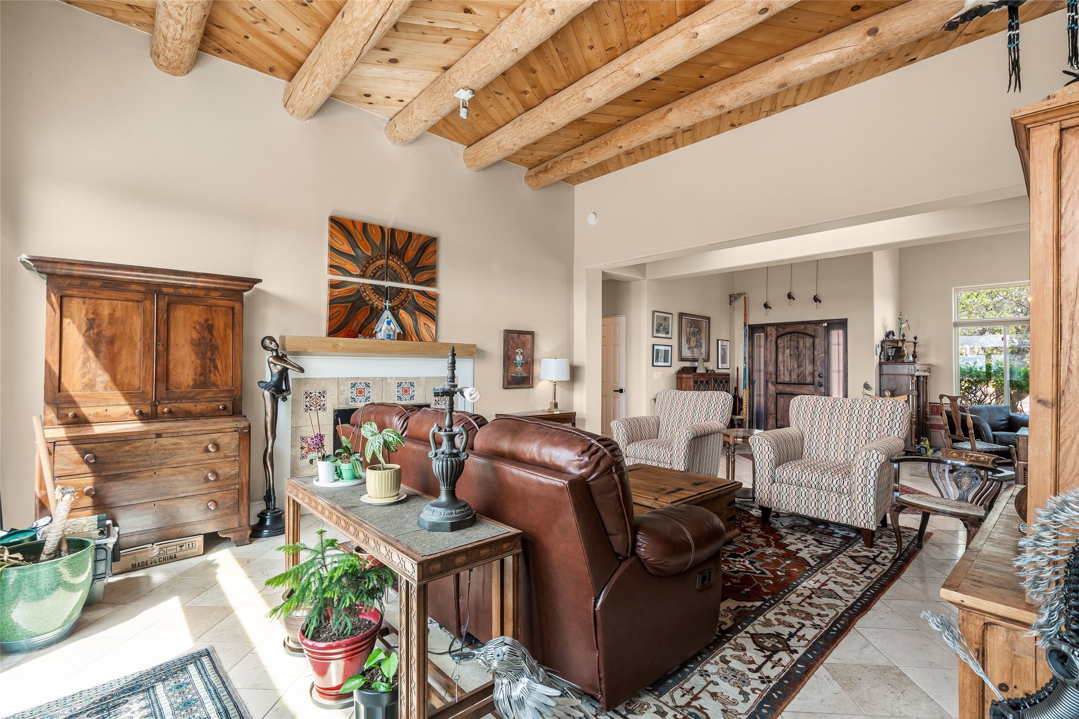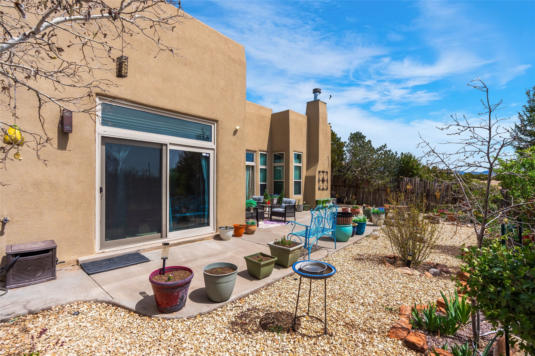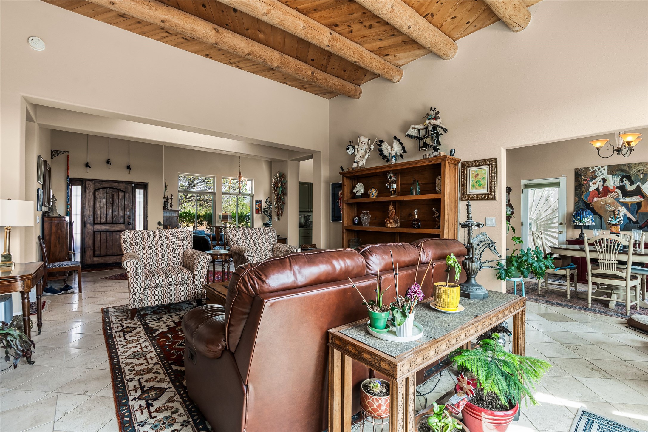 Experience exceptional single level living in the highly sought after Nava Ade community, featuring two private primary suites thoughtfully positioned on opposite sides of the home. A versatile third bedroom or office sits between them, offering flexibility for work, guests, or creative space. Step inside to soaring ceilings accented with classic vigas, elegant travertine floors, and generous open concept living spaces designed for comfort and effortless entertaining. The chef's kitchen is equipped with newer stainless steel KitchenAid appliances, while newly installed windows bathe the home in natural light throughout the day. Two gas fireplaces--one in the dining room and one in the living room--create warm, inviting spaces year round. Recent upgrades, including a new HVAC system, ensure modern comfort and efficiency. Outside, enjoy beautifully landscaped front and back yards, perfect for relaxing or hosting gatherings. The property sits at the end of a quiet lane, adjoining common area open space with direct access to Nava Ade's walking paths. A detached two car garage and a spacious private driveway provide ample parking for residents and guests. Residents of Nava Ade enjoy access to a community fitness center, swimming pool, parks, and miles of walking paths, making this home a true blend of convenience, comfort, and lifestyle. This is a move in ready gem in one of Santa Fe's most desirable neighborhoods.
